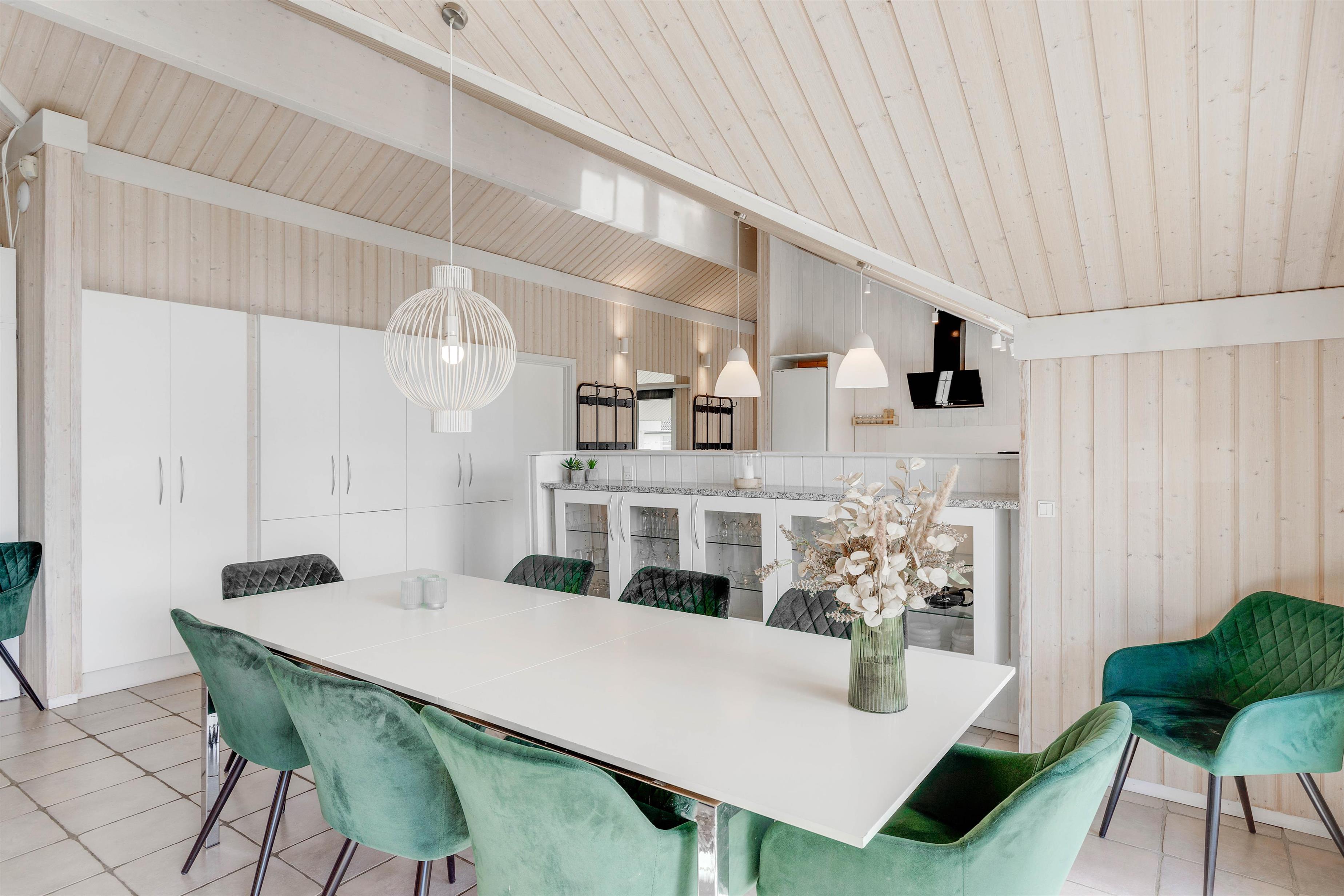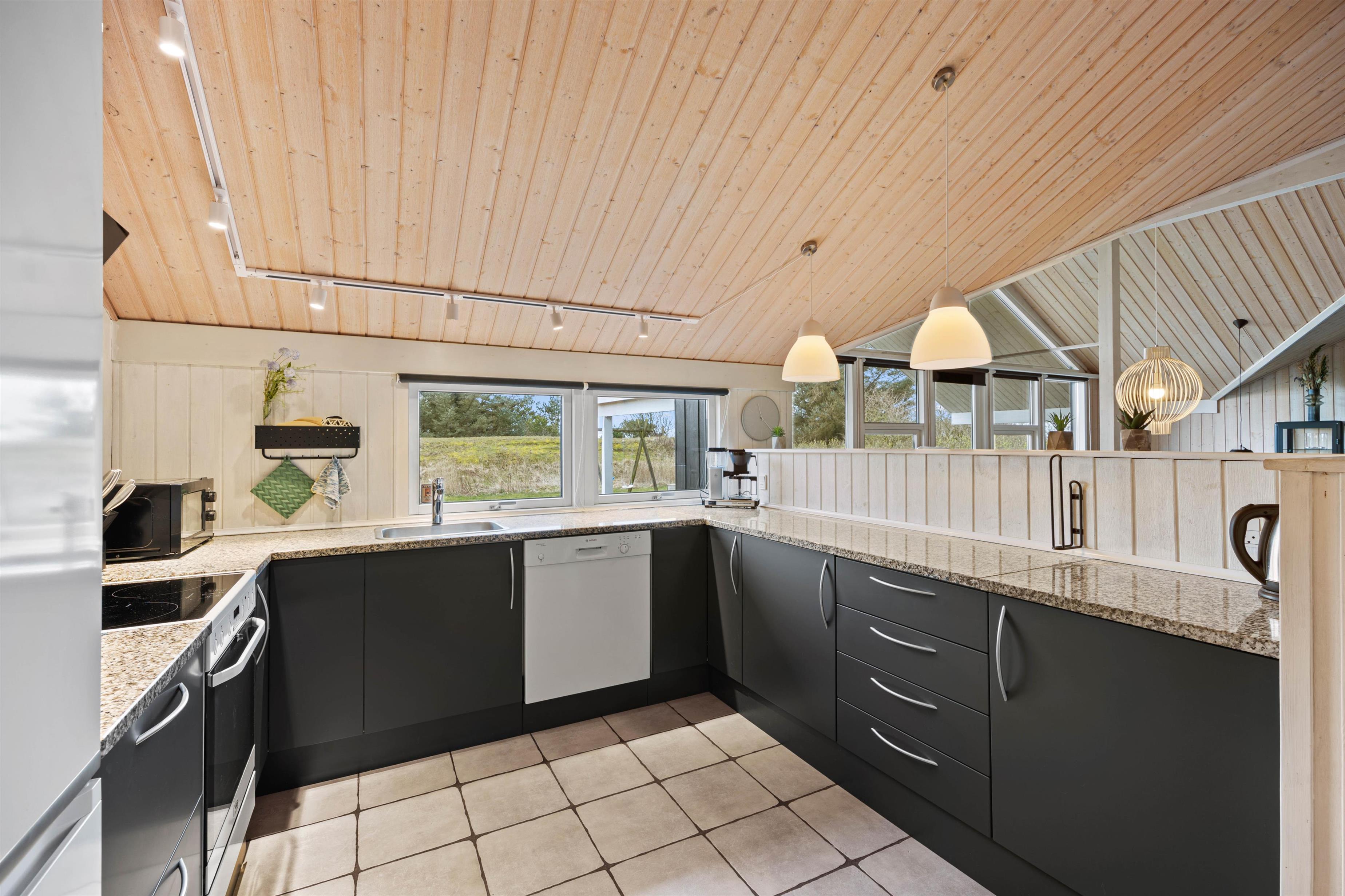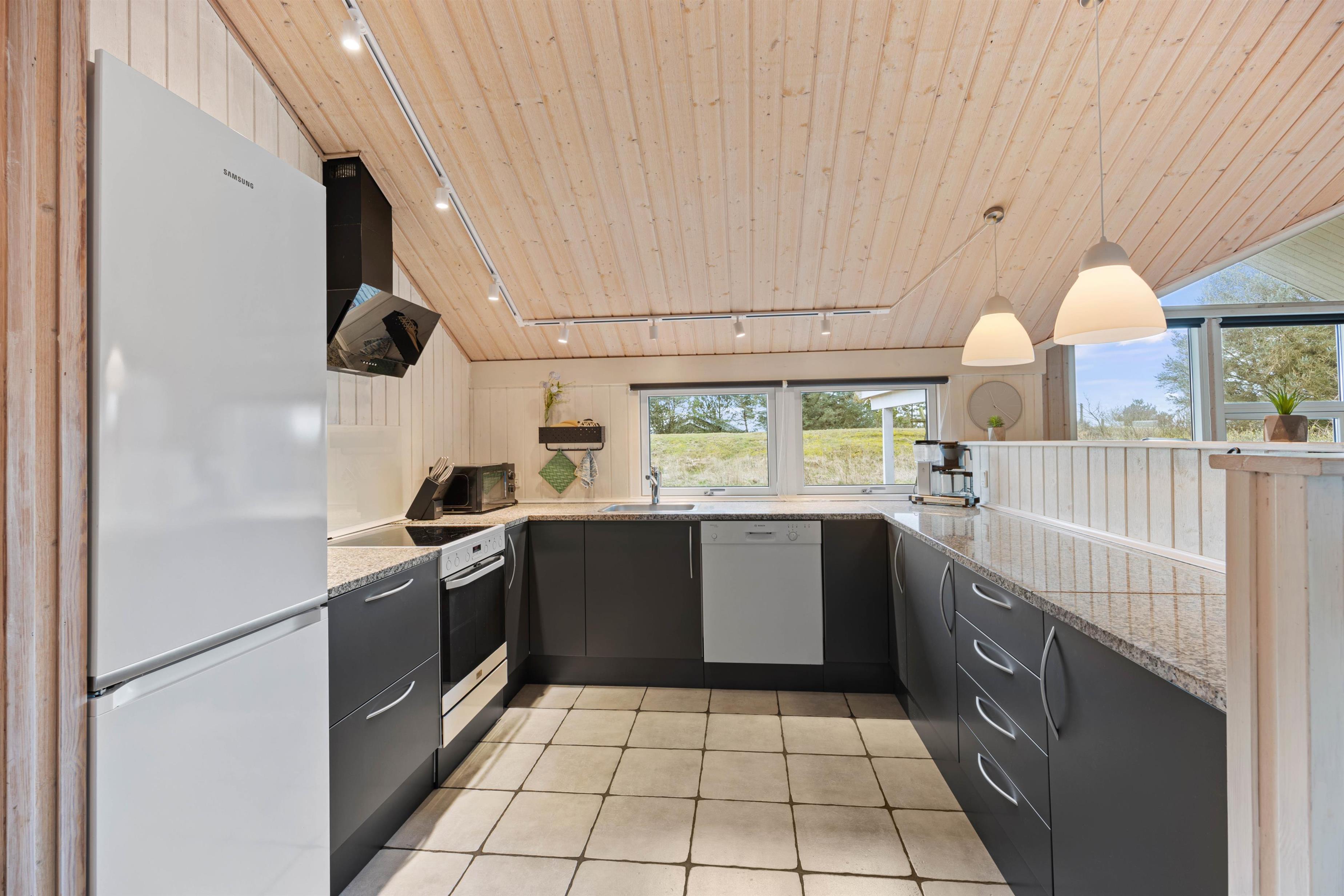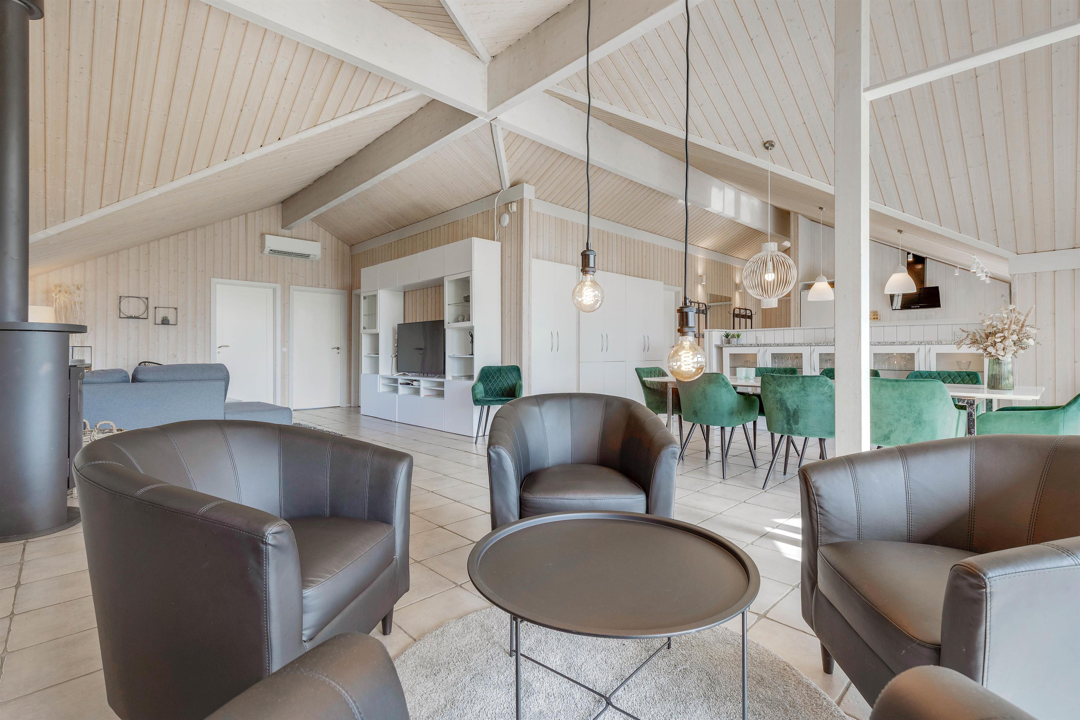 Hjertet i feriehuset er det store alrum, hvor køkken, spiseplads og stue er forenet. Her er der rig mulighed for, at I kan nyde hinandens selskab. Brændeovnen sætter prikken over i’et for feriestemningen med sin knitren og varme.