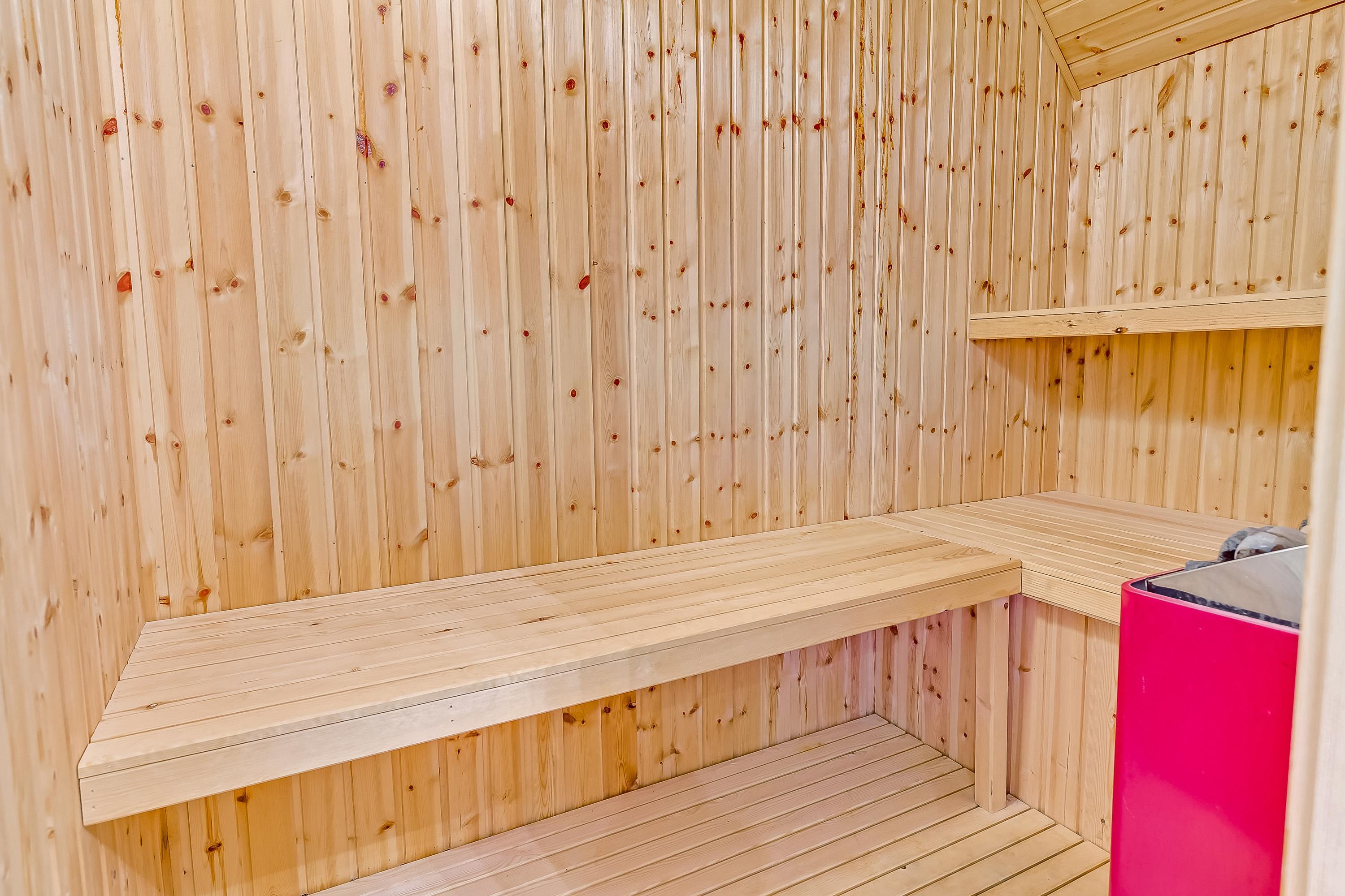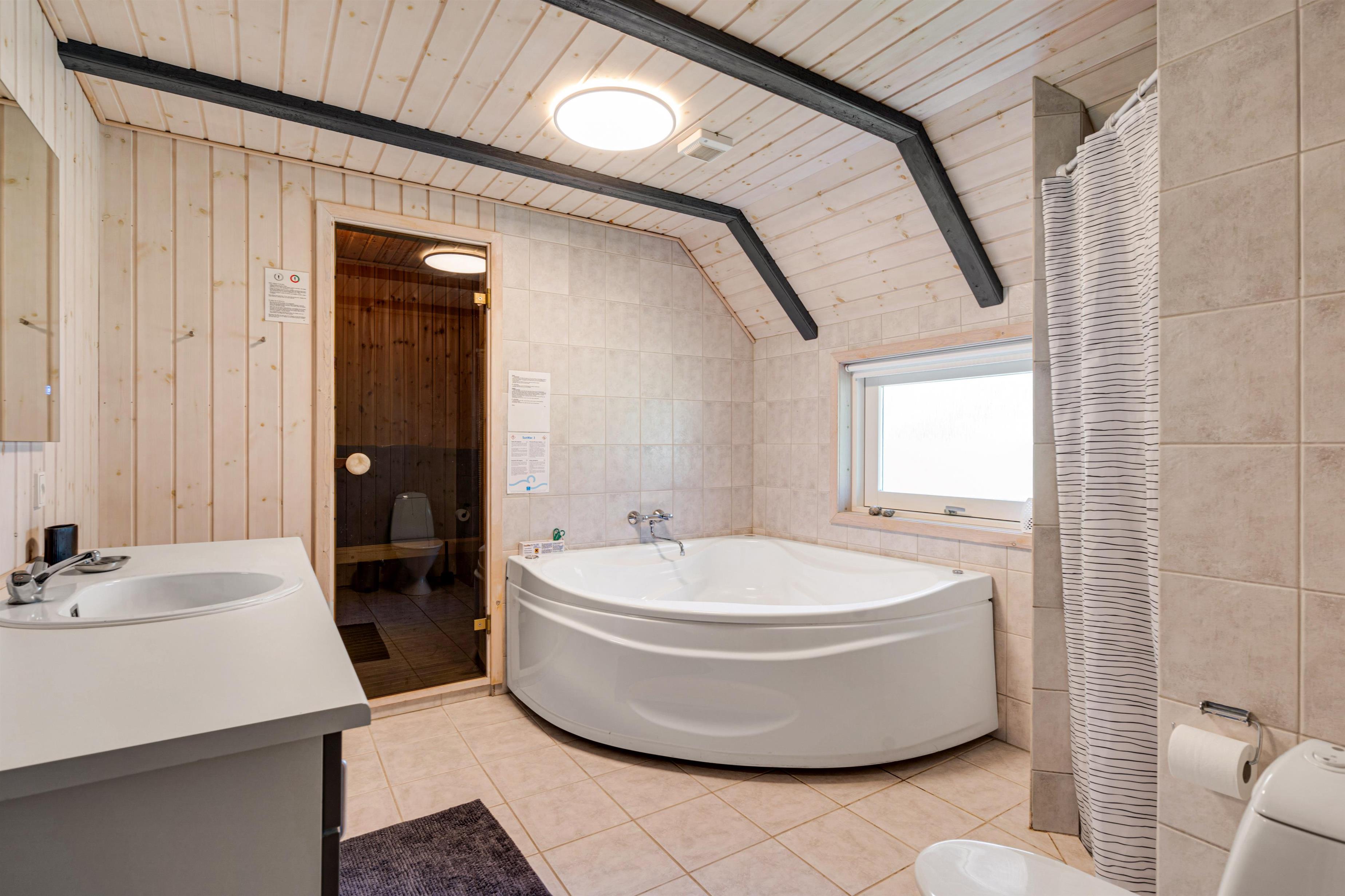 Sommerhuset er praktisk indrettet med både badeværelse og gæstetoilet. På gæstetoilettet er der blevet integreret vaskemaskine og tørretumbler, og badeværelset gemmer på to af husets wellness-highlights - spabadet og saunaen. Her kan I forkæle jer selv lidt ekstra på ferien!