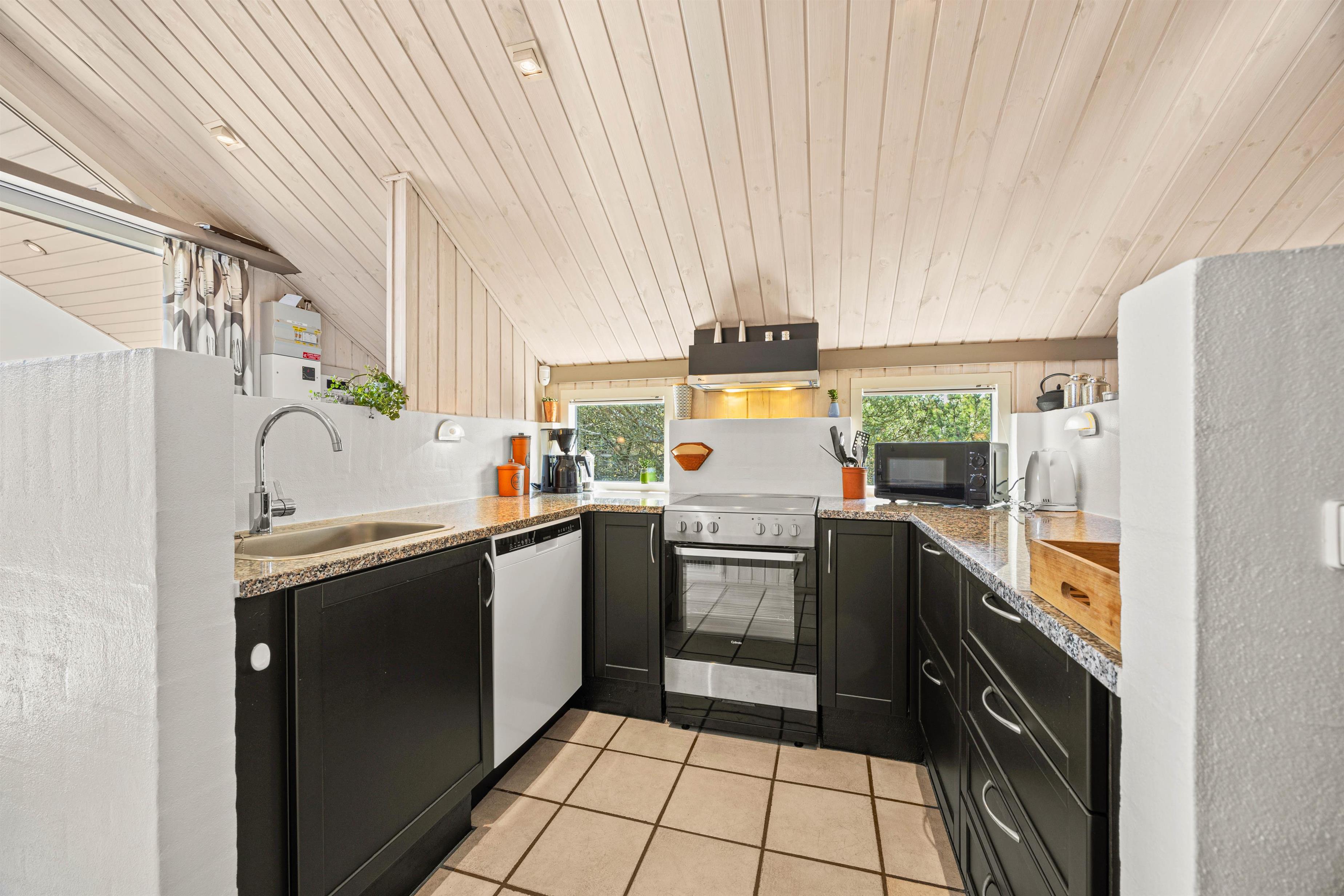 Feriehuset er indrettet i lyse farver, og I finder alt, hvad I har brug for af praktisk hjælp på ferien med vaskemaskine, tørretumbler og opvaskemaskine.