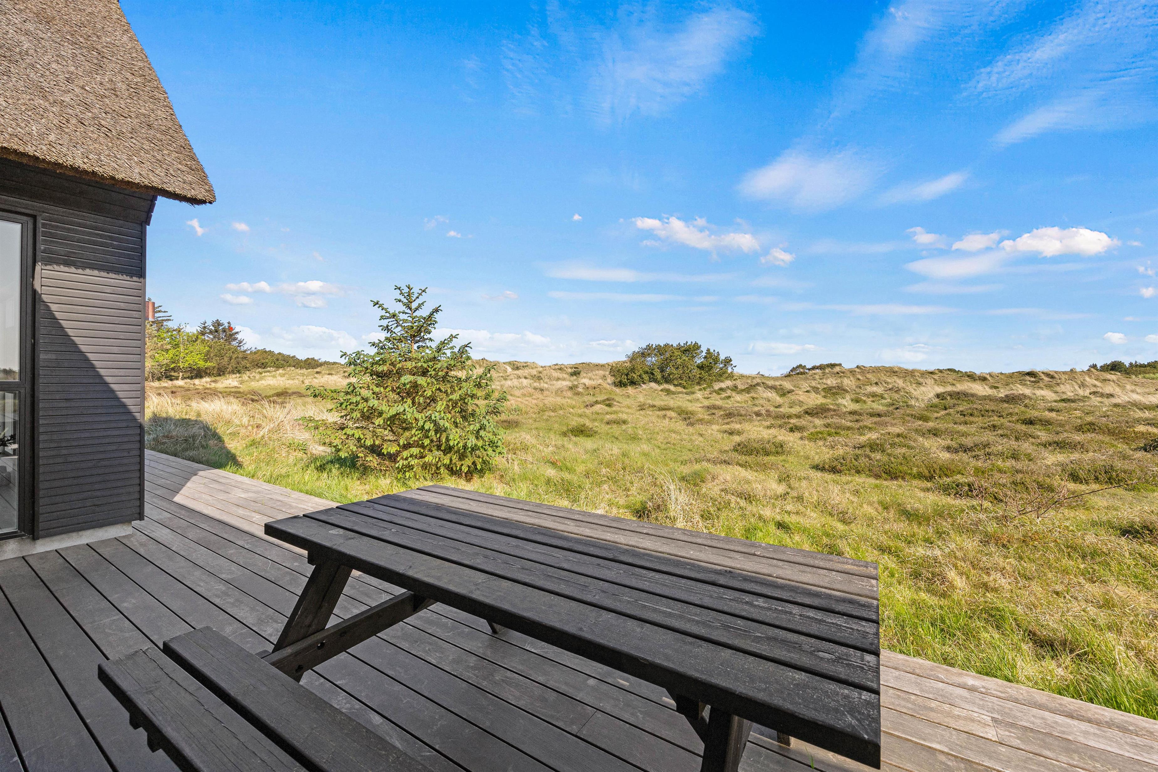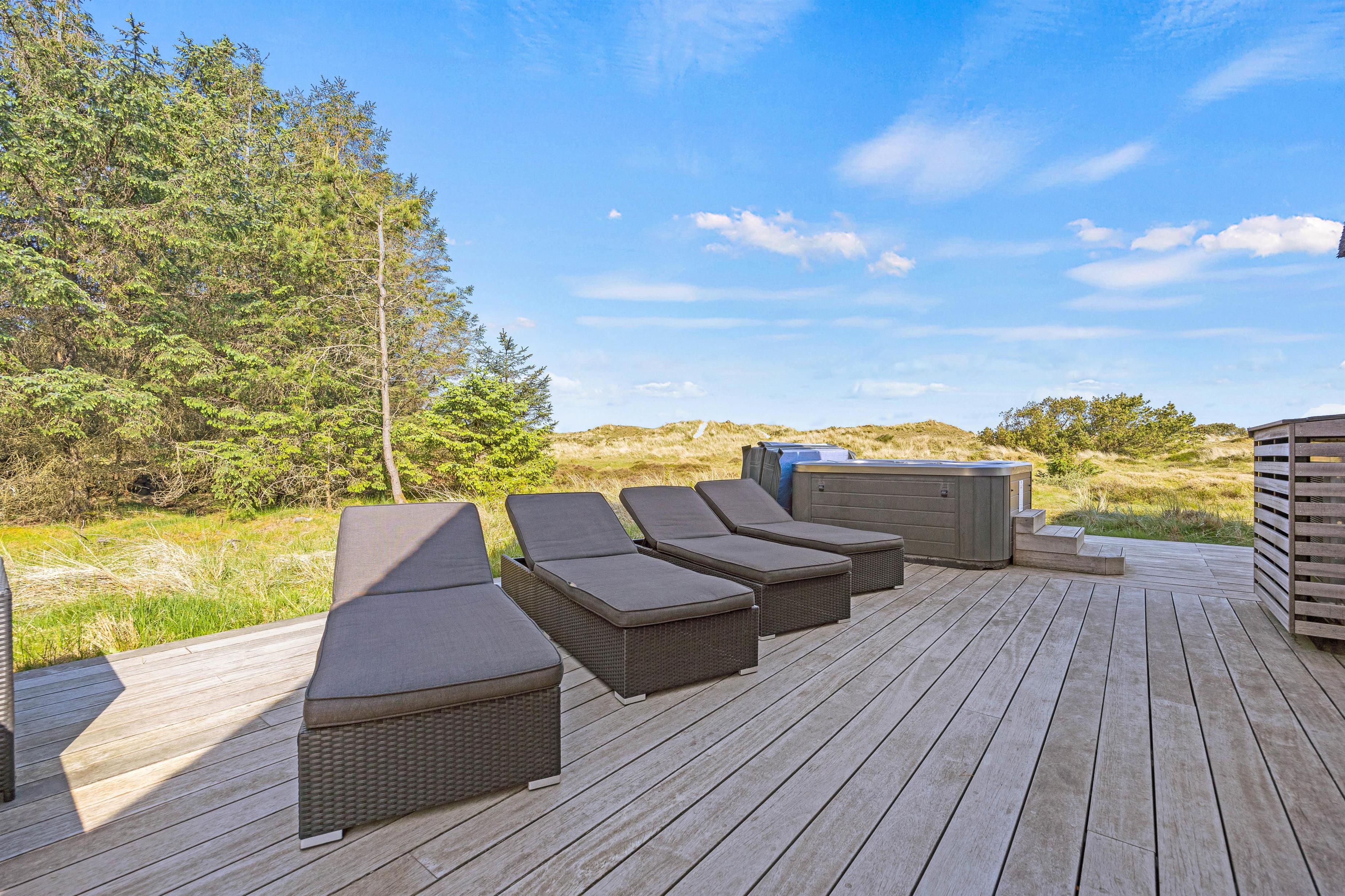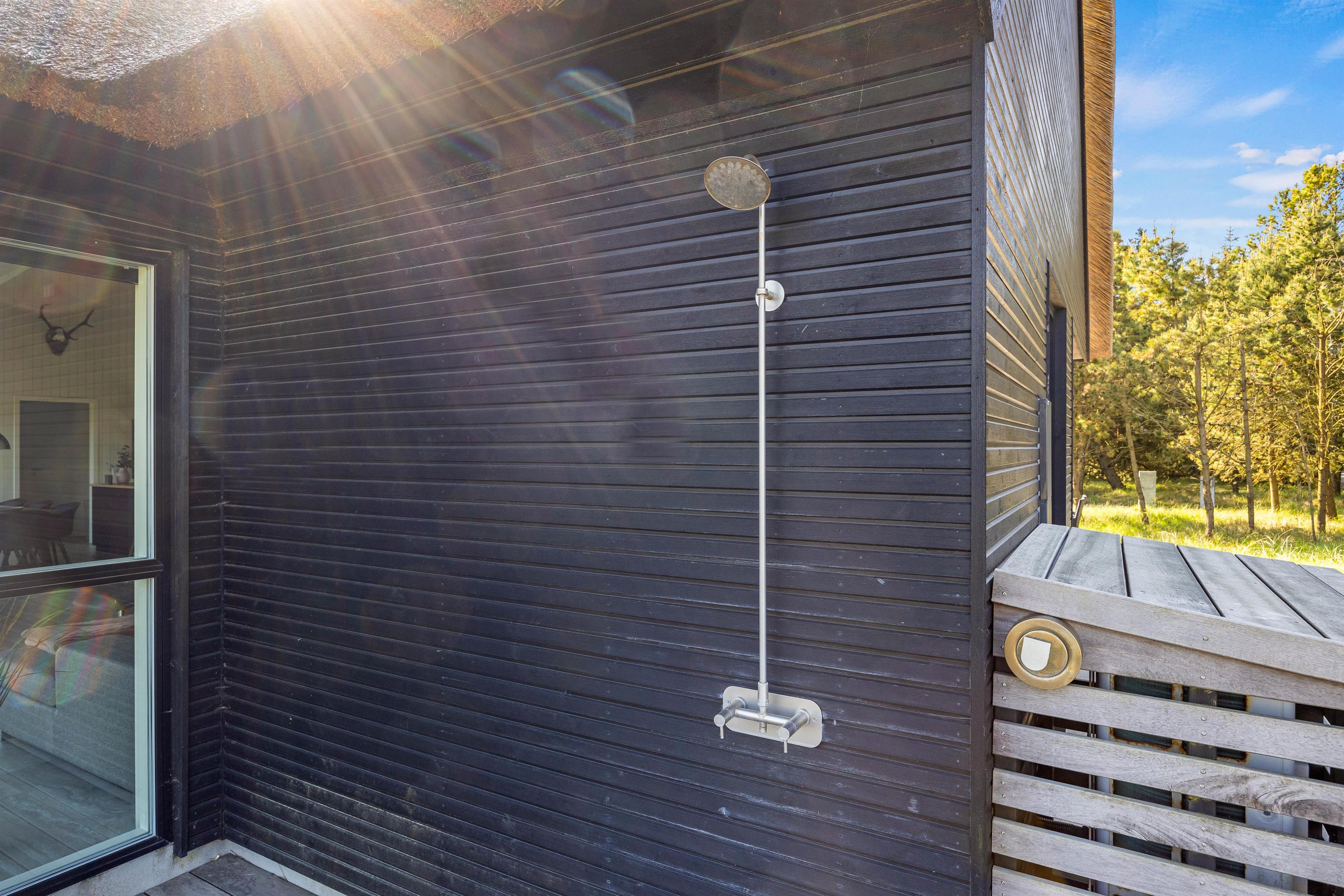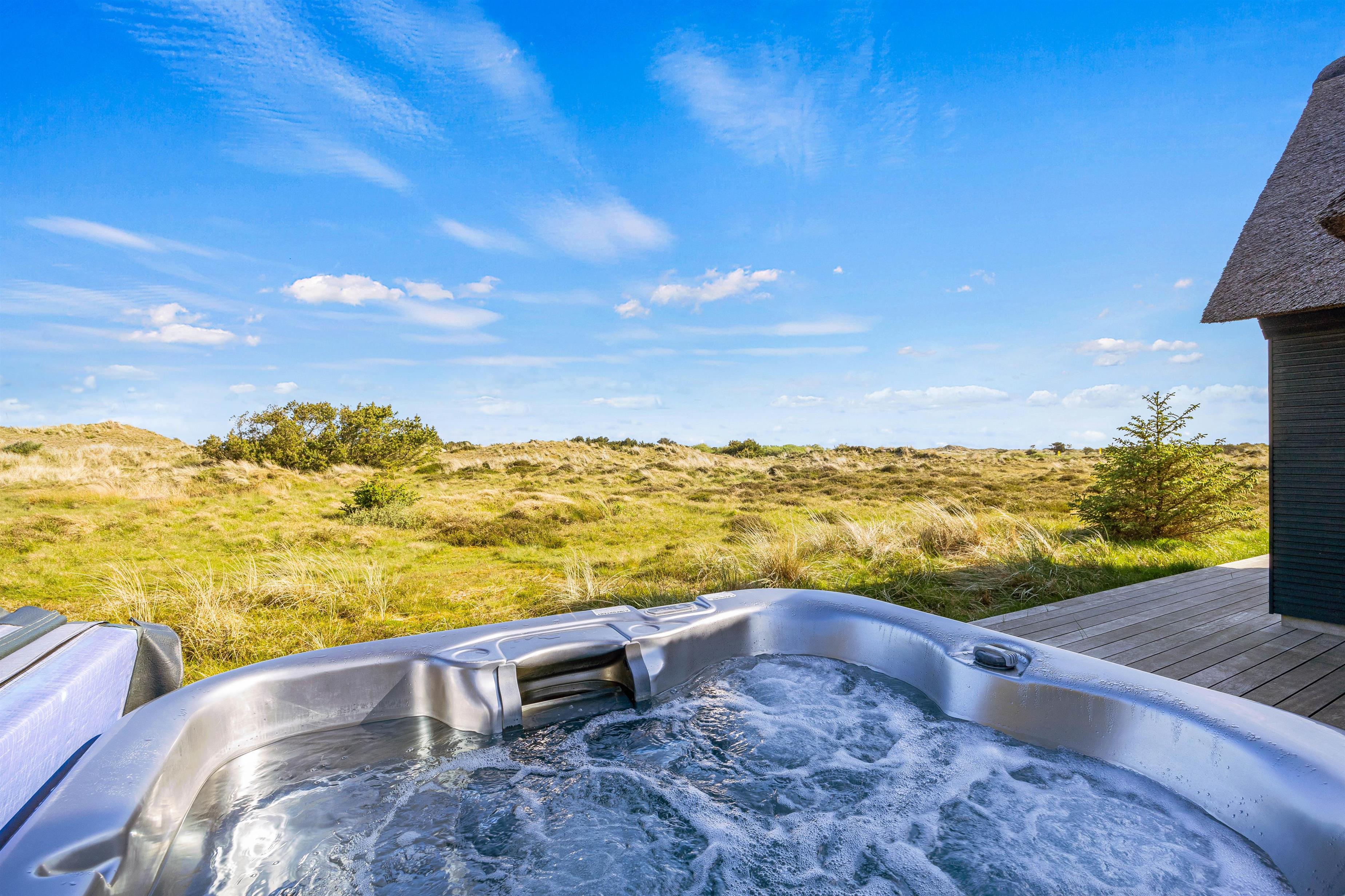 Den luksuriøse stil fortsætter udenfor. Her står et stort udendørs spabad på terrassen klar til at give jer de skønneste wellnessoplevelser under åben himmel, mens I kan nyde panoramaudsigten til det uberørte hedelandskab. Et lille ekstra på terrassen er udendørsbruseren, hvor I kan få jer en skyller i det fri eller hurtigt få fødderne rene for sand efter en strandtur. Udebruseren er kun til rådighed fra 1. april til 31. oktober.