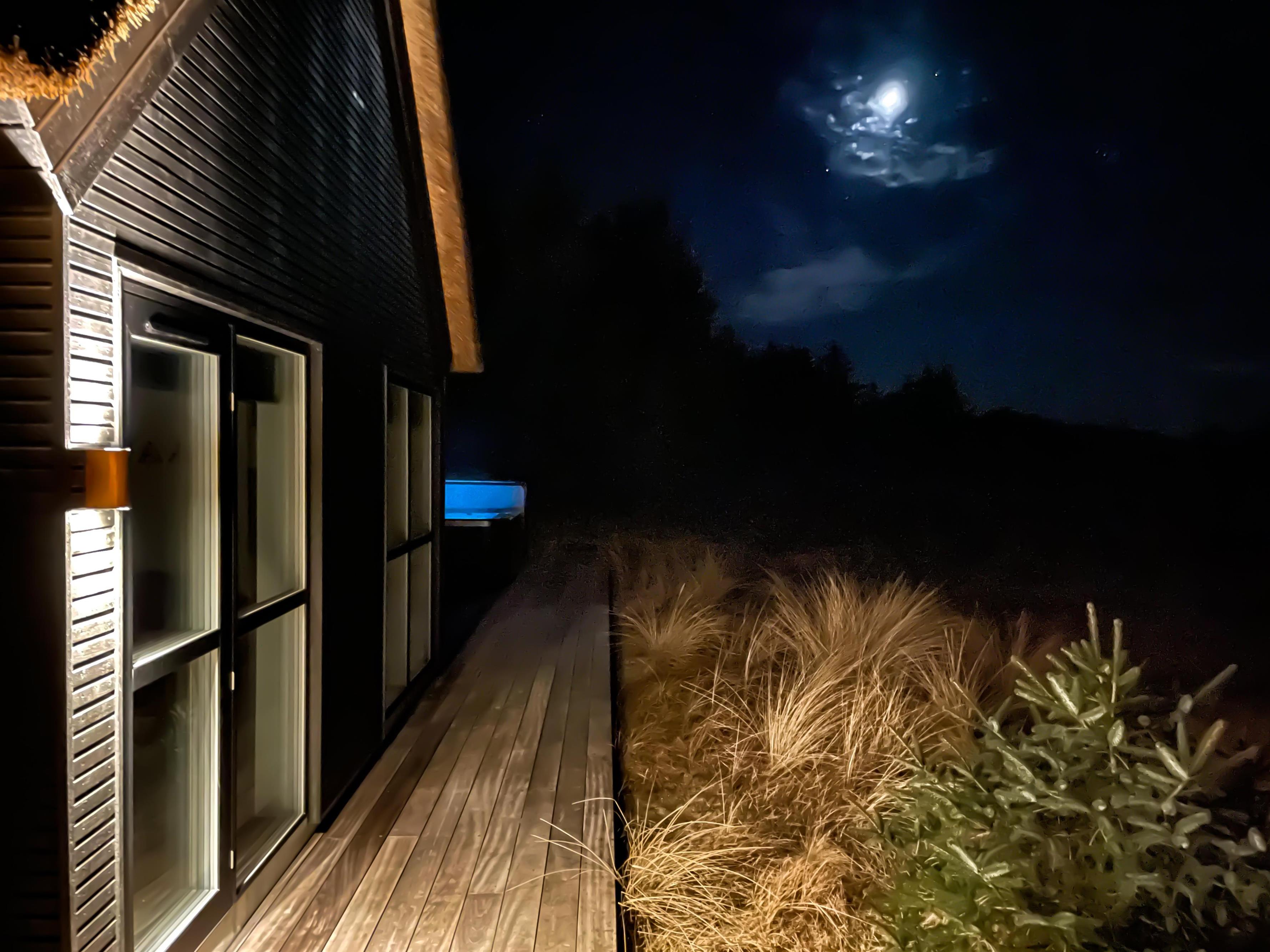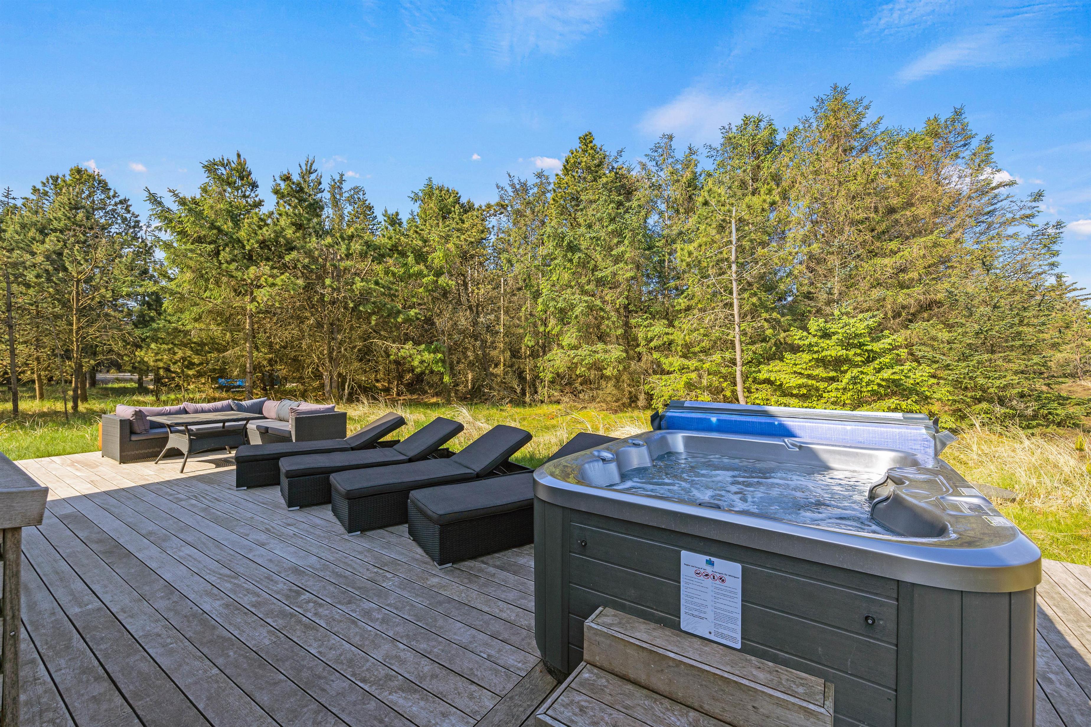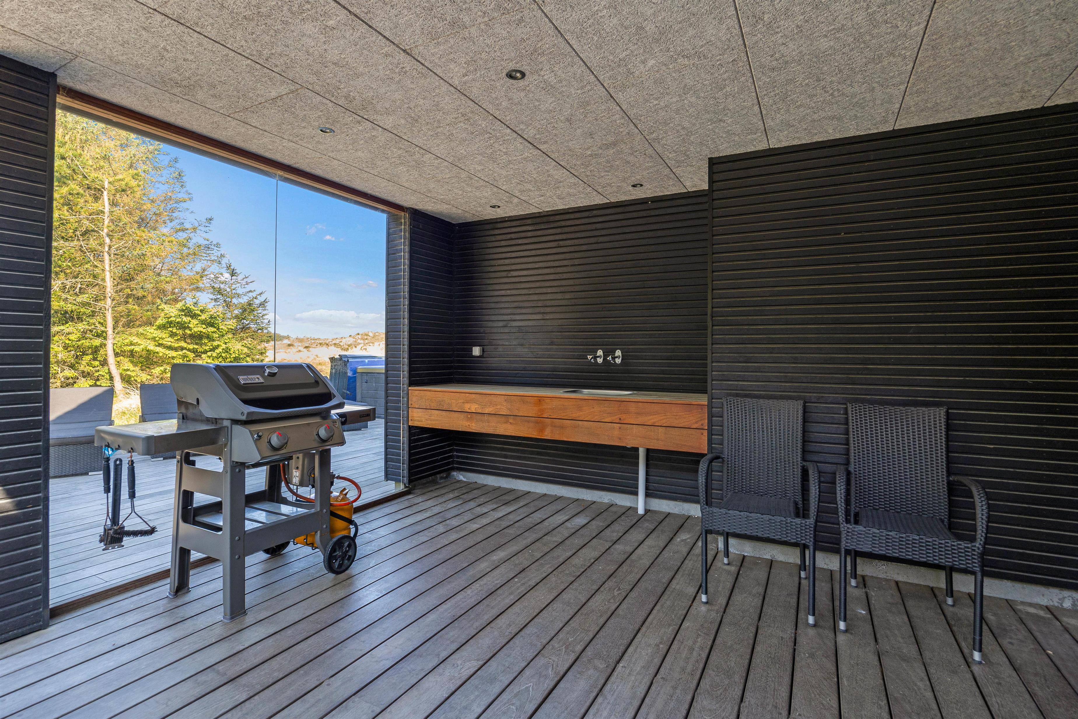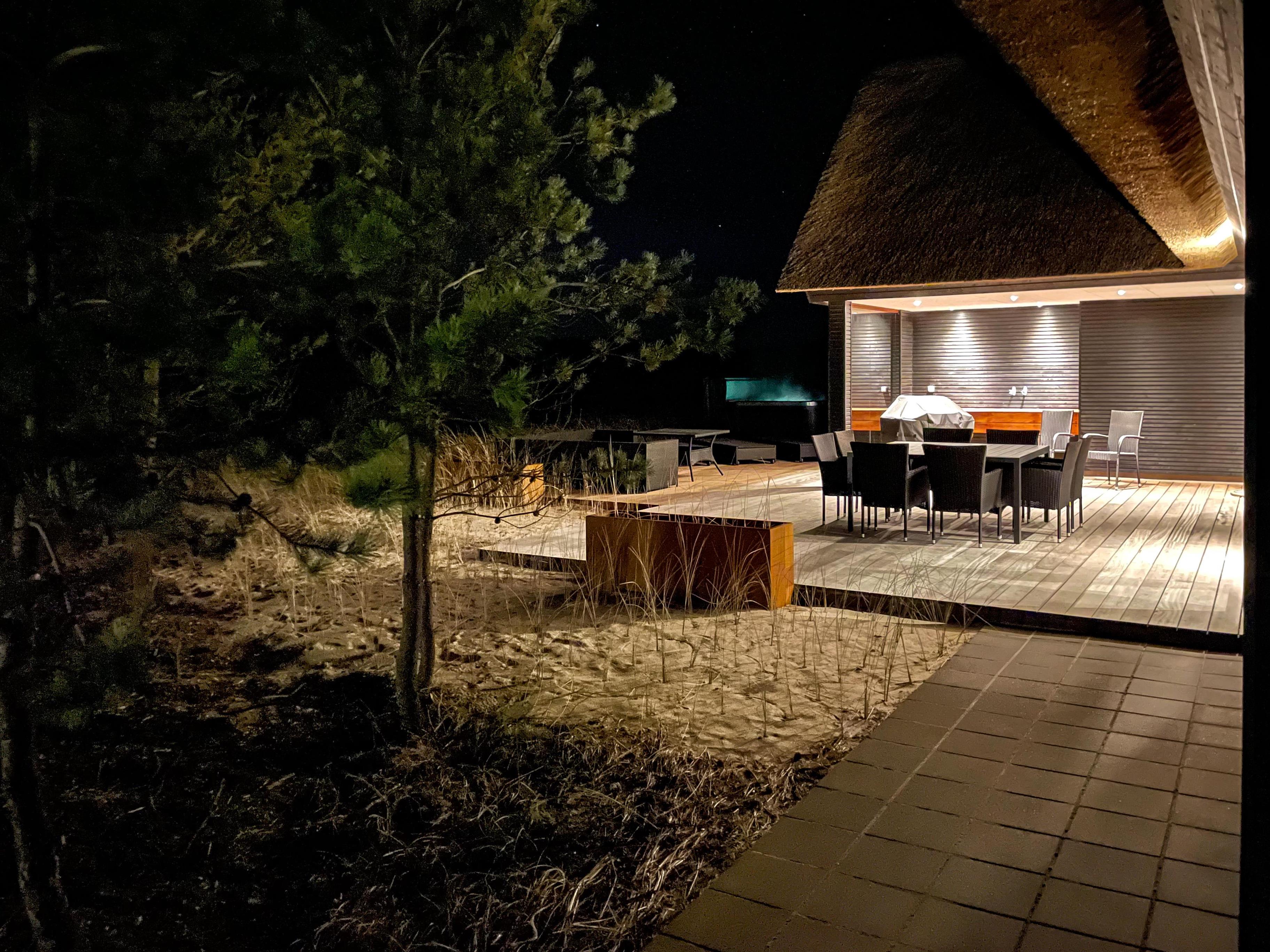Den luksuriøse stil fortsætter udenfor. Her står et stort udendørs spabad på terrassen klar til at give jer de skønneste wellnessoplevelser under åben himmel, mens I kan nyde panoramaudsigten til det uberørte hedelandskab. Et lille ekstra på terrassen er udendørsbruseren, hvor I kan få jer en skyller i det fri eller hurtigt få fødderne rene for sand efter en strandtur. Udebruseren er kun til rådighed fra 1. april til 31. oktober.