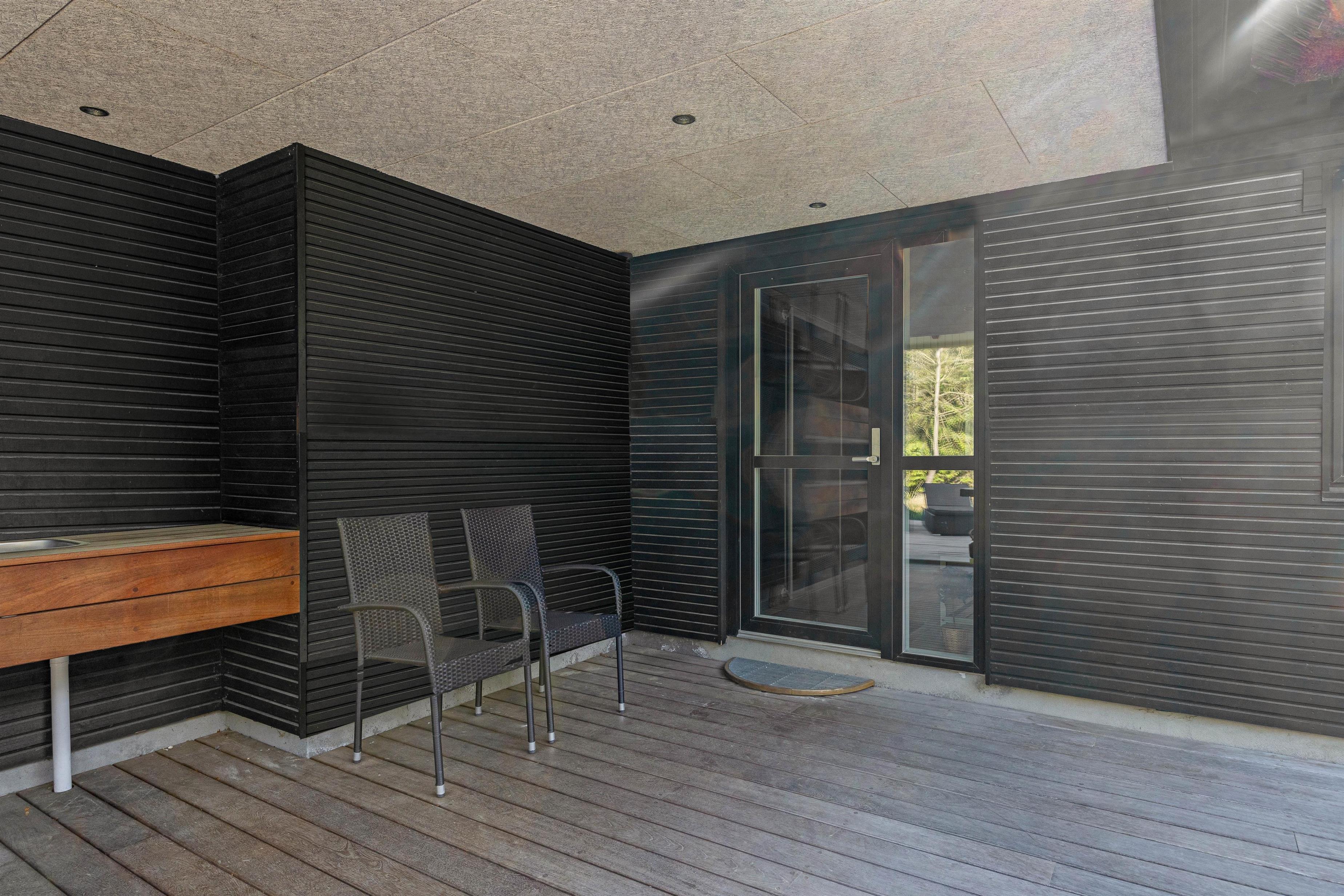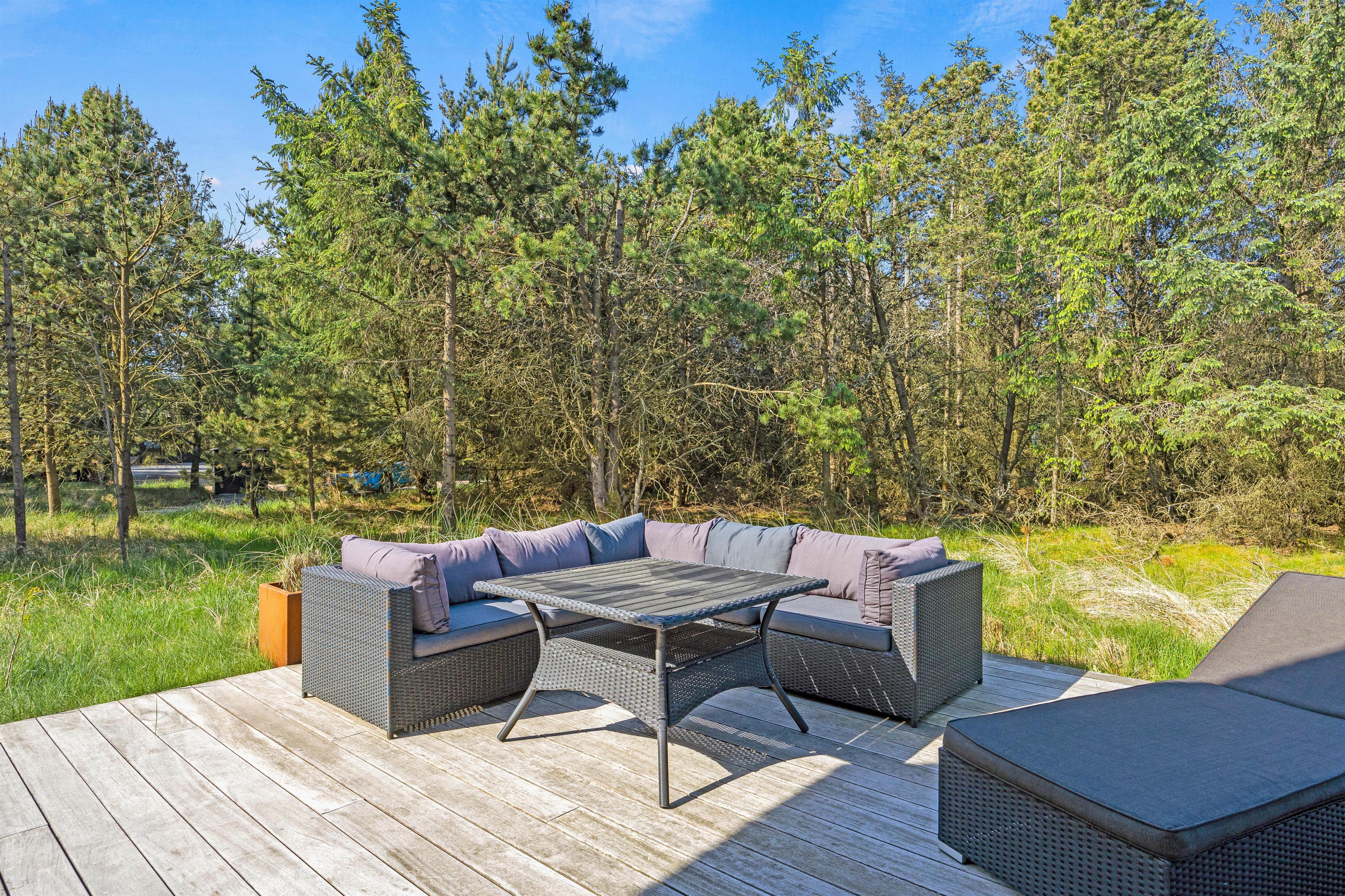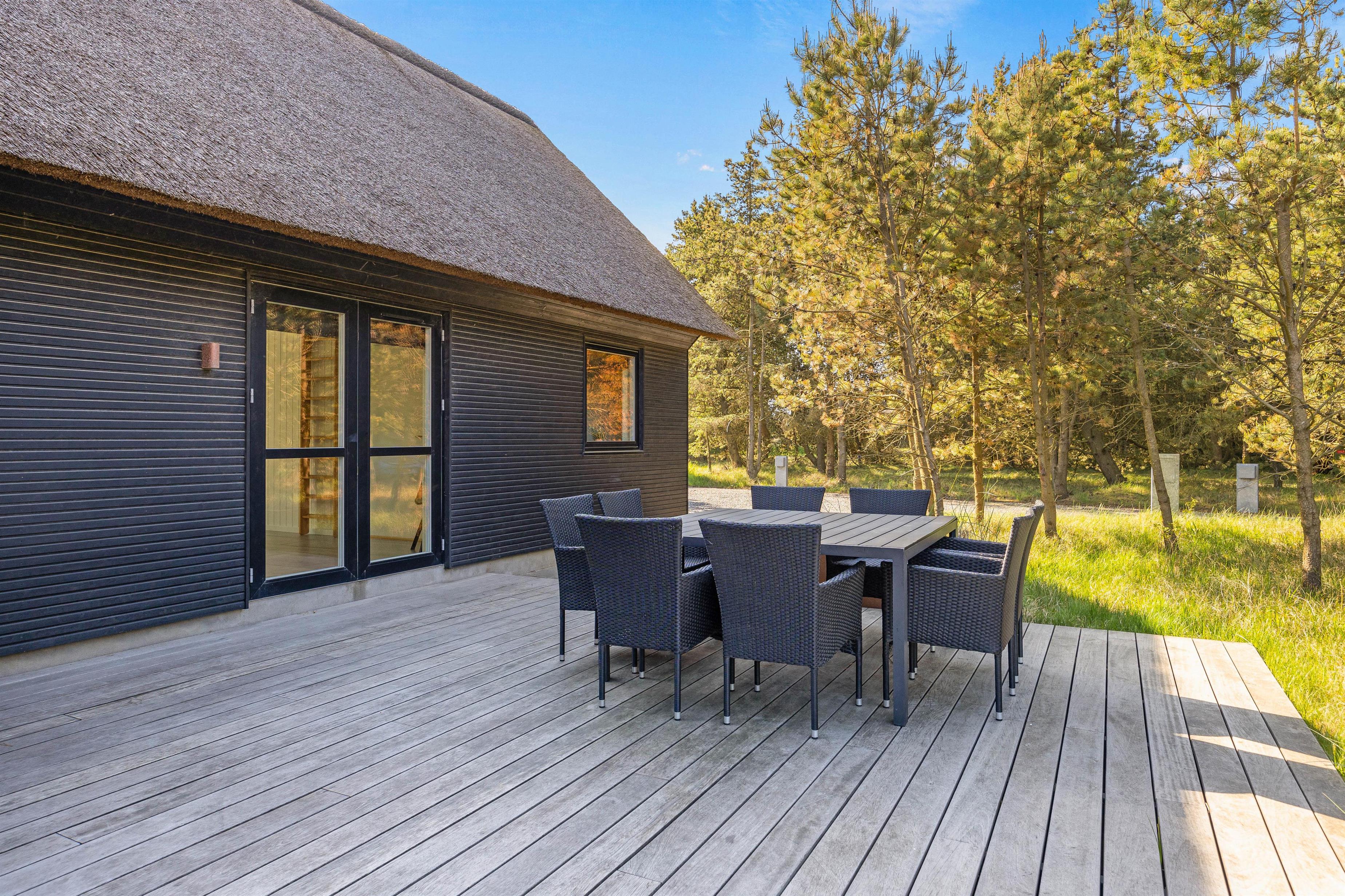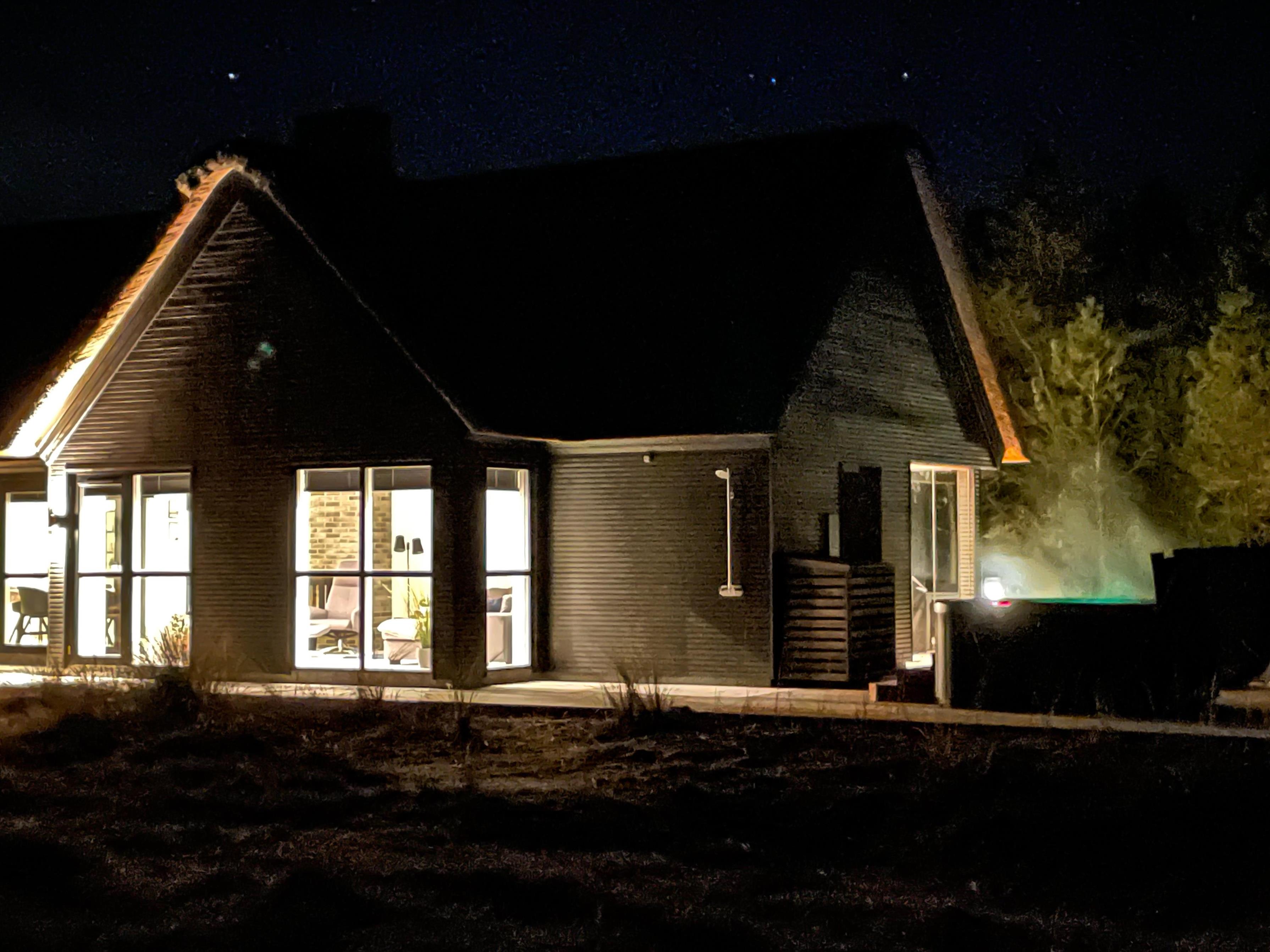 Den luksuriøse stil fortsætter udenfor. Her står et stort udendørs spabad på terrassen klar til at give jer de skønneste wellnessoplevelser under åben himmel, mens I kan nyde panoramaudsigten til det uberørte hedelandskab. Et lille ekstra på terrassen er udendørsbruseren, hvor I kan få jer en skyller i det fri eller hurtigt få fødderne rene for sand efter en strandtur. Udebruseren er kun til rådighed fra 1. april til 31. oktober.