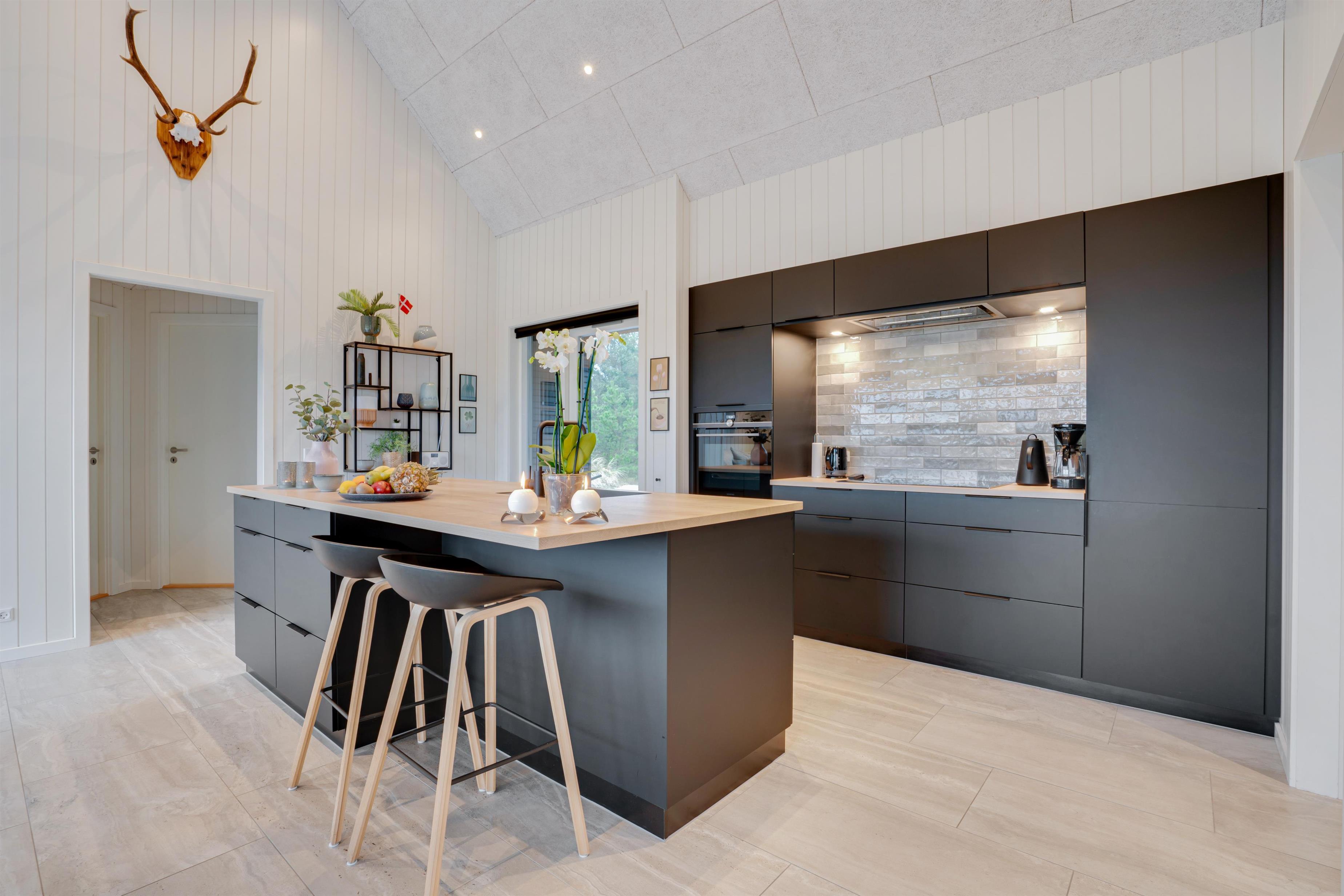 Det stråtækte luksussommerhus er opført i 2019, og den stilfulde indretning med sans for både detaljer og kvalitet vil falde i selv den mest kræsne feriegæsts smag. Loft til kip får omgivelserne til at syne endnu større, og de træbeklædte vægge gør, at I stadig får fornemmelsen af ægte sommerhushygge – også hjulpet på vej af den charmerende alkove i køkkenalrummet og den klassiske brændeovn. Fra de store vinduespartier i alrummet har I en skøn udsigt til den omkringliggende natur.