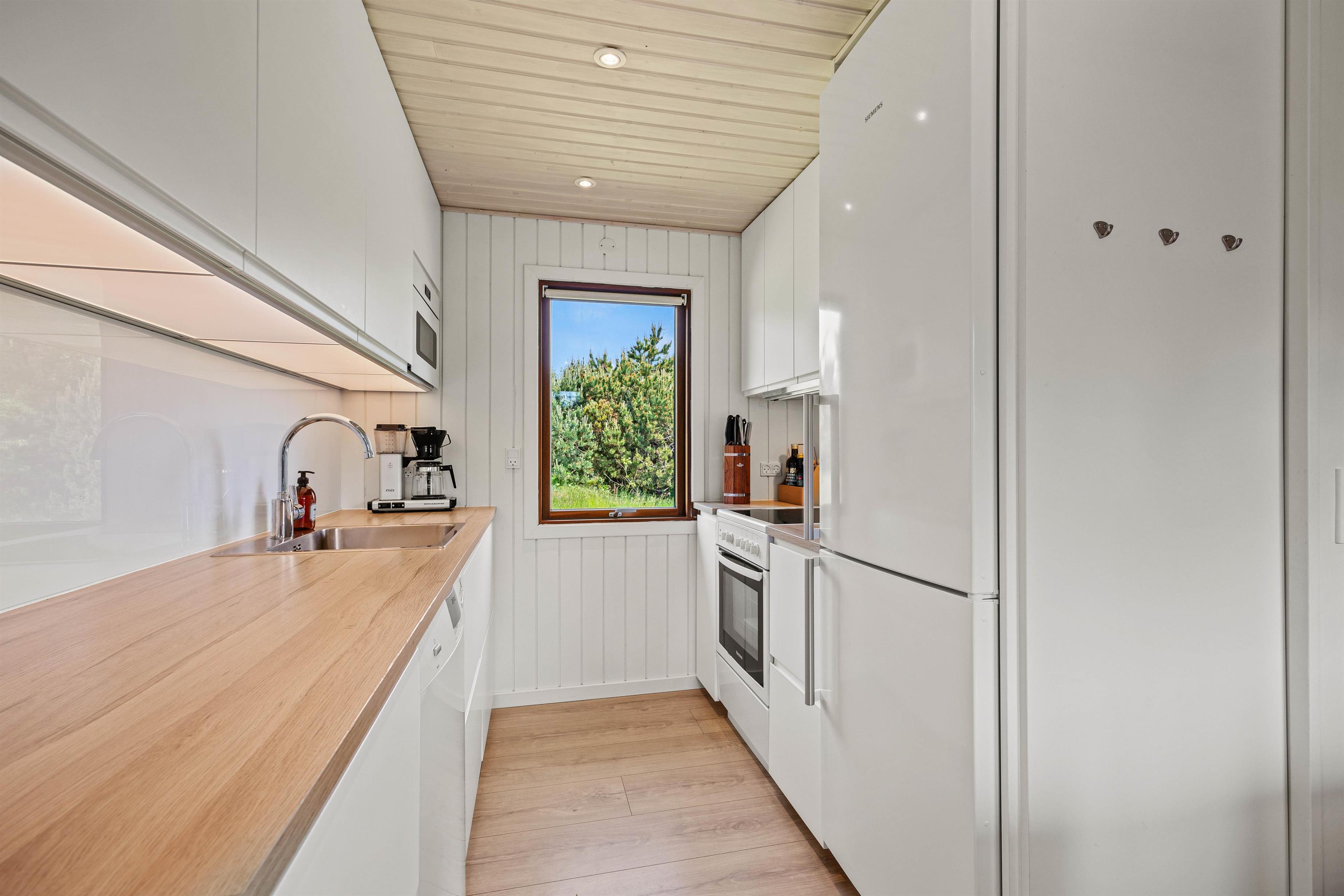Det lille, lyse køkken har både mikroovn, opvaskemaskine og en 90 liters fryser, så I kan give jer i kast med god gastronomi på ferien og altid kan have flere forsyninger på lager. Når maden er klar, kan I samles om spisebordet og tale om dagens spændende ferieoplevelser i skønne Blåvand.