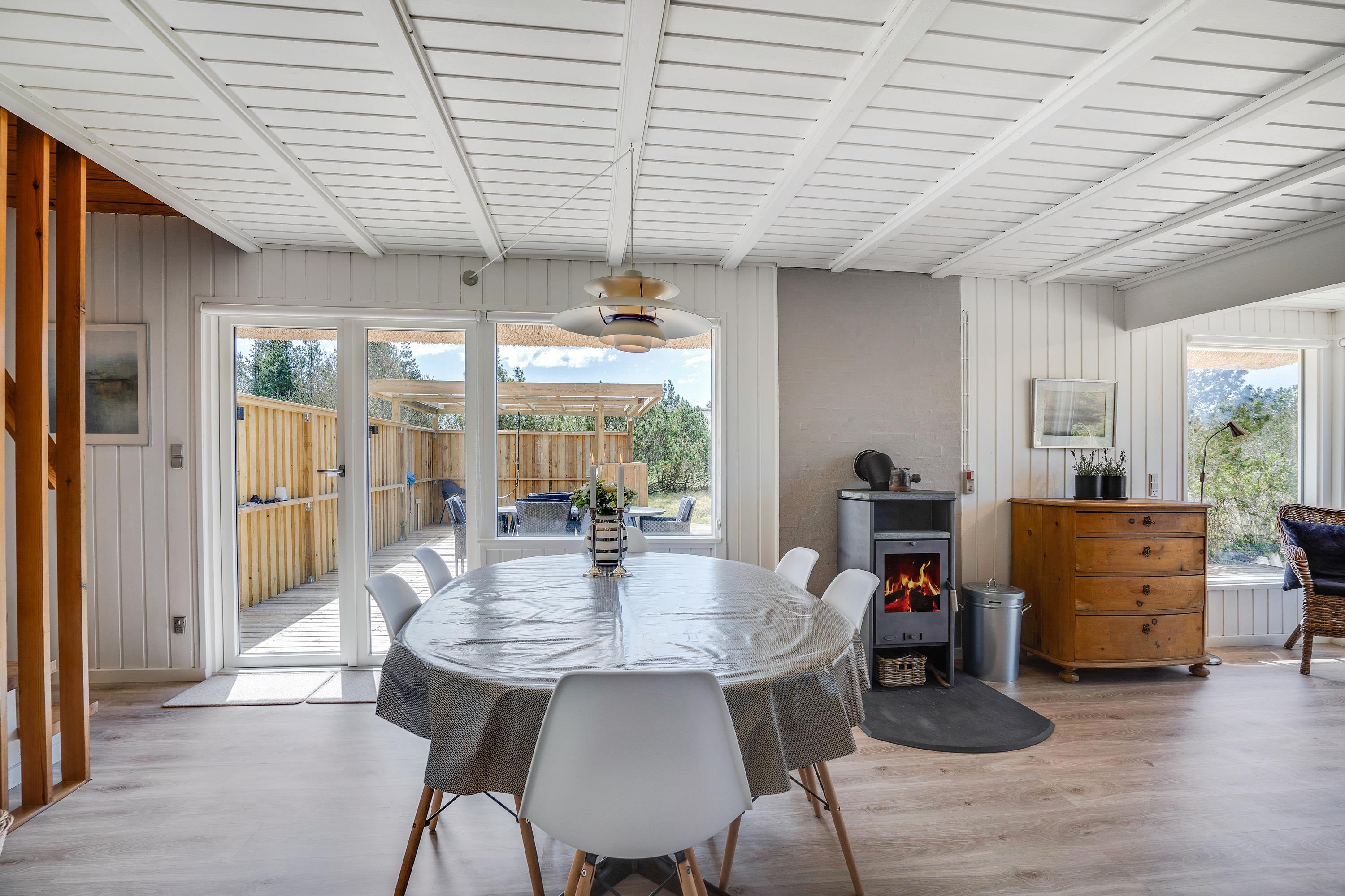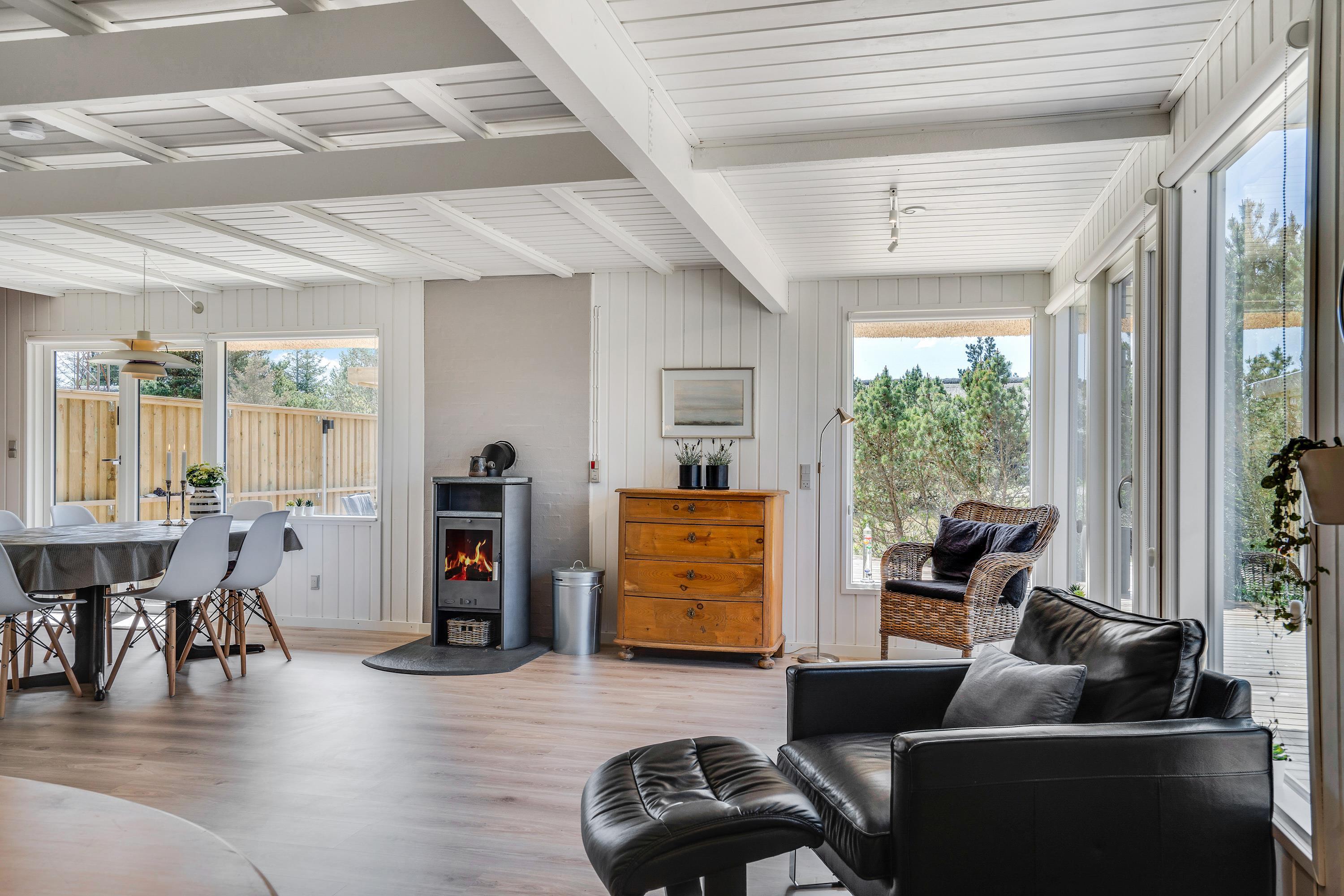 Den klassiske brændeovn i opholdsrummet og luft-til-luft-varmepumpen sørger for en skøn ferieatmosfære året rundt.