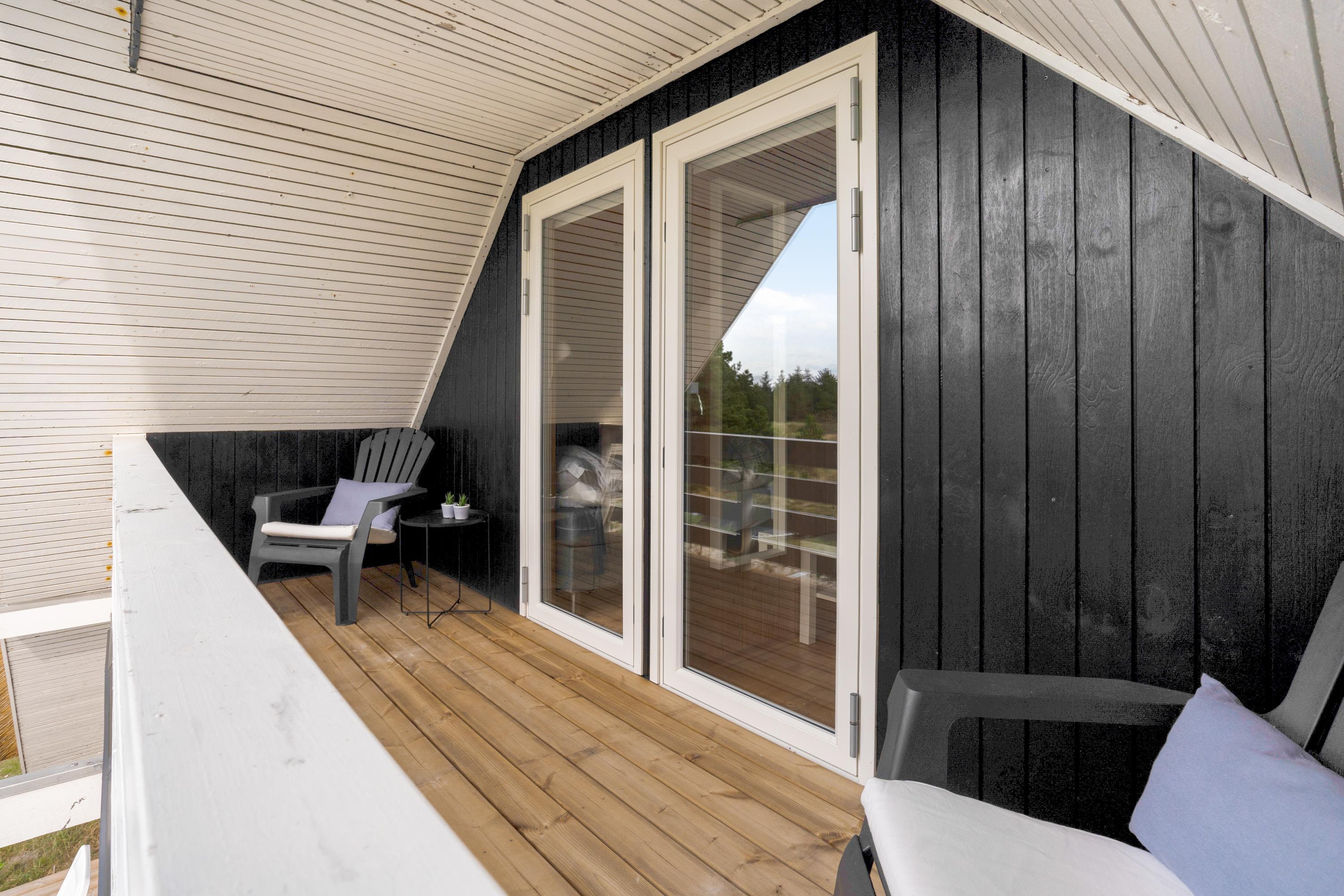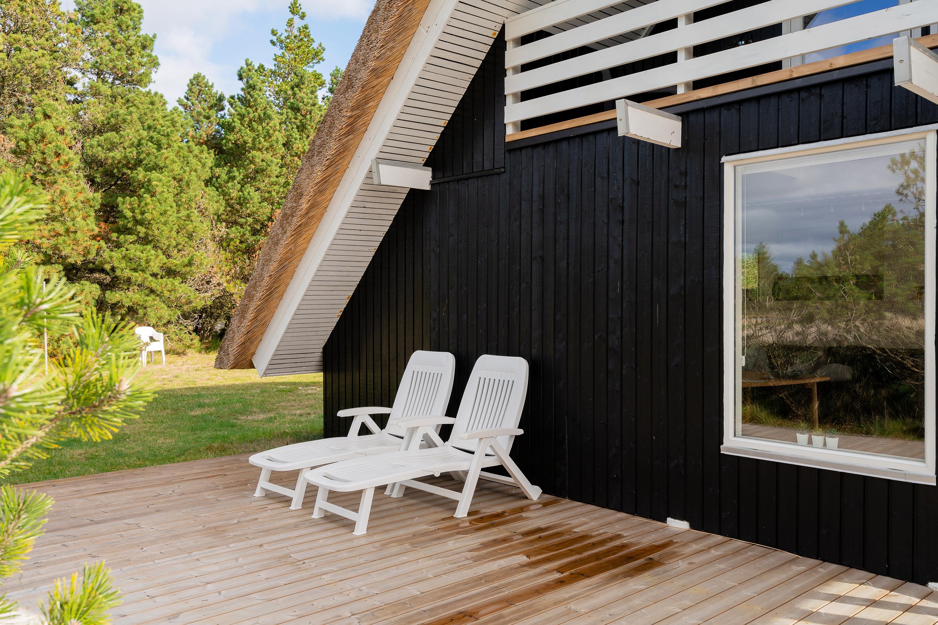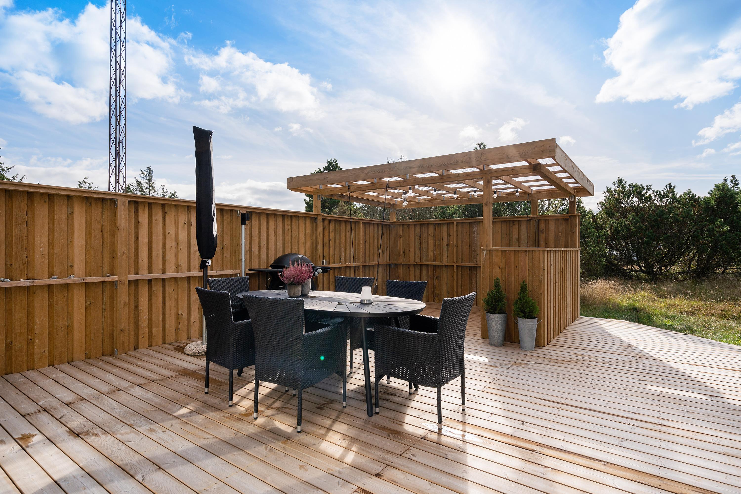 Fra stuen kommer I ud på den delvist overdækkede og afskærmede terrasse. Herfra kan I nyde udsynet til den vestjyske hede, mens I slapper af i liggestolene eller spiser en lækker frokost ved havebordet. Der er også en udebruser, som I kan benytte fra 1. april til 31. oktober.