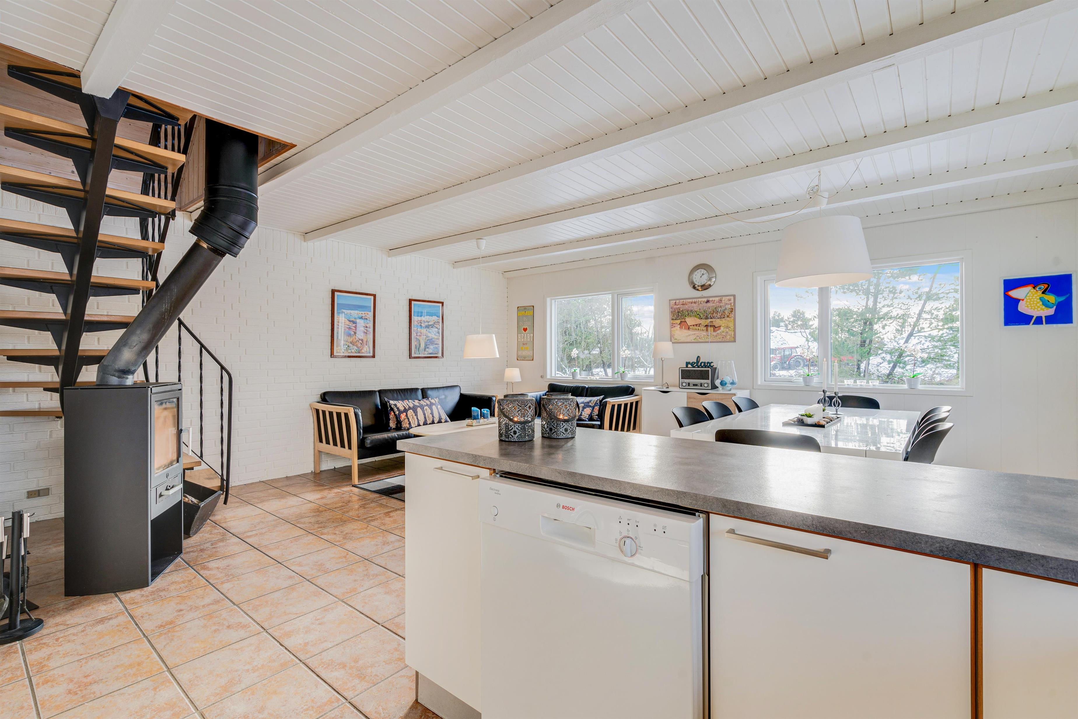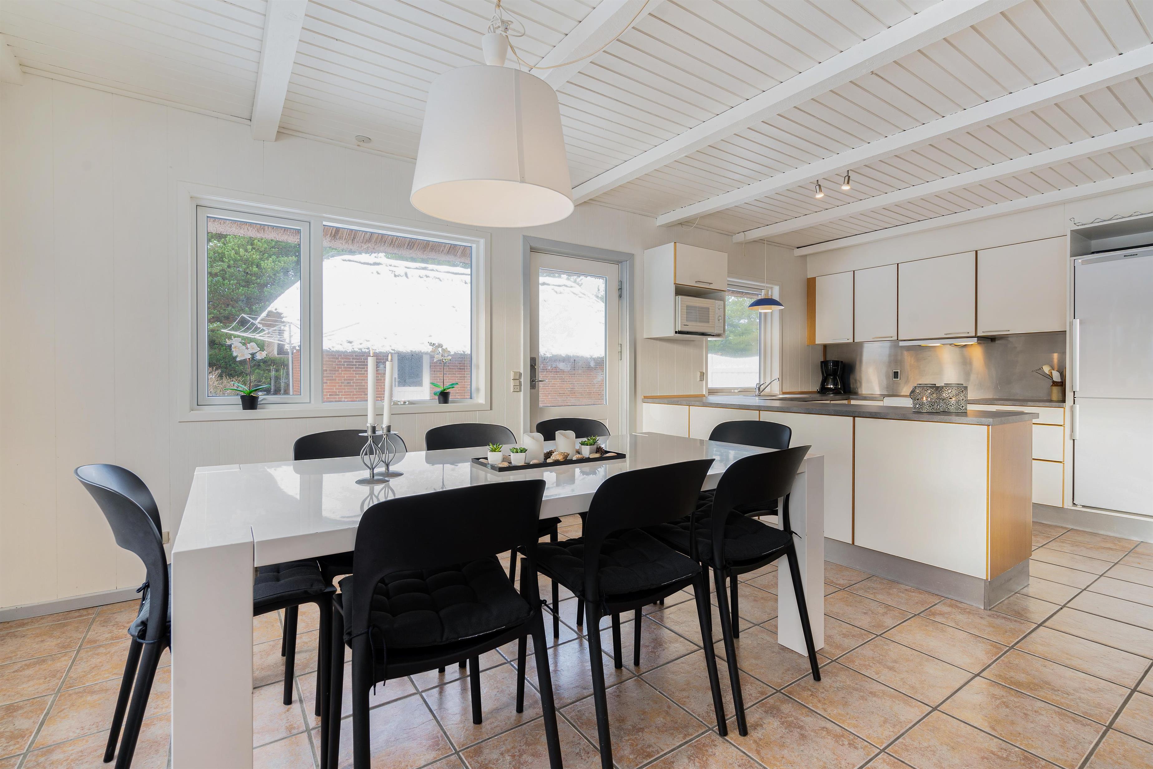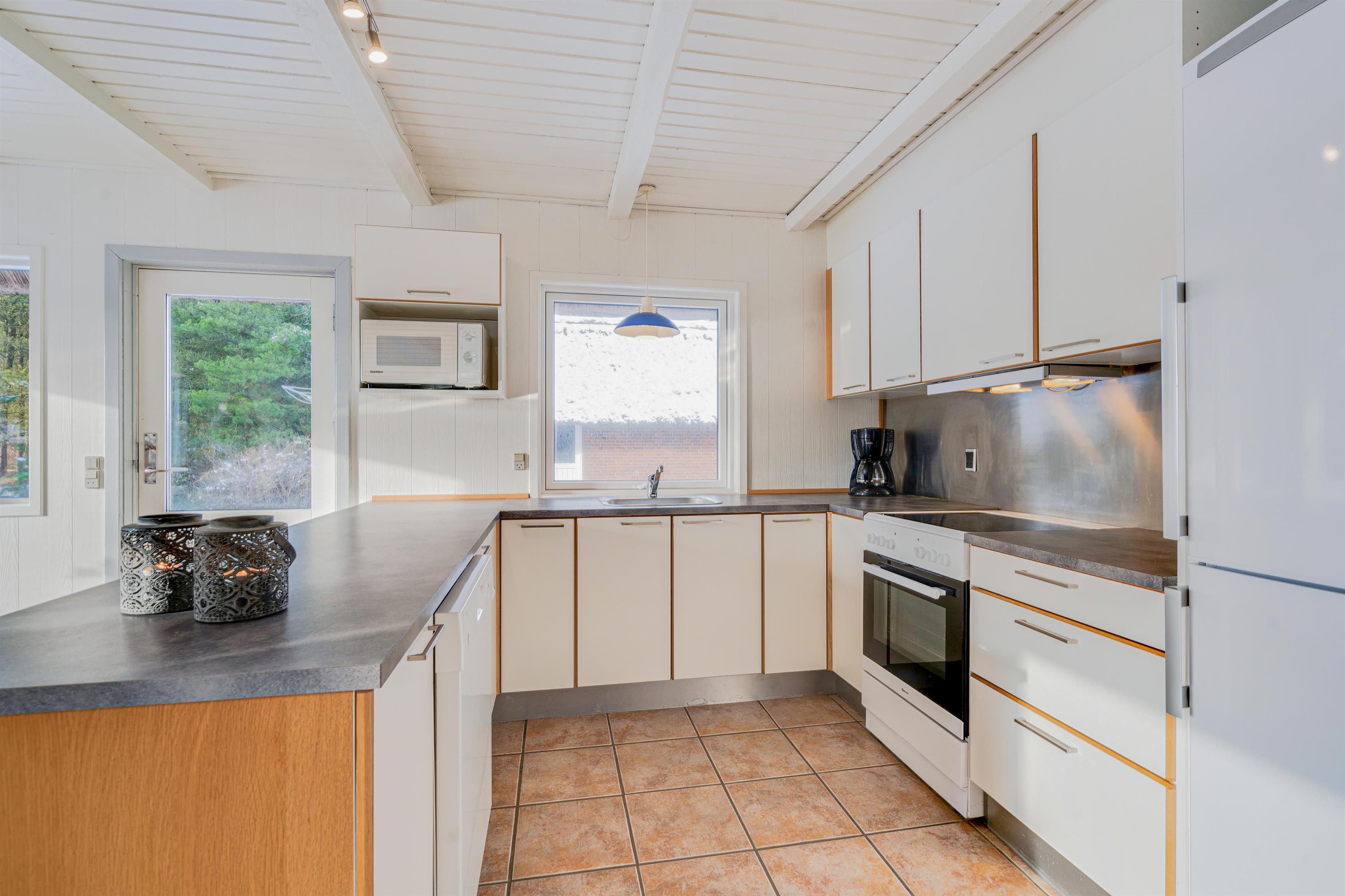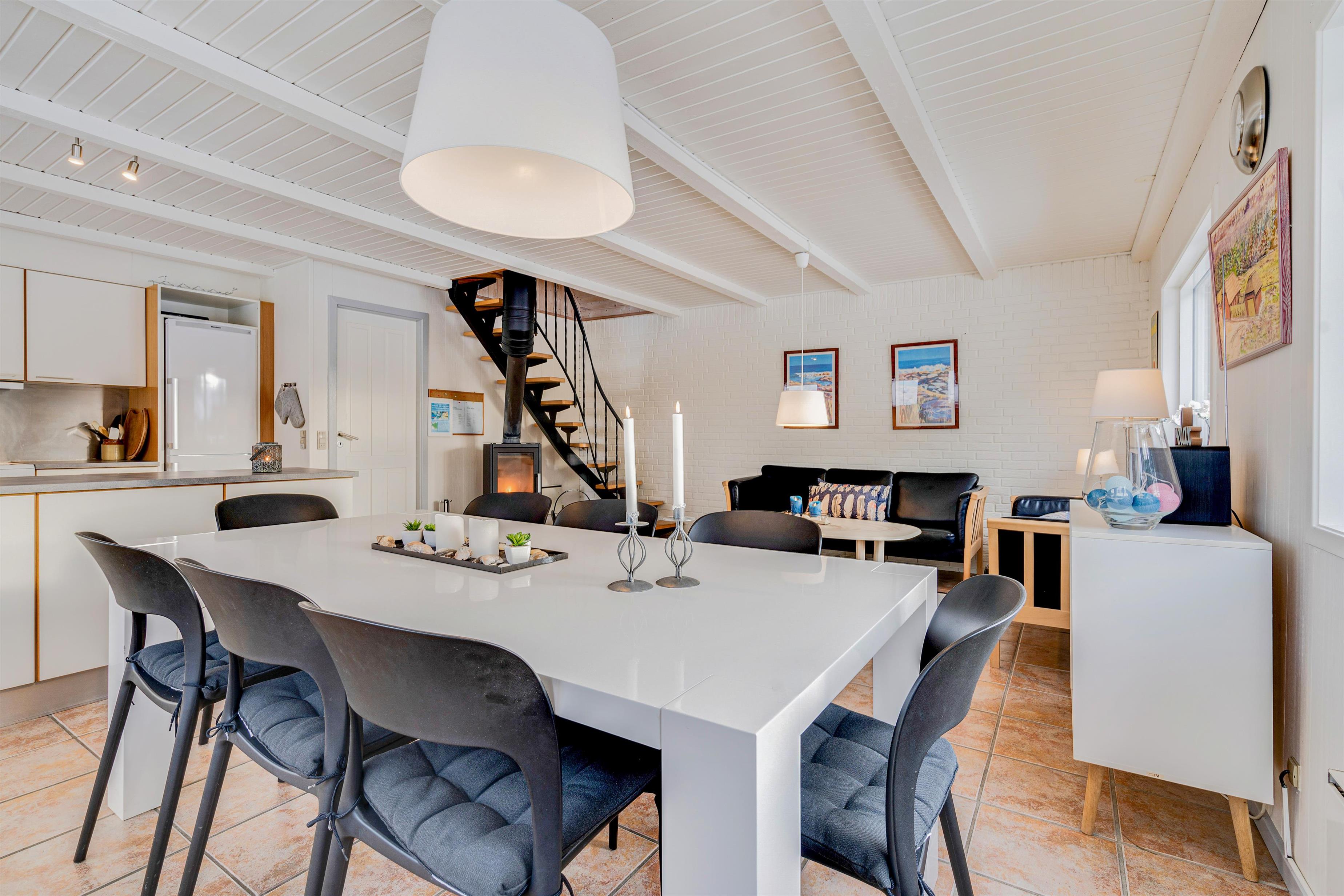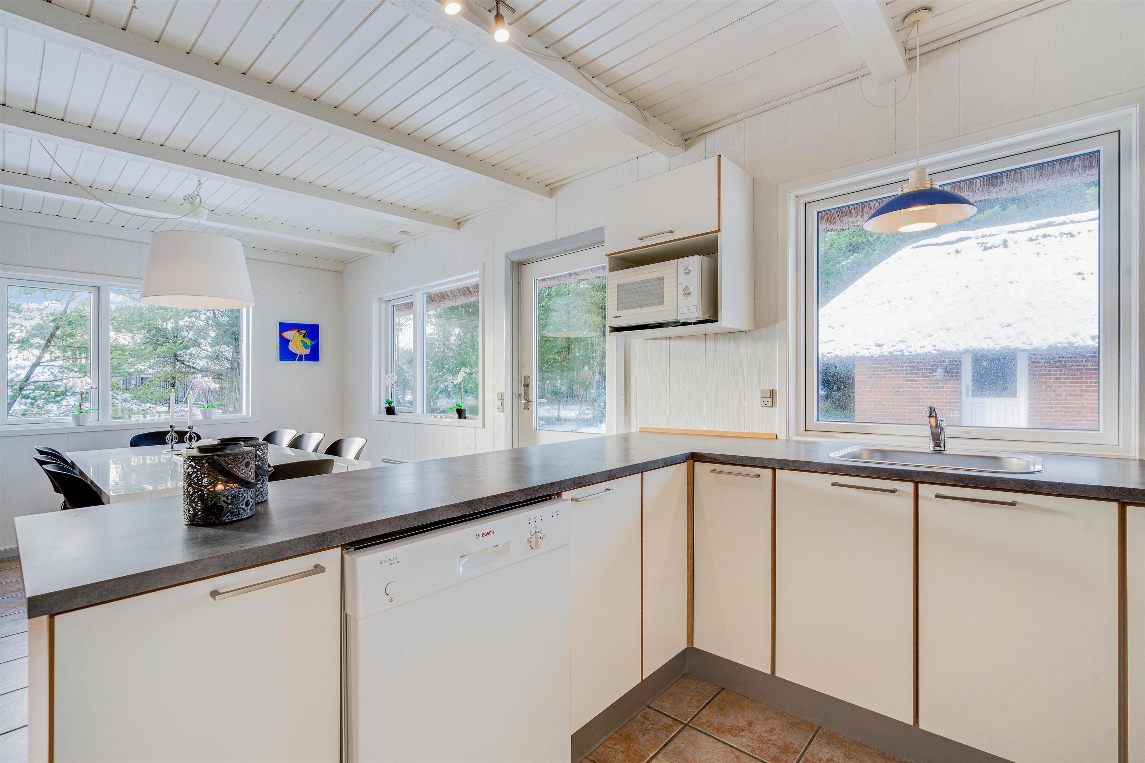 Det veludstyrede køkken er i åben forbindelse til spisestuen, hvor der også er en dør direkte ud til den store sydvendte terrasse. Her er rig mulighed for at alle kan hjælpe til med dages måltider, om det er på grill eller komfur de tilberedes. Sandkasse og gynger står klar på den store grund, som ligger rundt om sommerhuset. Her er der god mulighed for leg både for børn, voksne og hund, - der er nemlig op til 2 hunde tilladt i huset.