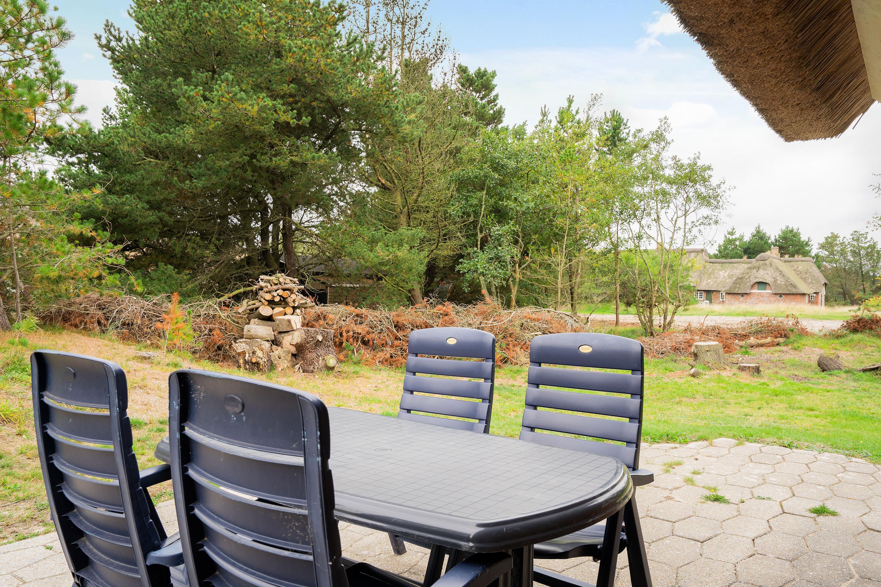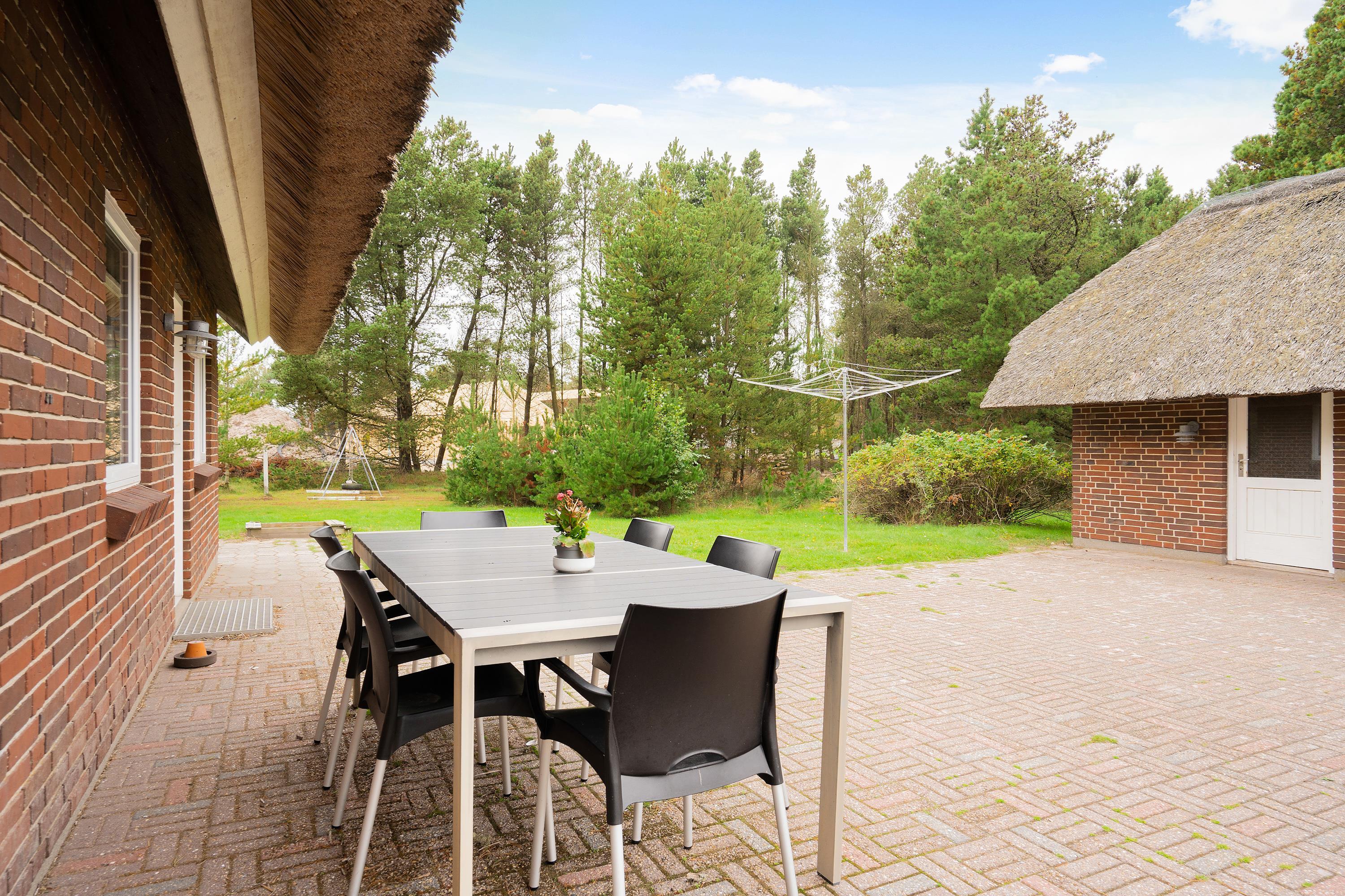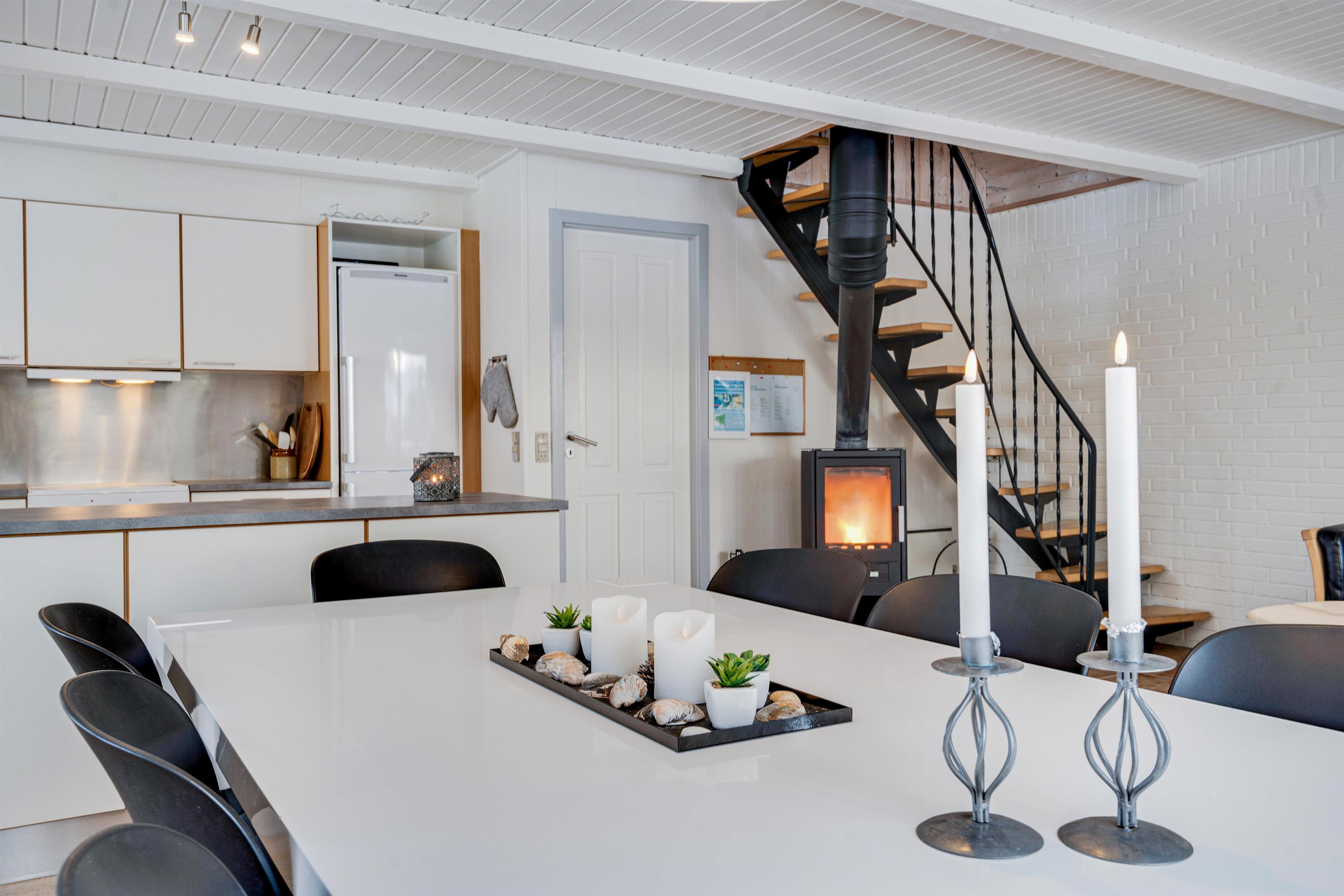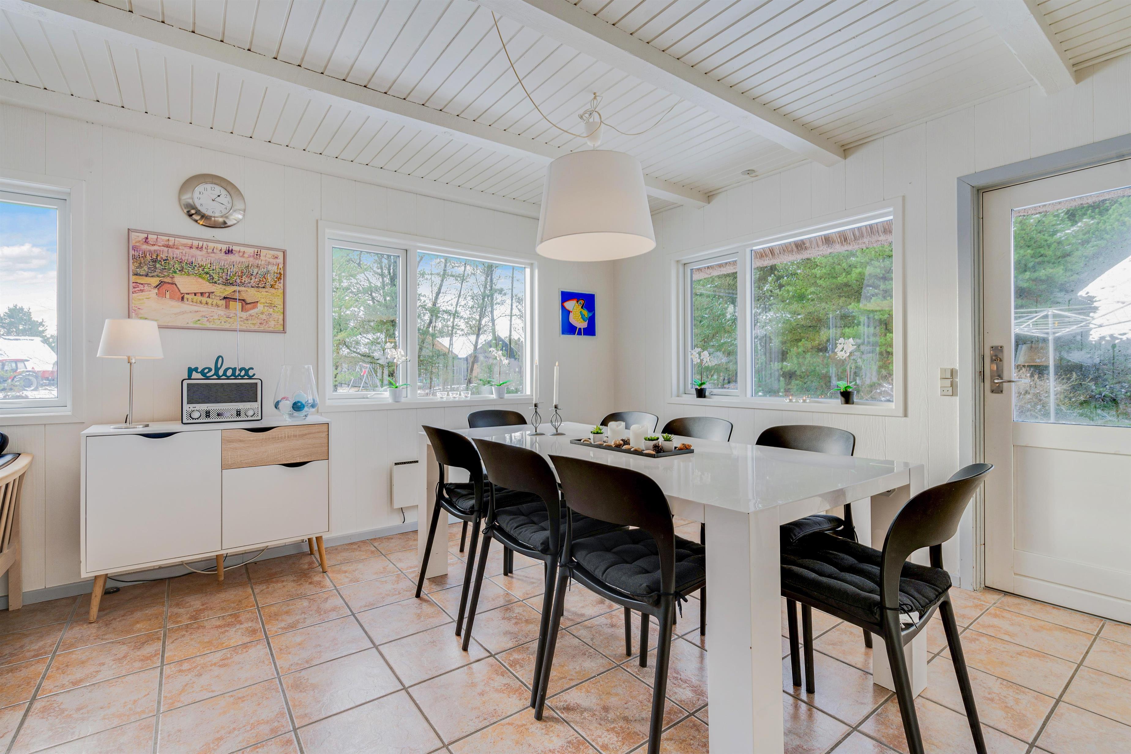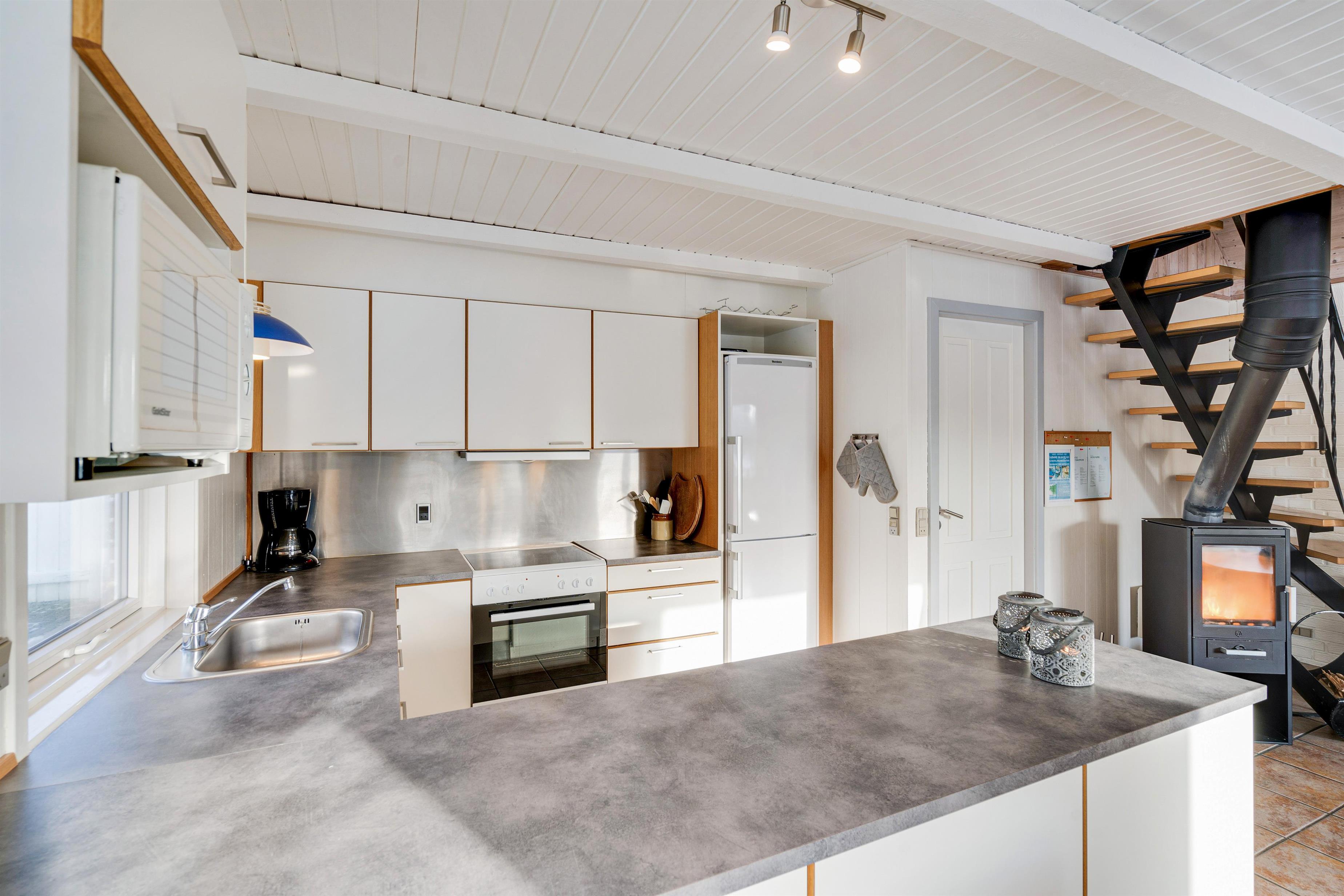 Det veludstyrede køkken er i åben forbindelse til spisestuen, hvor der også er en dør direkte ud til den store sydvendte terrasse. Her er rig mulighed for at alle kan hjælpe til med dages måltider, om det er på grill eller komfur de tilberedes. Sandkasse og gynger står klar på den store grund, som ligger rundt om sommerhuset. Her er der god mulighed for leg både for børn, voksne og hund, - der er nemlig op til 2 hunde tilladt i huset.