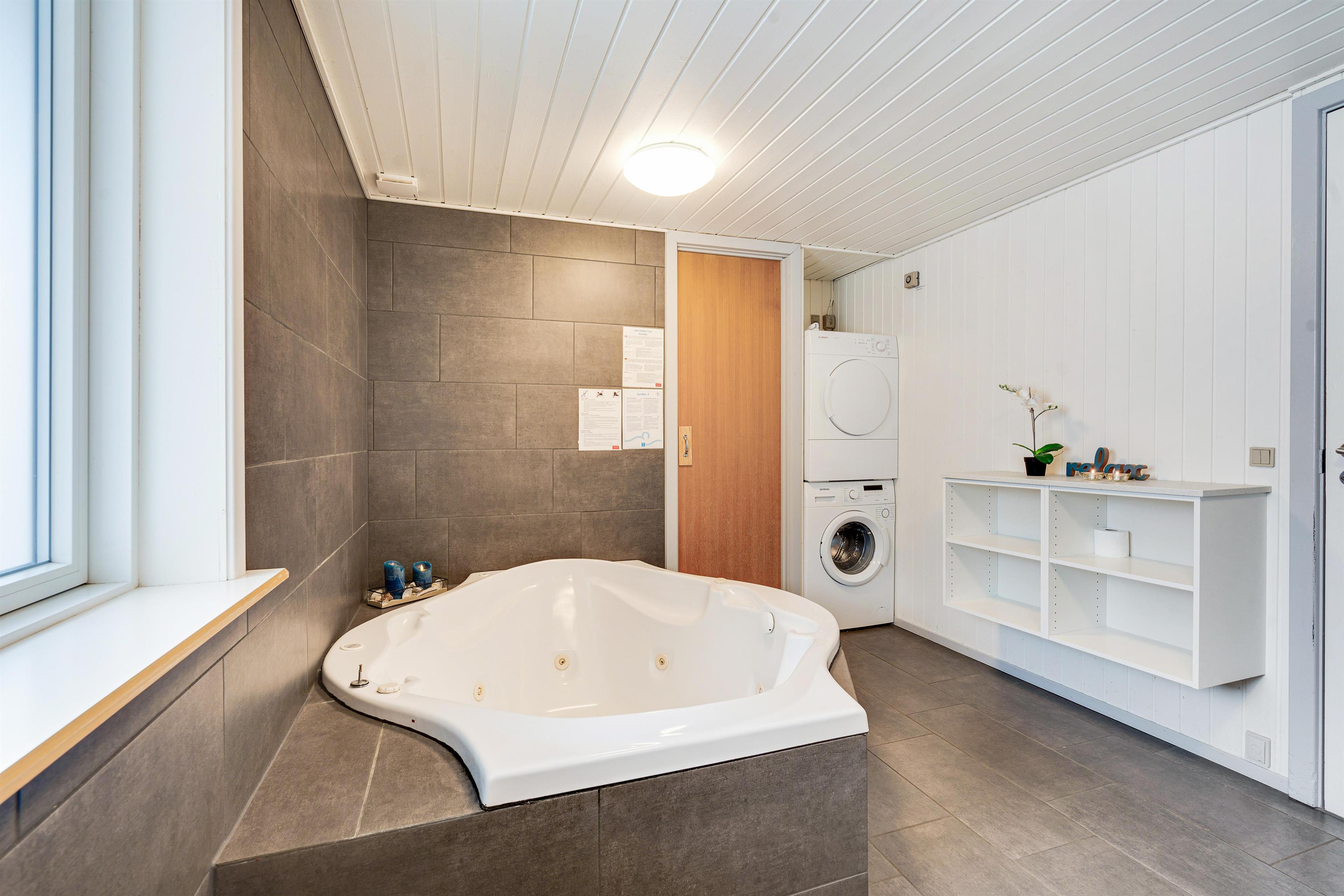 Sommerhuset er løbende renoveret og indeholder dejligt stort badeværelse med spa og sauna, gæstetoilet på 1. sal og ikke mindre end to stuer. Den ene stue endda med brændeovn. Feriehuset er meget bekvemmeligt indrettet og har både opvaskemaskine, vaskemaskine og tørretumbler.