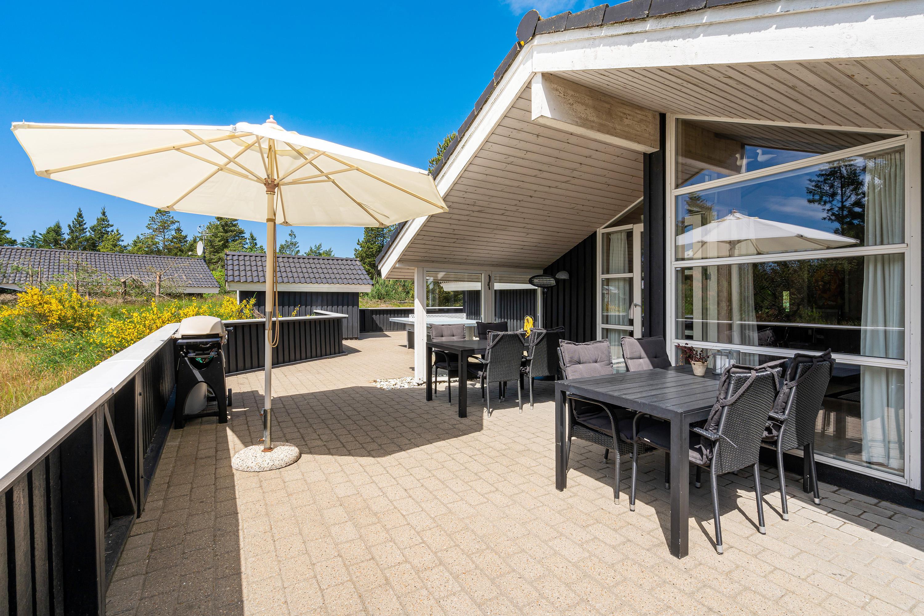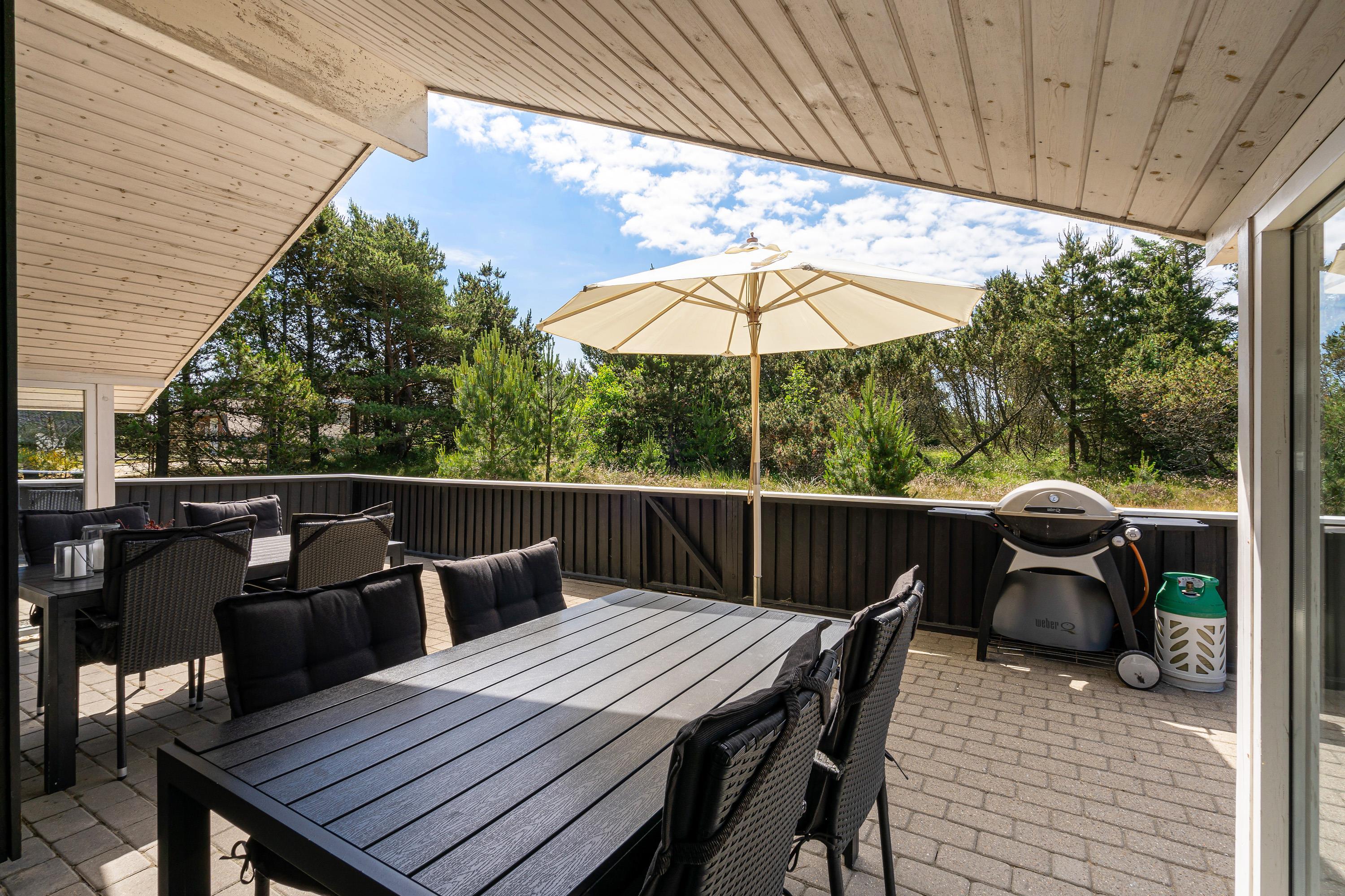 Det er ikke kun indendørs, at sommerhuset på Søren Gades Mark 30B er skønt; det er udeområdet nemlig også. Sommerhuset har en stor terrasse, der er delvist overdækket, hvor I finder flere gode highlights.