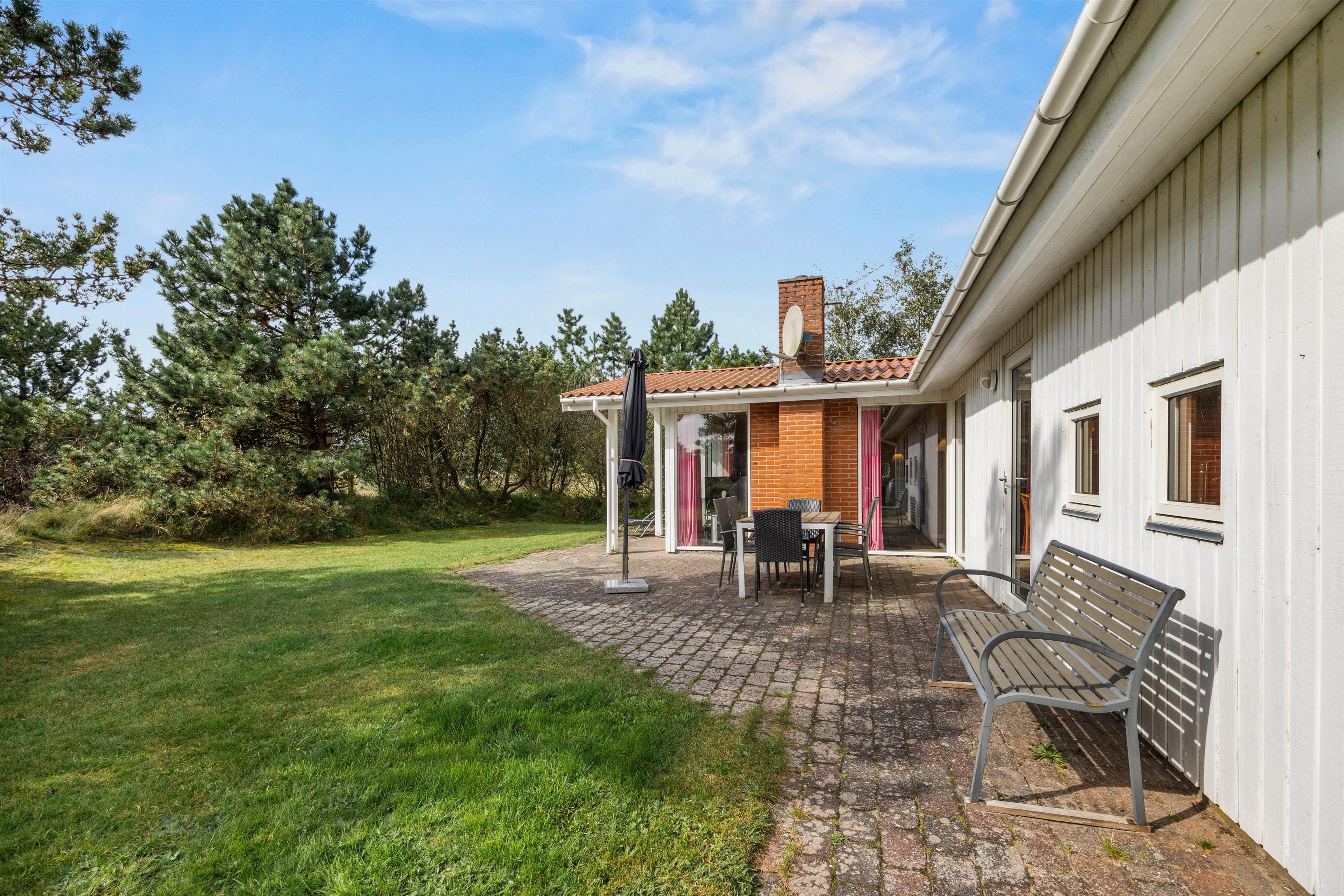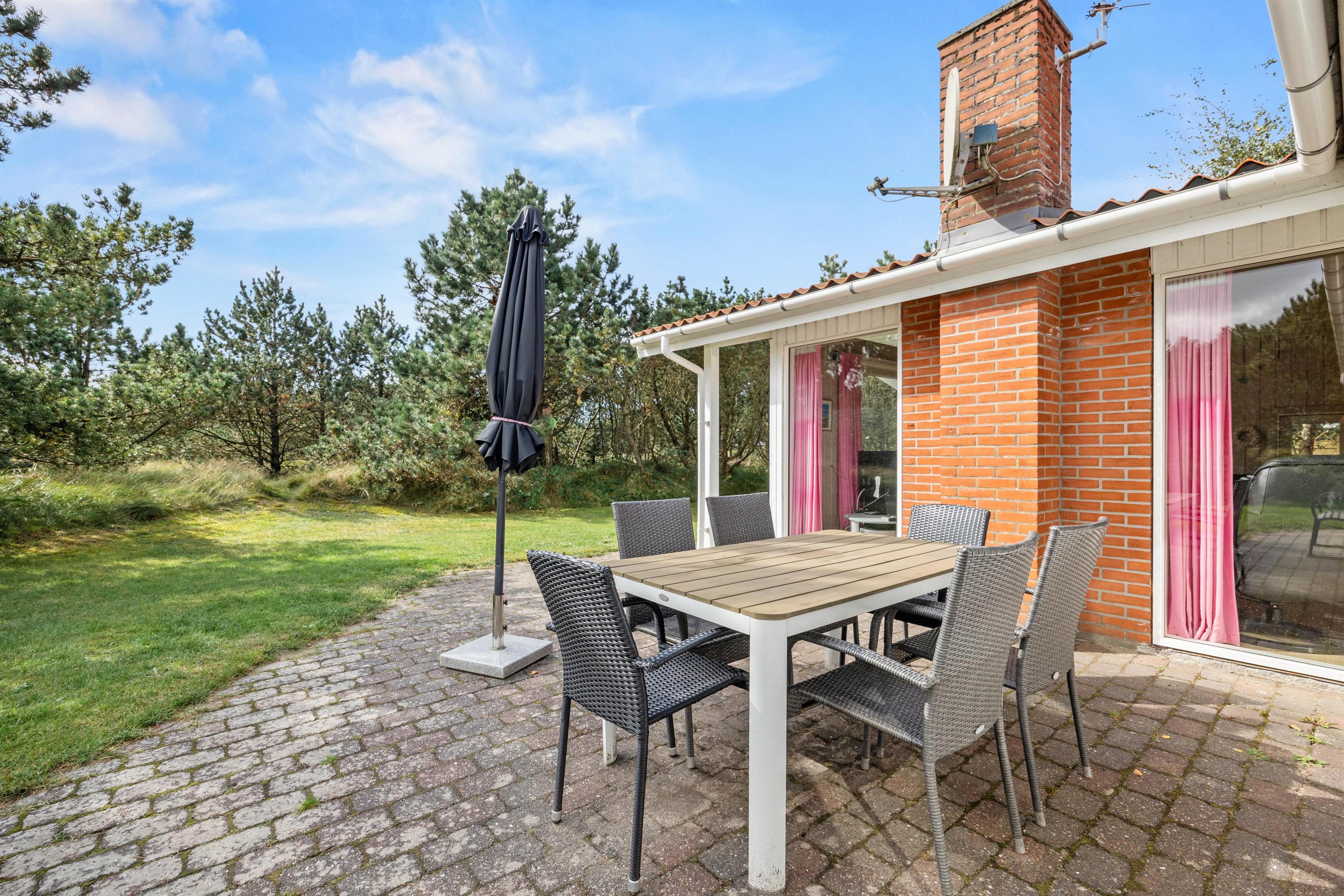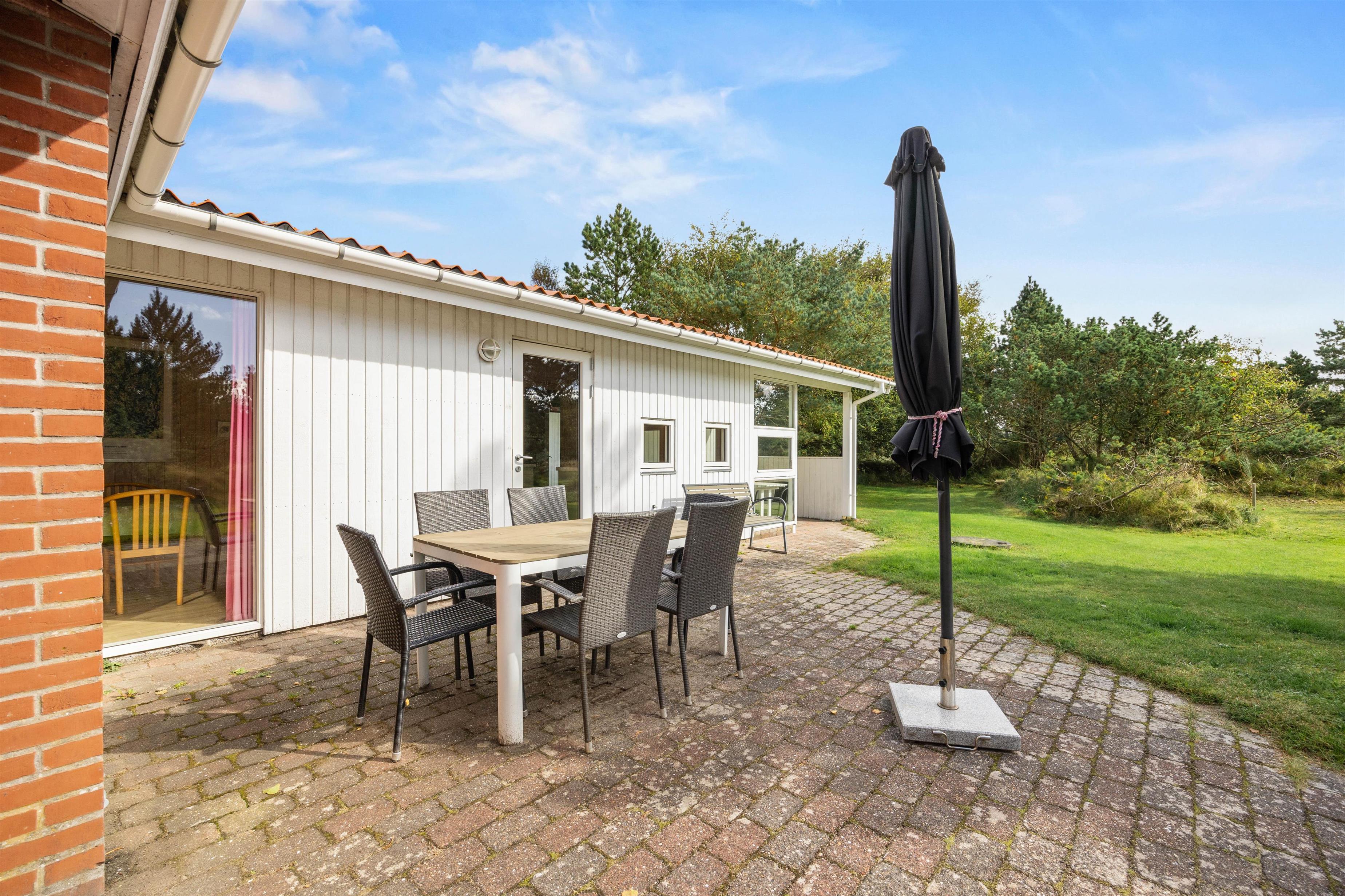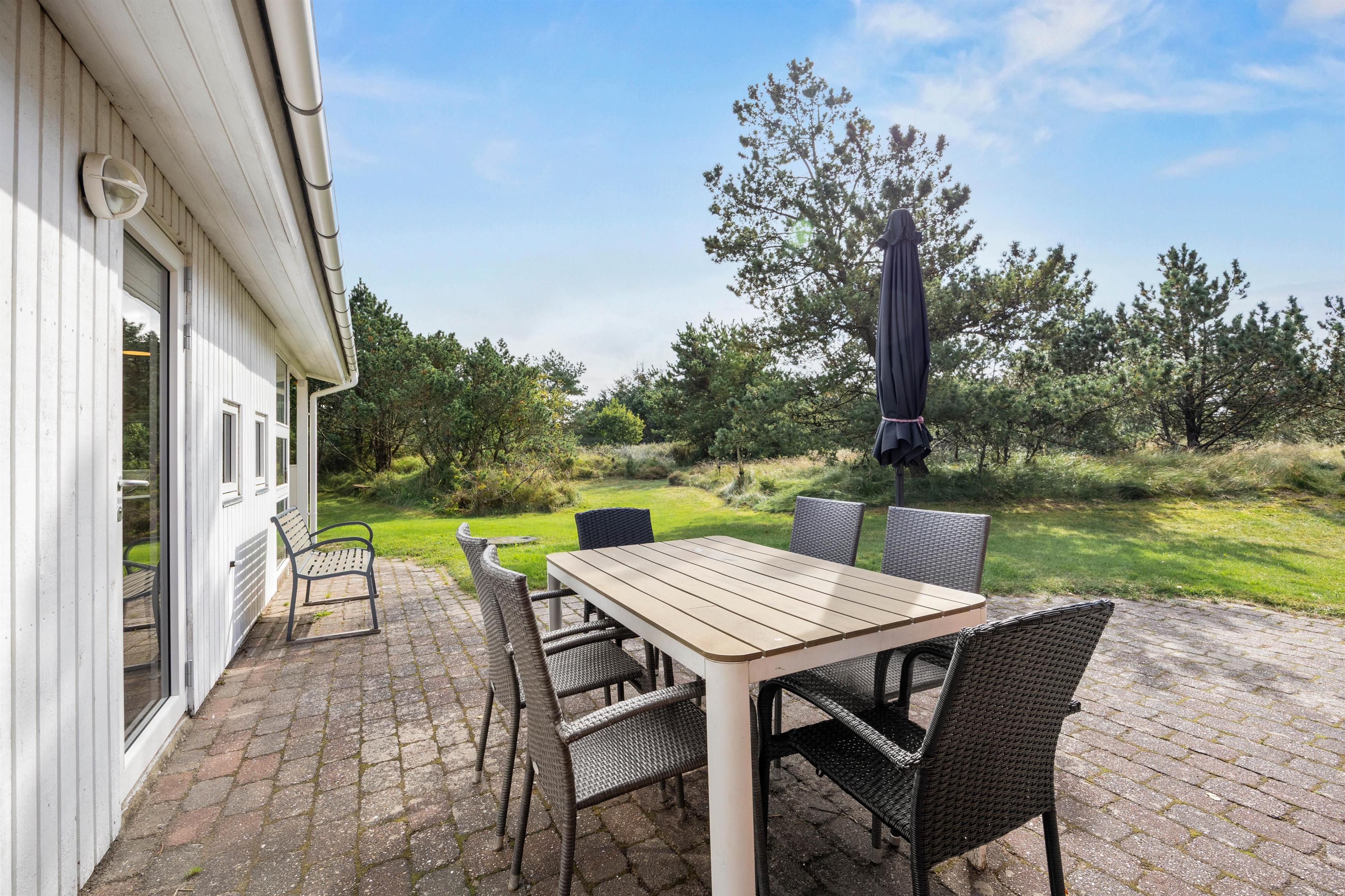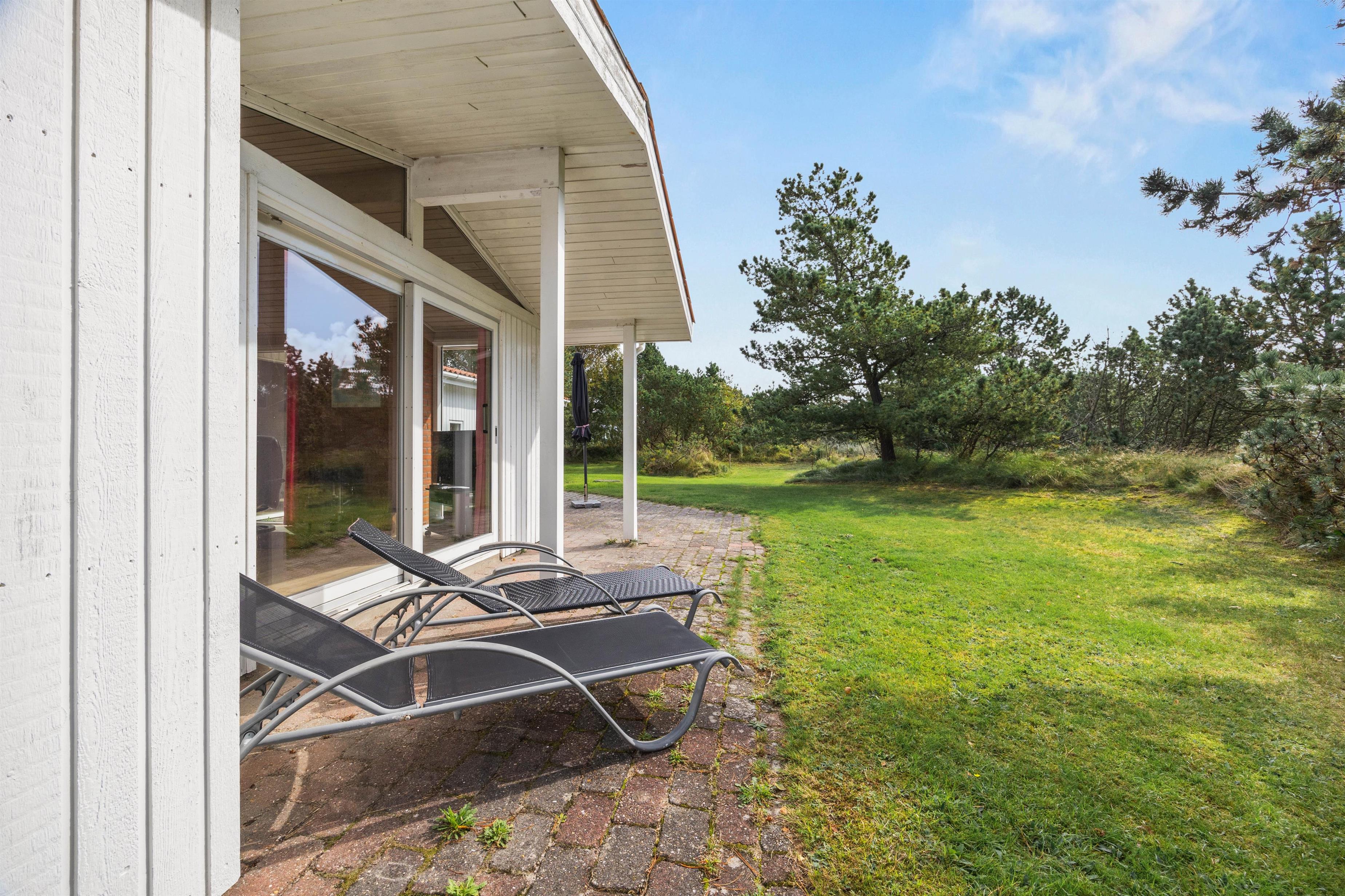 Fra stuen kan I komme direkte ud på terrassen, hvor I altid kan finde en dejlig plads – både i solen eller i skyggen under parasollen. Sæt jer godt til rette, nyd roen og lad ungerne lege på græsset. Naturgrunden er 1600 m2, så her kan I sagtens spille kongespil eller noget helt andet.