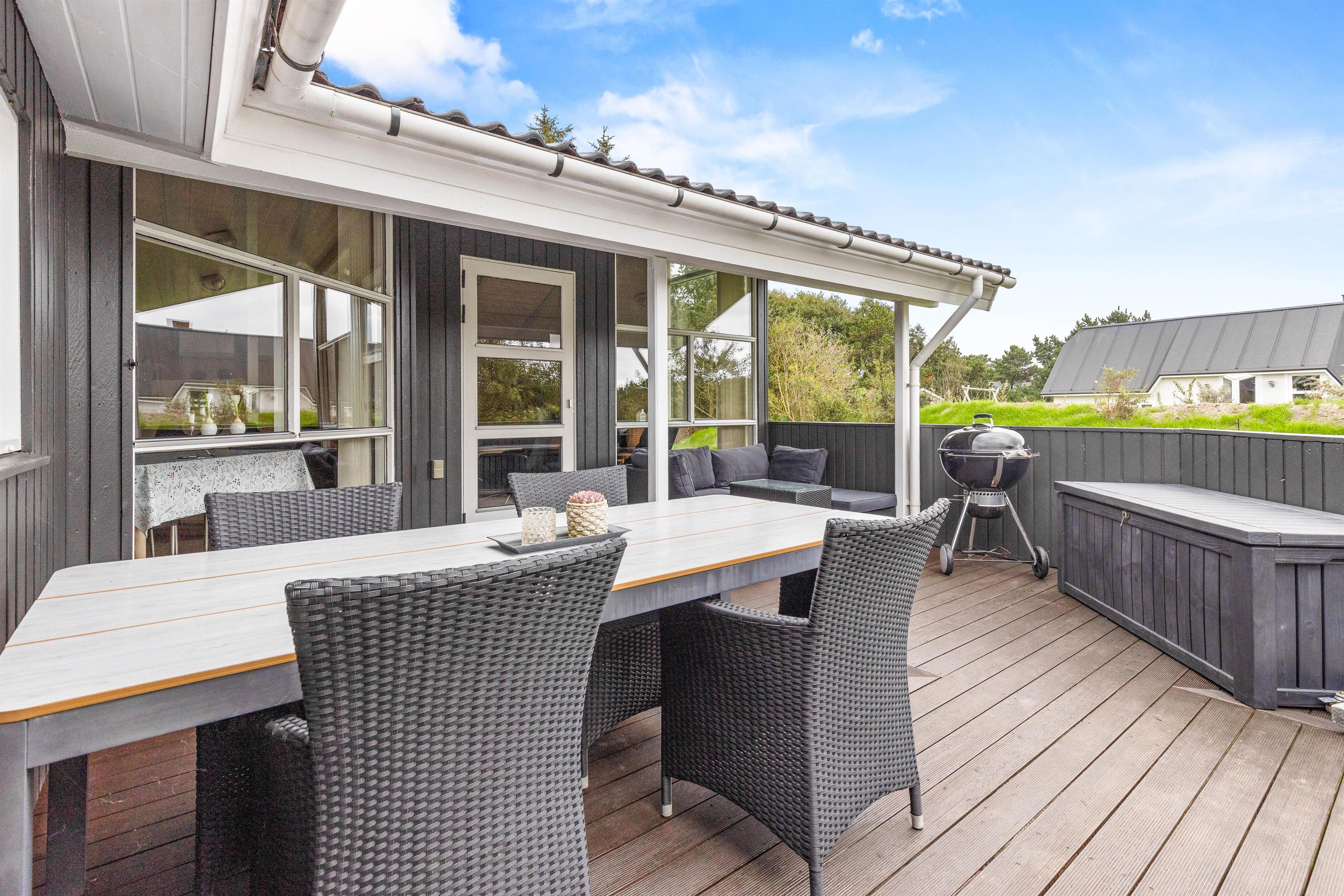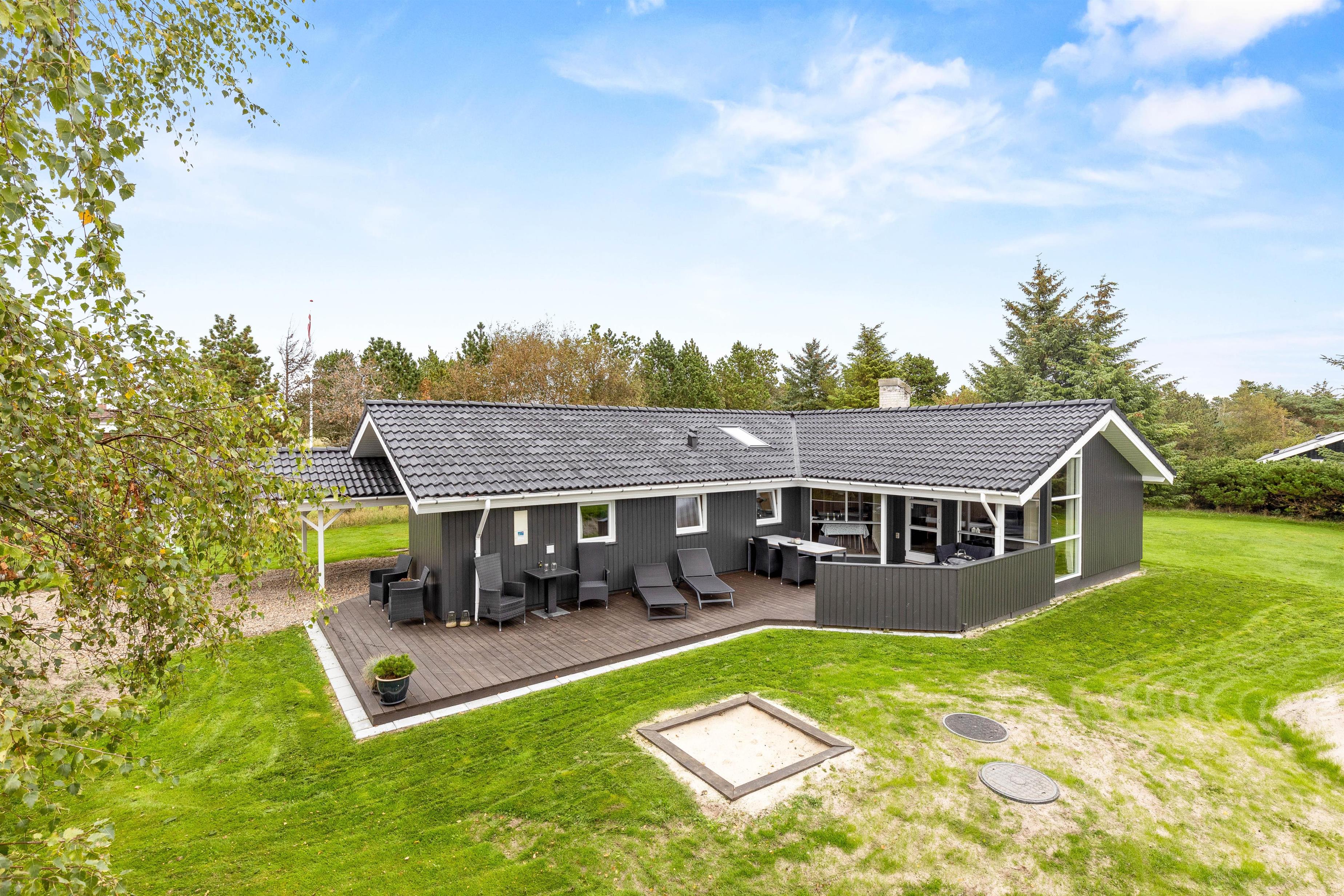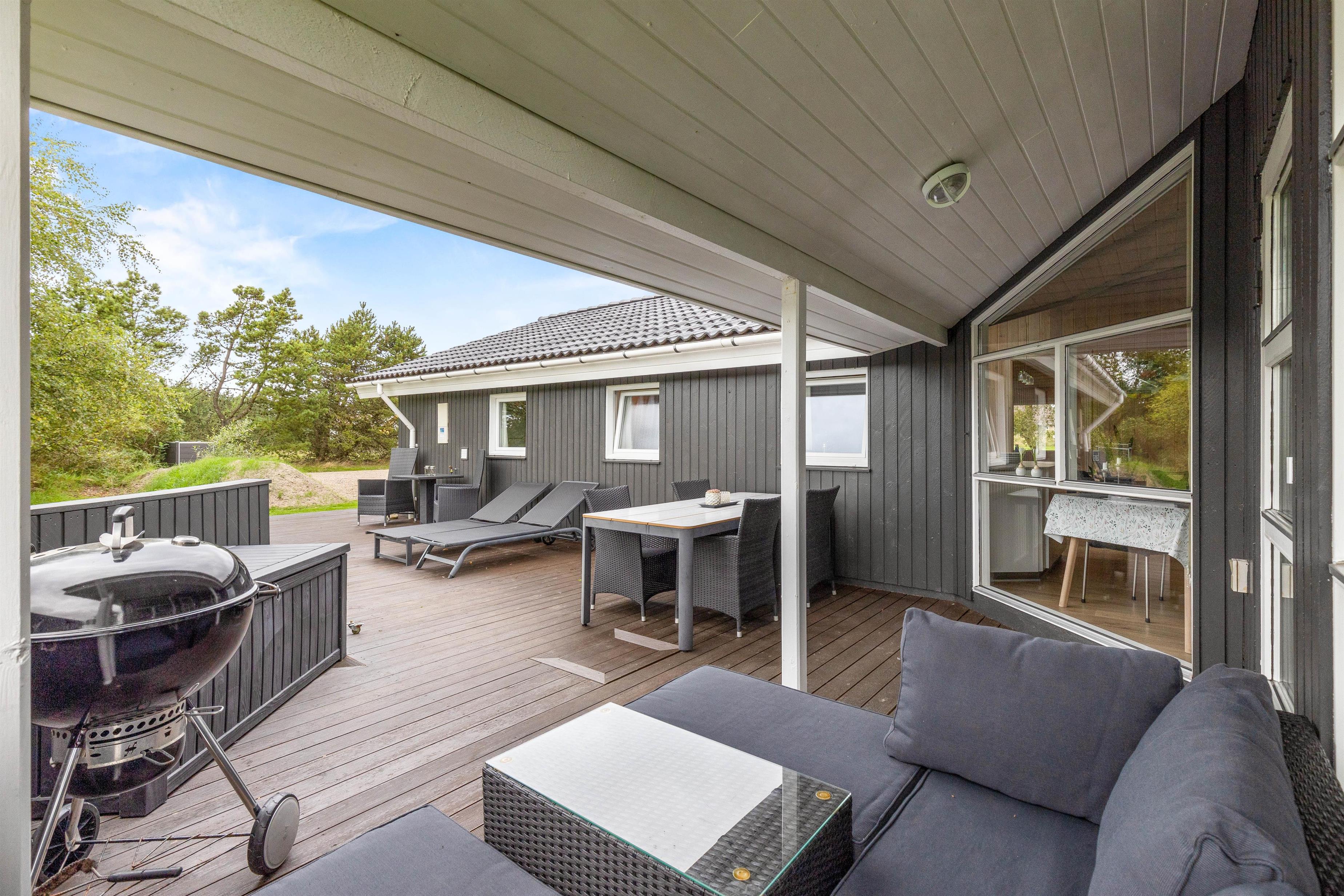 Med til huset hører et skønt udeareal med grøn græsplæne og åben, delvist overdækket terrasse, hvor der er god plads til at sole sig og nyde den friske havluft. Legetårnet, sandkassen og gyngestativet vil blive et sikkert hit blandt de mindste, og på den grønne plæne kan I spille bold og lege med hundene.