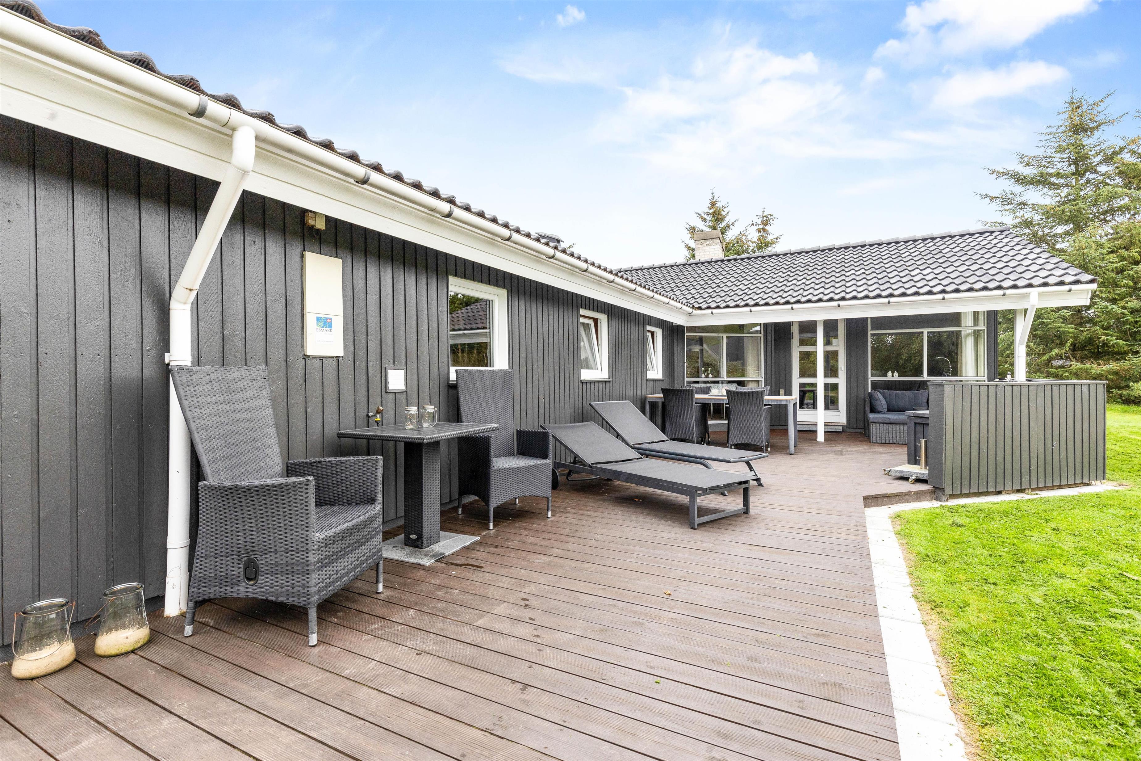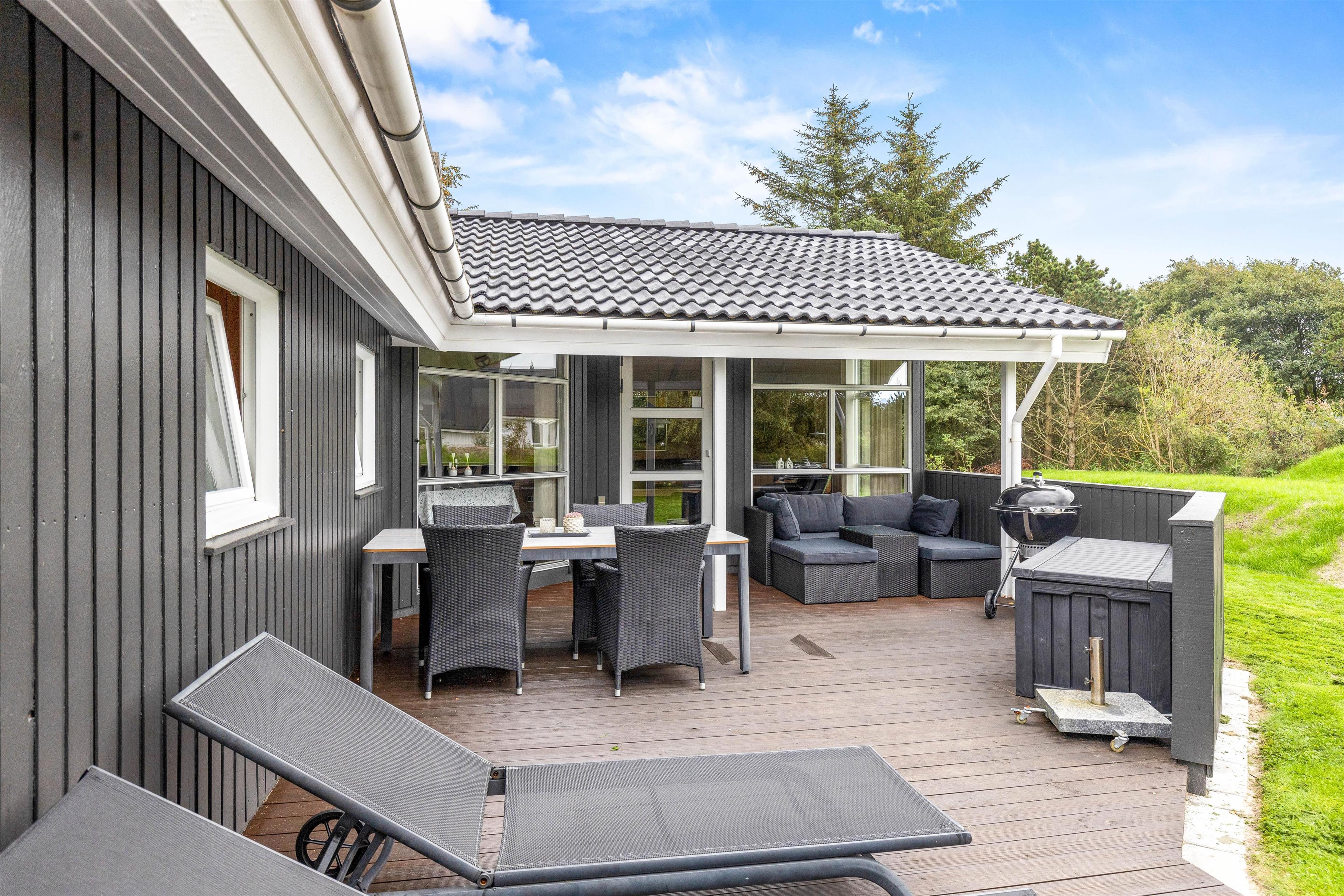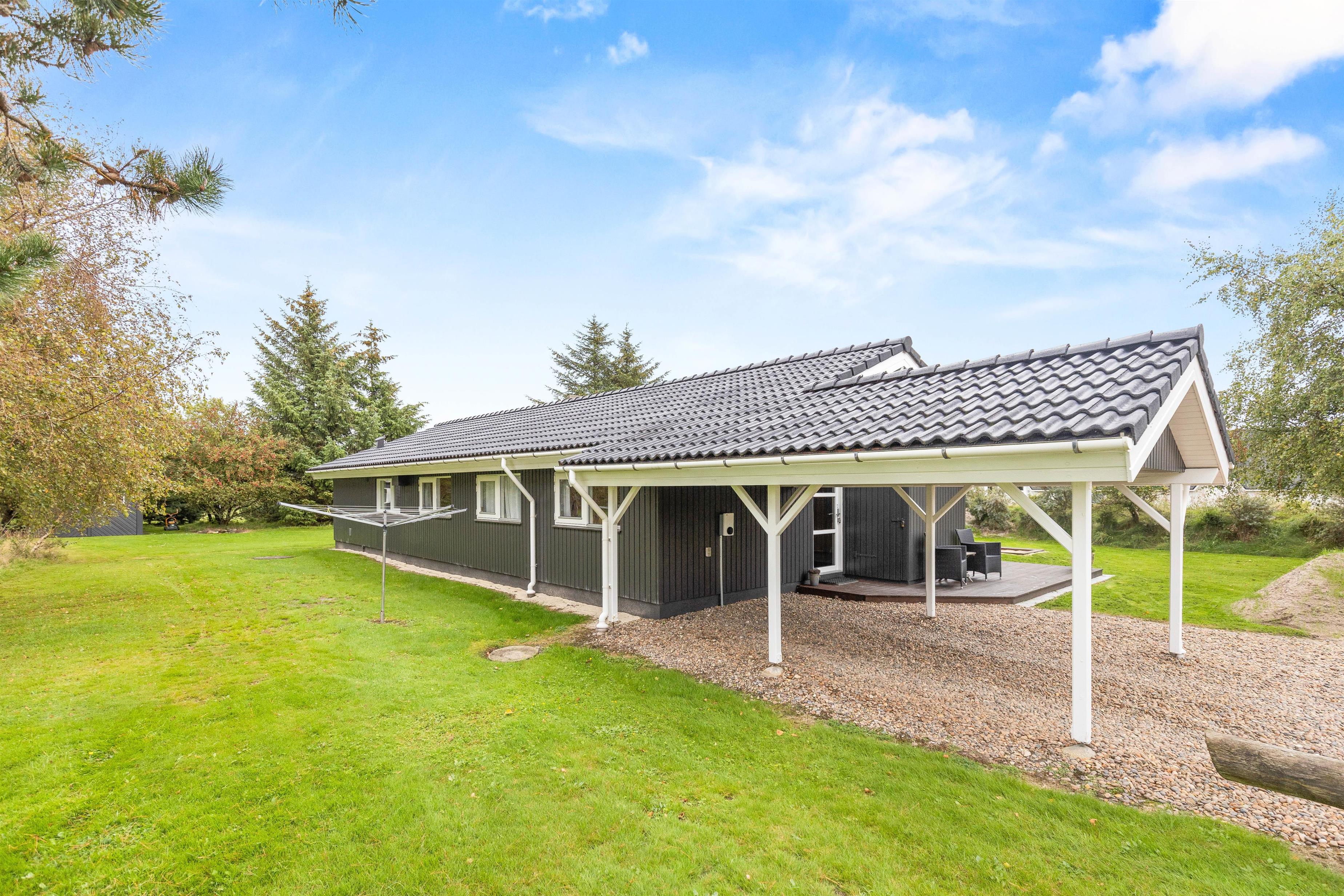 Med til huset hører et skønt udeareal med grøn græsplæne og åben, delvist overdækket terrasse, hvor der er god plads til at sole sig og nyde den friske havluft. Legetårnet, sandkassen og gyngestativet vil blive et sikkert hit blandt de mindste, og på den grønne plæne kan I spille bold og lege med hundene.