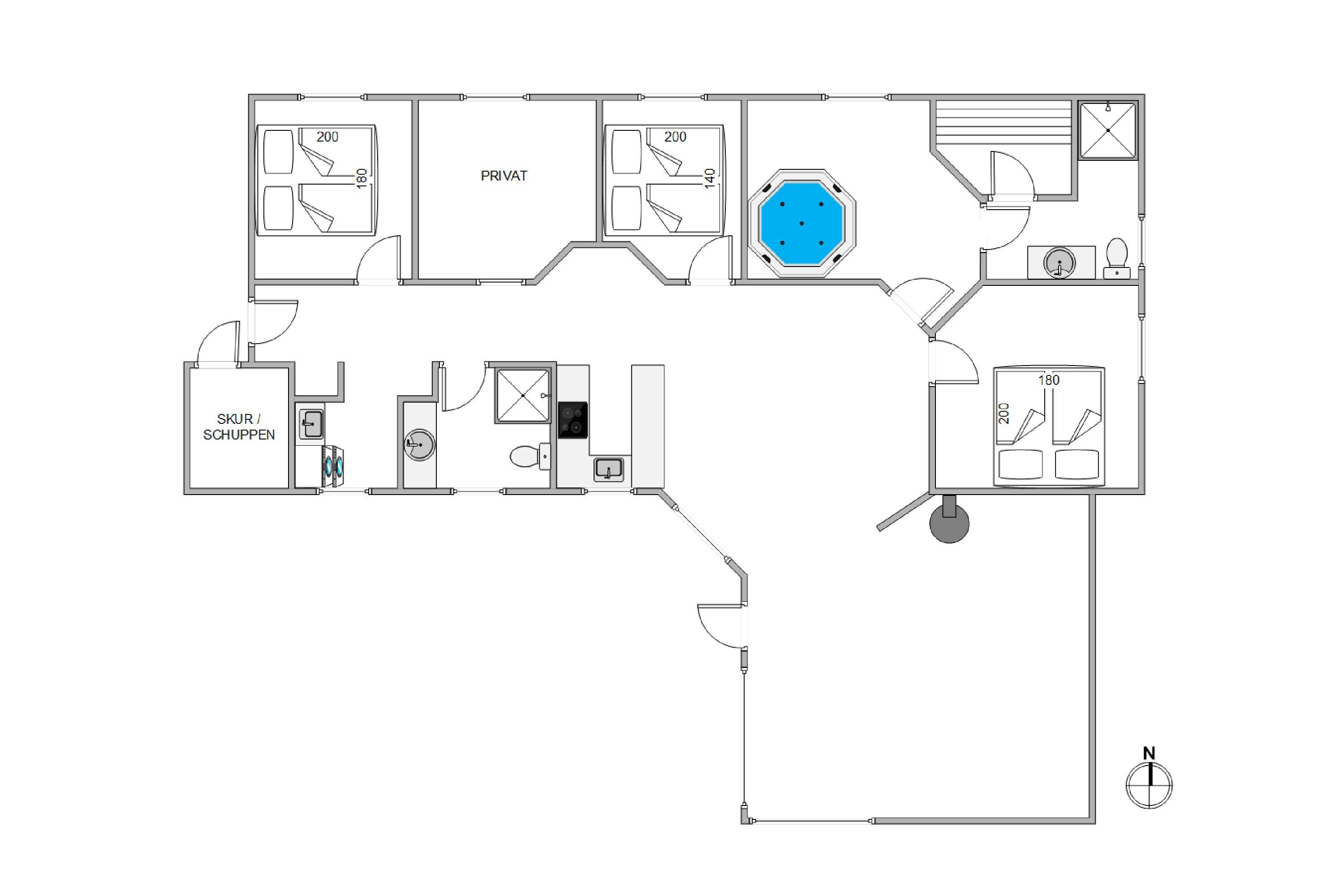 Huset er indrettet med 2, i 2019 nyrenoverede, badeværelser, så I undgår de lange toiletkøer om morgenen, og på det ene gemmer sig en ekstra lille wellnesshemmelighed. Her er der adgang til helt egen sauna og et stort spabad med plads til 4 personer. Det er velvære for krop og sjæl !