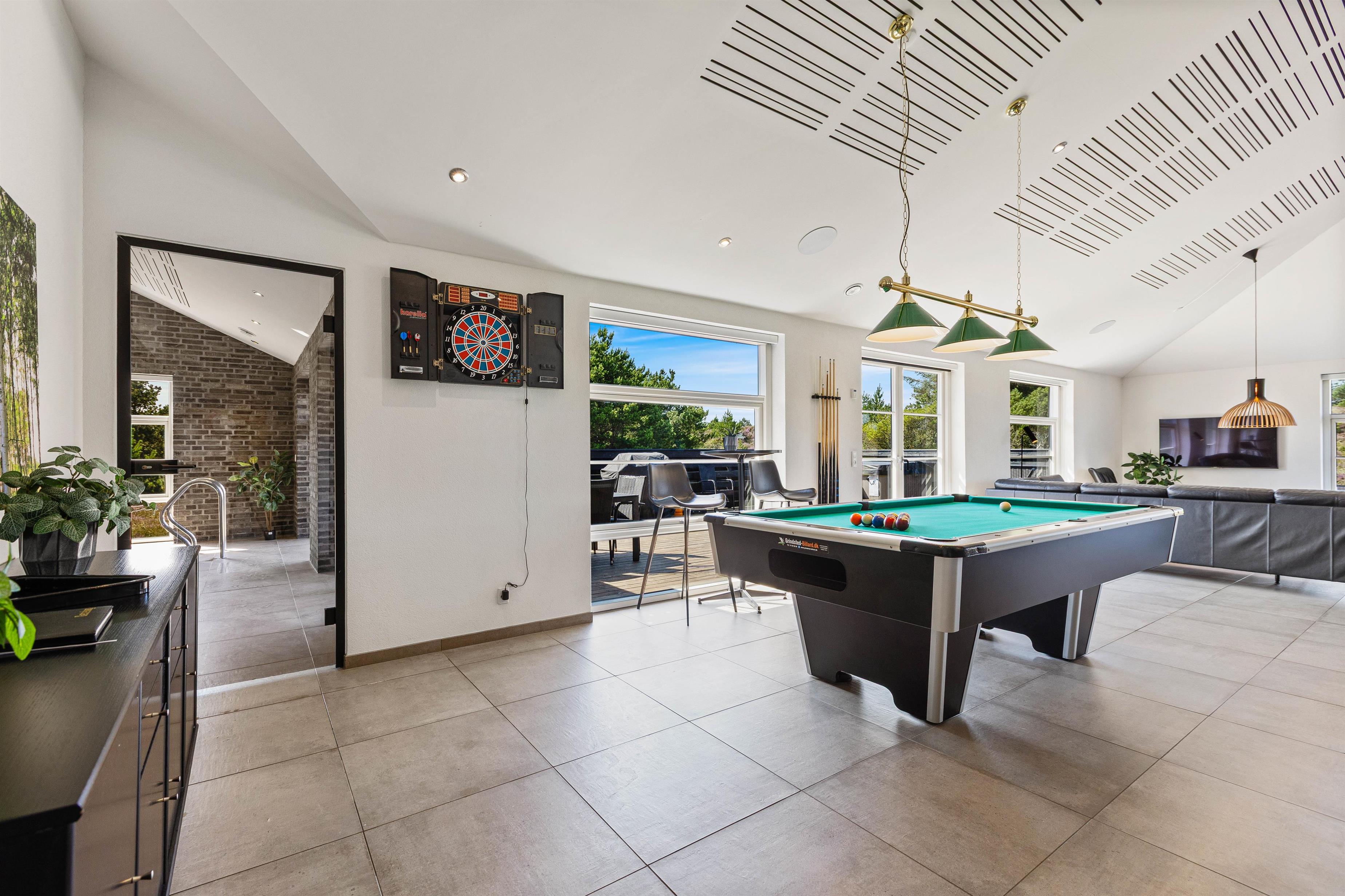 Det storslåede sommerhus i Blåvand råder blandt andet over en 30 kvadratmeter stor indendørs swimmingpool, et udendørs spabad til 4 personer og en stor sauna. Ligegyldigt, om I skal holde ferie med familien og børnene eller med vennerne, er I garanteret underholdning for alle her. Efter en forfriskende dukkert kan I samles til fælles madlavning i det veludstyrede køkken.