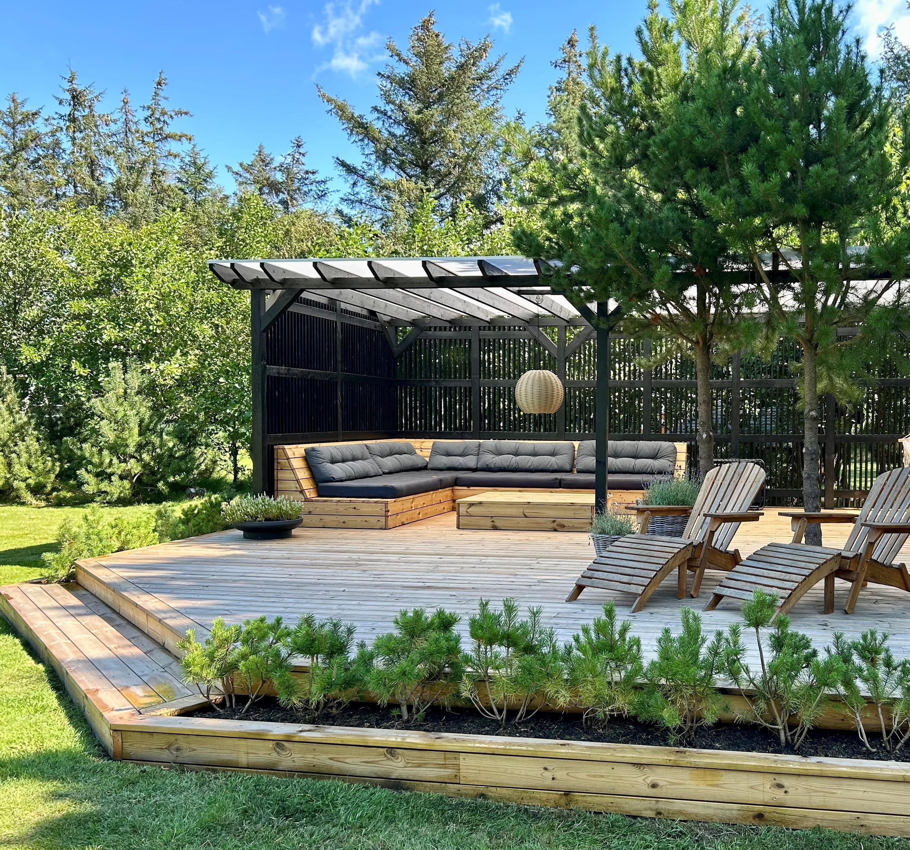 I det ene hjørne af haven er der i 2025 bygget et stort, flot, delvist overdækket terrasseområde med loungemøbler, hvor I også kan hygge jer, måske med en god bog, og finde skygge på varme dage samt ly for regn.