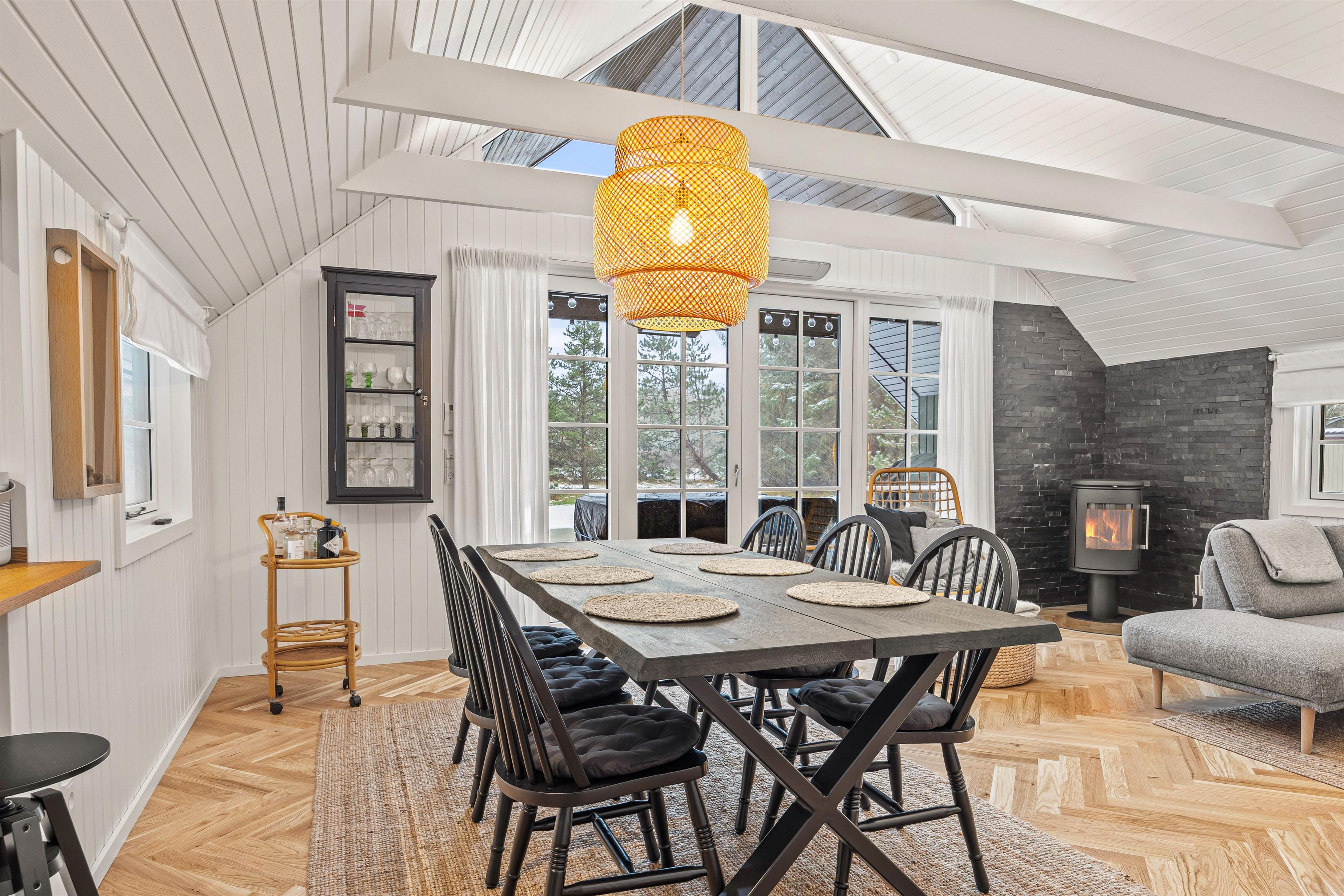 Fra køkkenet er der direkte adgang til den hyggelige spiseafdeling og stue, hvor sprossevinduerne, det smukke trægulv, de synlige loftsbjælker og ikke mindst brændeovnen gør ophold indendørs indbydende og hyggeligt. Fra stuen er der udgang til terrasse gennem den sprossede dobbeltdør.