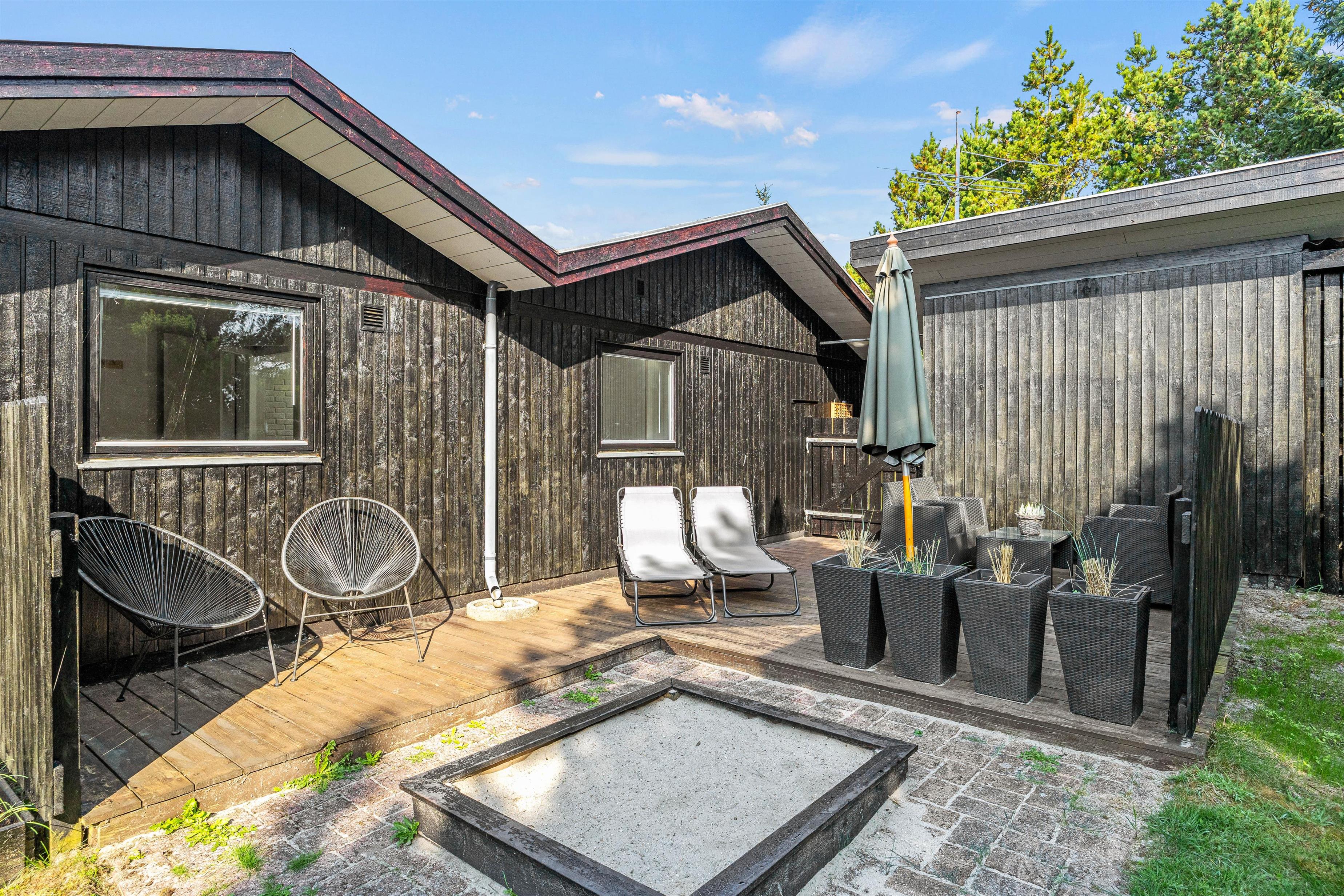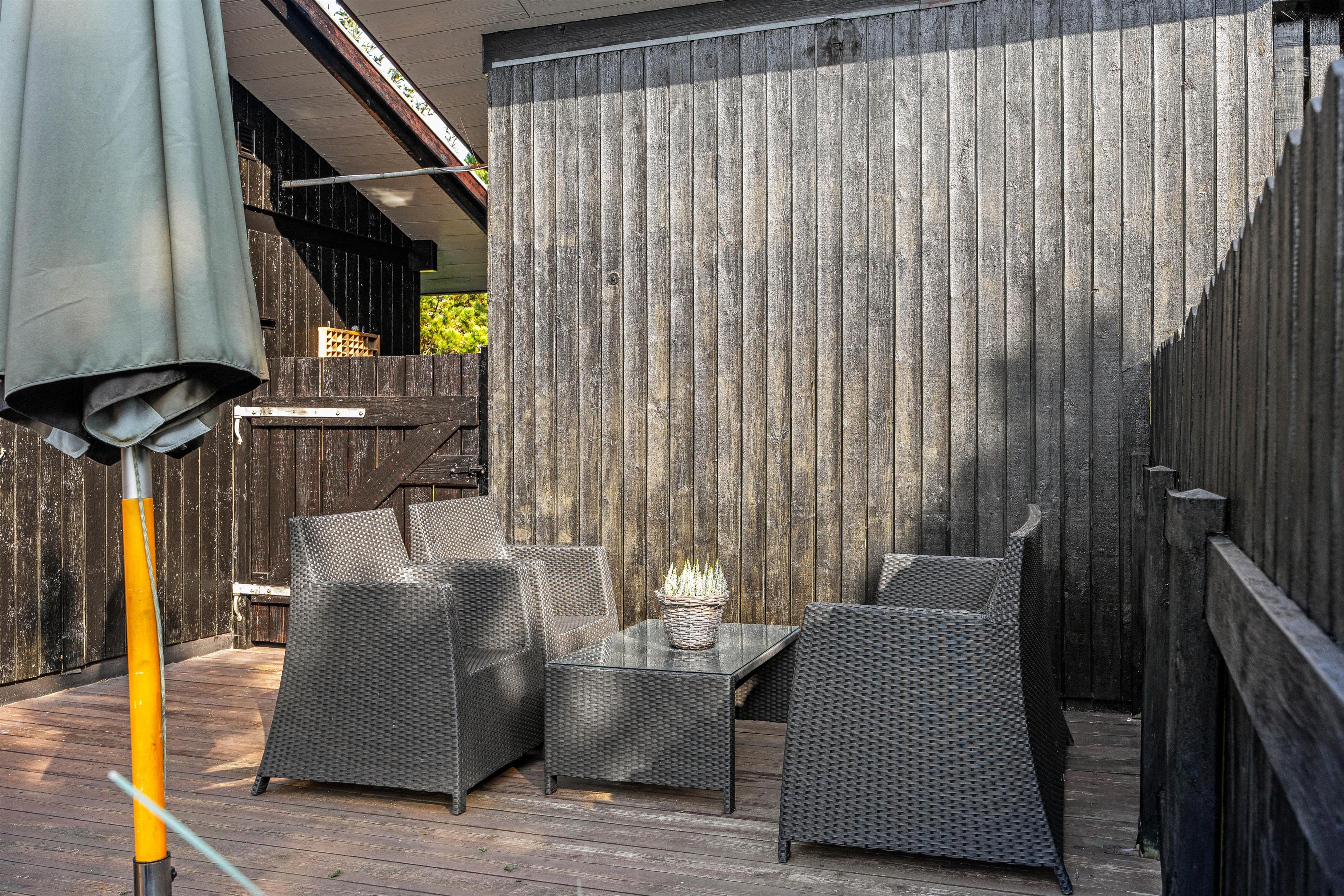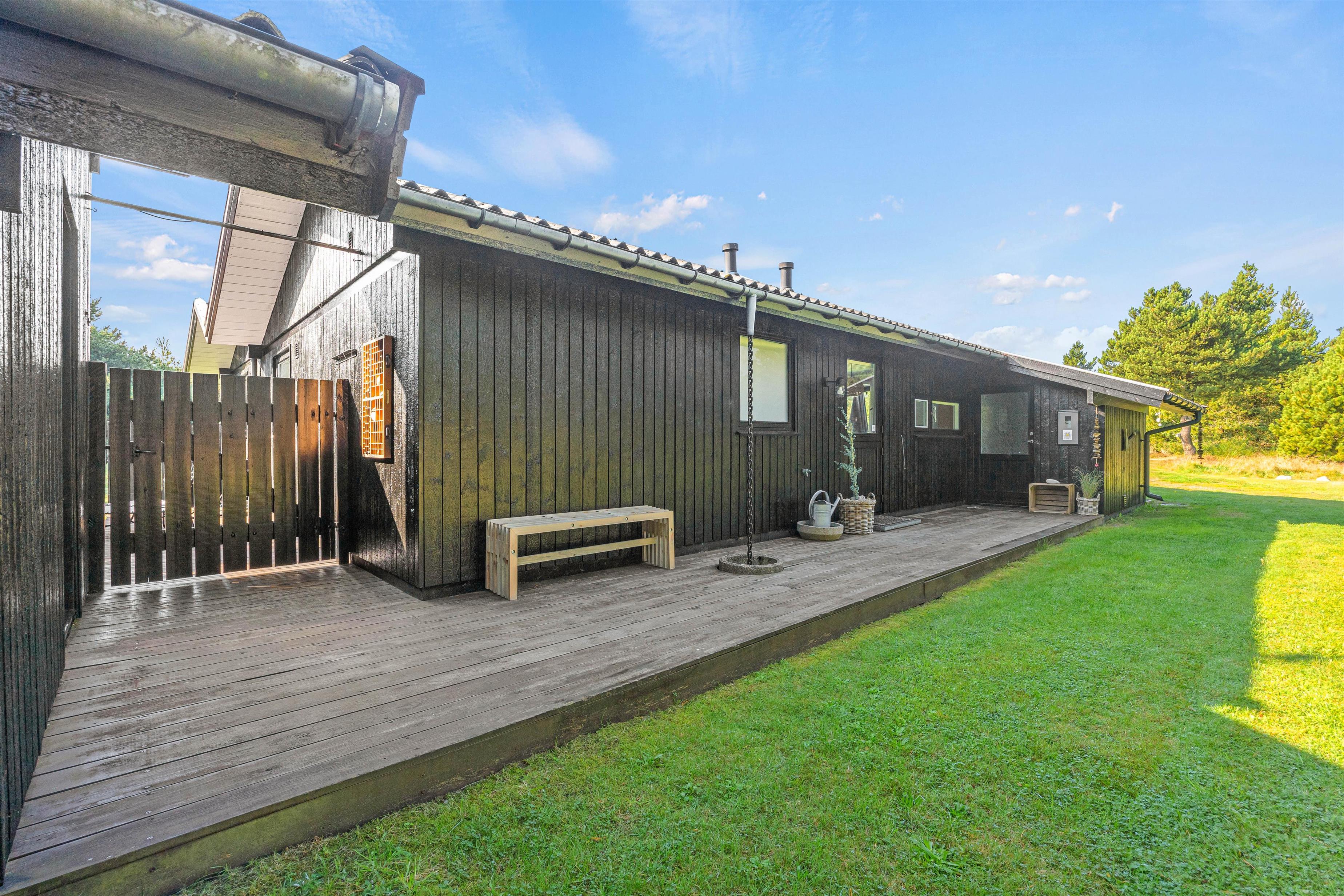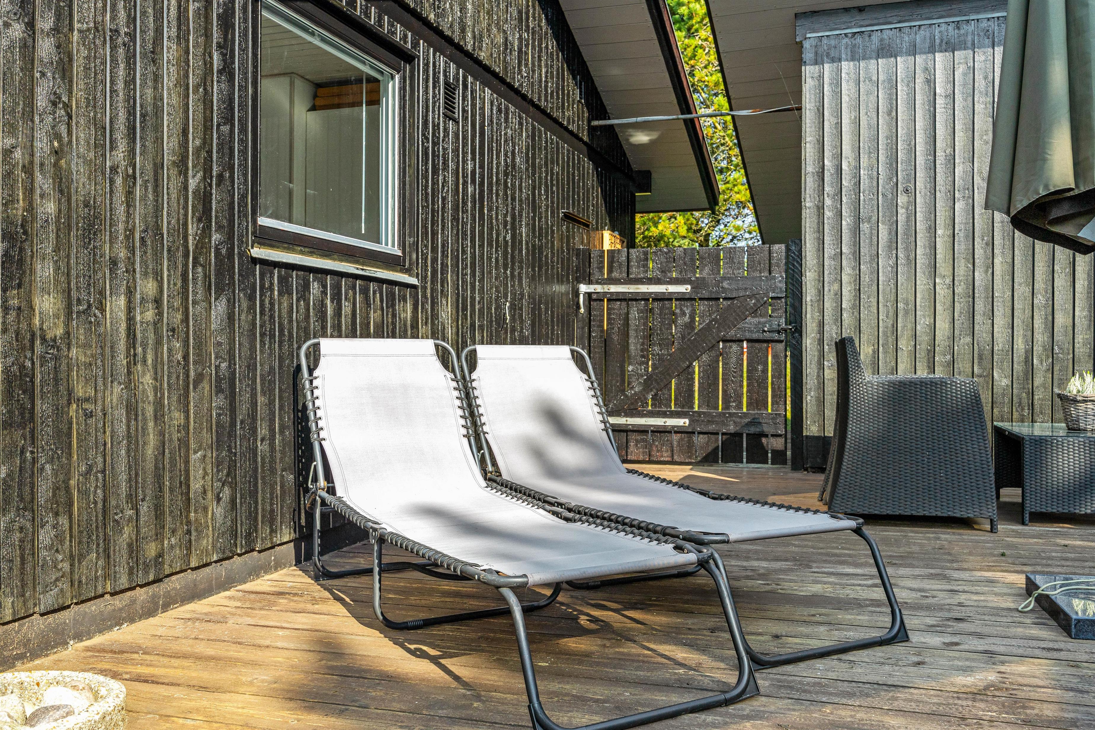 Feriehuset på Hestehaven 21 er bygget i træ og har 2 dejlige terrasser, hvoraf den ene endda har en 12 m2 stor overdækket del. Her kan solen og et glas vin nydes i de komfortable havemøbler, mens børnene leger med gyngen eller i sandkassen på den store naturgrund. Til aften kan man samles på terrassen og nyde et lækkert måltid fra grillen, mens aftenen falder på.
