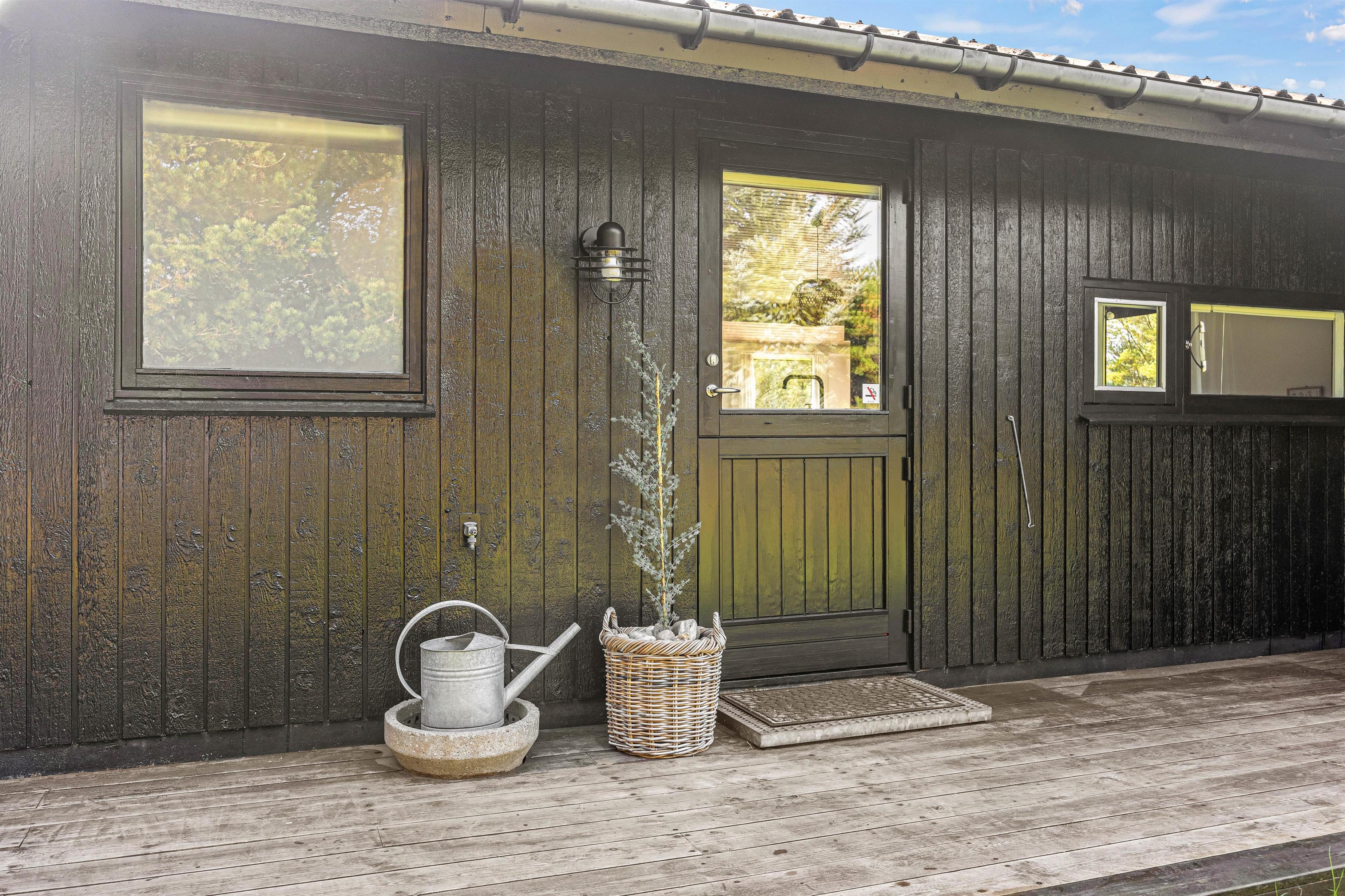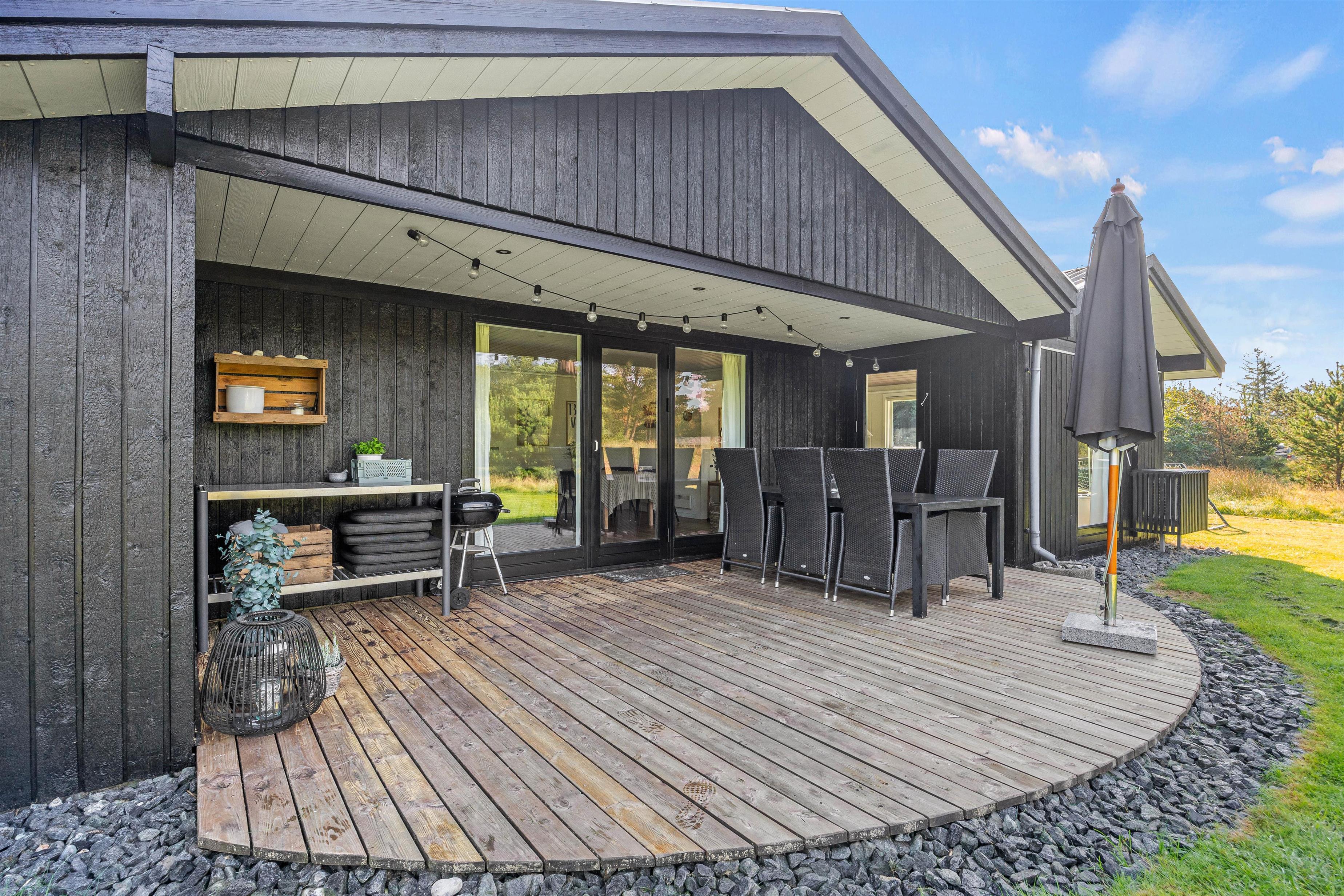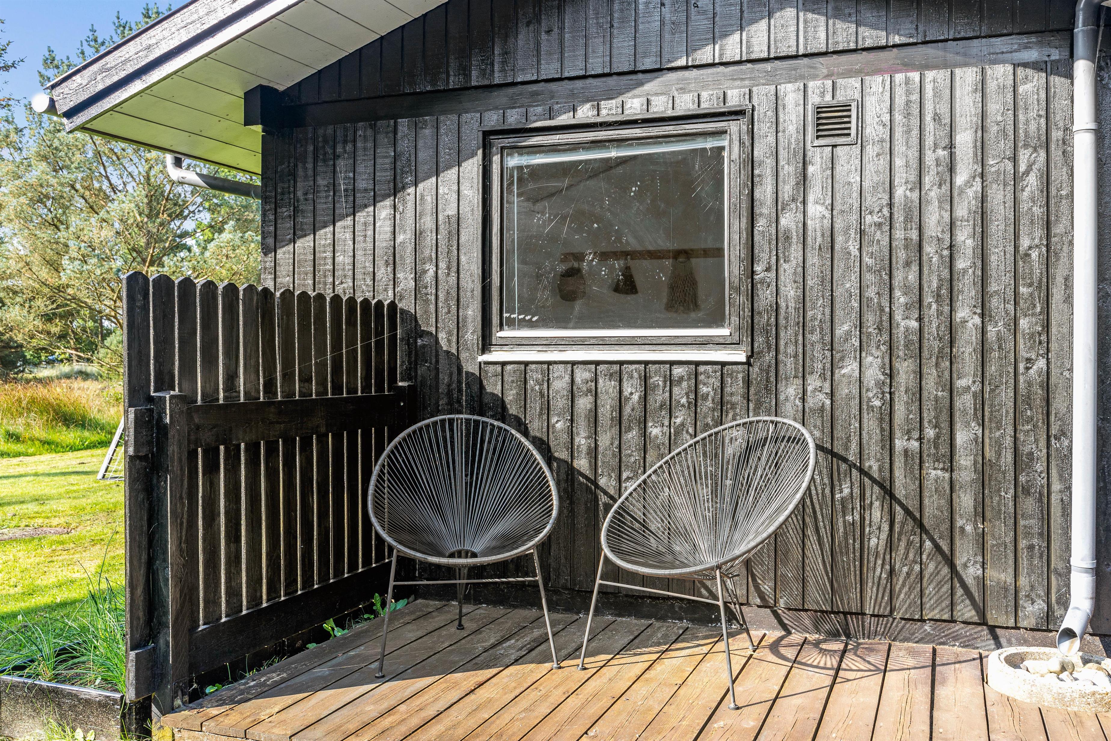 Feriehuset på Hestehaven 21 er bygget i træ og har 2 dejlige terrasser, hvoraf den ene endda har en 12 m2 stor overdækket del. Her kan solen og et glas vin nydes i de komfortable havemøbler, mens børnene leger med gyngen eller i sandkassen på den store naturgrund. Til aften kan man samles på terrassen og nyde et lækkert måltid fra grillen, mens aftenen falder på.