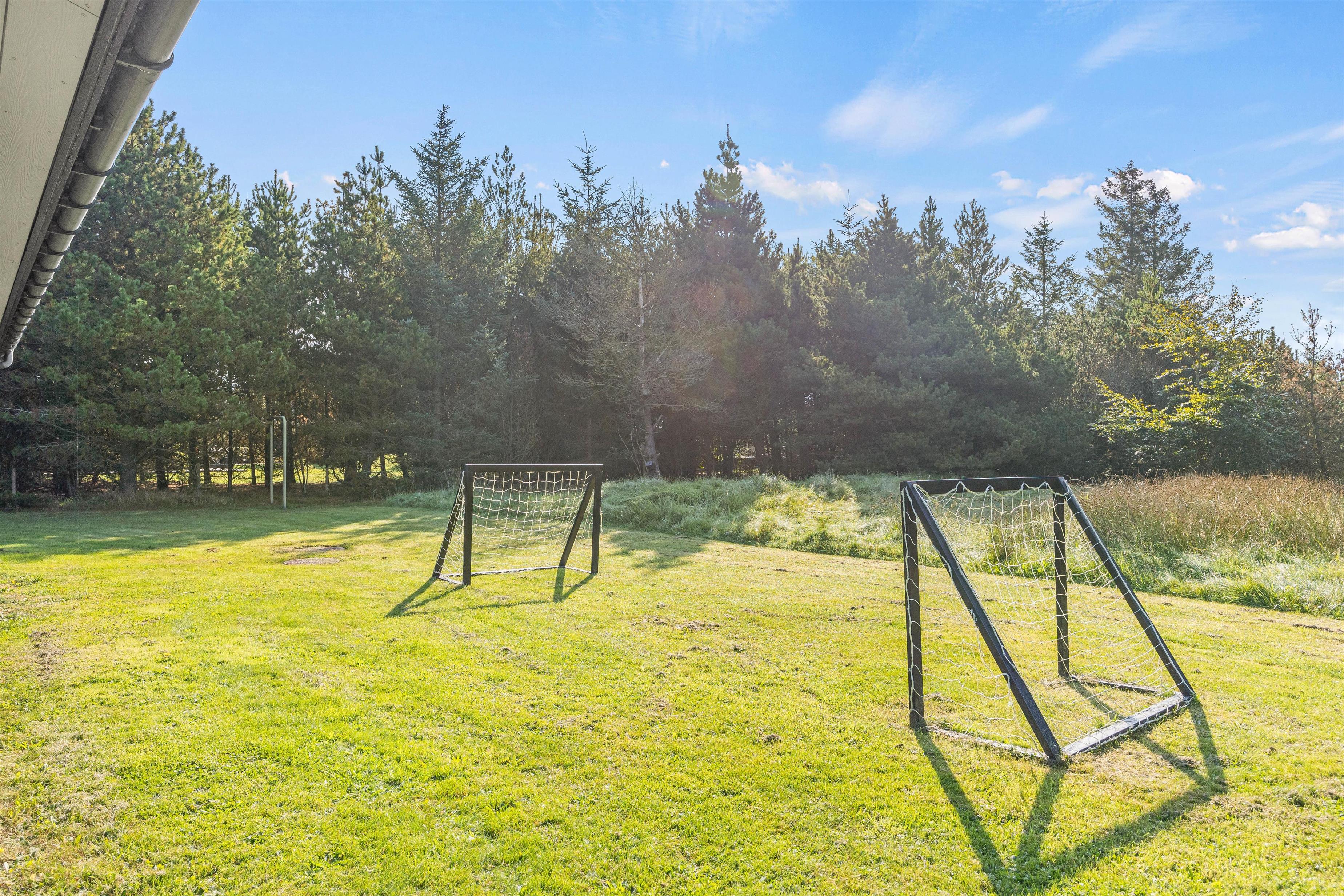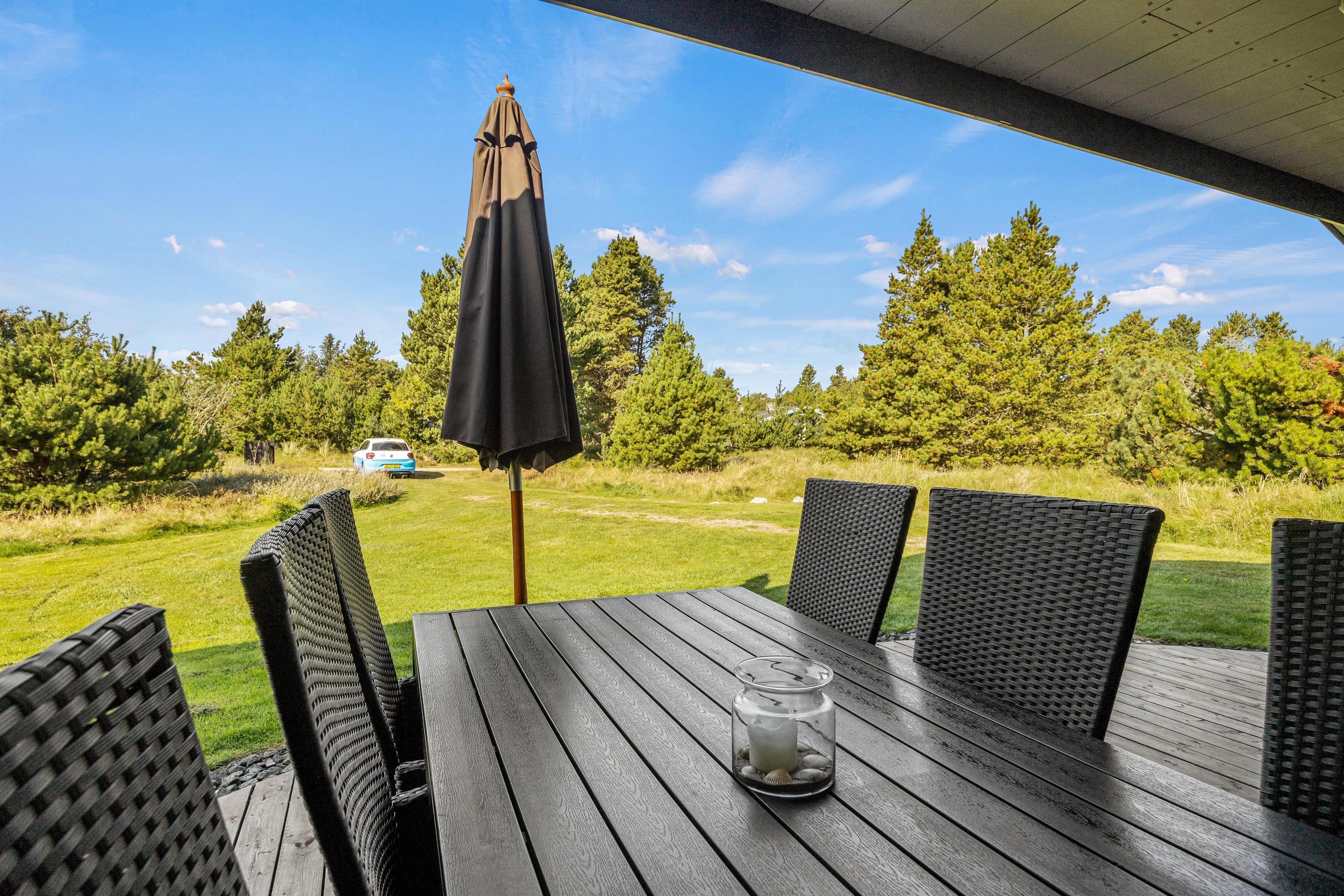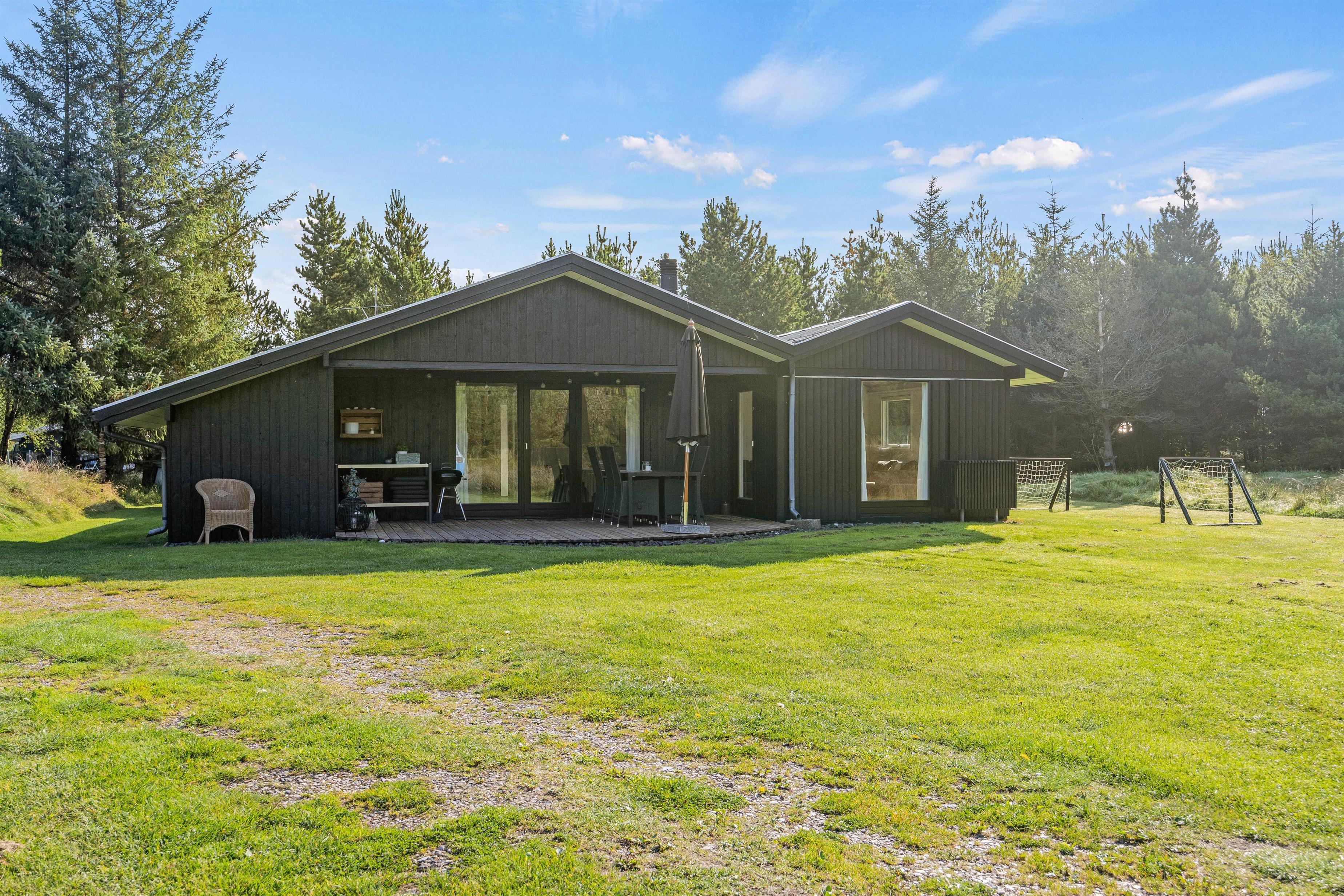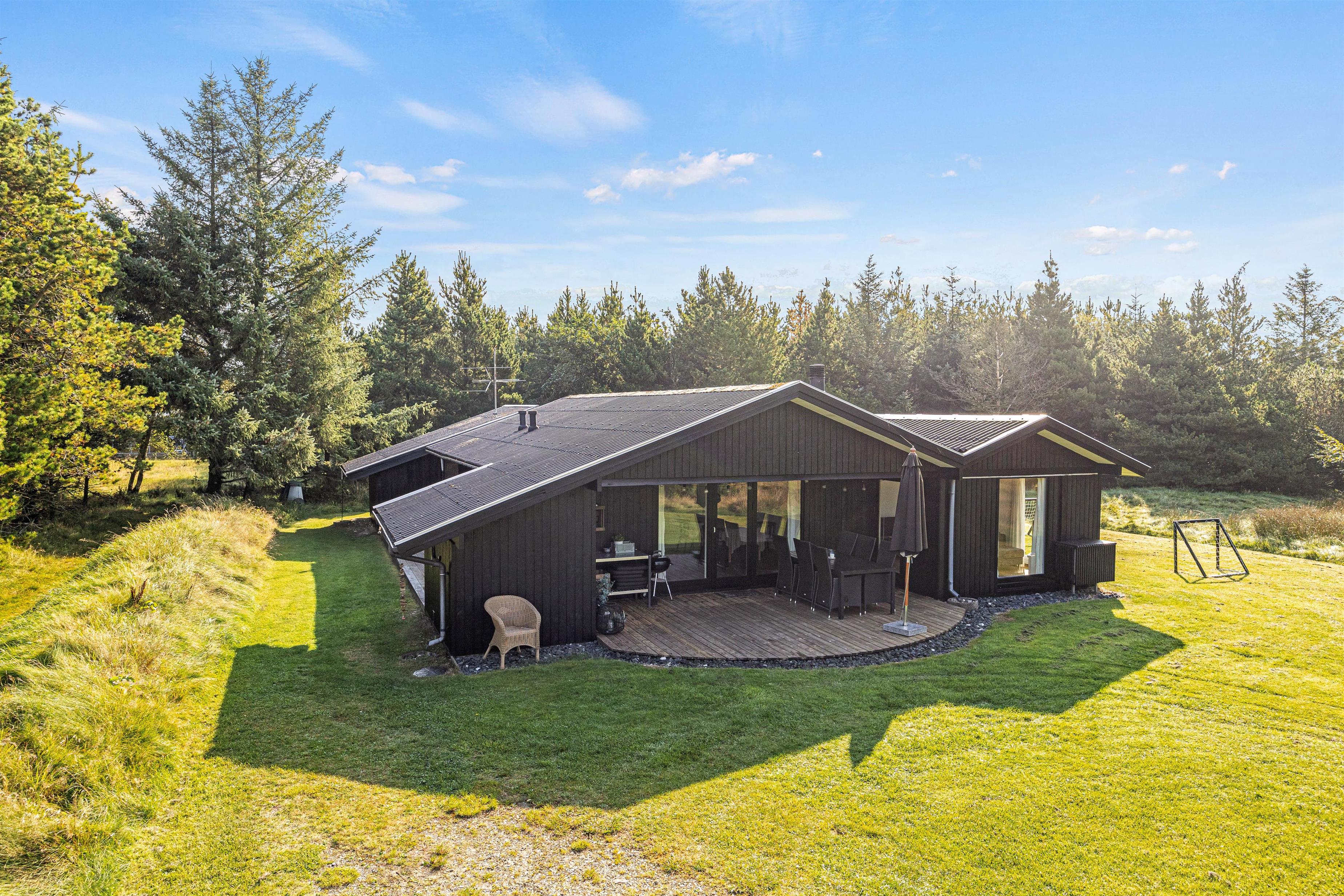 Feriehuset på Hestehaven 21 er bygget i træ og har 2 dejlige terrasser, hvoraf den ene endda har en 12 m2 stor overdækket del. Her kan solen og et glas vin nydes i de komfortable havemøbler, mens børnene leger med gyngen eller i sandkassen på den store naturgrund. Til aften kan man samles på terrassen og nyde et lækkert måltid fra grillen, mens aftenen falder på.