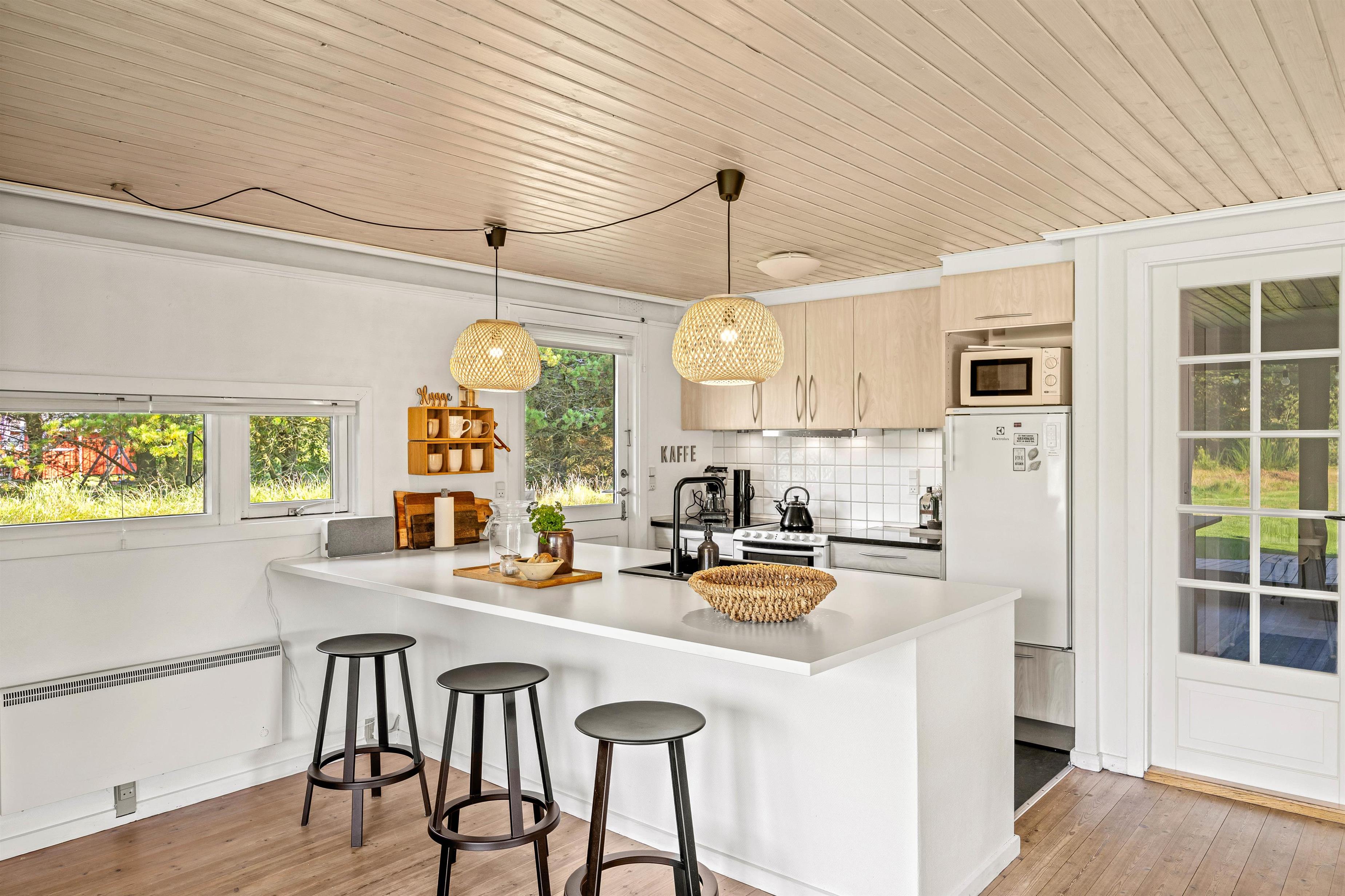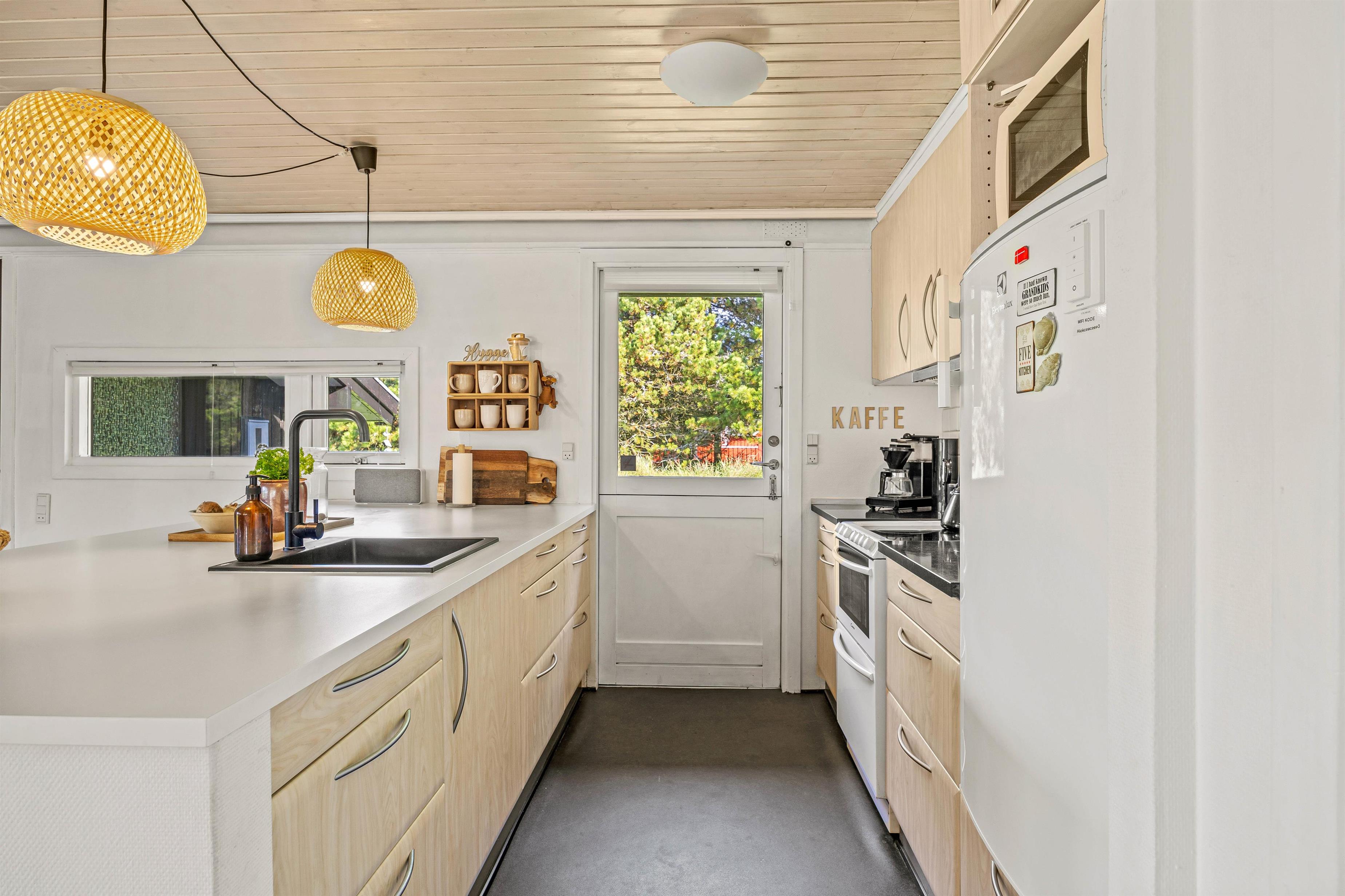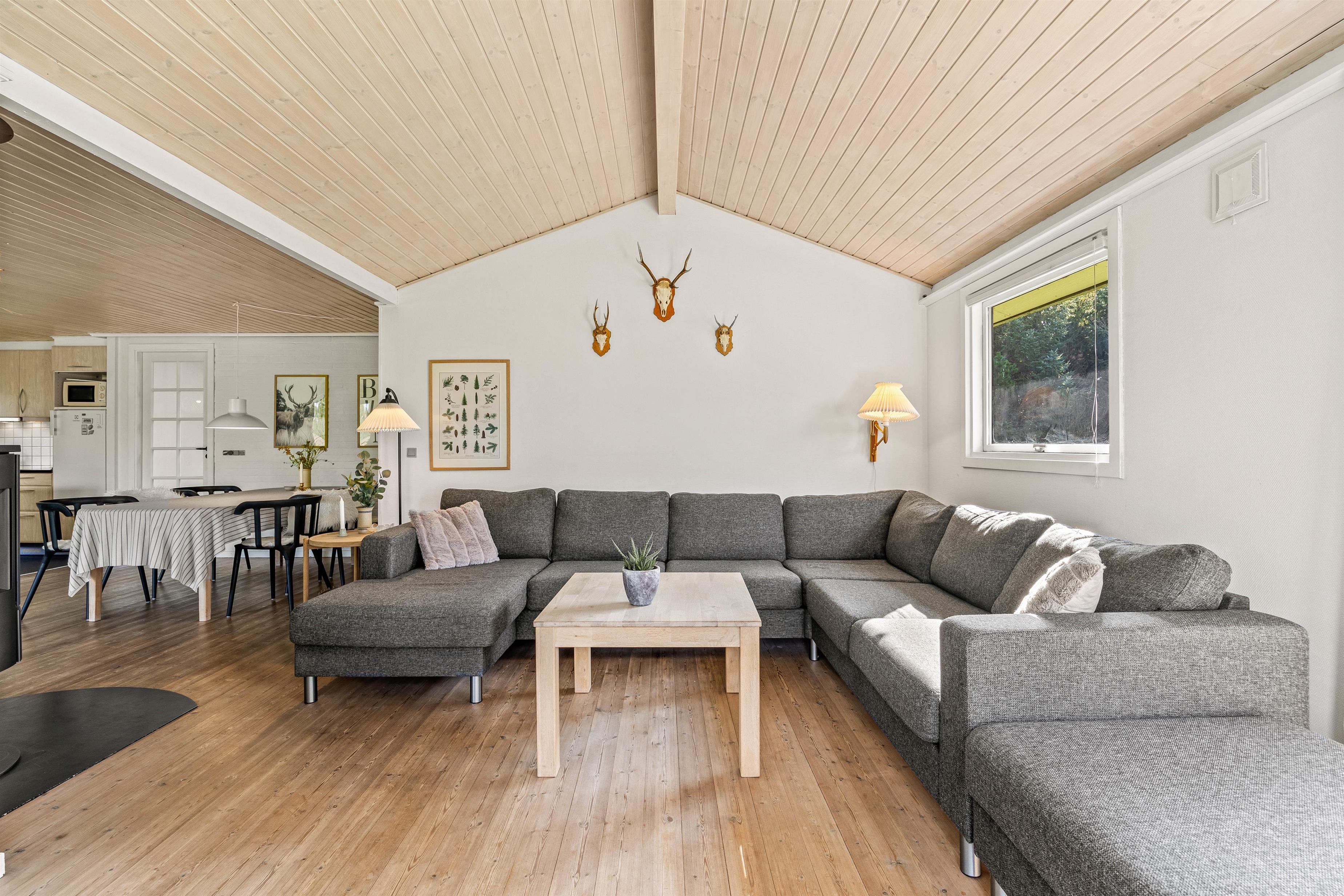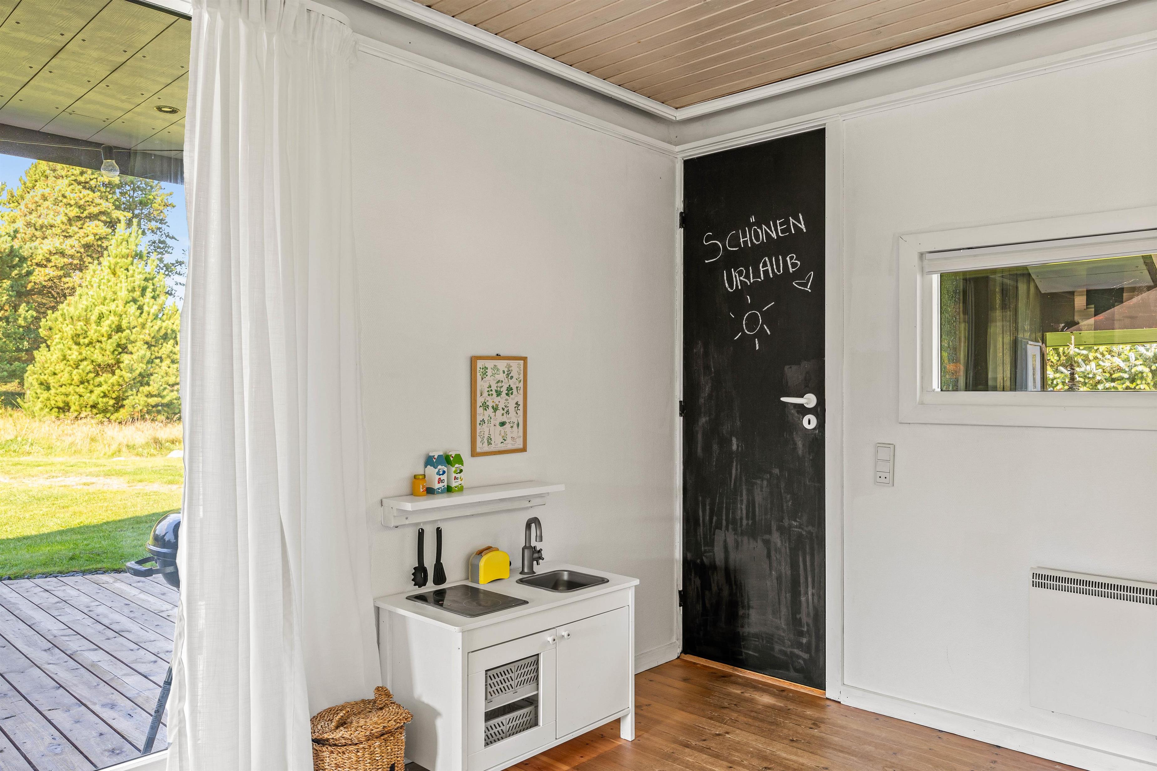 Indenfor er feriehuset indrettet med et åbent funktionelt køkken med mikroovn og med en hyggelig køkkensiddeplads, hvor man kan hyggesnakke med kokken under madlavningen. Der er også et lille legekøkken, hvis børnene skulle få lyst til at bidrage til maden. Fra det store køkken/alrum er der åben forbindelse til den velindrettede stue. Her kan der læses, spilles, strikkes mm., mens ilden knitrer i brændeovnen.