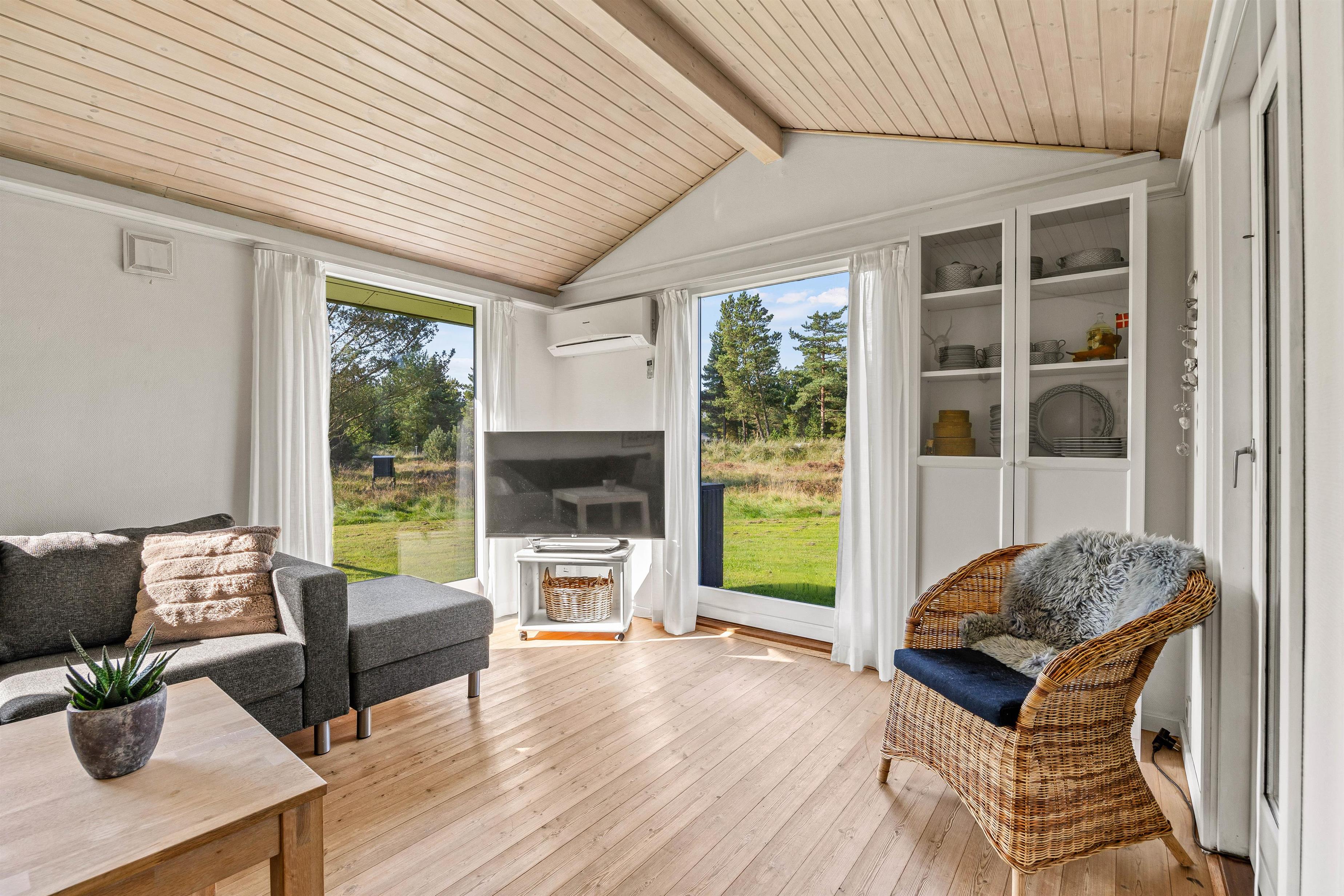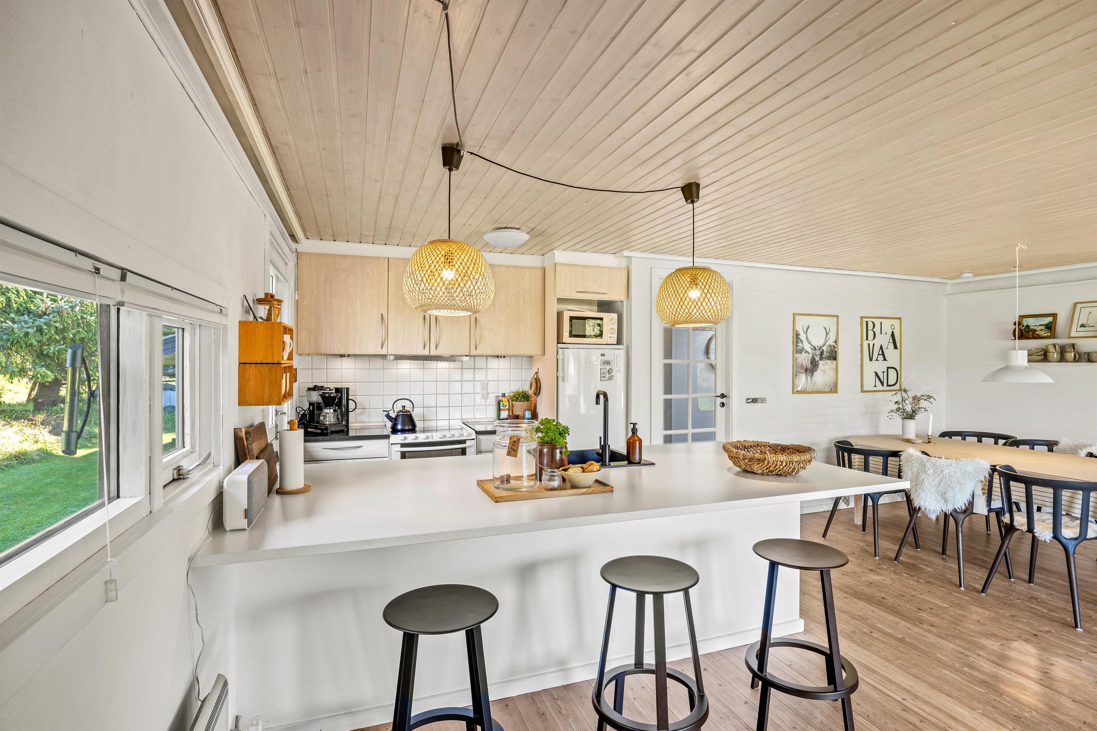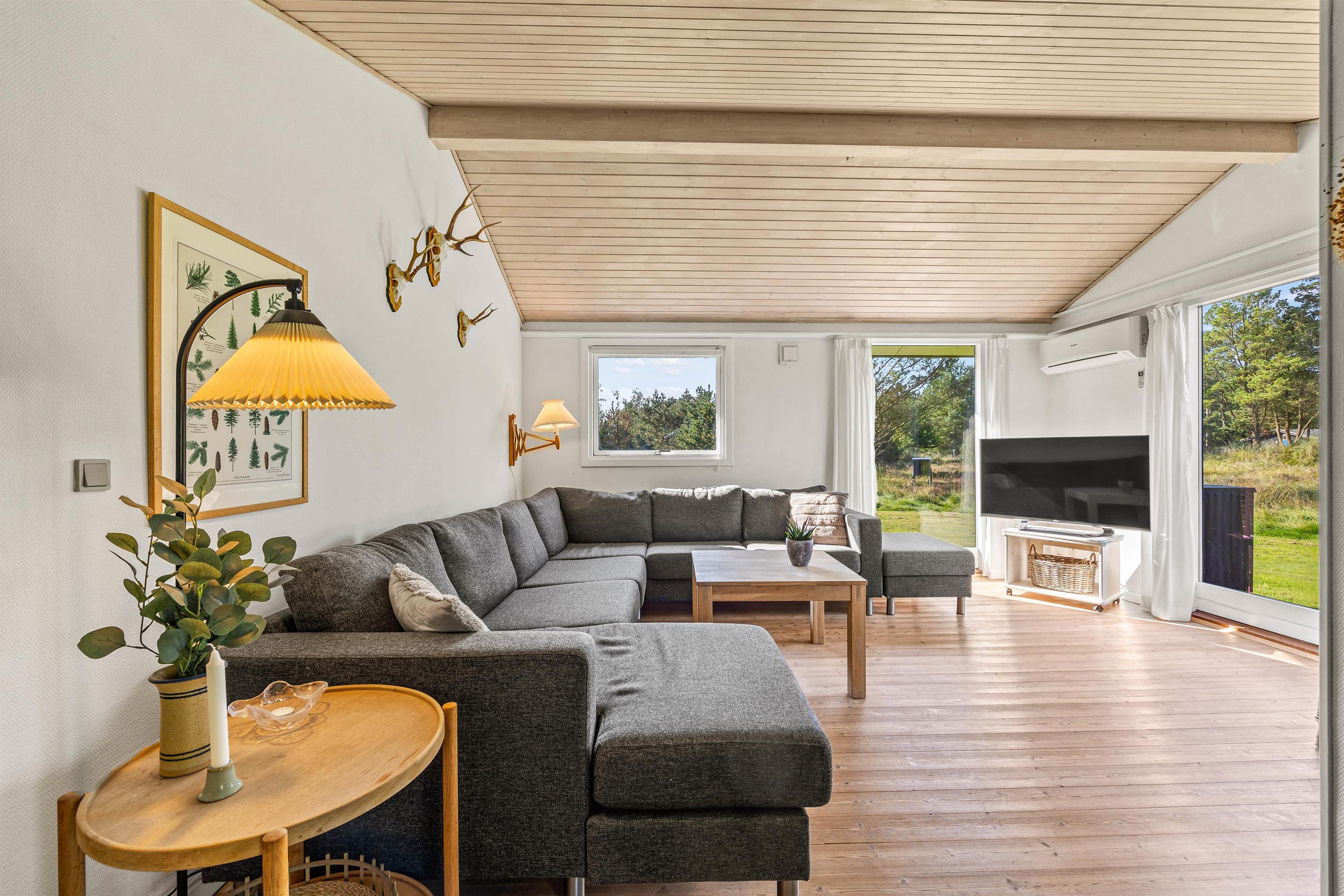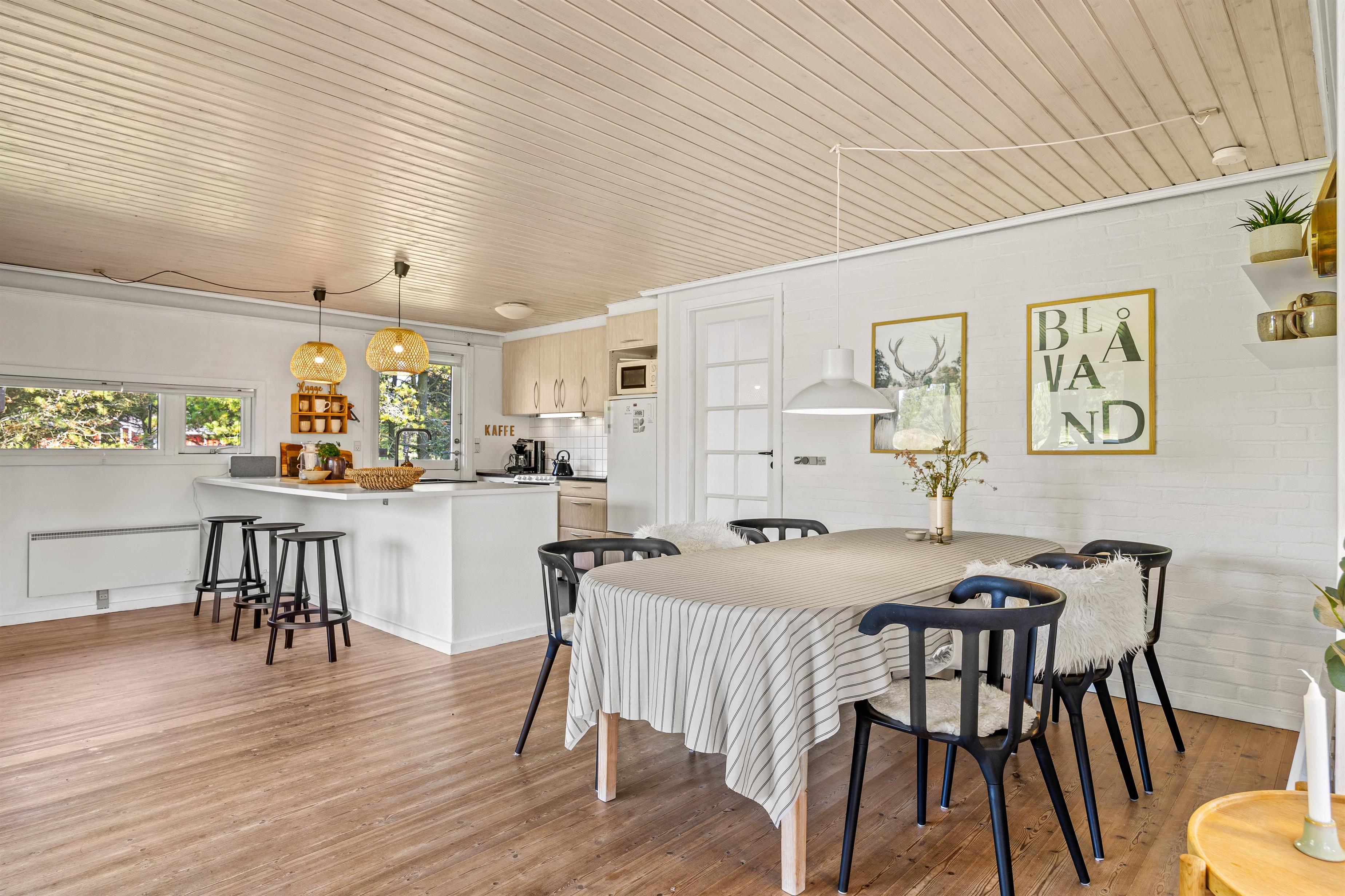 Indenfor er feriehuset indrettet med et åbent funktionelt køkken med mikroovn og med en hyggelig køkkensiddeplads, hvor man kan hyggesnakke med kokken under madlavningen. Der er også et lille legekøkken, hvis børnene skulle få lyst til at bidrage til maden. Fra det store køkken/alrum er der åben forbindelse til den velindrettede stue. Her kan der læses, spilles, strikkes mm., mens ilden knitrer i brændeovnen.