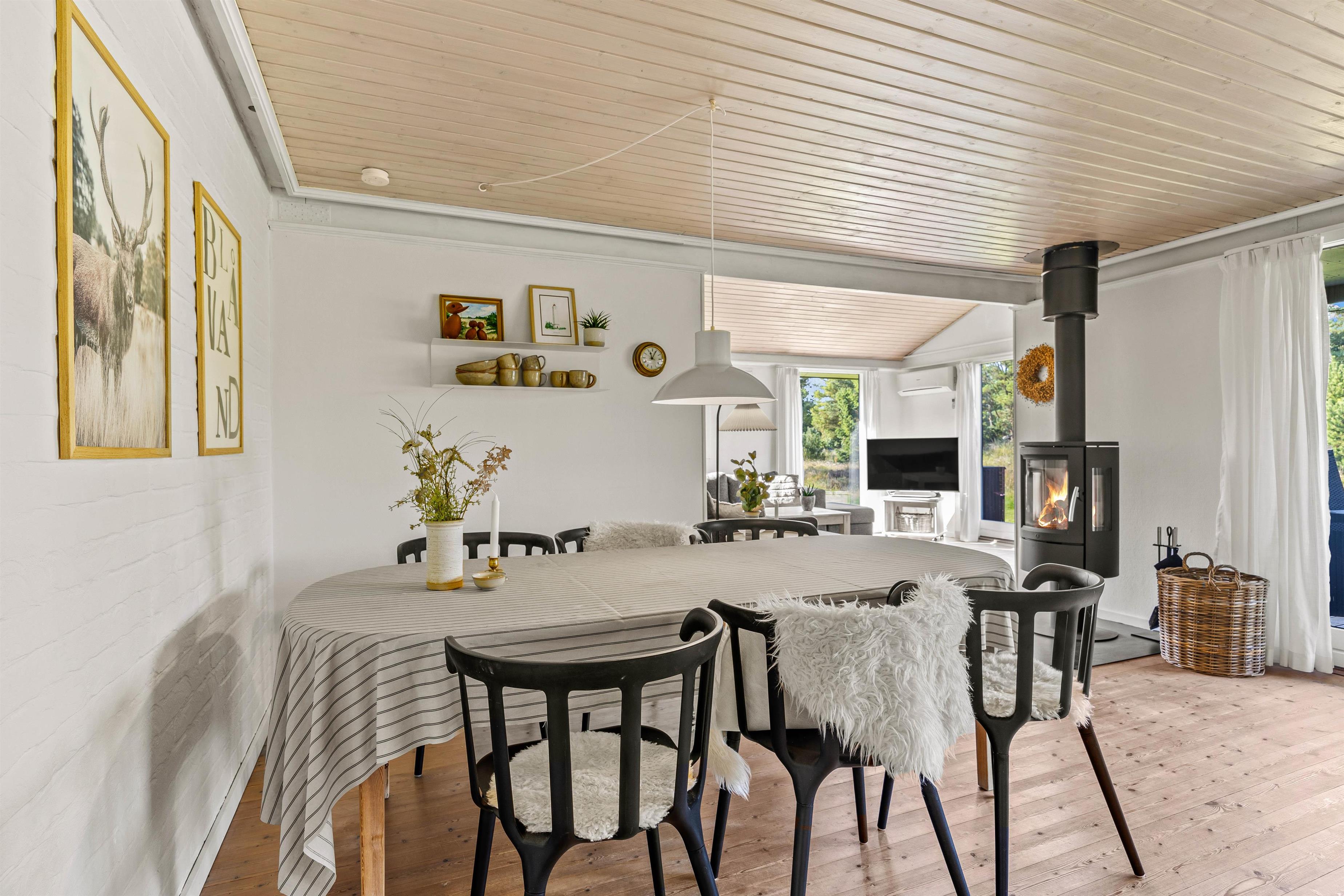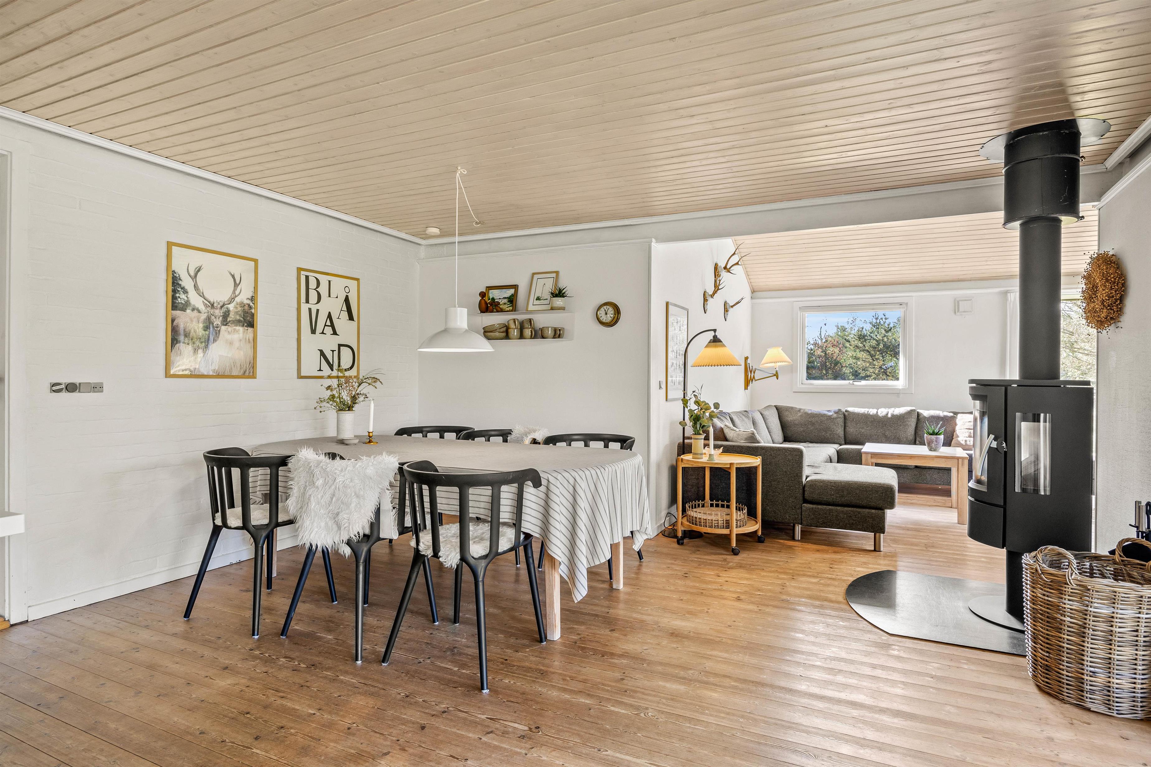 Hyggelig indretning med åbent alrum og brændeovn