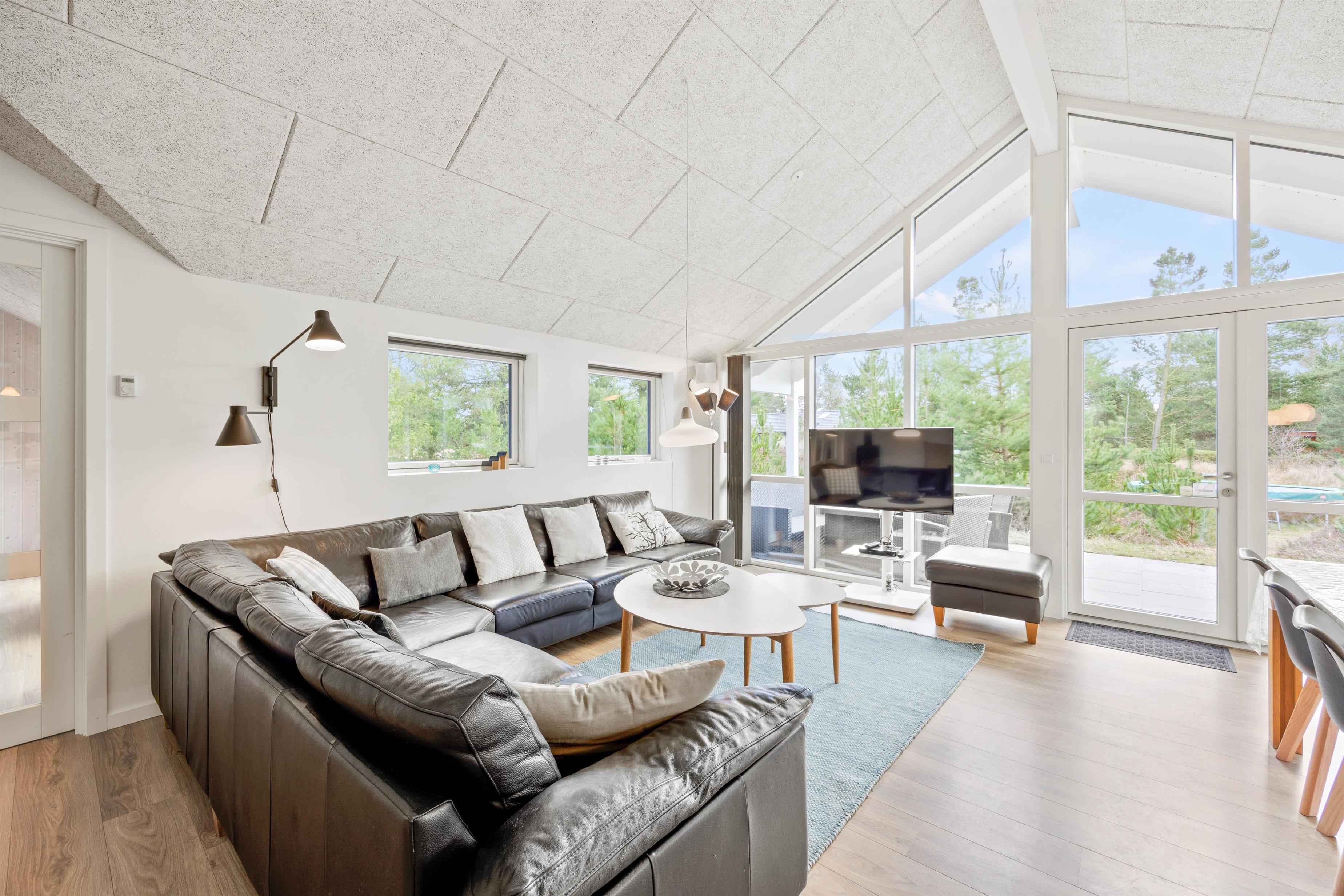 I det femstjernede sommerhus på Port Arthursvej 35 i Blåvand bliver I budt velkommen af en dejlig, lys indretning. Her er der både højt til loftet og et skønt lysindfald, der er med til at skabe den helt rette ferieatmosfære.