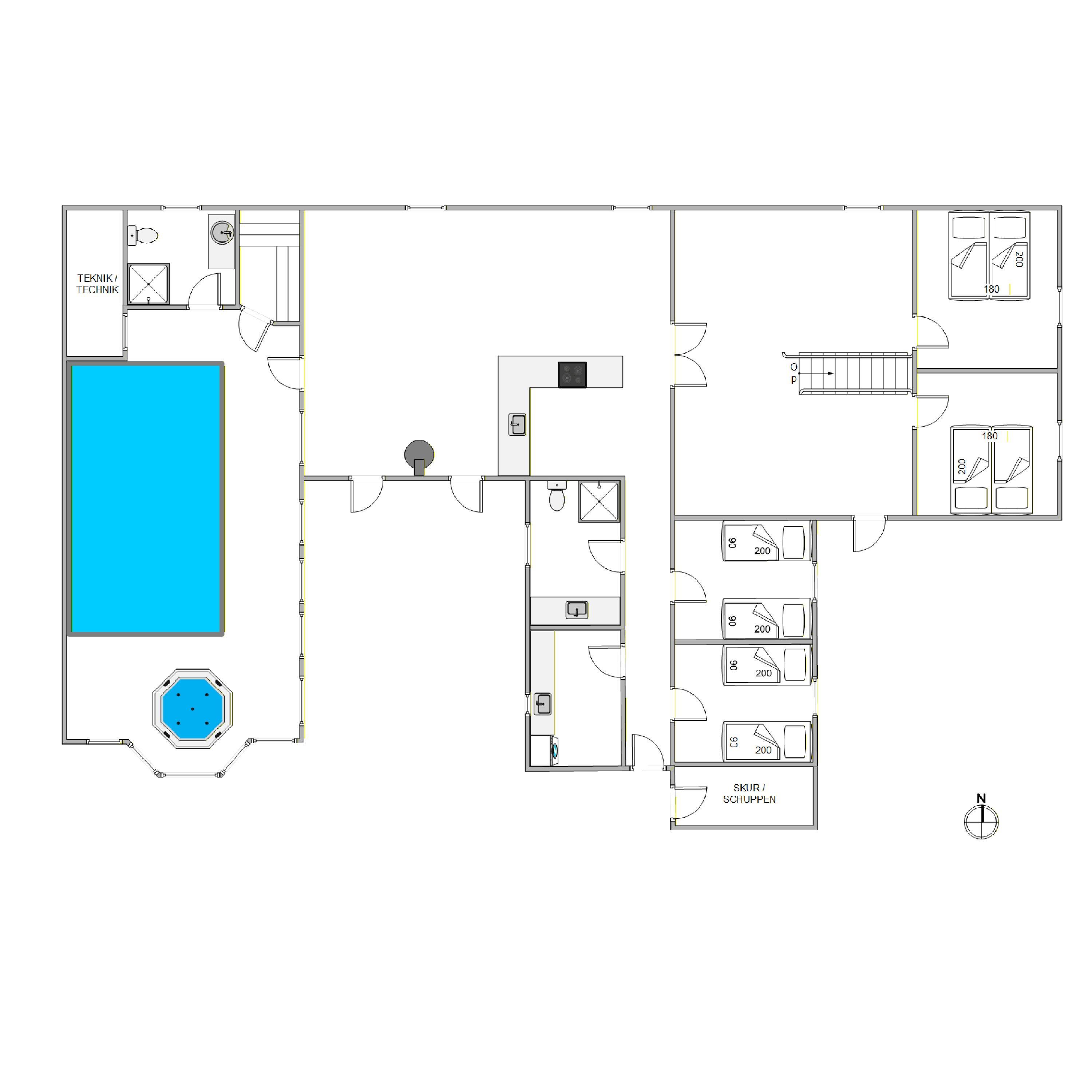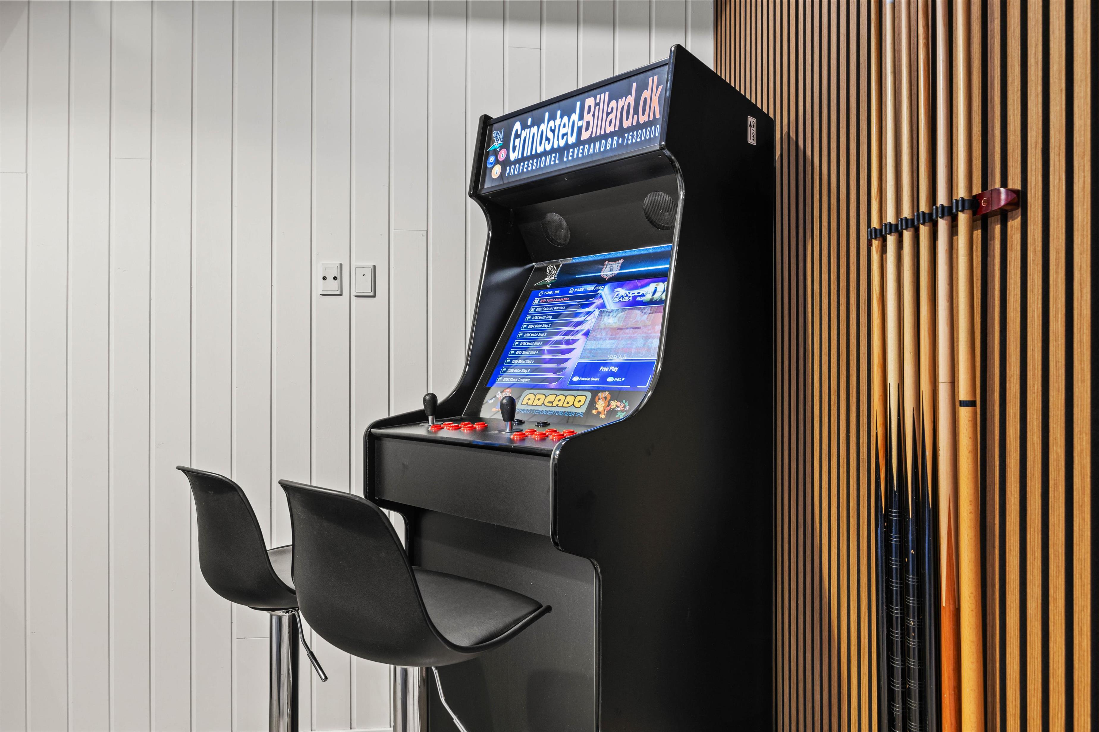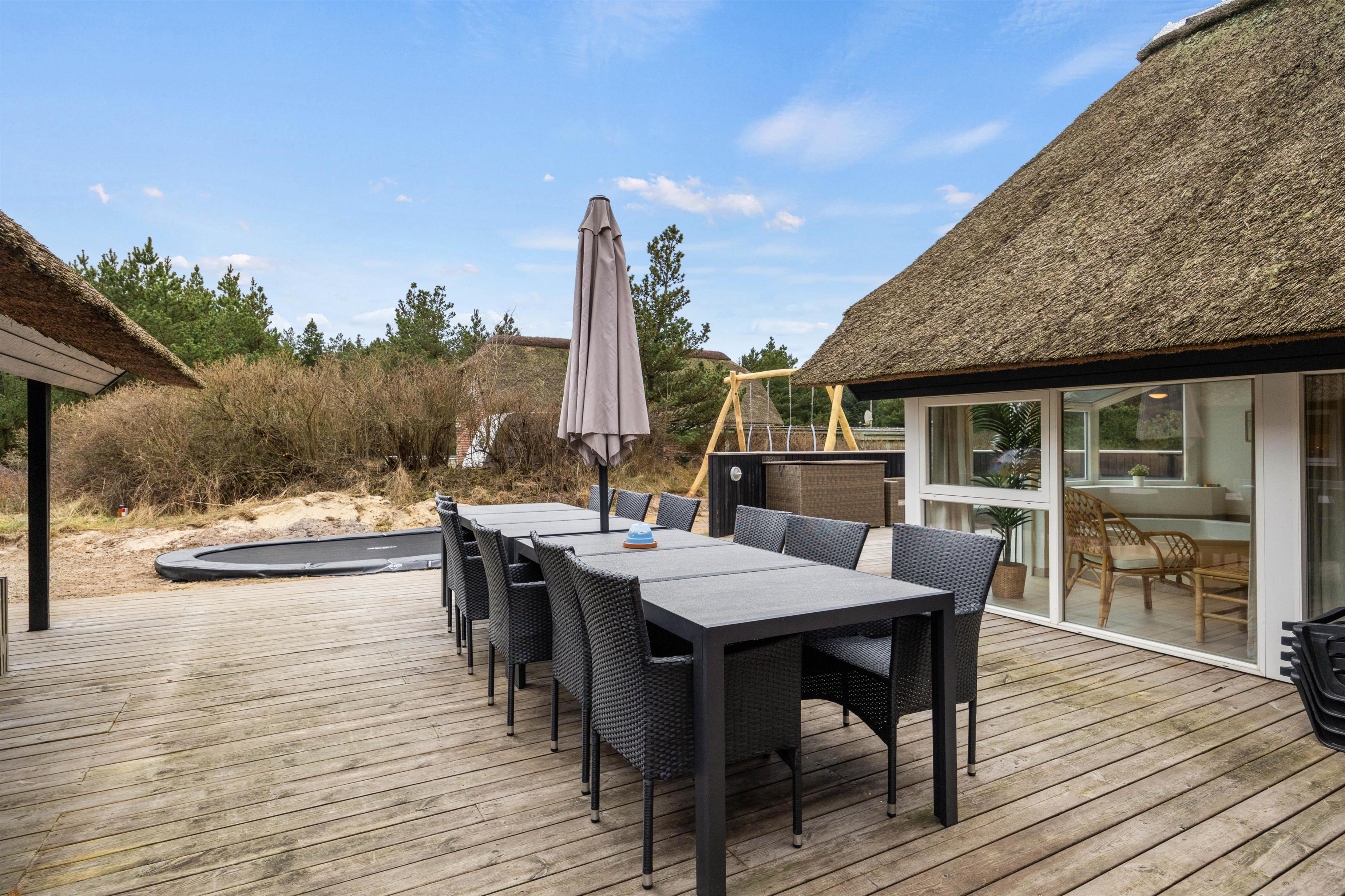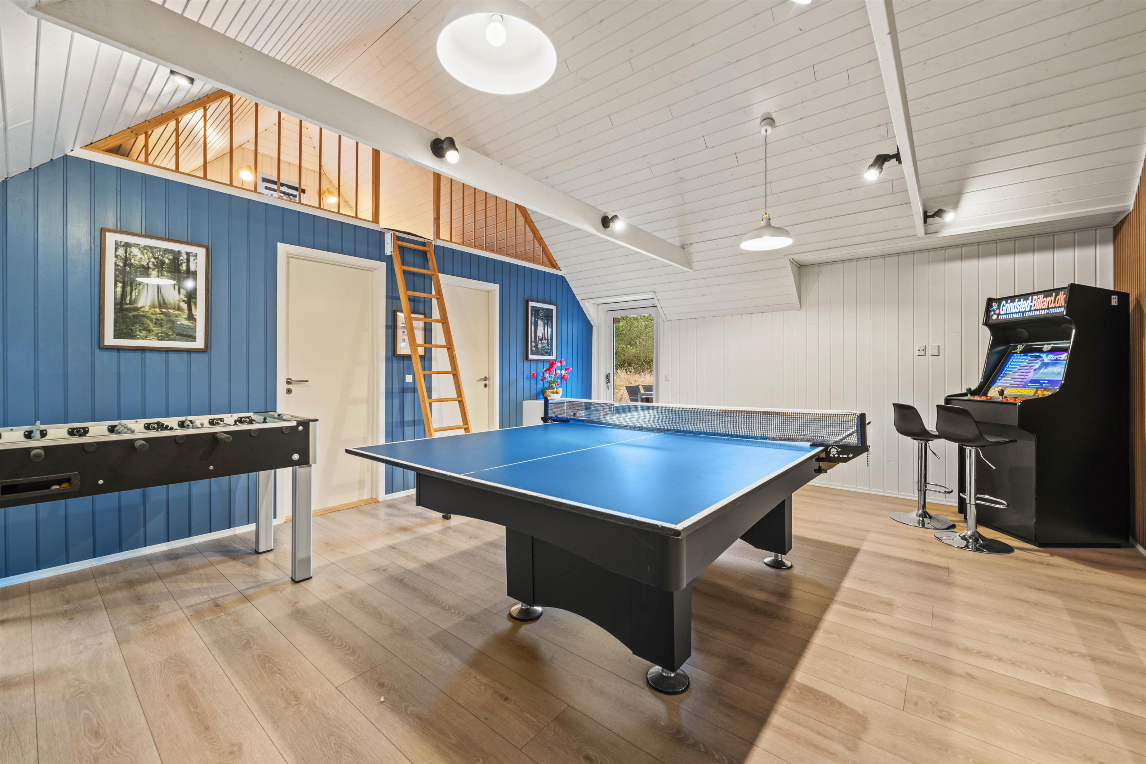 Aktivitetshuset i sommerhuset i Blåvand er stedet for sjov og leg med både poolbord, bordtennis og arkadespil med masser af spil, som garanterer underholdning for alle. Et af højdepunkterne er den 15 m² store swimmingpool, som er et rent paradis for både børn og voksne, og opholdsområdet inkluderer en åben terrasse med havemøbler, perfekt til fælles grillaftener eller afslapning på den 2527 m² store grund.