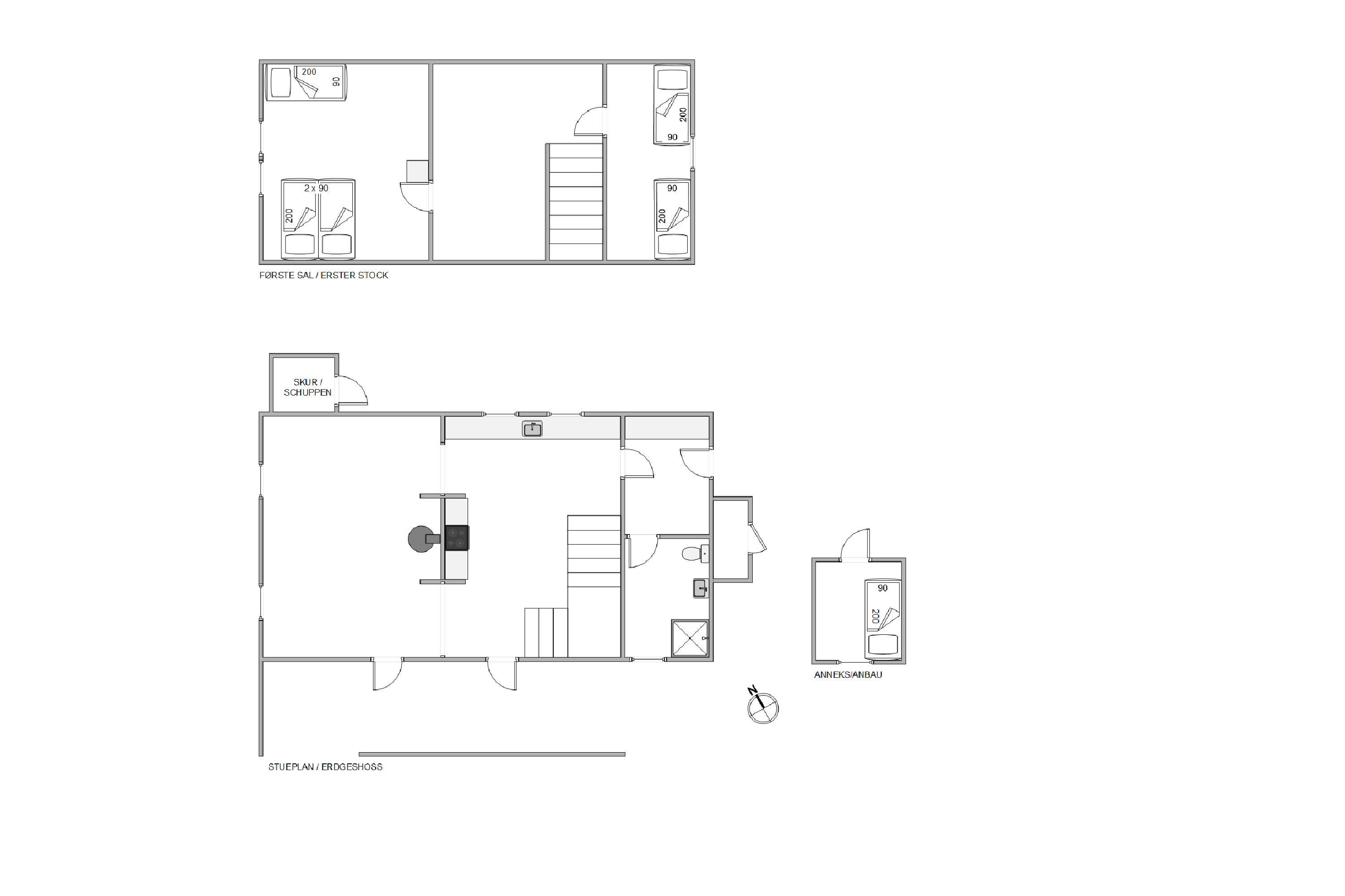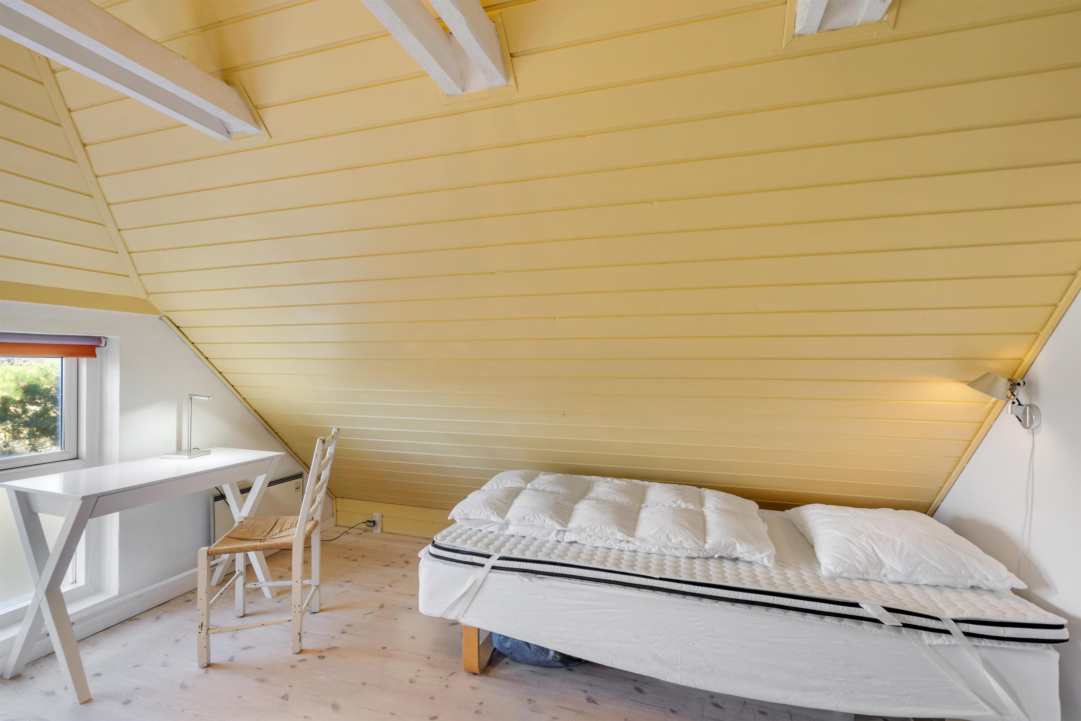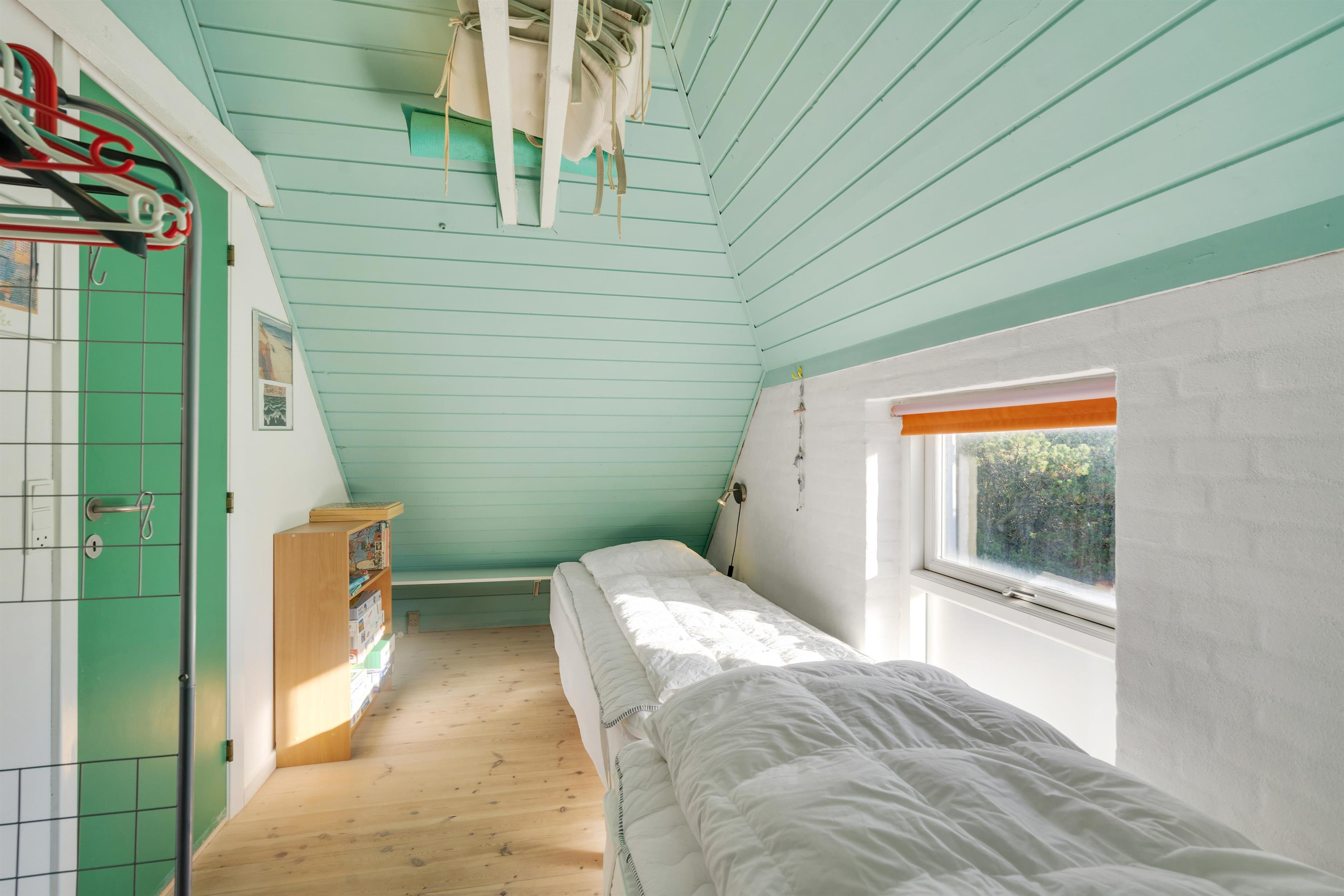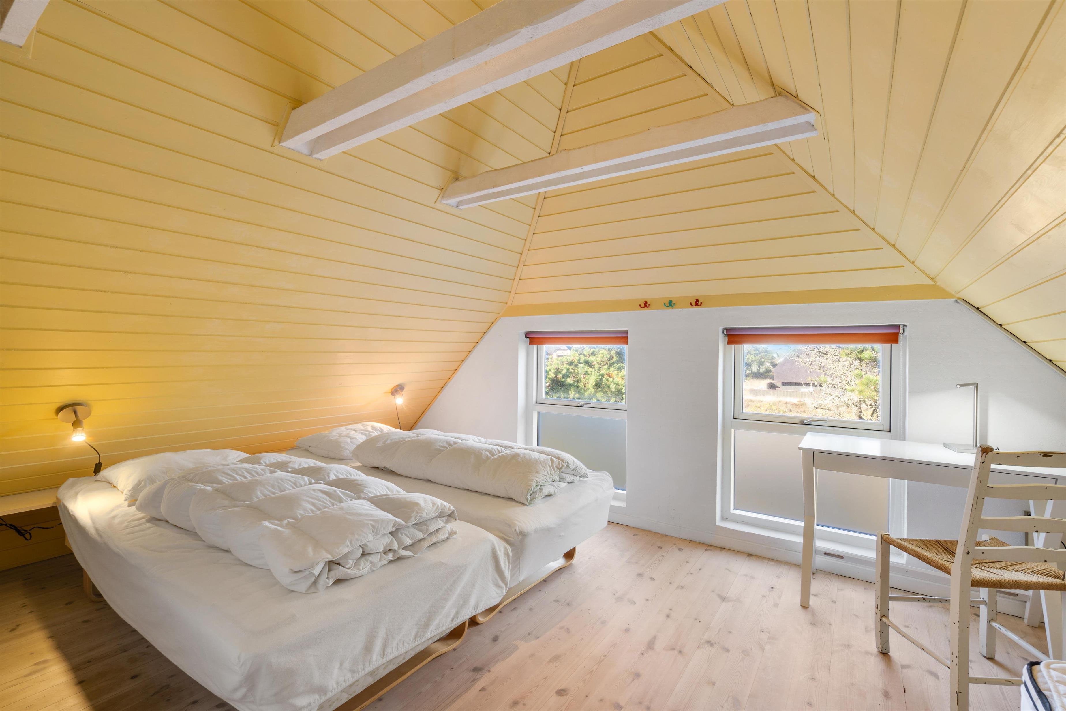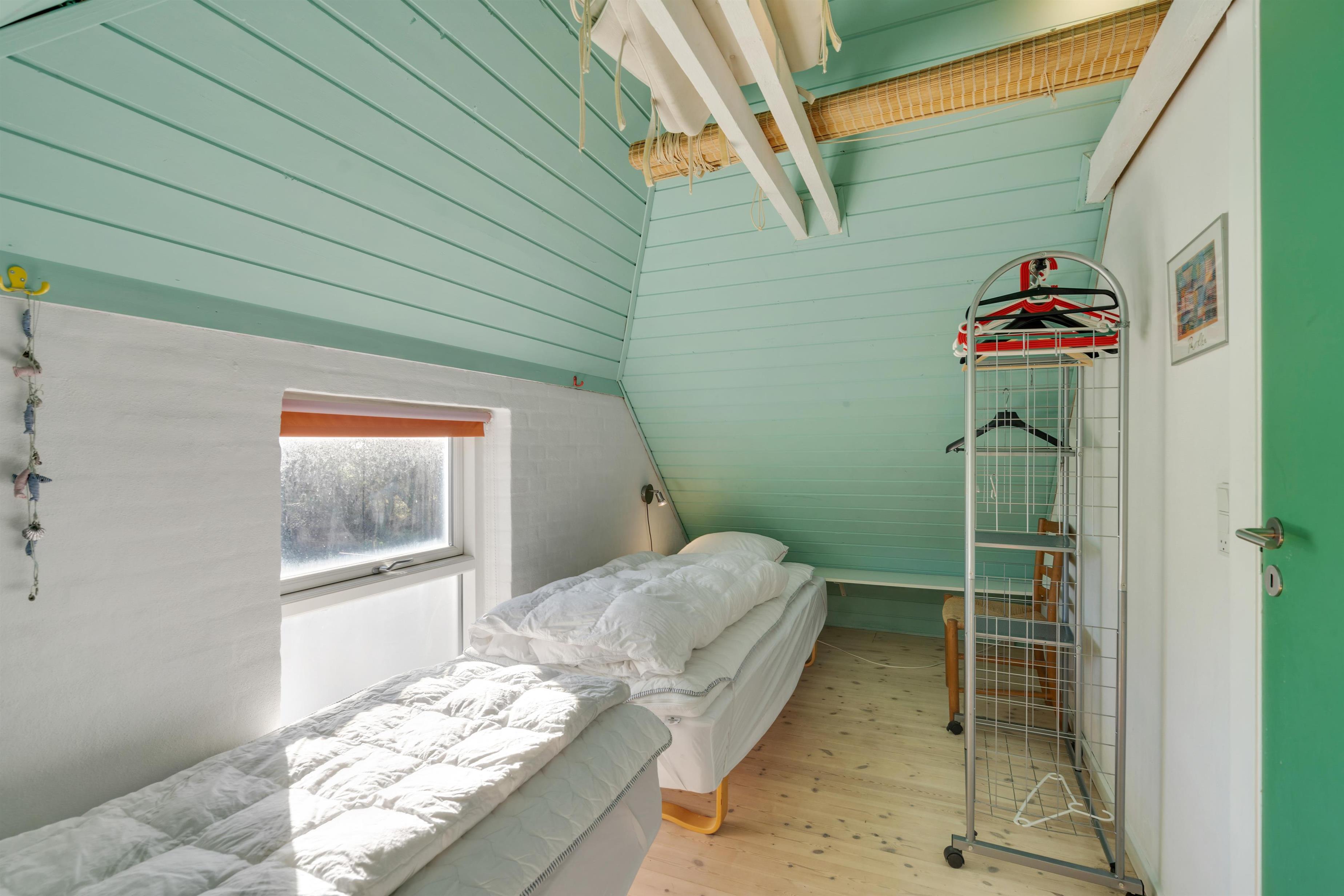 I stueplan finder I desuden badeværelset. Sommerhusets 3 soveværelser, som I kan få jeres skønhedssøvn i om natten. 2 finder I på førstesalen, og et i annekset. På 1 af soveværelserne er der dobbeltseng og 1 enkelt seng, på det andet er der 2 enkeltsenge og i annekset er der 1 enkeltseng.