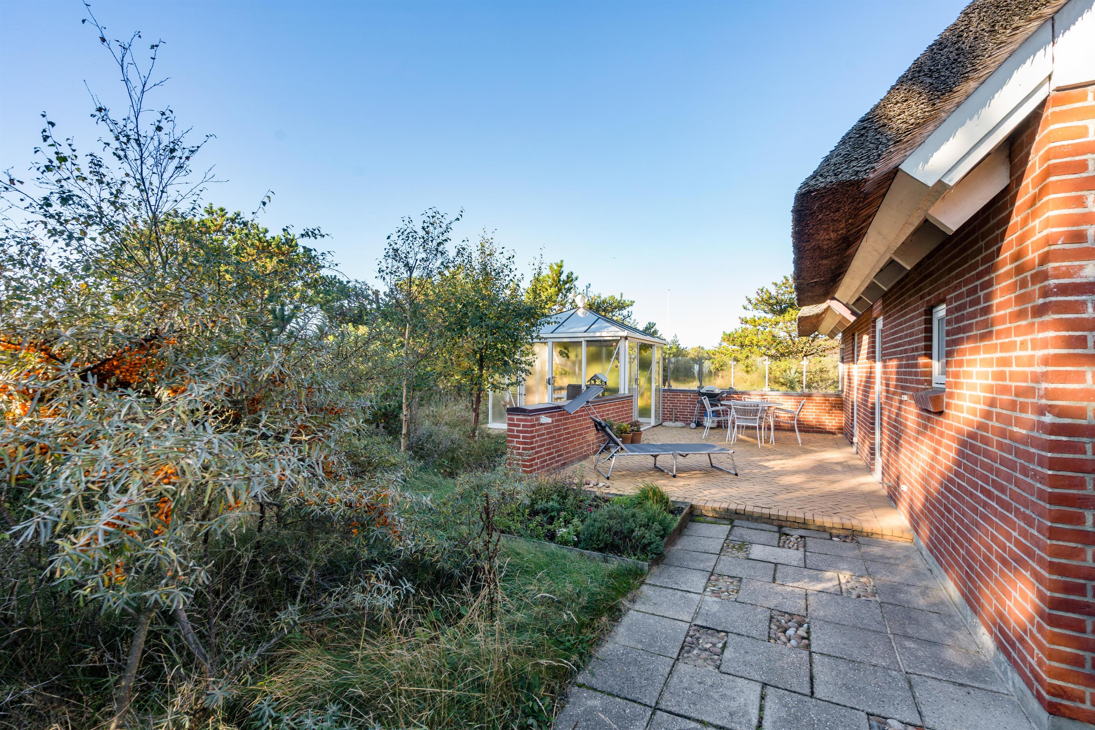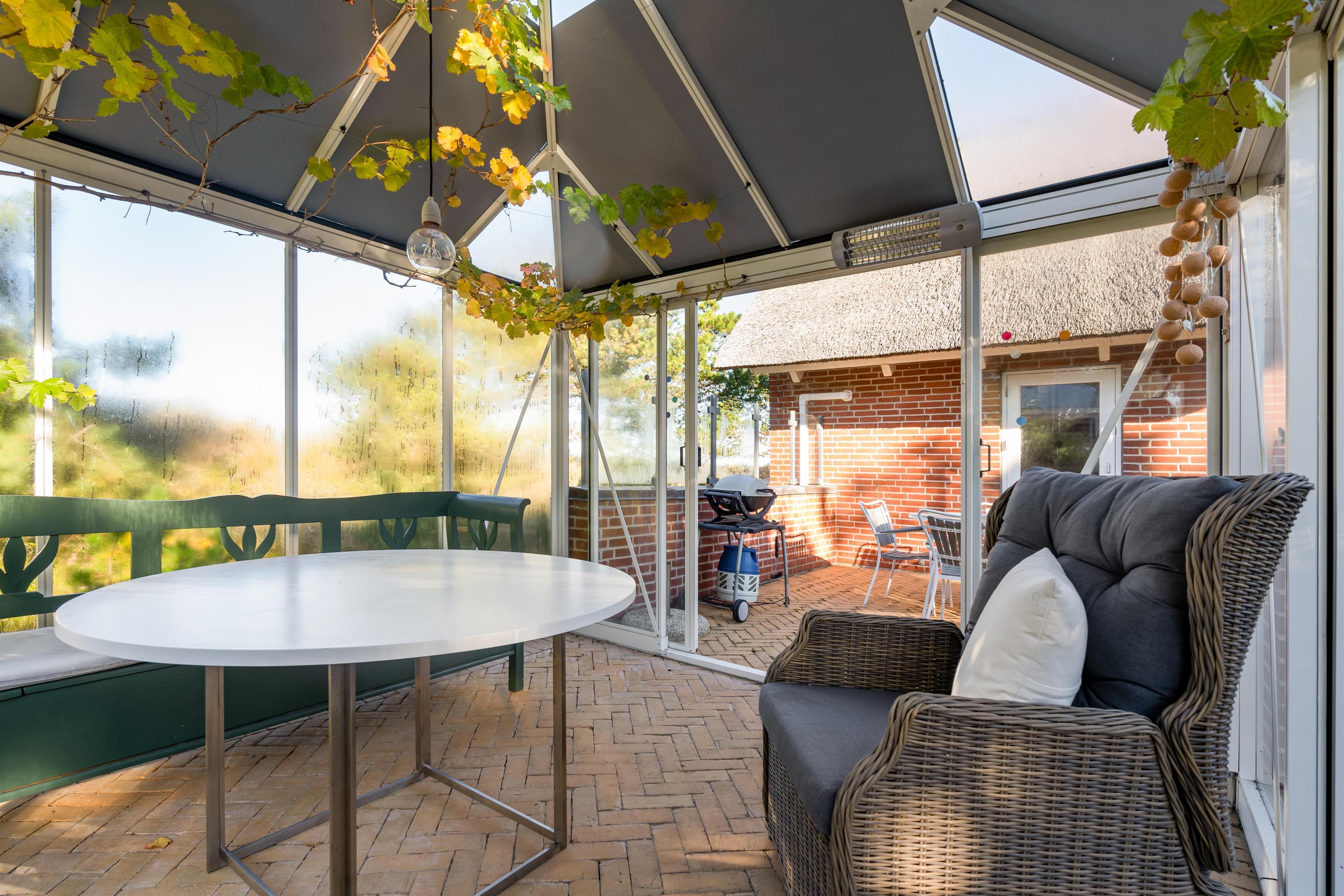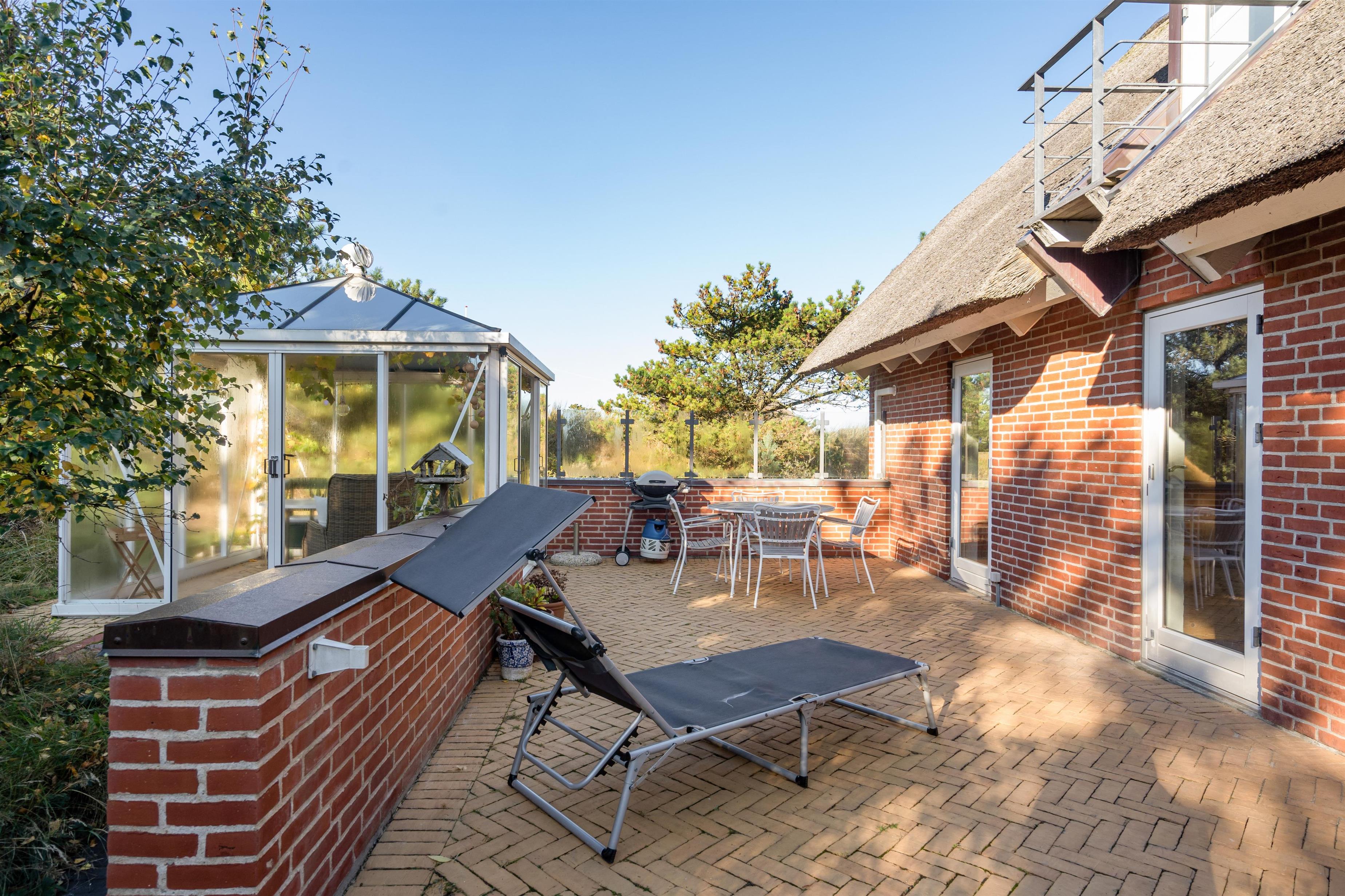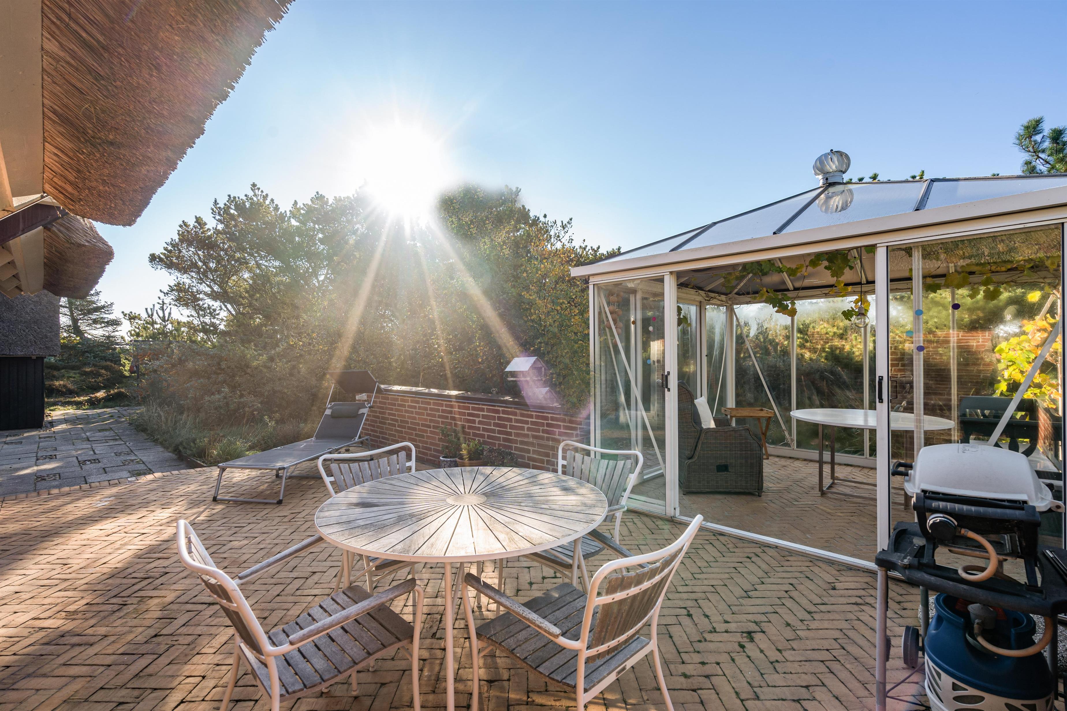 På de solrige feriedage kan I rykke ud på sommerhusets terrasse, hvor I kan sætte jer godt til rette i havemøbler og liggestole, mens I slapper af til lyden af bølgernes brusen i baggrunden. I kan også sætte jer ind i det hyggelige orangeri, hvor der både er ly og læ.