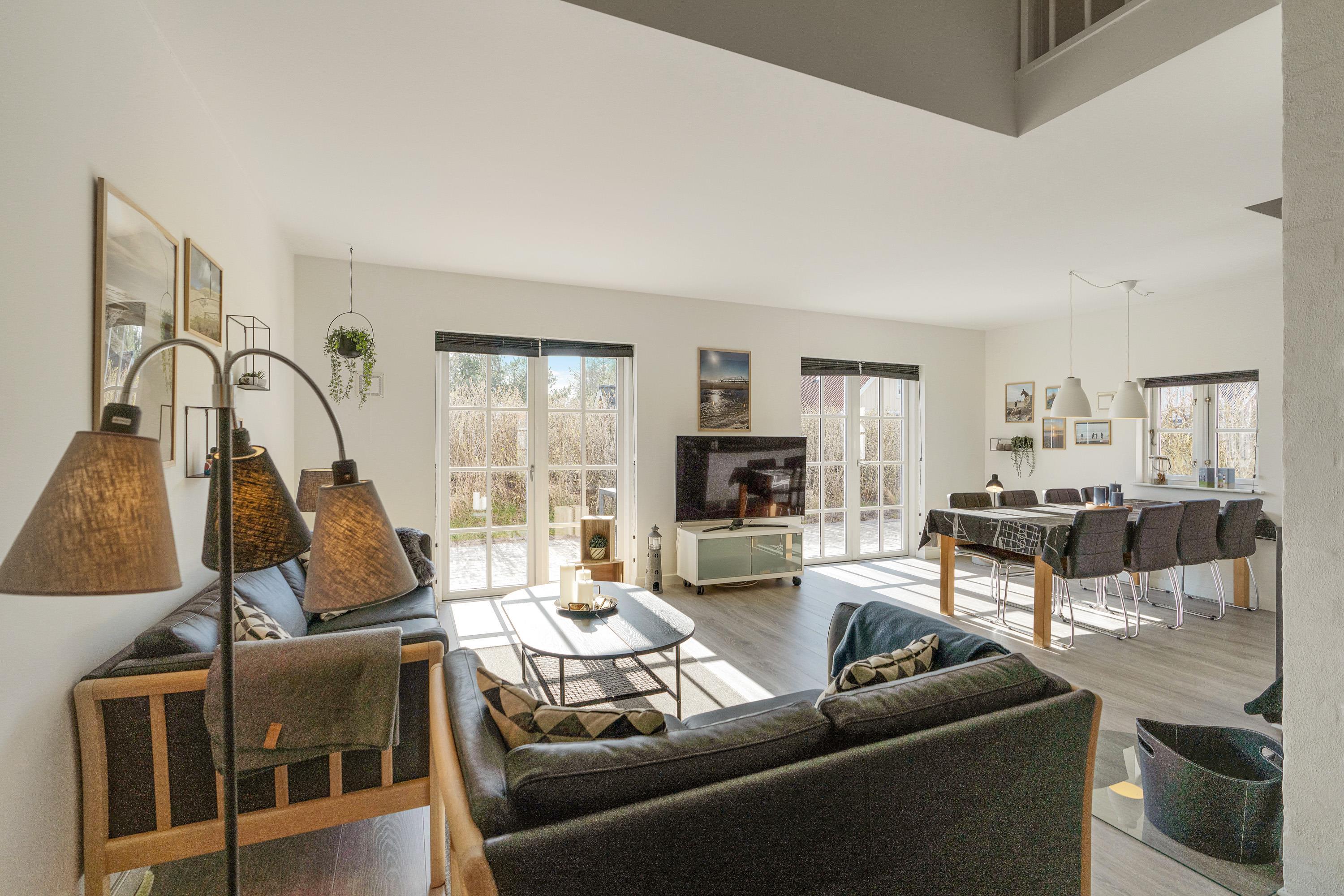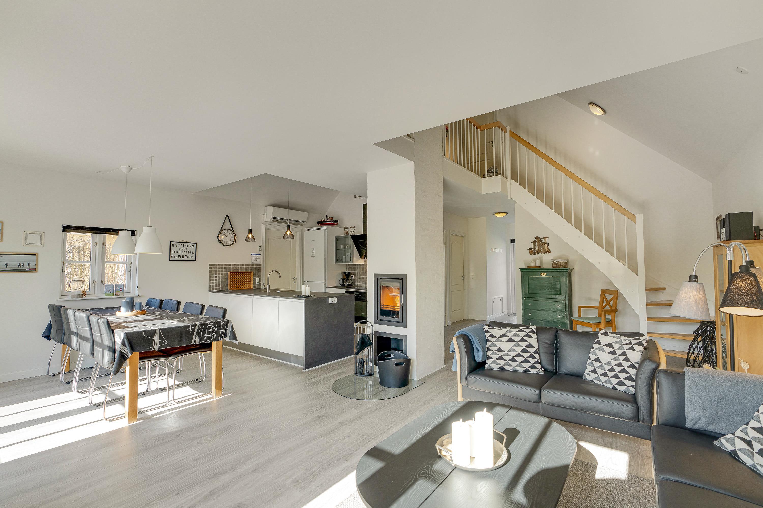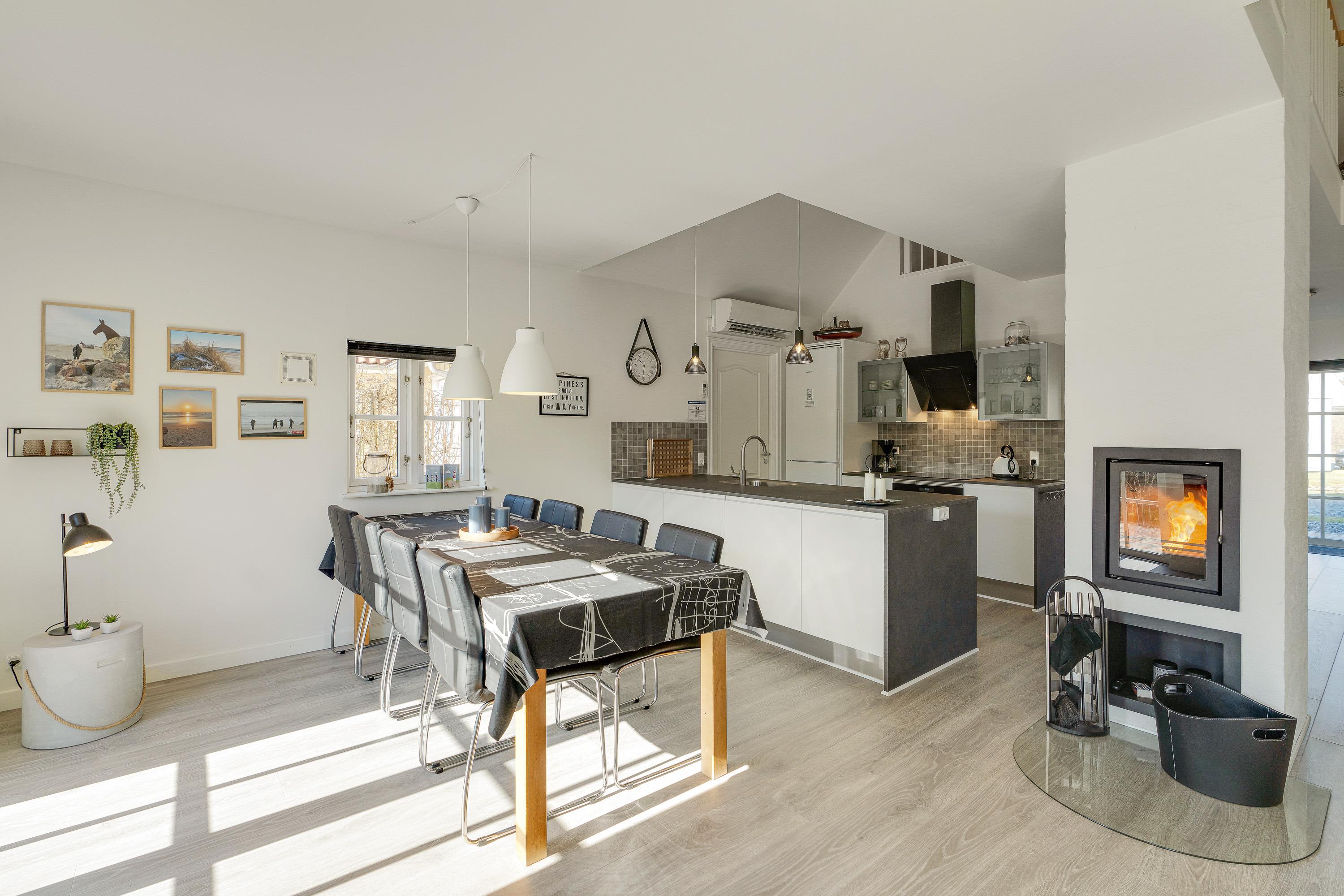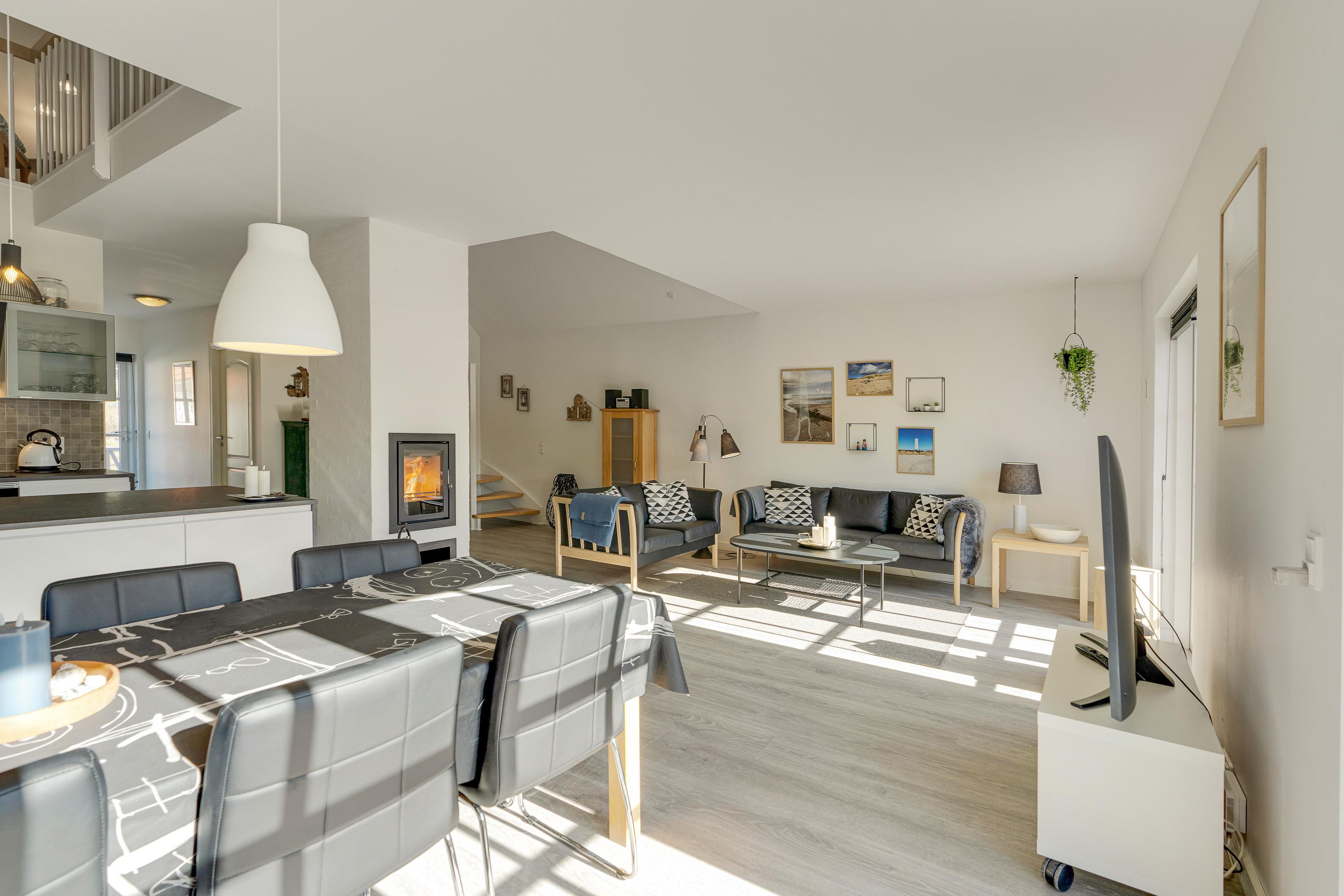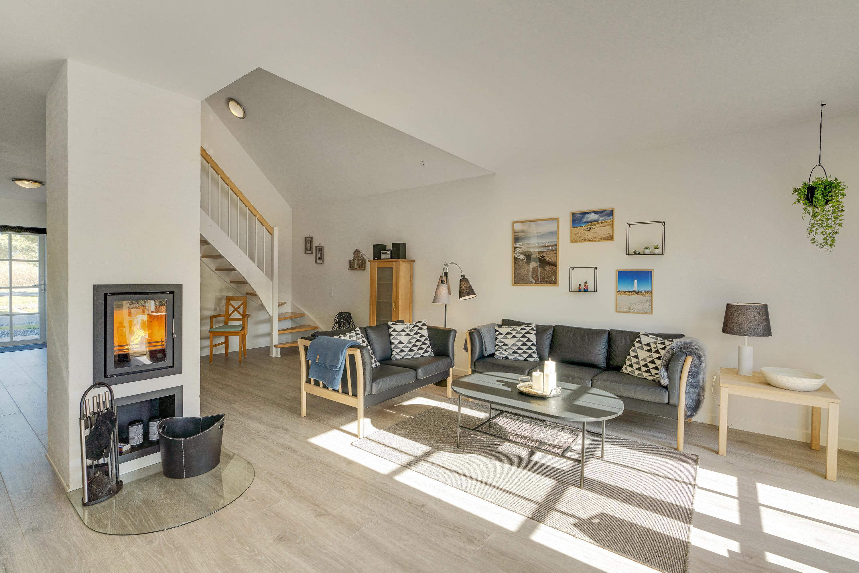 Desuden har I en energivenlig varmepumpe i feriehuset, der sørger for, at I altid har et godt indeklima på ferien. På kølige ferieaftener kan I også tænde op i pejseindsatsen i stuen, der giver ekstra varme og masser af hyggelig stemning.