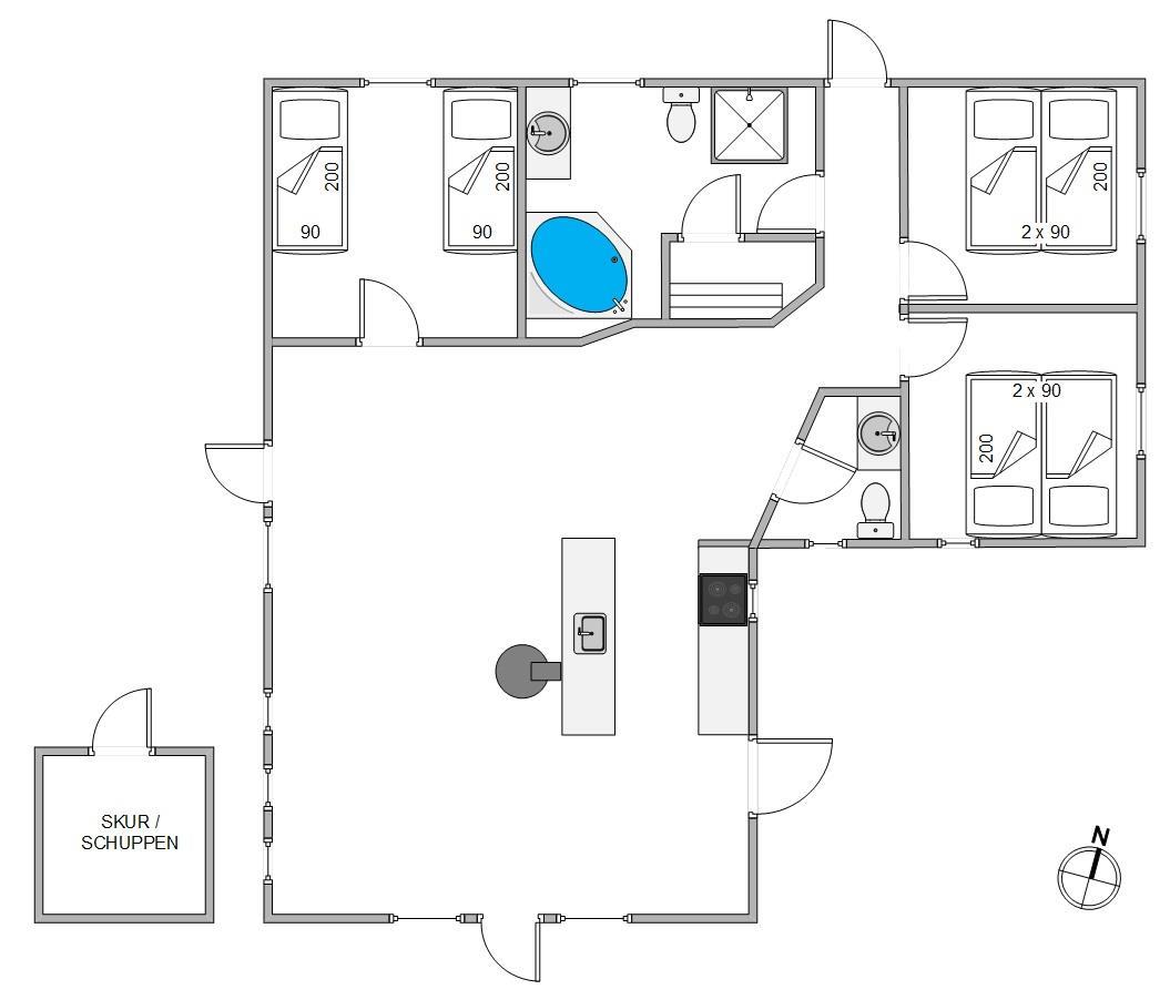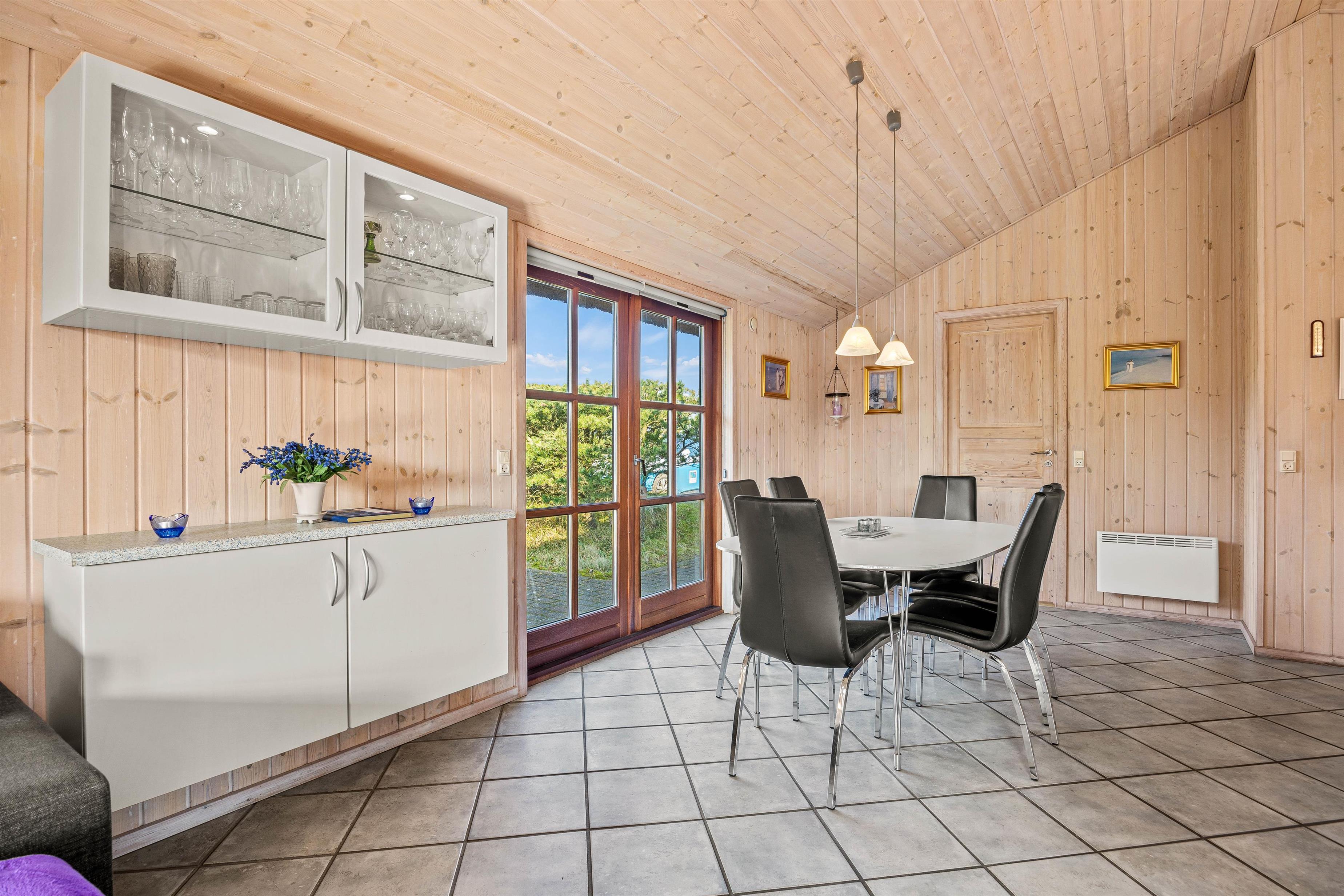 I sommerhusets hjerterum finder I det lyse åbne køkken med opvaskemaskine og mikroovn, der er i åben forbindelse med både spiseplads og stuen, så kokken kan nemt følge med i spillet ved spisebordet eller samtalen i sofagruppen. De flotte vinduespartier sørger for lys og kig til terrasserne og den flotte naturgrund.