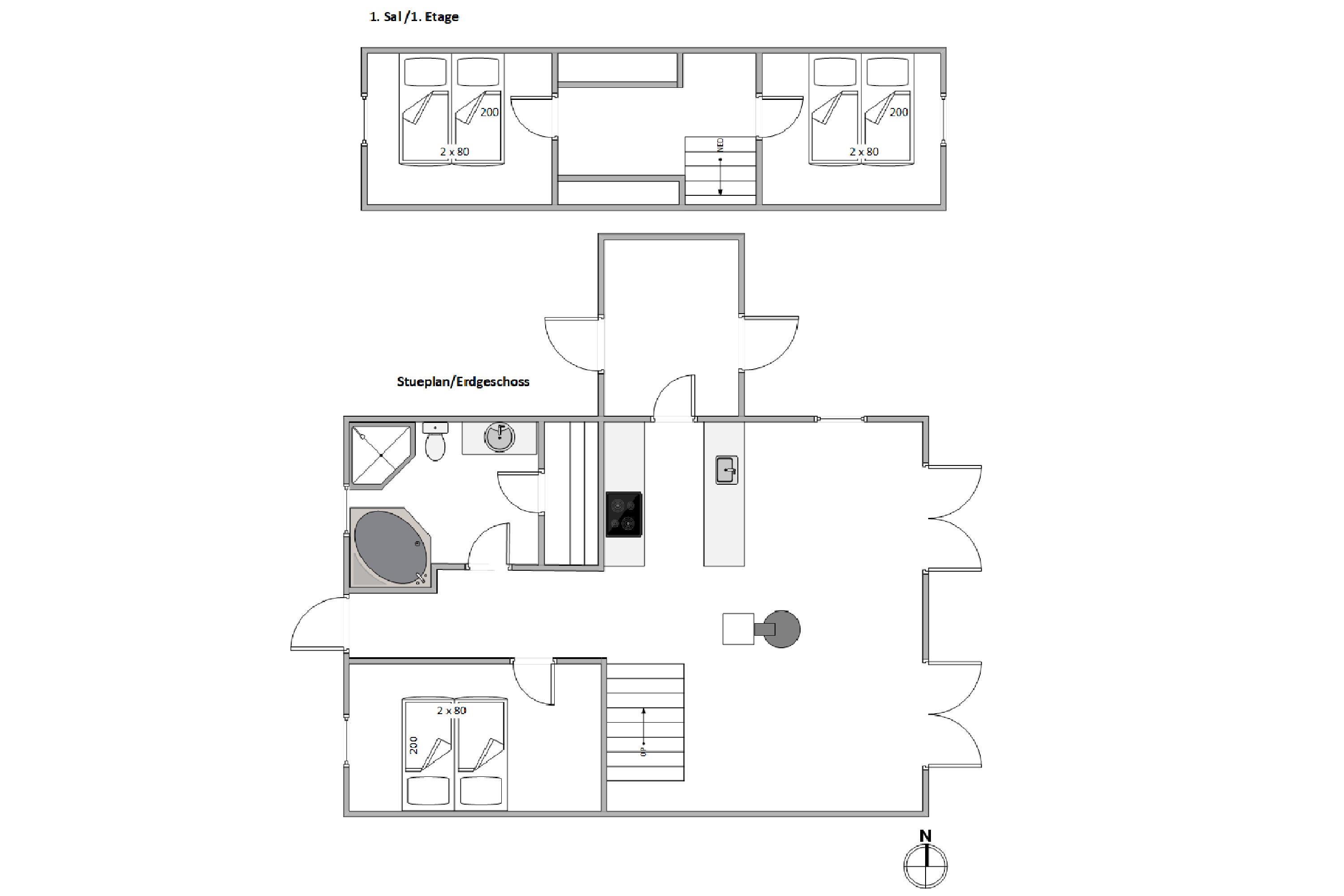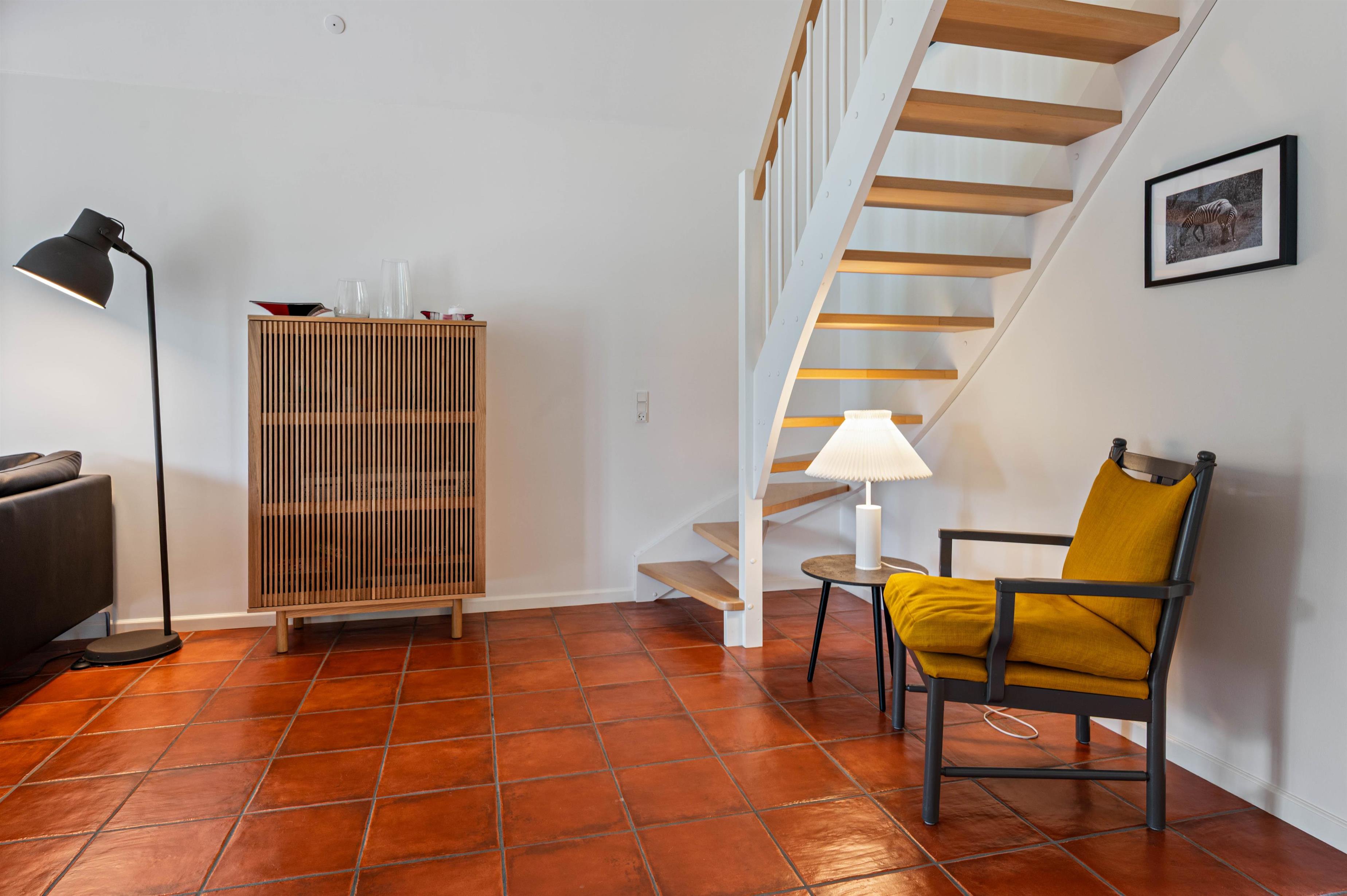 På stueetagen finder I opholdsrummet med integreret køkken, spiseplads og sofahjørne, hvorledes man kan streaem fra chromecast. Dertil kommer et soveværelse, og et stort badeværelse med gulvvarme og egen wellnessafdeling i form af sauna og spabad. På første sal ligger de sidste to soveværelser.