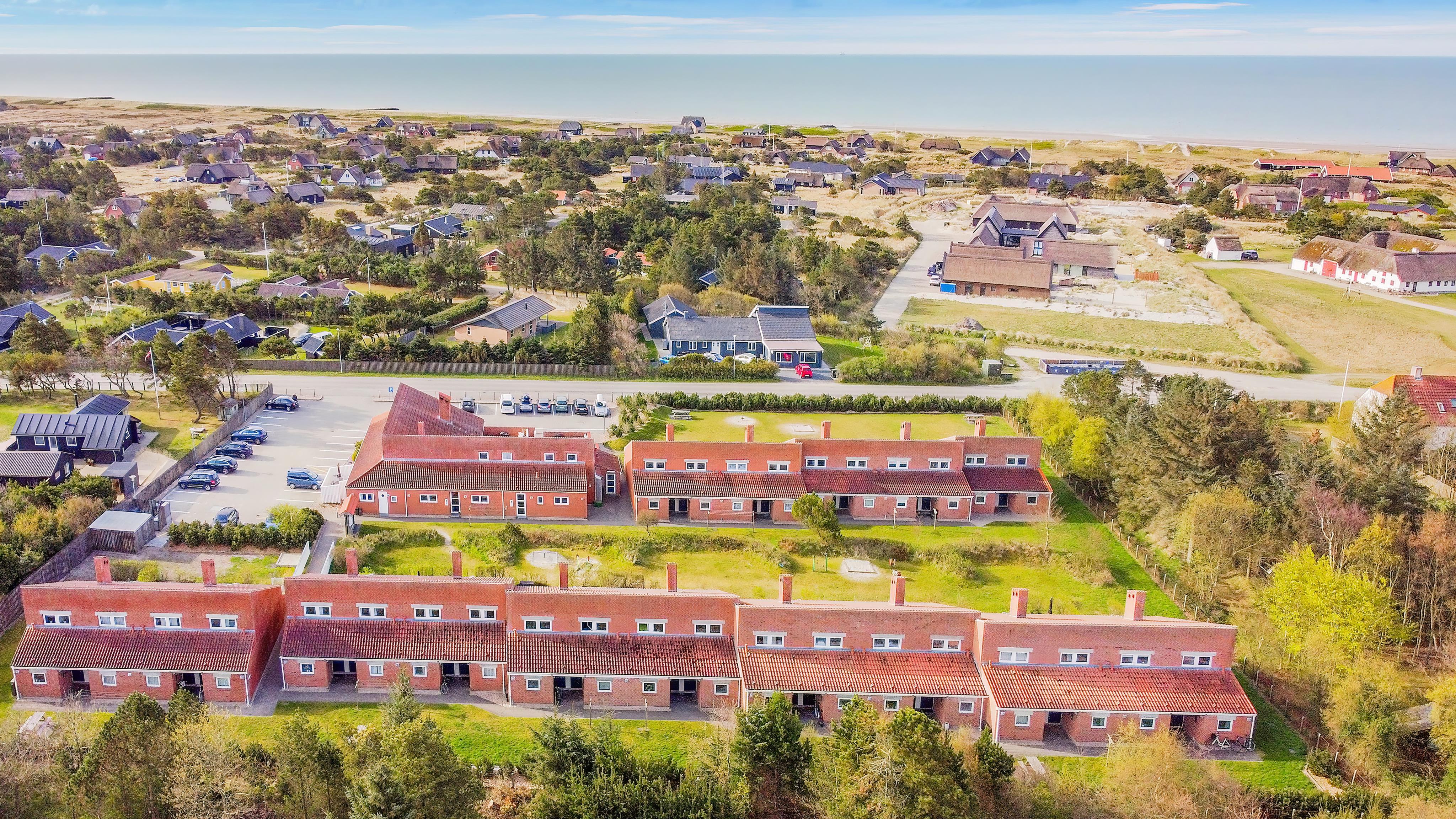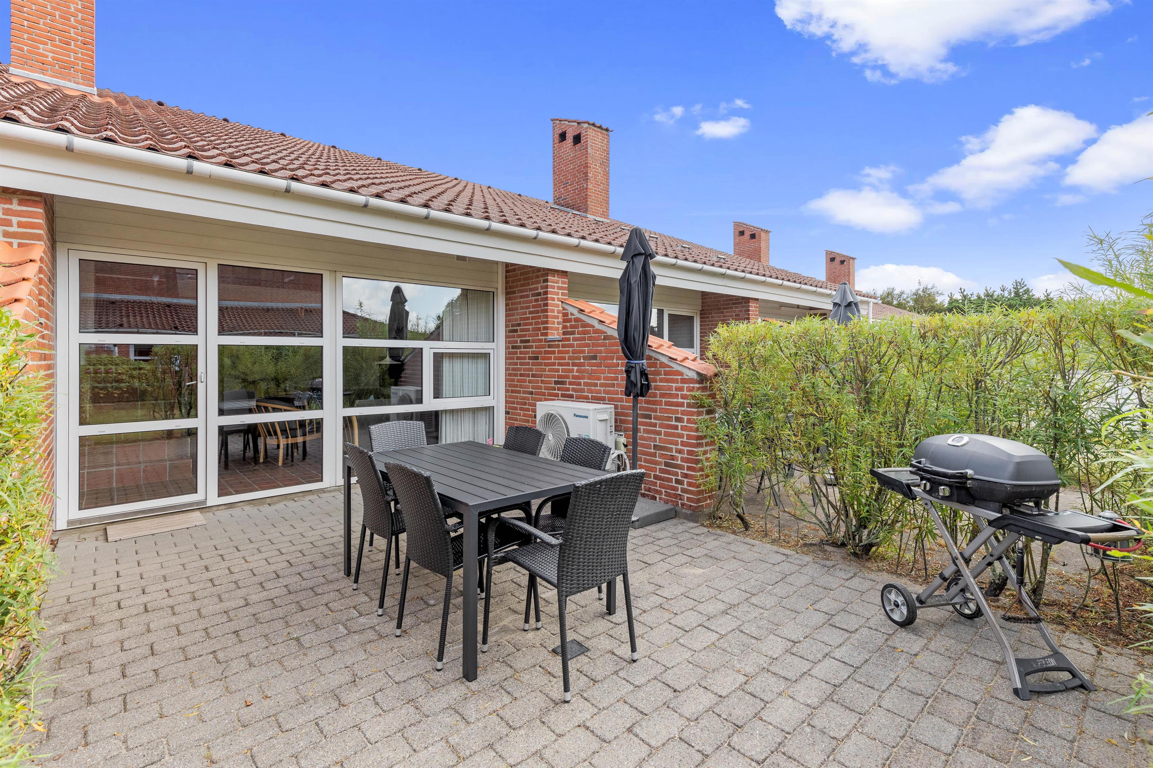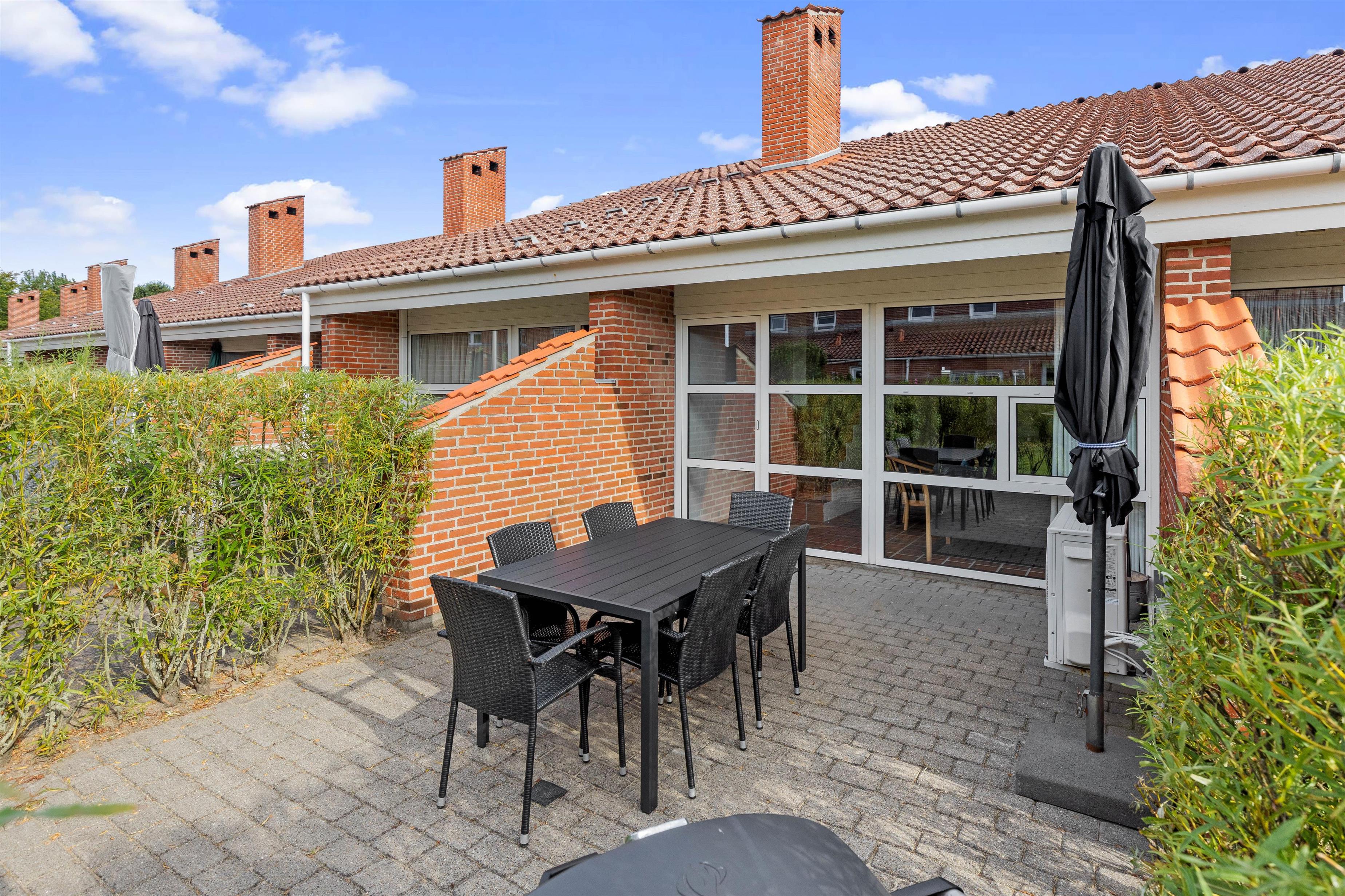 Fra ferielejlighedens alrum kan I træde ud på den åbne, delvist overdækkede terrasse. Her står der havemøbler klar til jer, som I kan sætte jer godt til rette i. Mens I slapper af i solen på terrassen, kan børnene lege på den fælles legeplads.