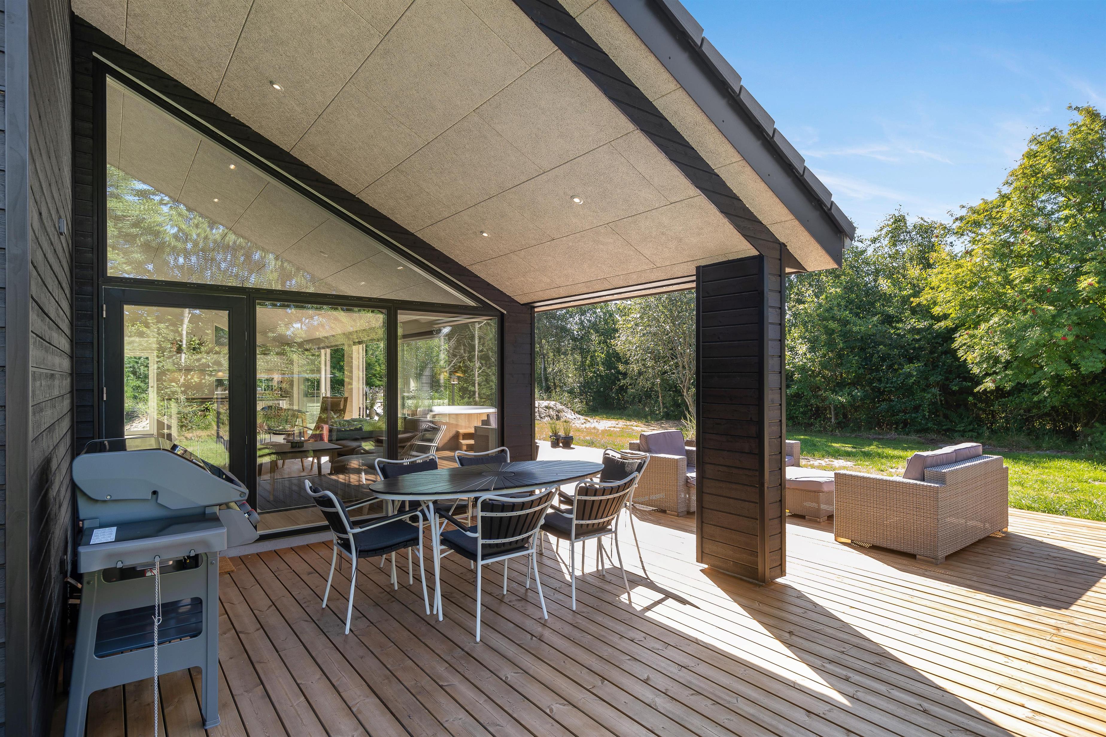 Sommerhusets udeområde byder også på en delvist overdækket terrasse, hvor I har havemøbler, liggestole og en gasgrill til rådighed, så I kan tilbringe de varme feriedage udendørs hele dagen lang.