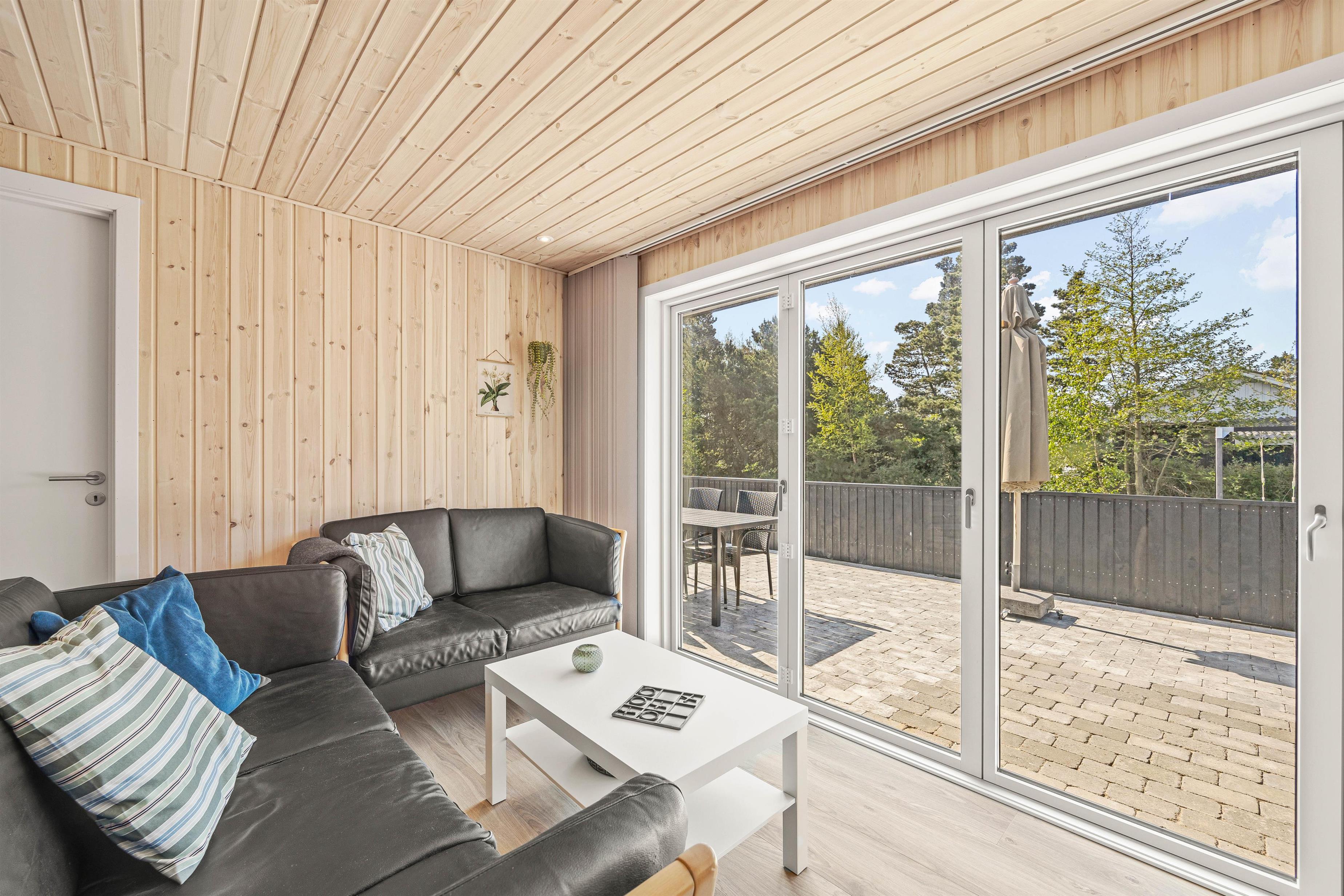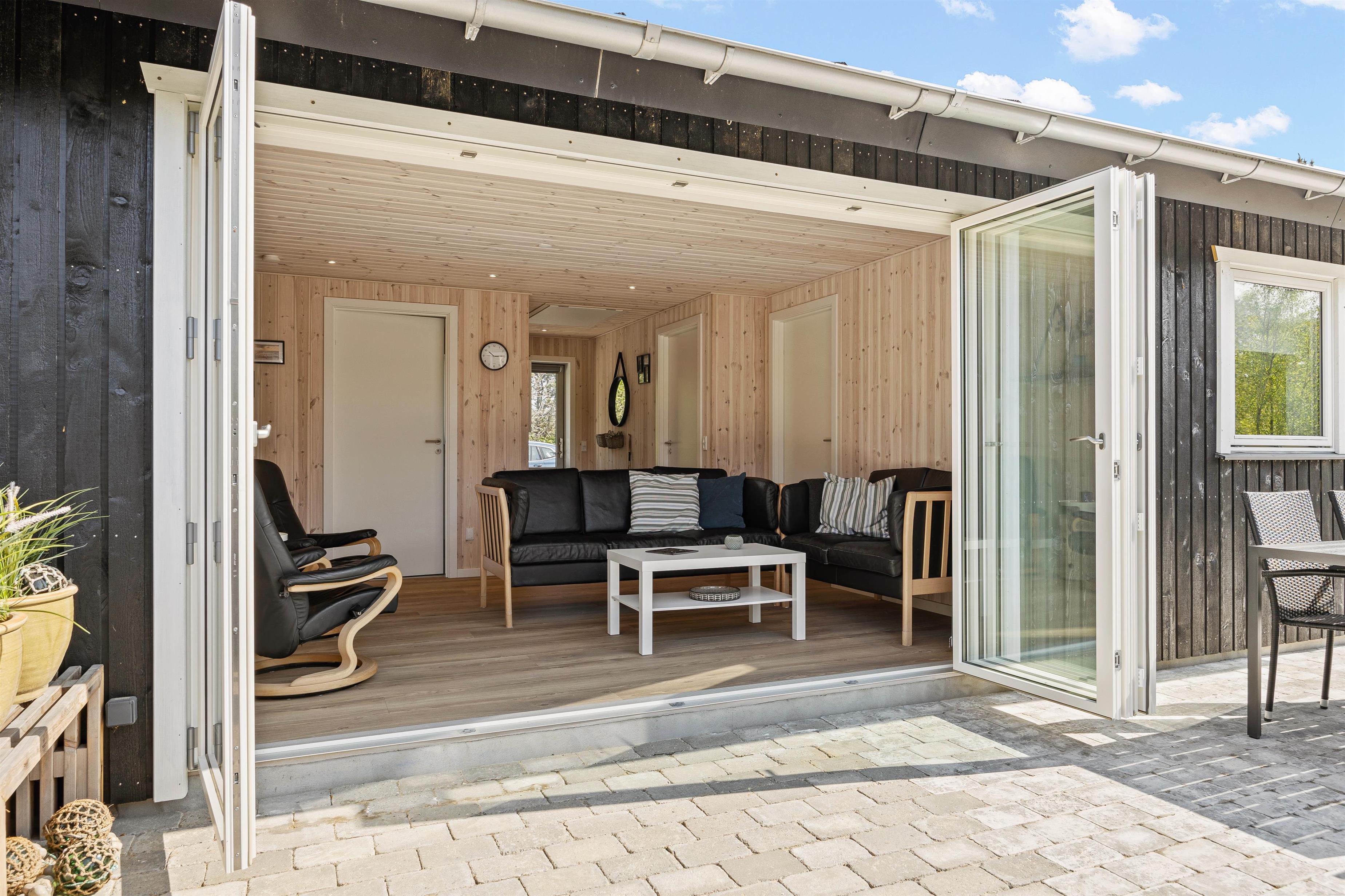 Til sommerhuset hører en fin og stor, delvist overdækket terrasse, hvor solrige dage kan nydes, og som I kan åbne fuldt op til i forbindelse med tilbygningen. Her finder I komfortable havemøbler og en kulgrill, hvorpå I hurtigt og nemt kan tilberede lækre måltider, som I kan nyde til god vin eller velsmagende, lokal øl.