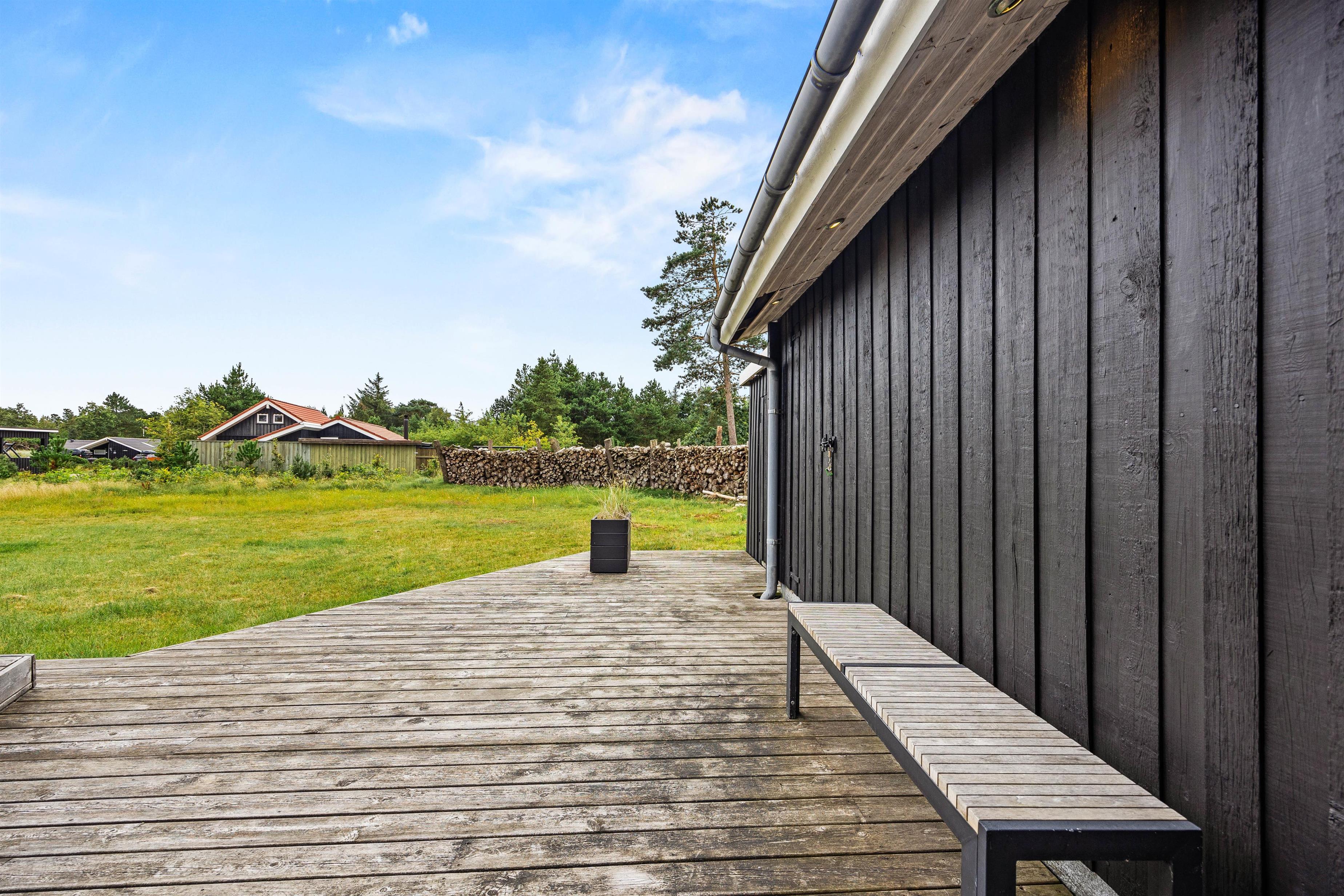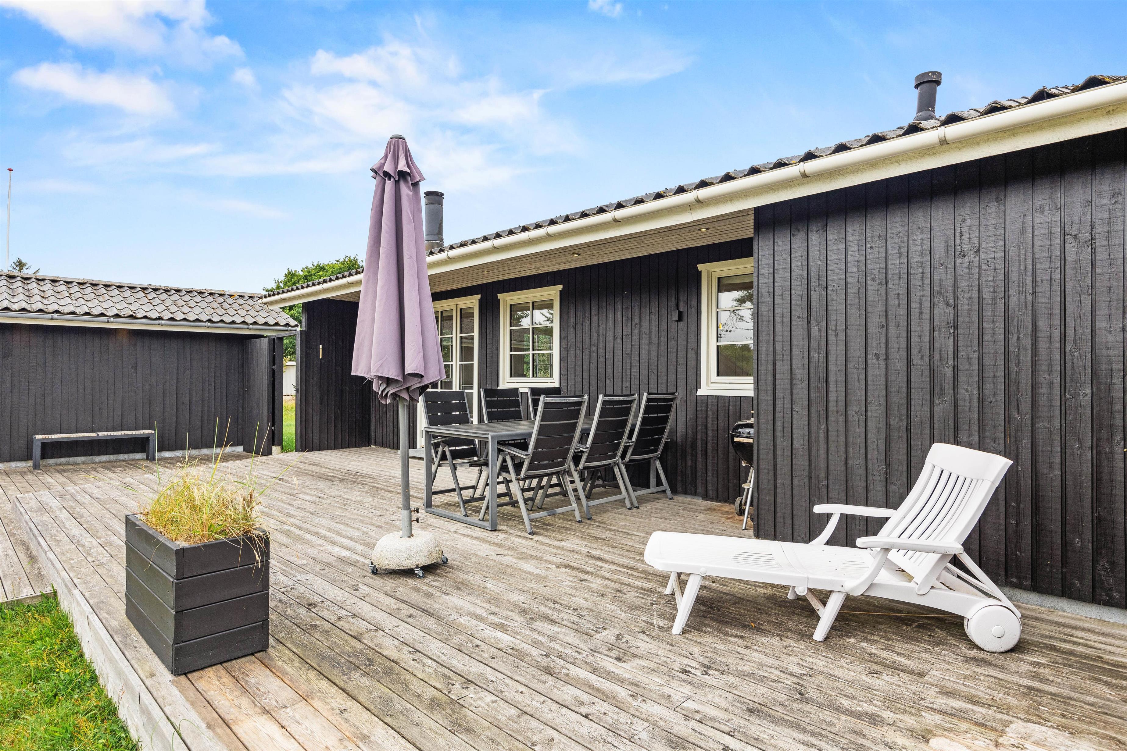 Det charmerende sommerhus ligger på en rummelig 1858 m² naturgrund, hvor I både har plads til at boltre jer og finde ro. Hyg jer på den store, delvist overdækkede terrasse, som er udstyret med komfortable havemøbler, mens børnene boltrer sig på den store grund, og nyd dejlige grillaftener med familie og venner.
