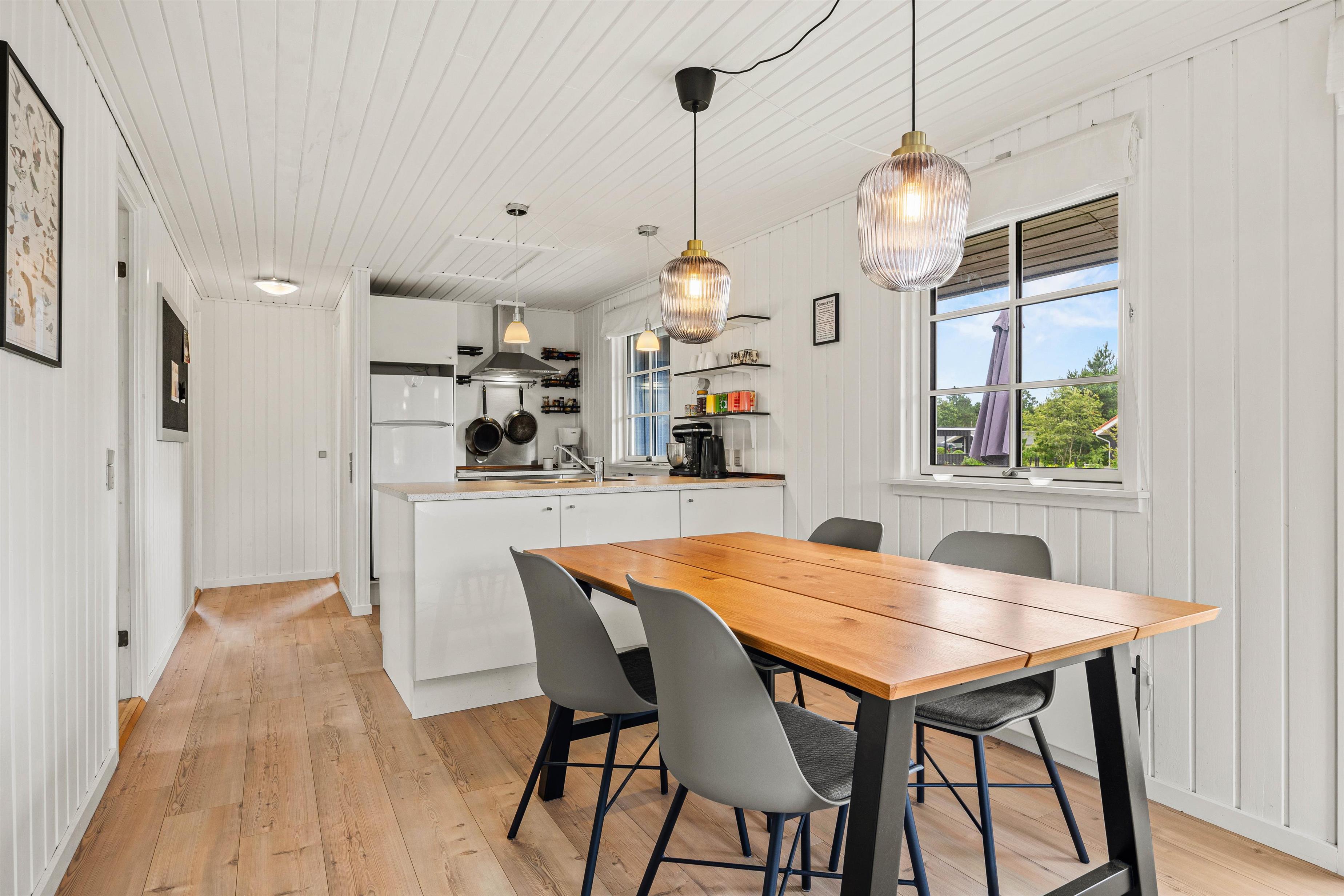 I det rustikt indrettede sommerhus, som blev moderniseret i 2022, finder I 89 m² rummeligt boligareal. Lav lækker feriemad med årstidens grøntsager og lokale delikatesser i det lille køkken, som er udstyret med en mikroovn og en separat fryser på 30 liter, og kom ned i gear med hyggelige, fælles måltider. Ved det rustikke spisebord kan I fortælle hinanden om dagens oplevelser og planlægge de næste eller bare få gode samtaler om alt det vigtigste i livet.