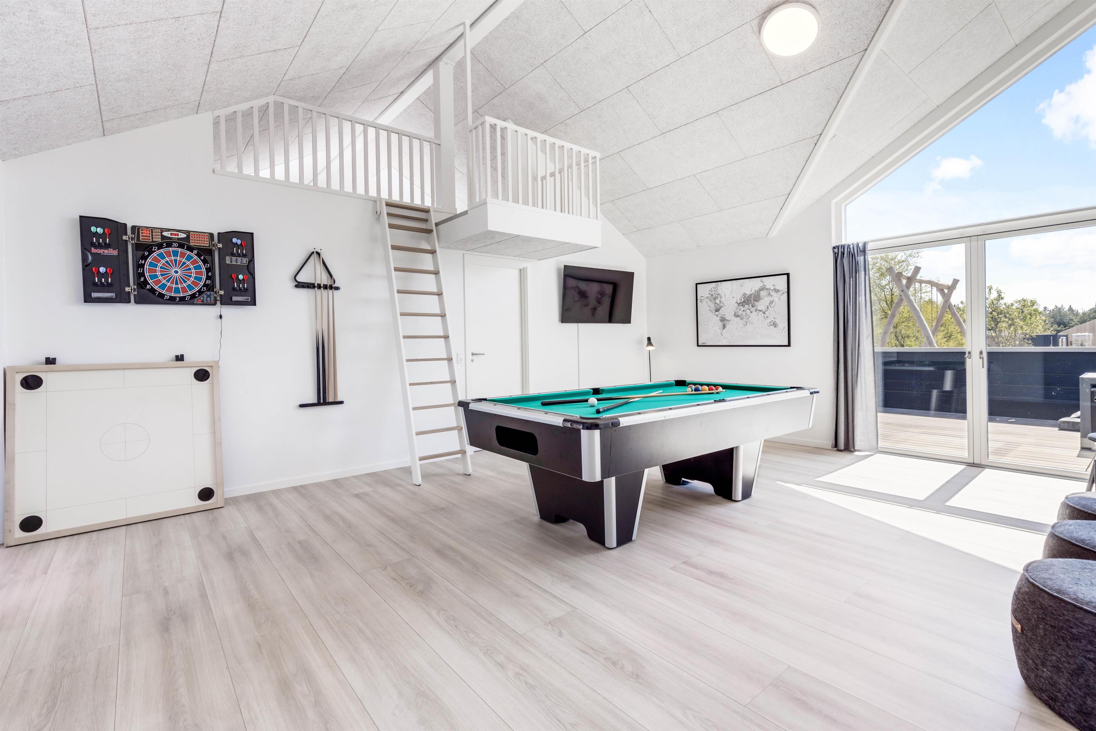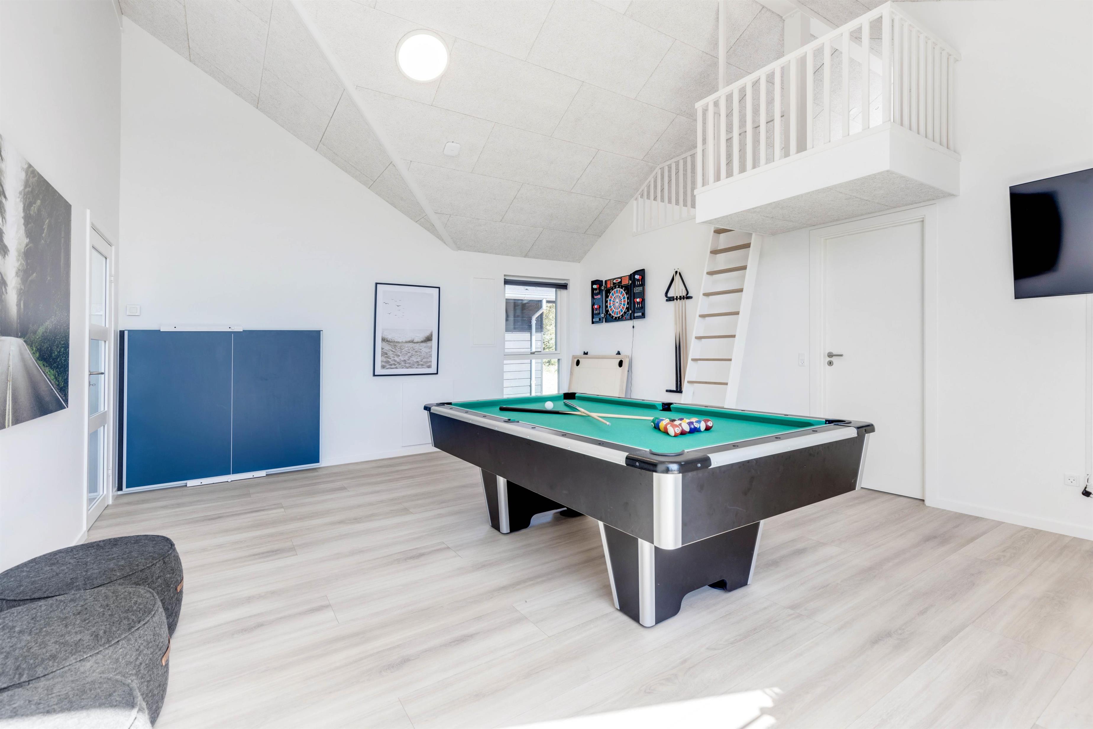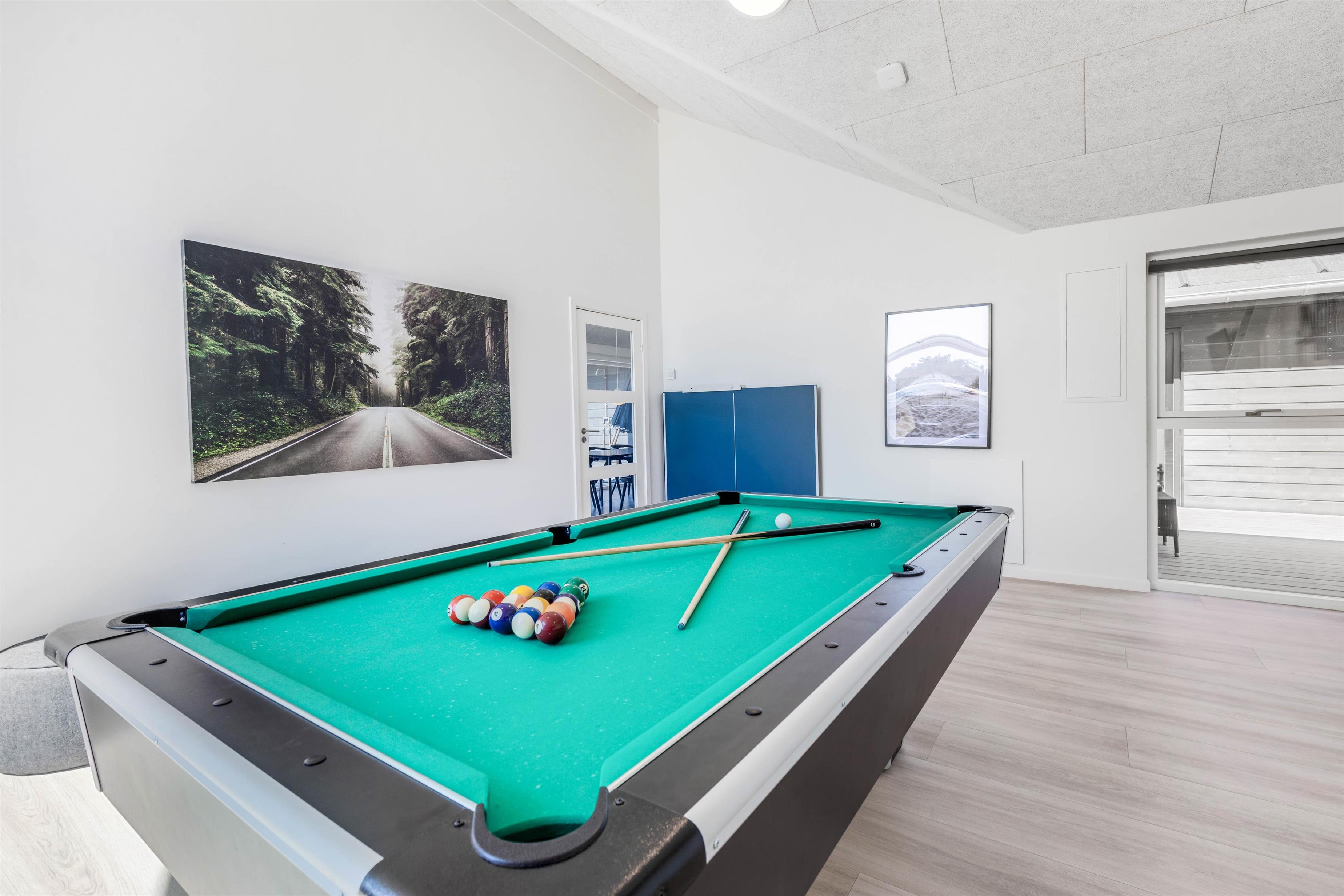 I sommerhuset er der også et aktivitetsrum, hvor I helt sikkert kommer til at tilbringe mange underholdende og hyggelige feriestunder sammen. Her har I både mulighed for at spille billard og bordtennis – og hvorfor ikke arrangere en turnering, så I kan finde feriens mester i billard og bordtennis?