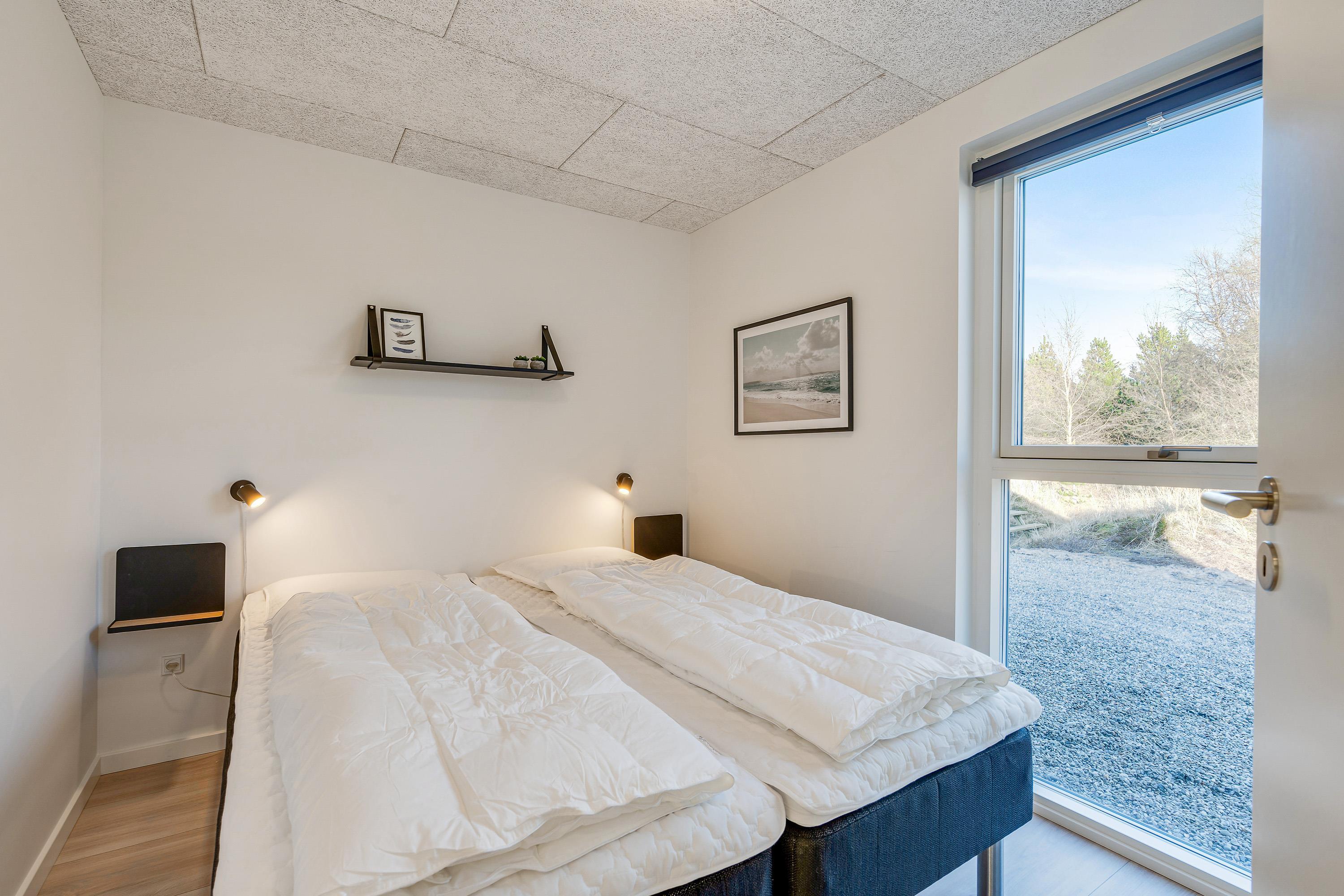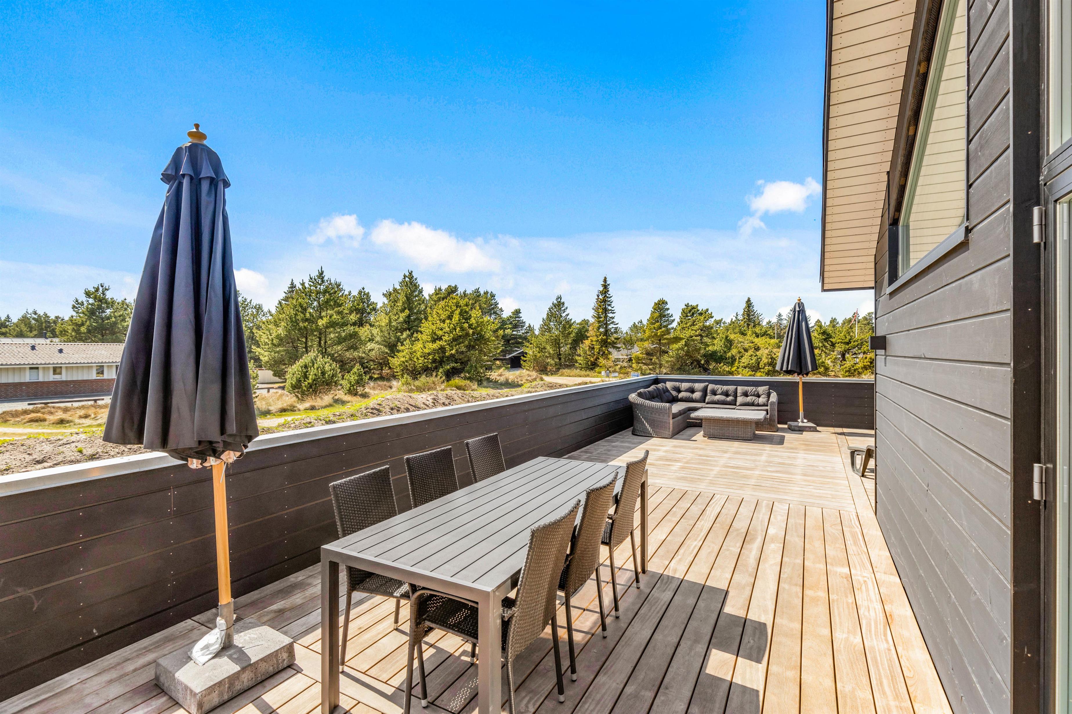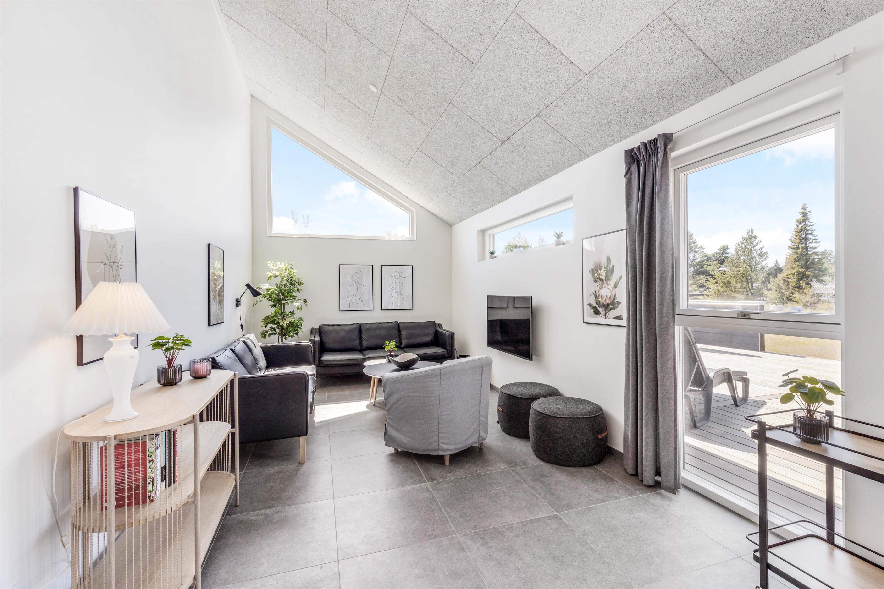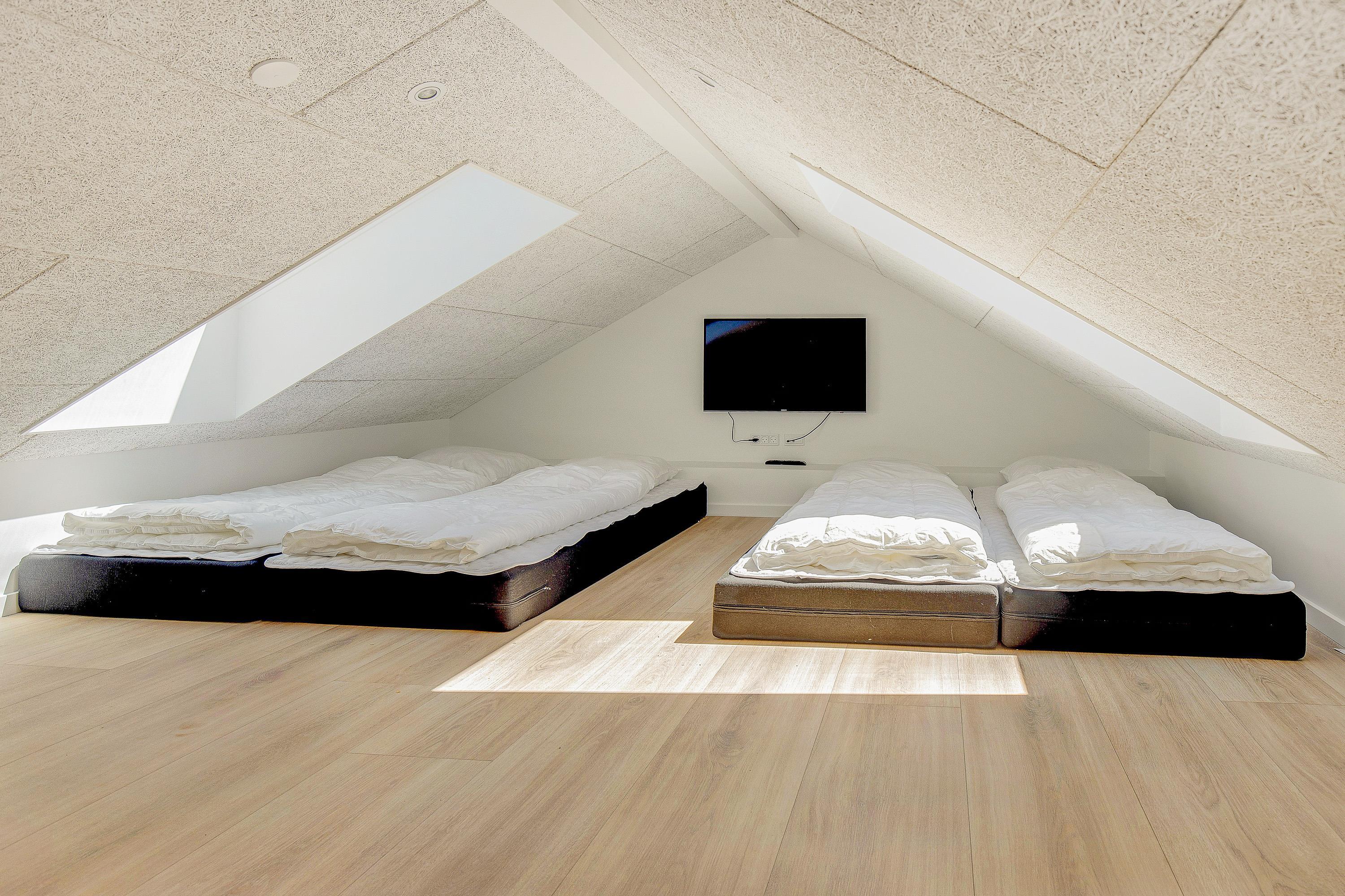 I sommerhuset møder I en lys og moderne indretning, allerede når I træder ind i feriehuset. Det 215 kvadratmeter store sommerhus er desuden rummeligt indrettet, så der er god plads til alle feriegæster. Sommerhuset rummer 5 soveværelser, hvor I kan få jeres skønhedssøvn om natten. To yderlige sovepladser befinder sig på den 20 kvadratmeter store hems. Desuden er der 2 badeværelser (med gulvvarme), så ingen skal stå i kø om morgenen - eller hver familie kan have sit eget badeværelse.