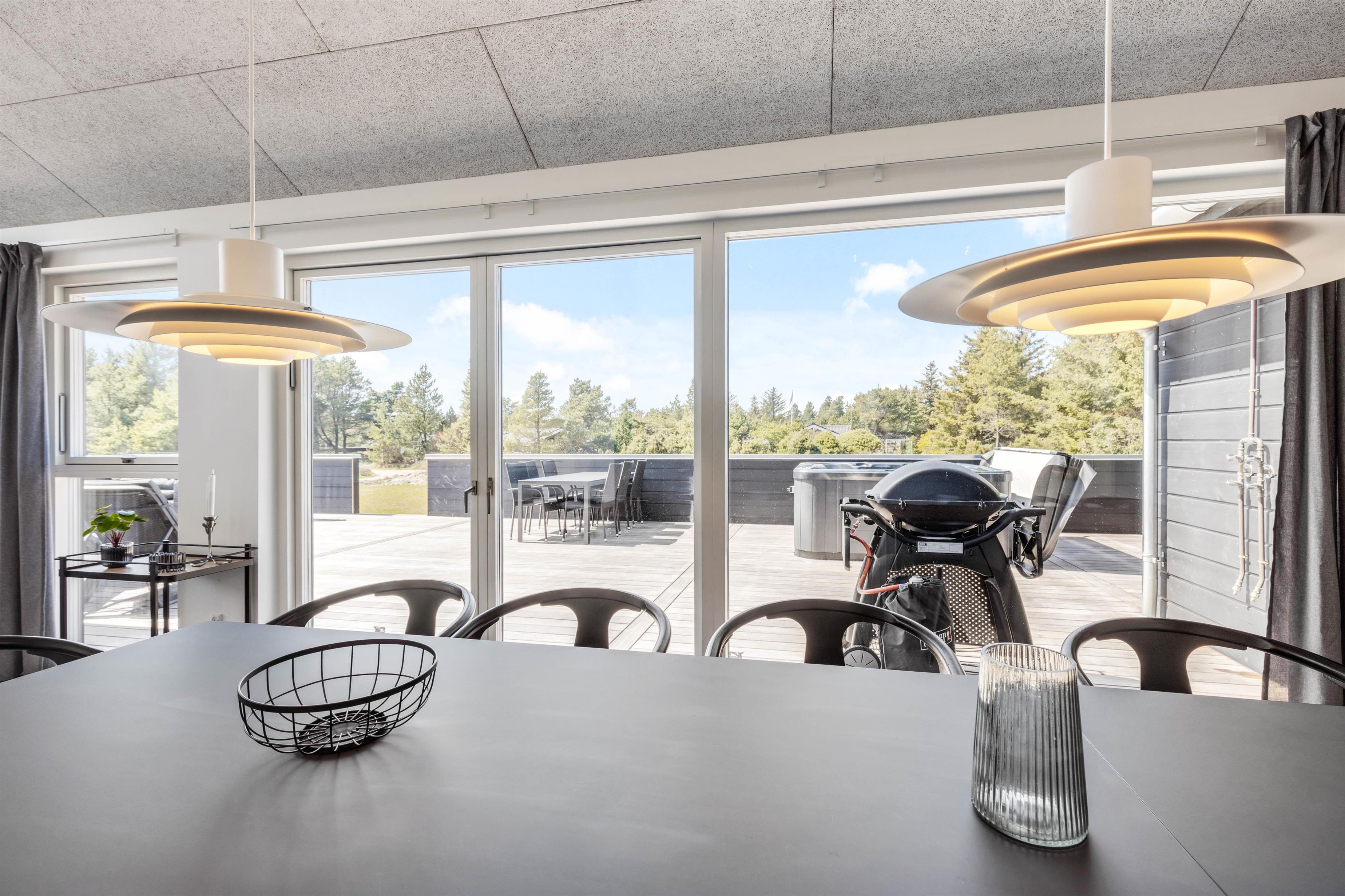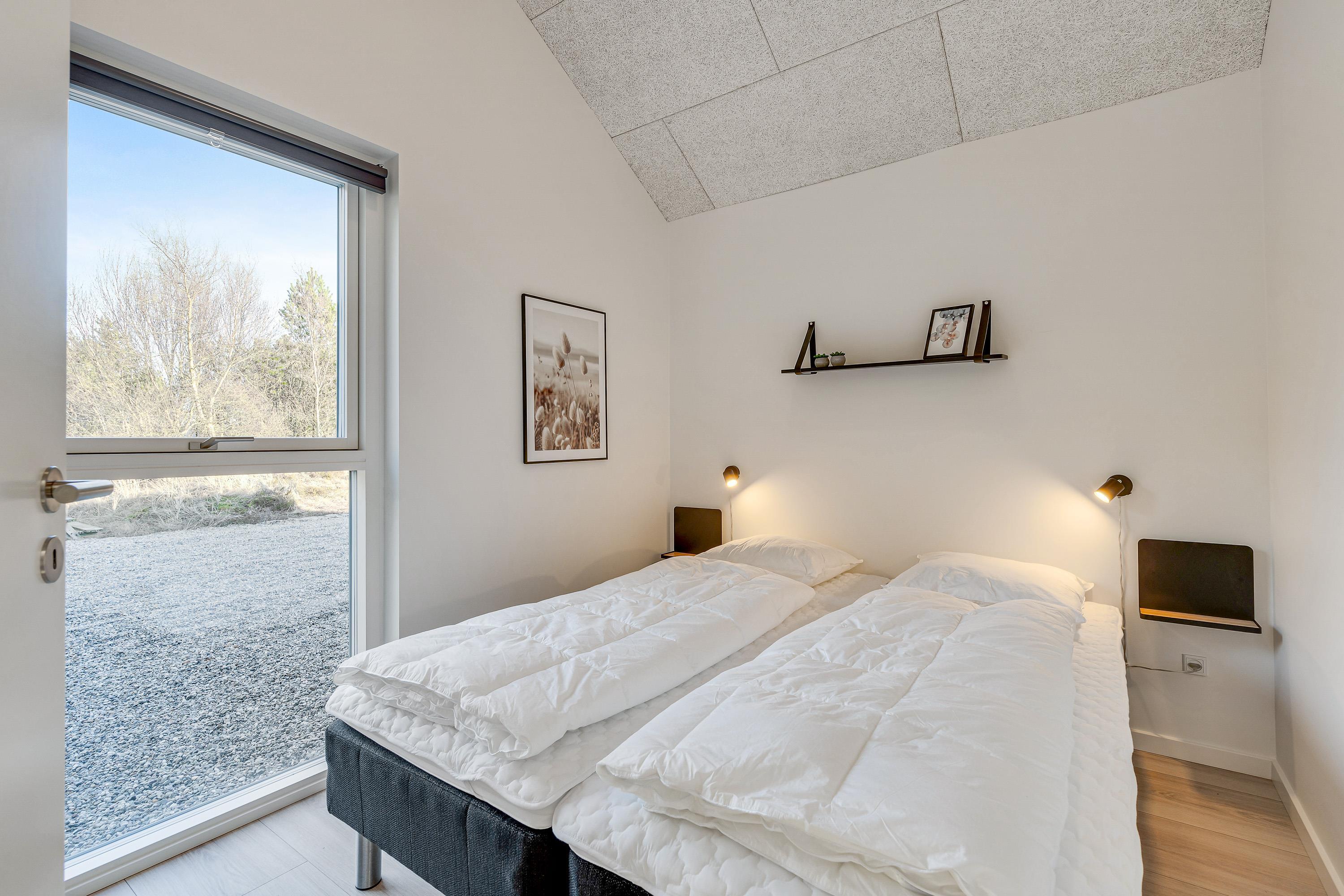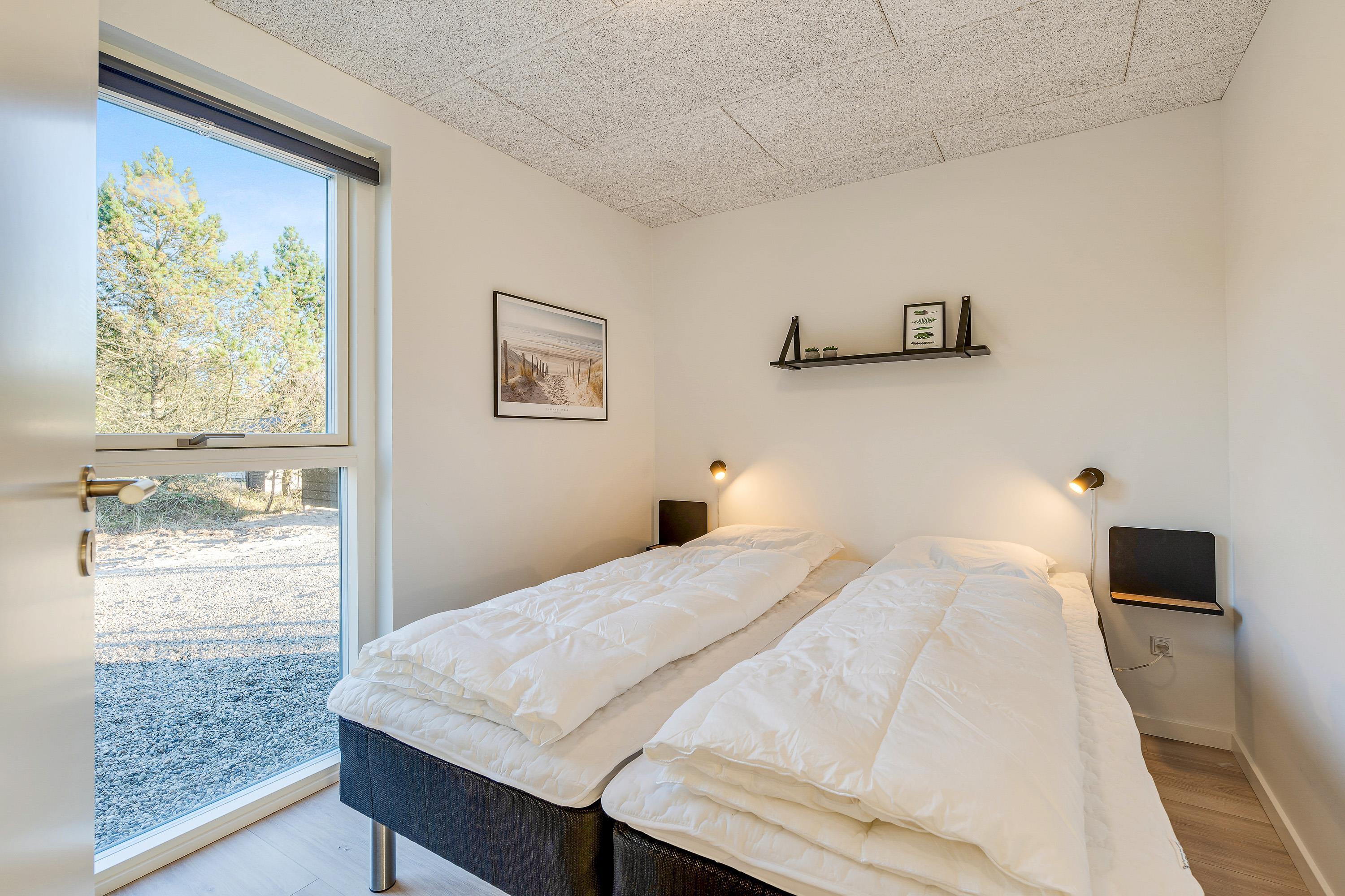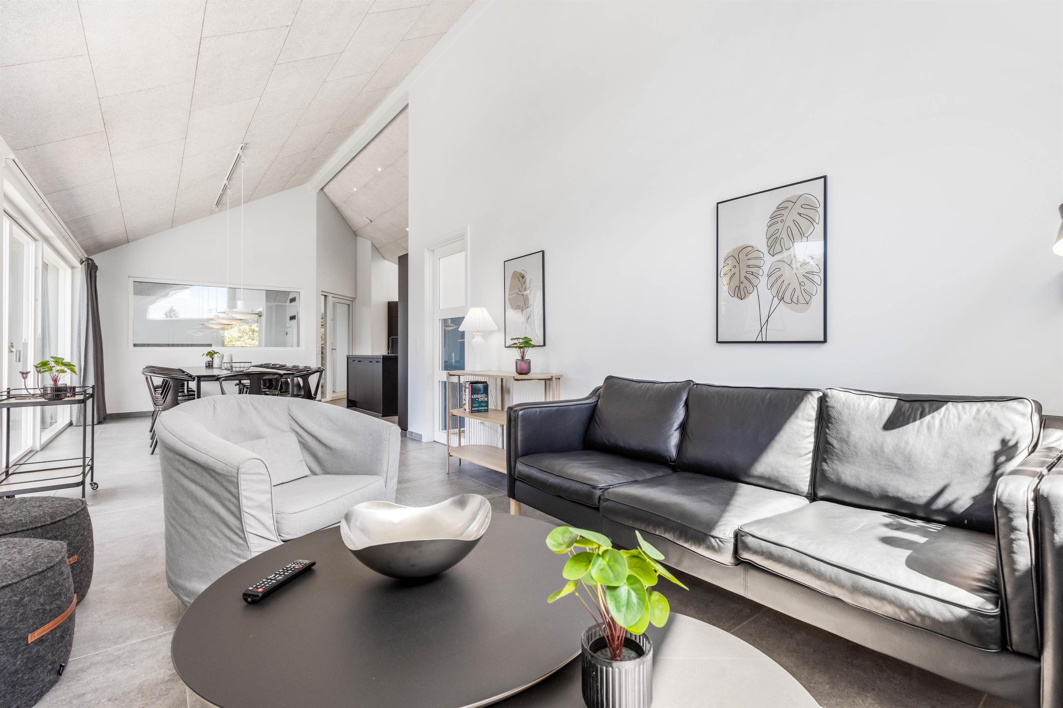 I sommerhuset møder I en lys og moderne indretning, allerede når I træder ind i feriehuset. Det 215 kvadratmeter store sommerhus er desuden rummeligt indrettet, så der er god plads til alle feriegæster. Sommerhuset rummer 5 soveværelser, hvor I kan få jeres skønhedssøvn om natten. To yderlige sovepladser befinder sig på den 20 kvadratmeter store hems. Desuden er der 2 badeværelser (med gulvvarme), så ingen skal stå i kø om morgenen - eller hver familie kan have sit eget badeværelse.