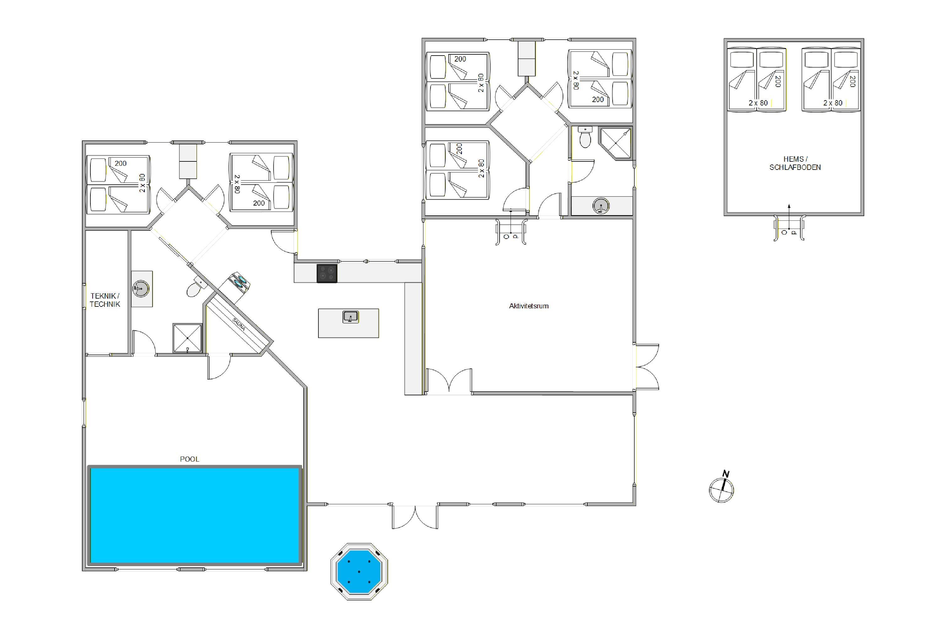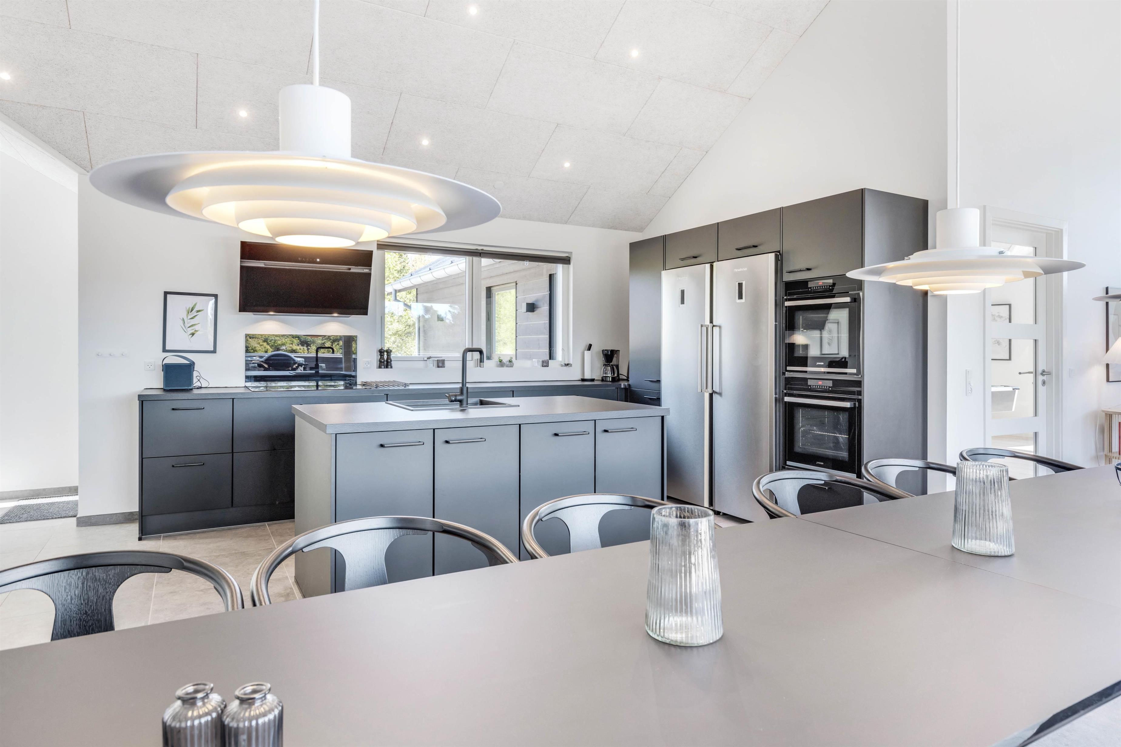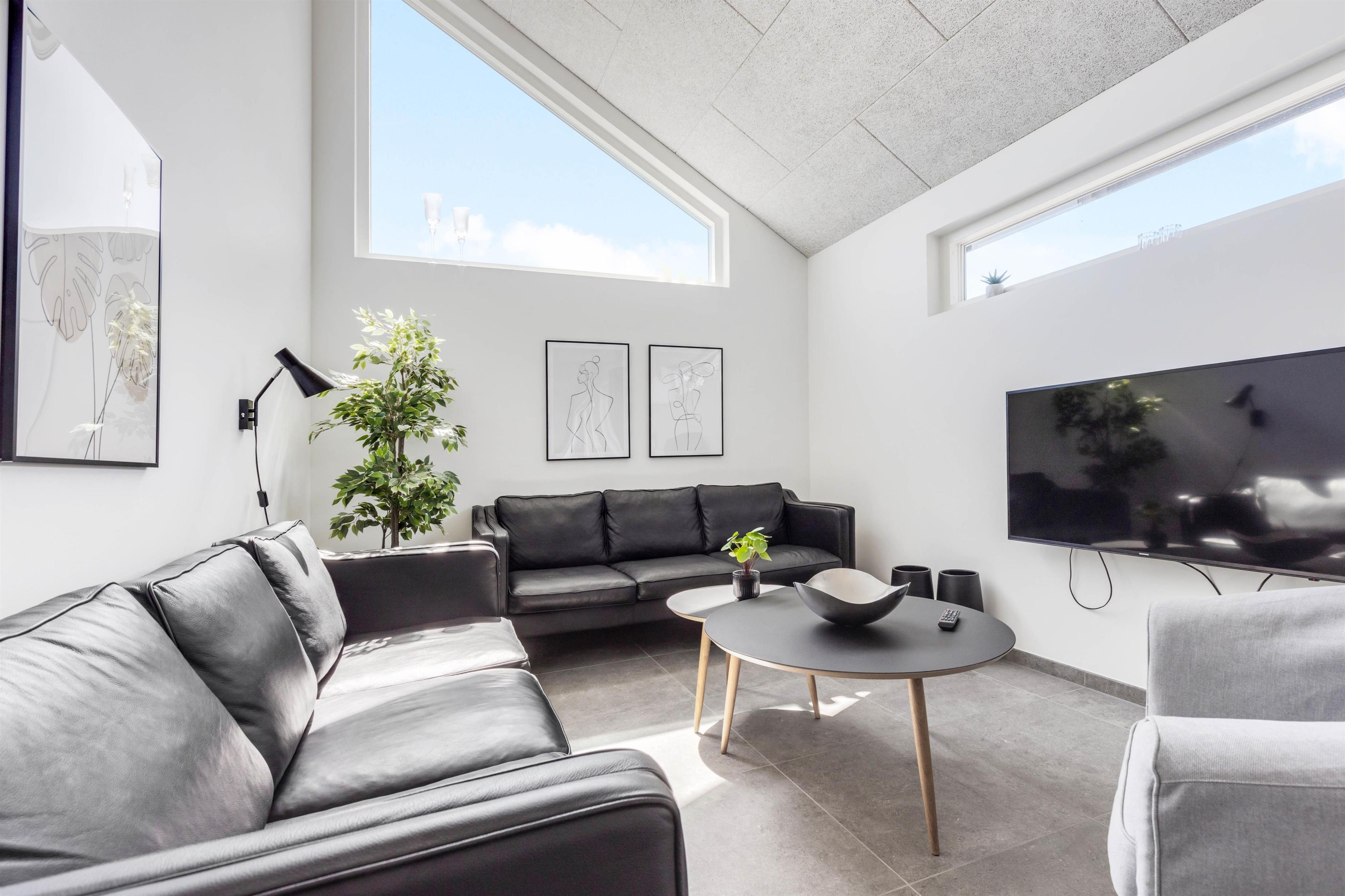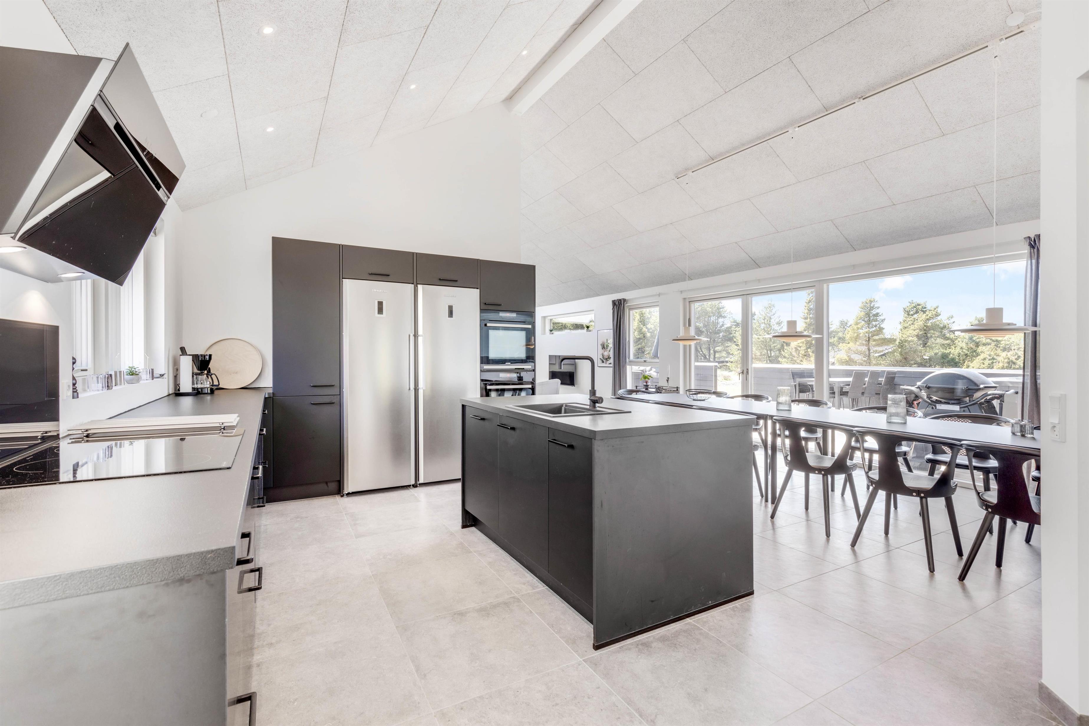 I sommerhuset møder I en lys og moderne indretning, allerede når I træder ind i feriehuset. Det 215 kvadratmeter store sommerhus er desuden rummeligt indrettet, så der er god plads til alle feriegæster. Sommerhuset rummer 5 soveværelser, hvor I kan få jeres skønhedssøvn om natten. To yderlige sovepladser befinder sig på den 20 kvadratmeter store hems. Desuden er der 2 badeværelser (med gulvvarme), så ingen skal stå i kø om morgenen - eller hver familie kan have sit eget badeværelse.
