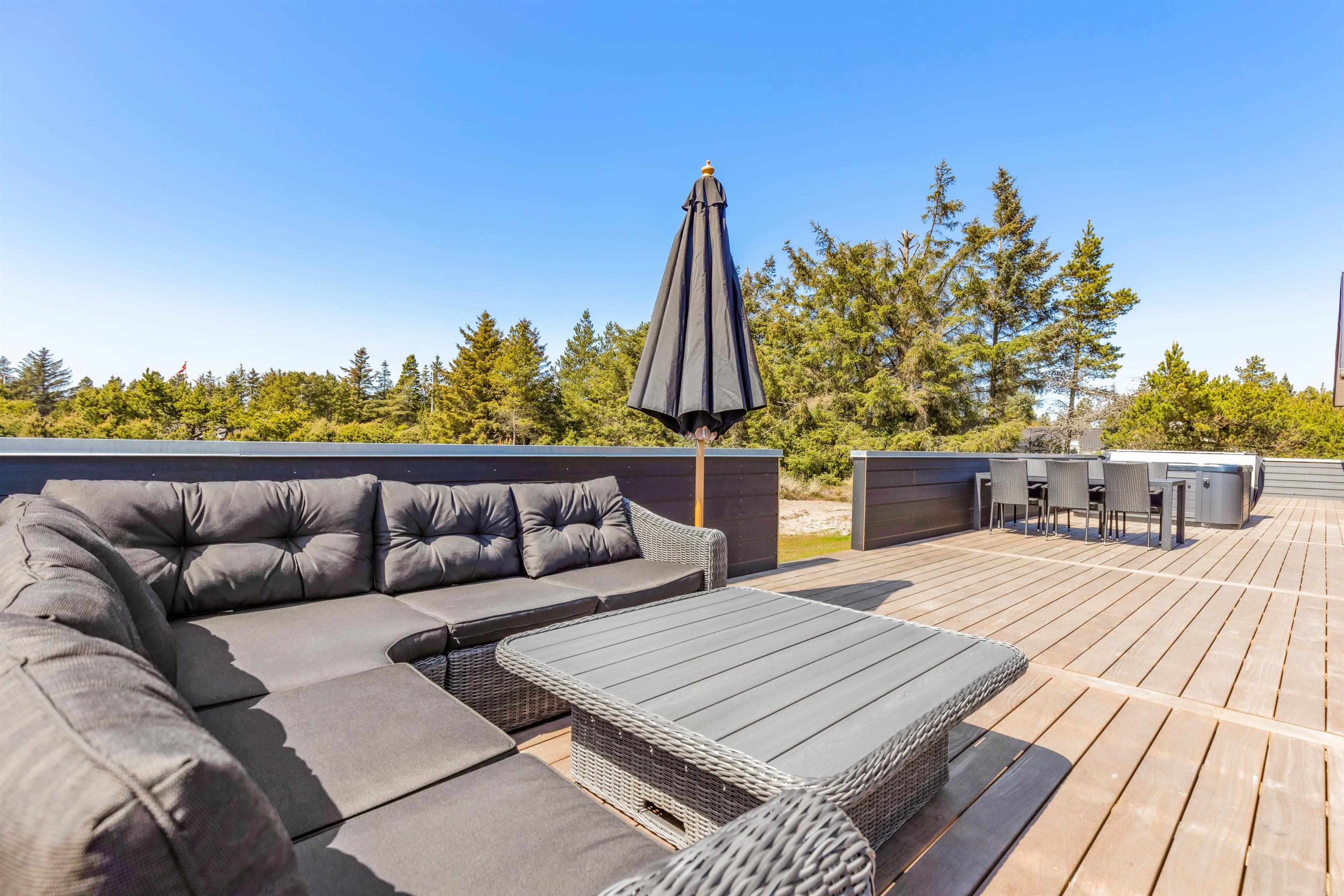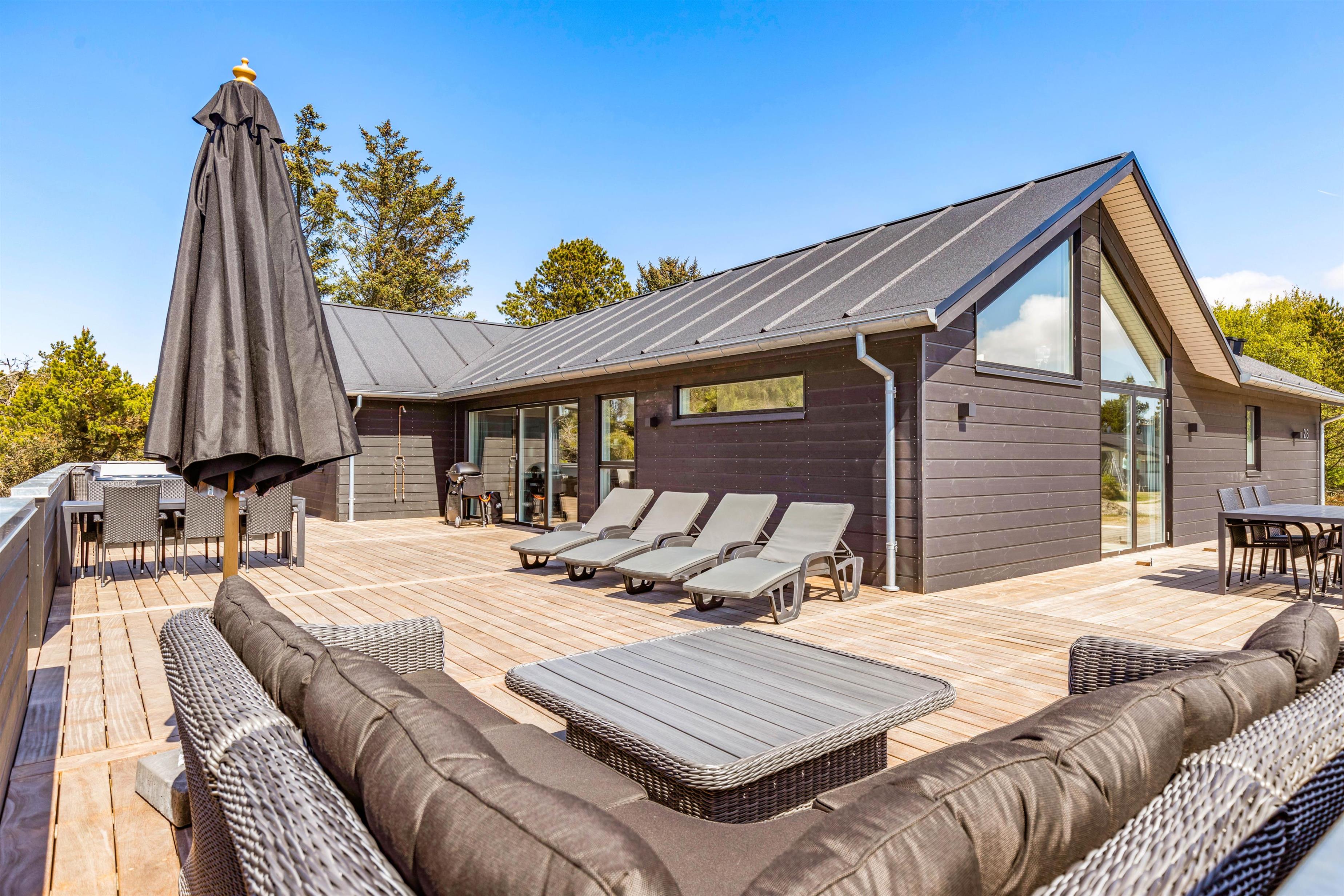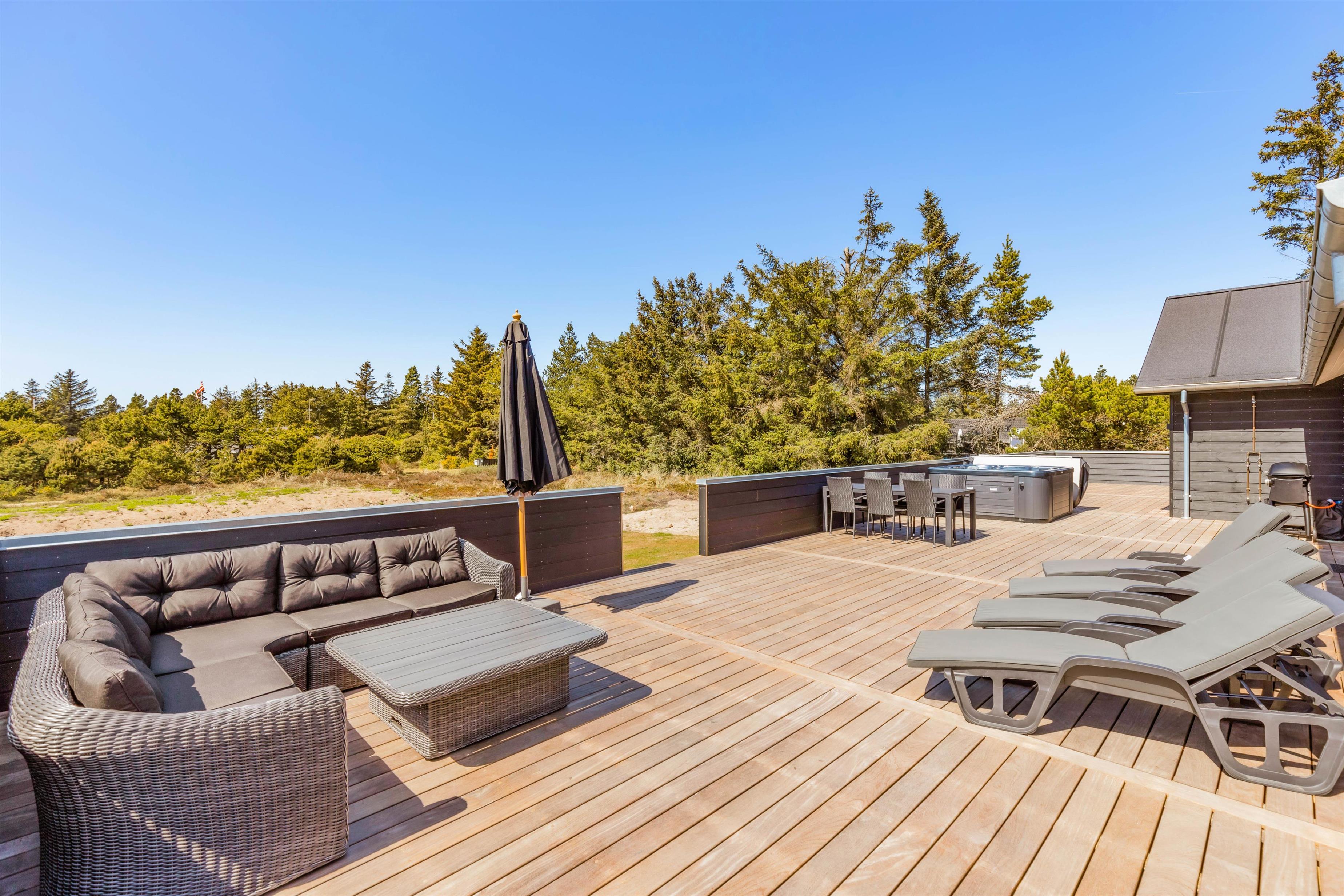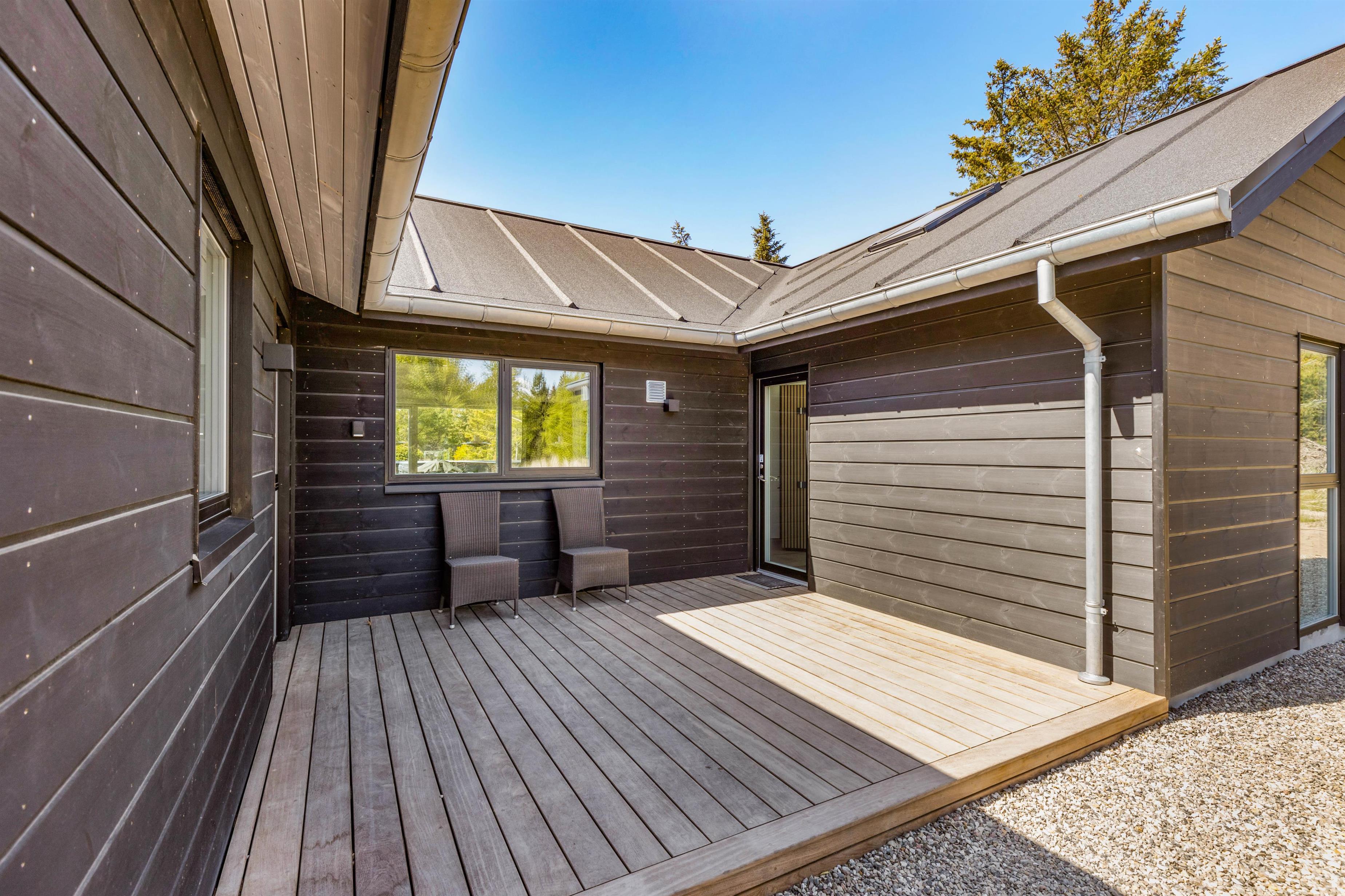 Det er ikke kun indendørs, at sommerhuset er helt fantastisk; det er det nemlig også udendørs. Her har I en stor terrasse, der er åben og delvist afskærmet, hvor I kan tilbringe og nyde de varme og solrige dage på jeres ferie. Både havemøbler og liggestole står til rådighed for jer på terrassen, så I kan finde jer godt til rette på en god plads med noget koldt at drikke.
