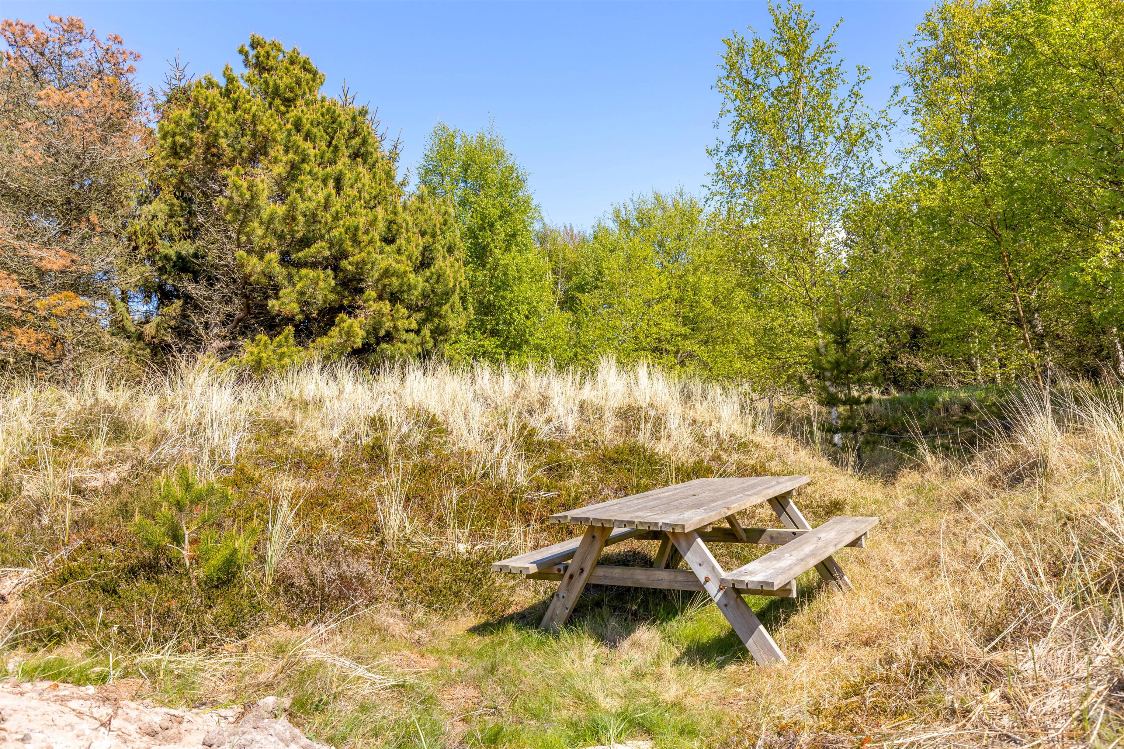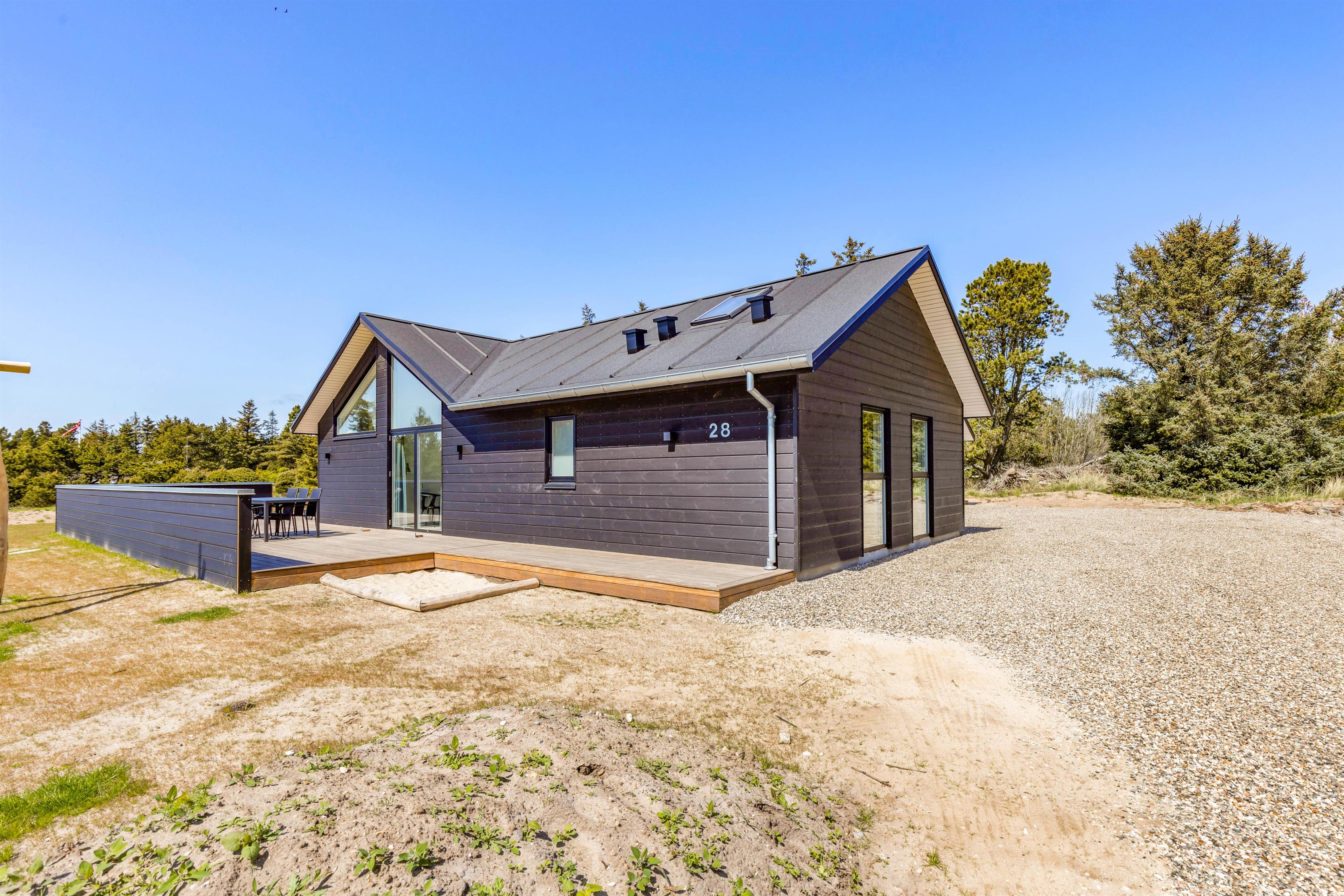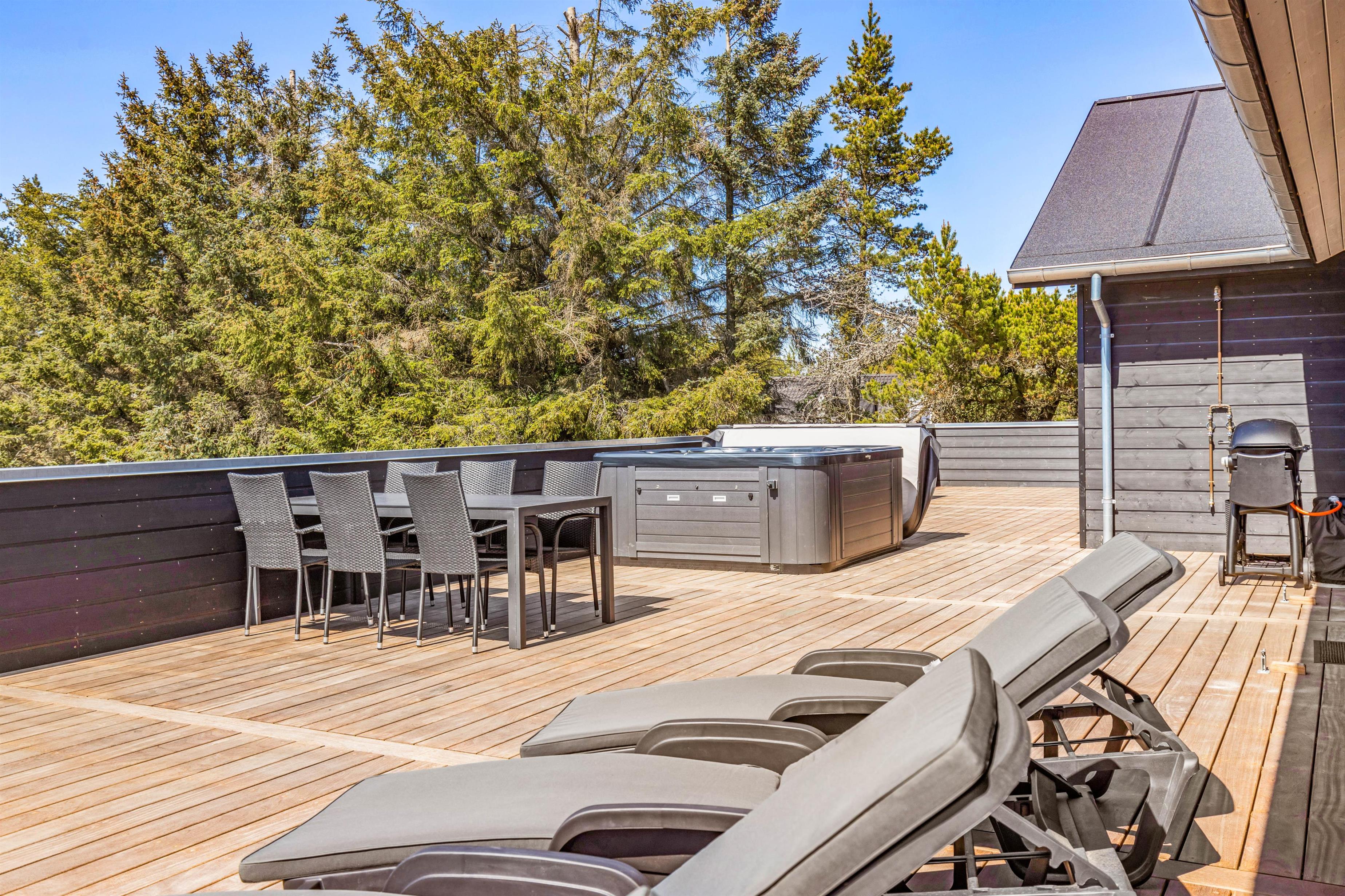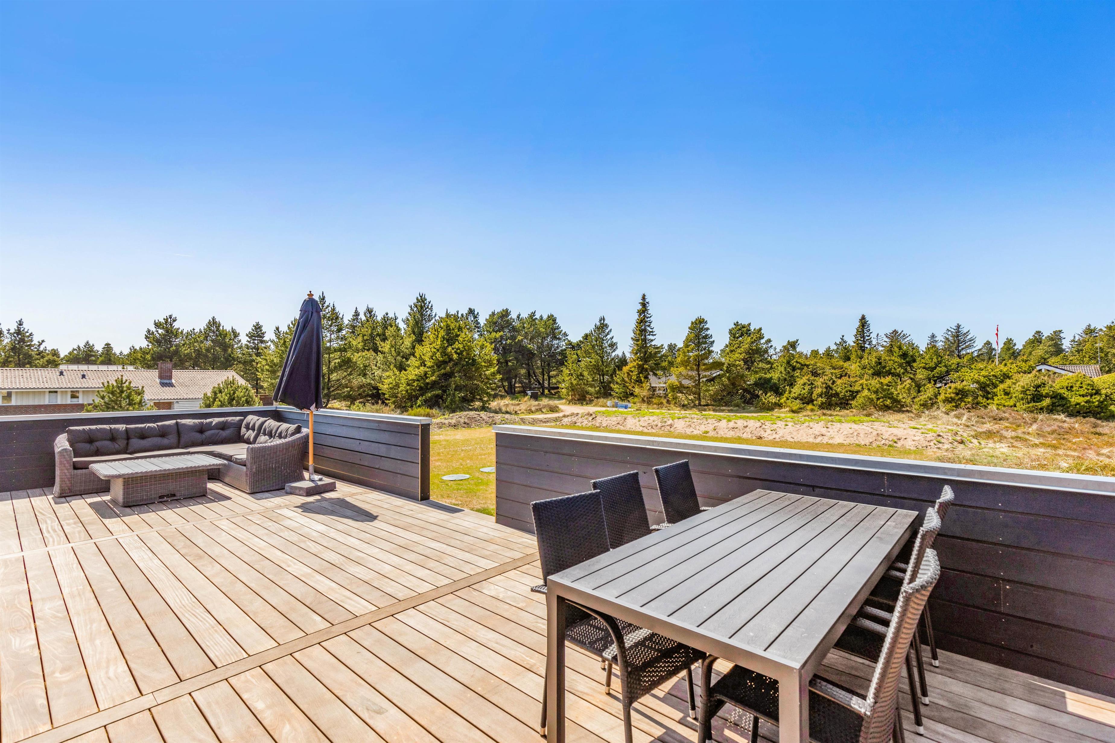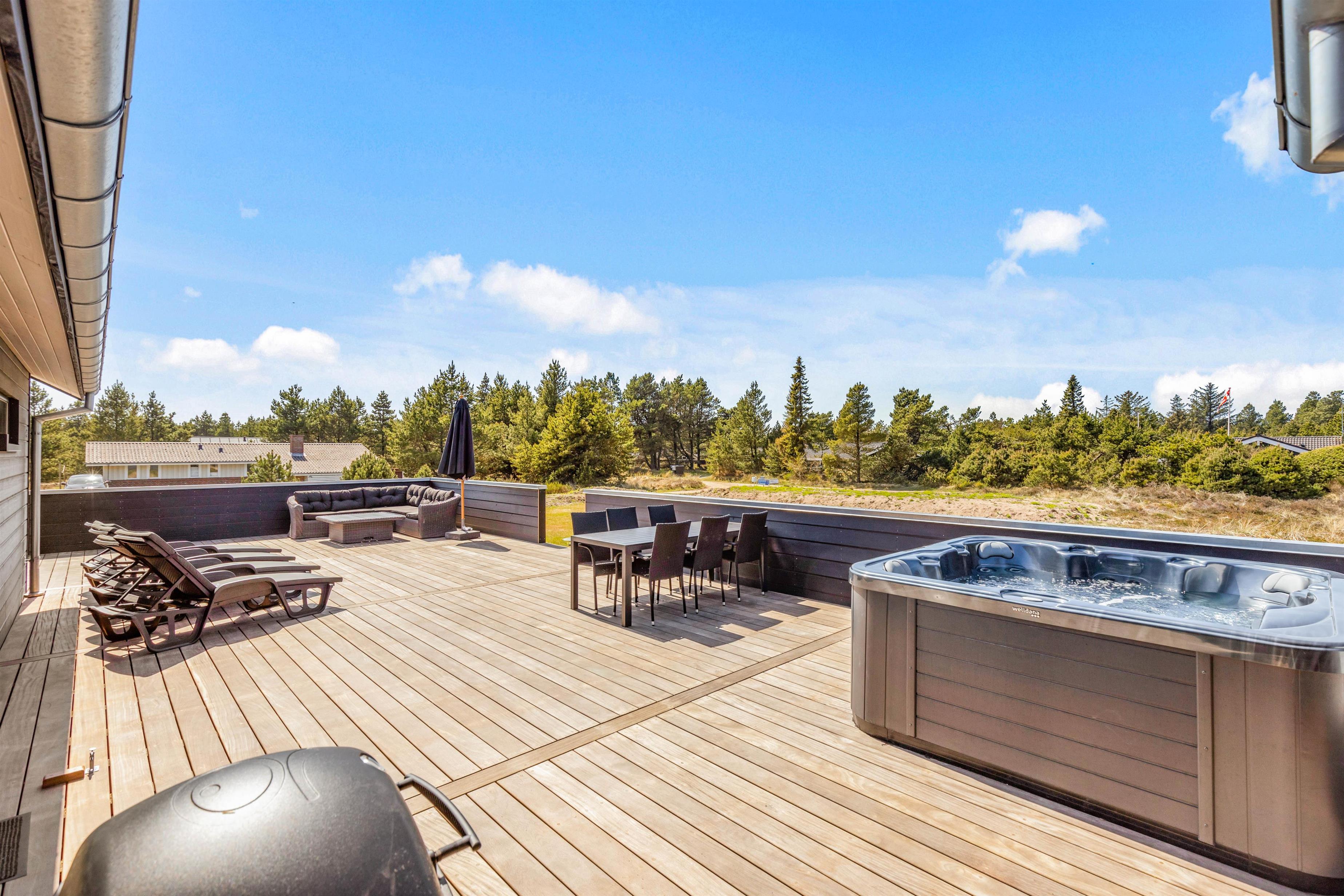 Det er ikke kun indendørs, at sommerhuset er helt fantastisk; det er det nemlig også udendørs. Her har I en stor terrasse, der er åben og delvist afskærmet, hvor I kan tilbringe og nyde de varme og solrige dage på jeres ferie. Både havemøbler og liggestole står til rådighed for jer på terrassen, så I kan finde jer godt til rette på en god plads med noget koldt at drikke.