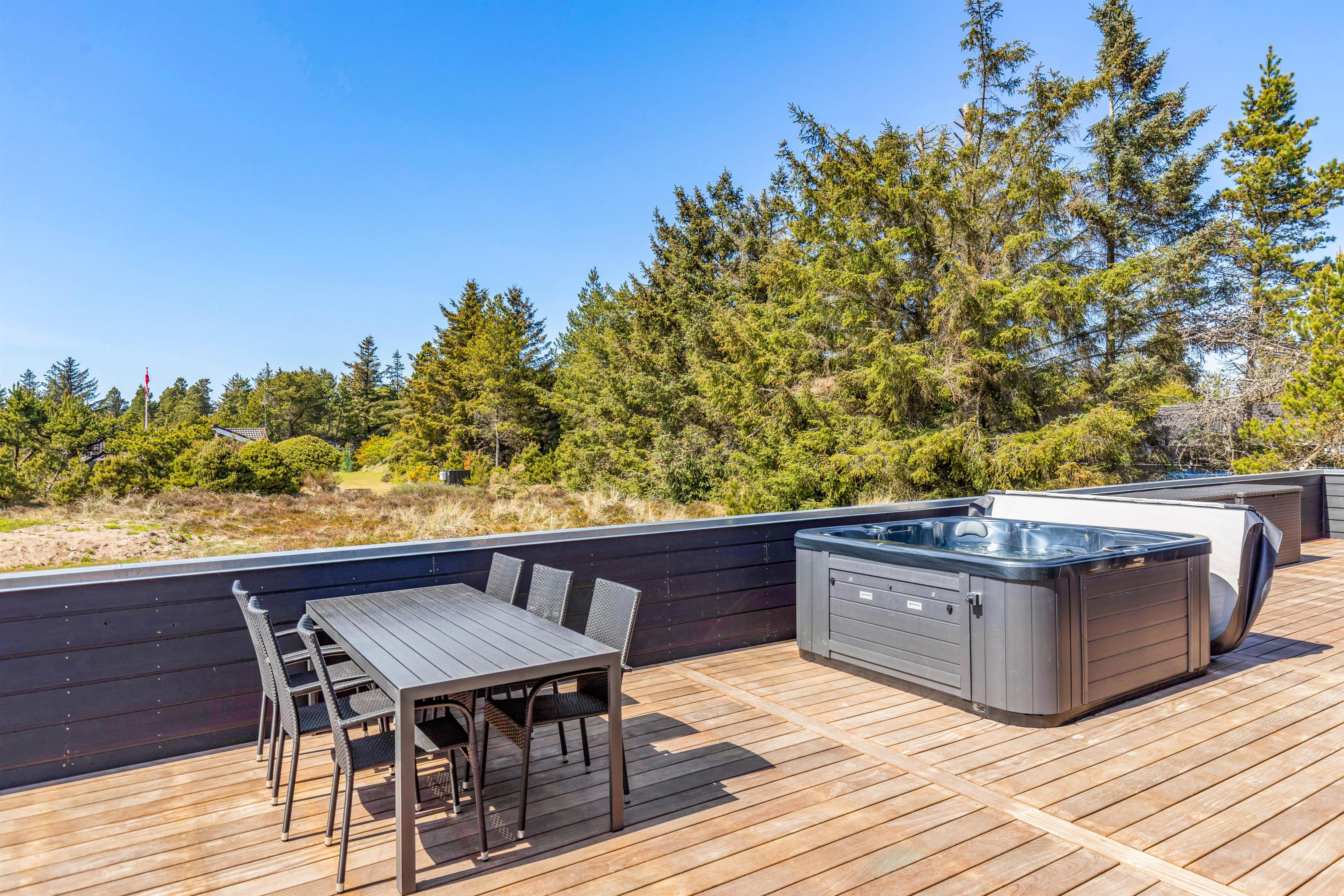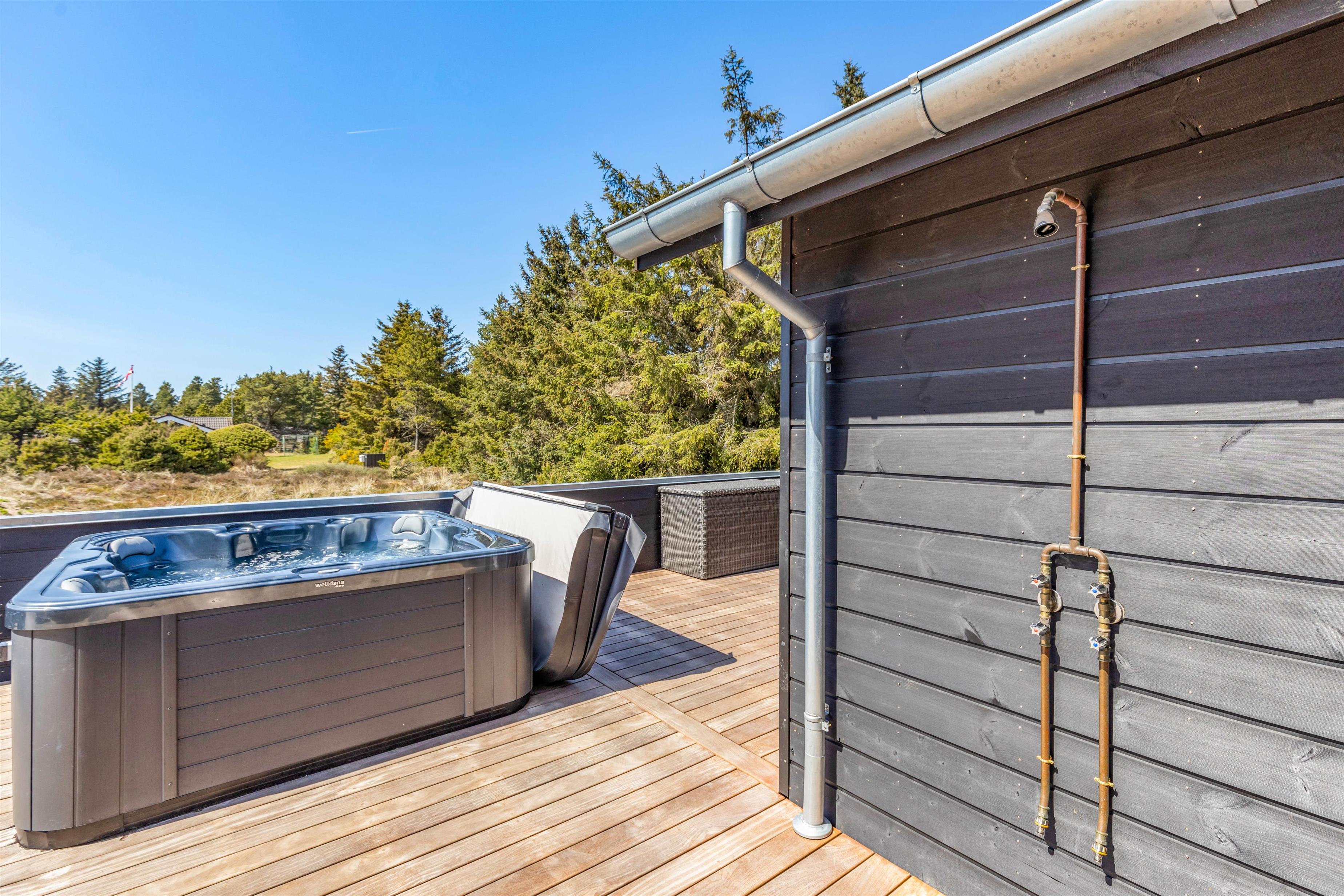 Til de af jer, der holder af lidt ekstra forkælelse og afslapning, er der en lækker sauna, som I kan sætte jer godt til rette i. Desuden er der på terrassen en udespa, som inviterer til afslappende stunder i det varme, boblende vand under åben himmel – især under aftenens stjernehimmel er det helt fantastisk. På terrassen er der derudover en udebruser, der kan benyttes fra 1. april til 31. oktober.