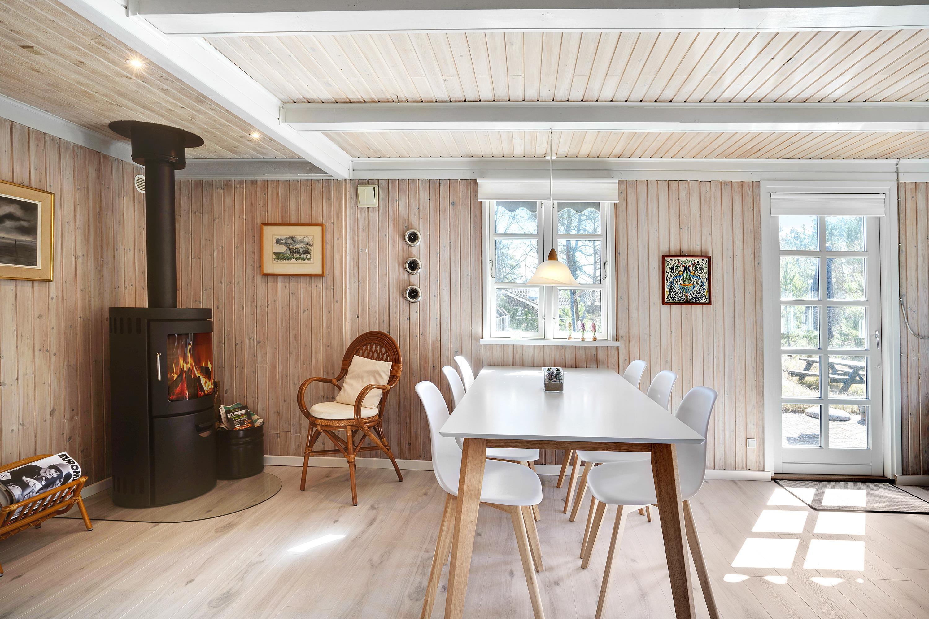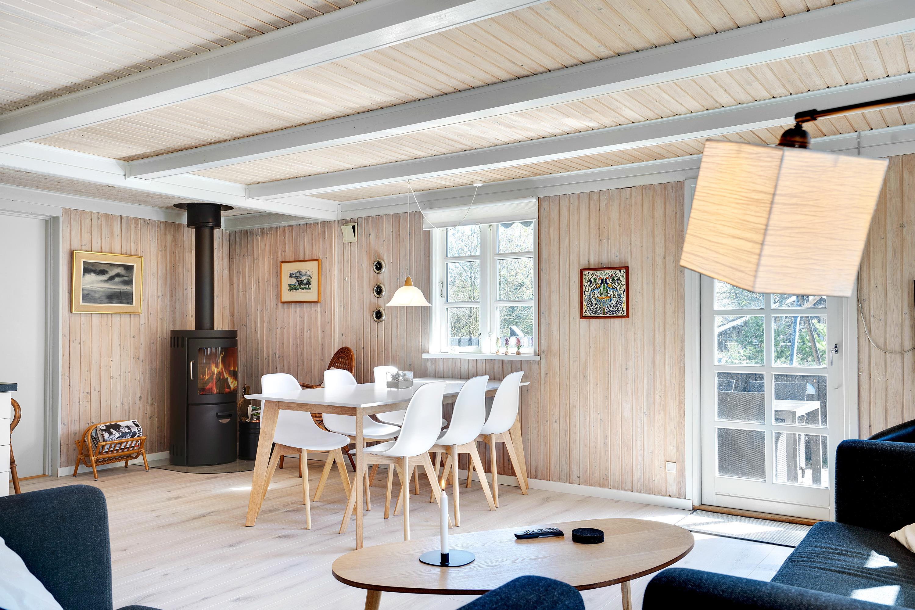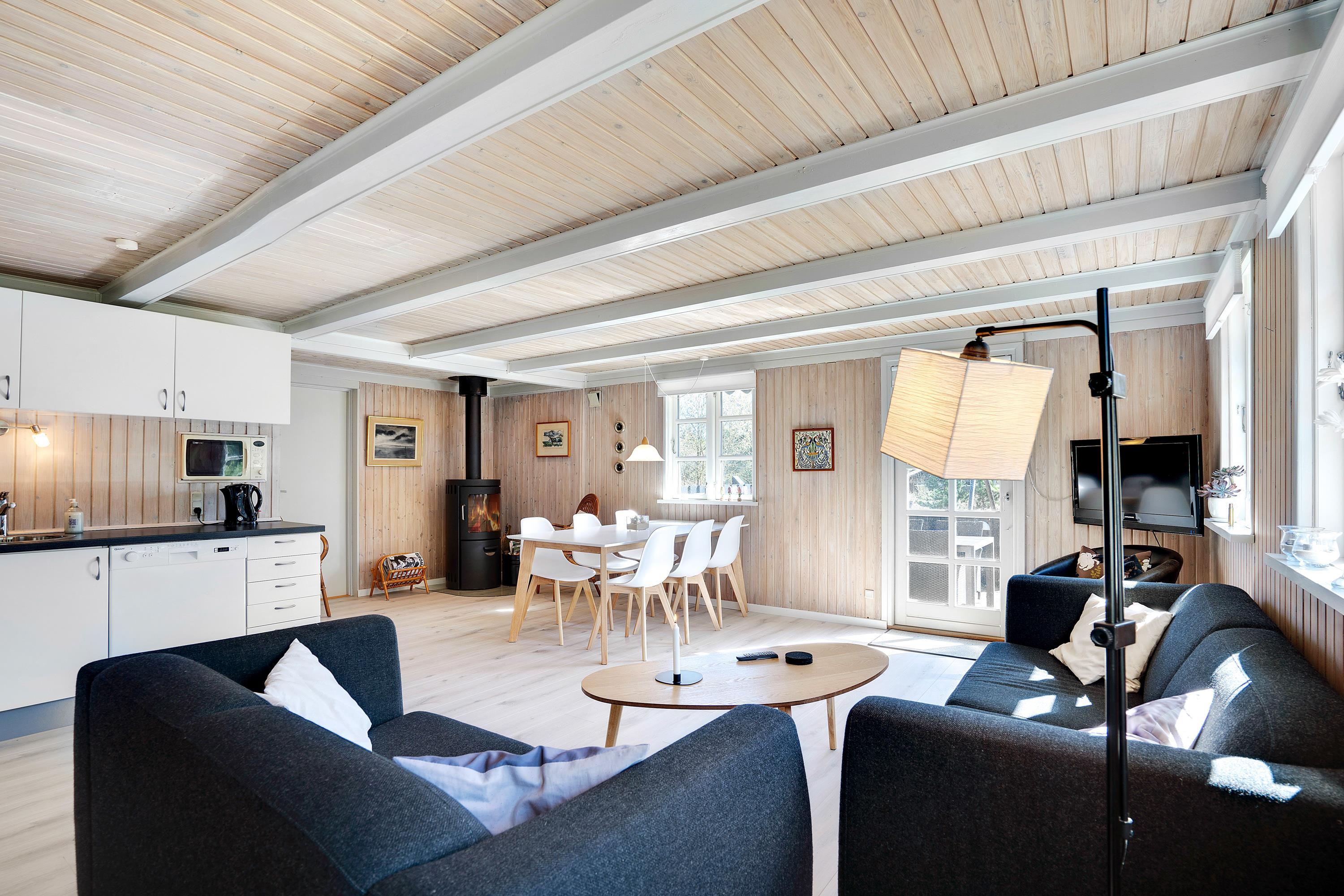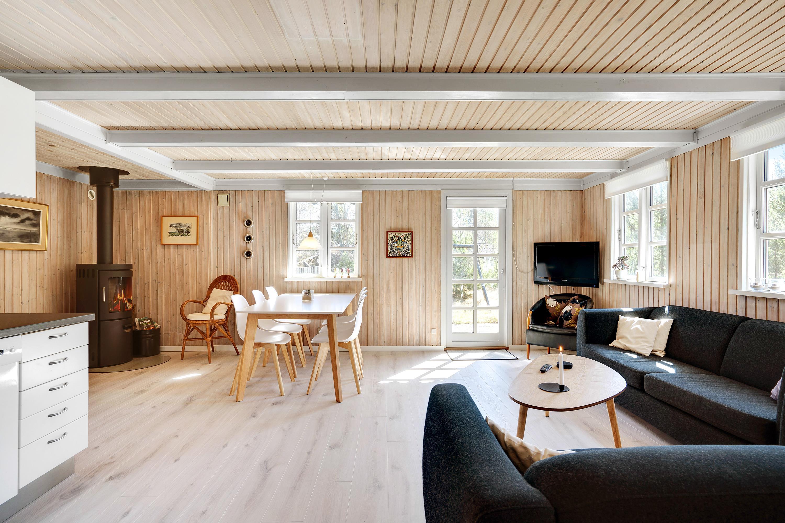 Sommerhuset er i 2020 blevet renoveret og fremstår lyst og venligt. Det åbne opholdsrum, der kombinerer køkkenalrum og stue i ét, er husets hjerte og centrum for samvær. Her står desuden den klassiske brændeovn, som sammen med de synlige loftsbjælker tilfører det indre ekstra charme.
