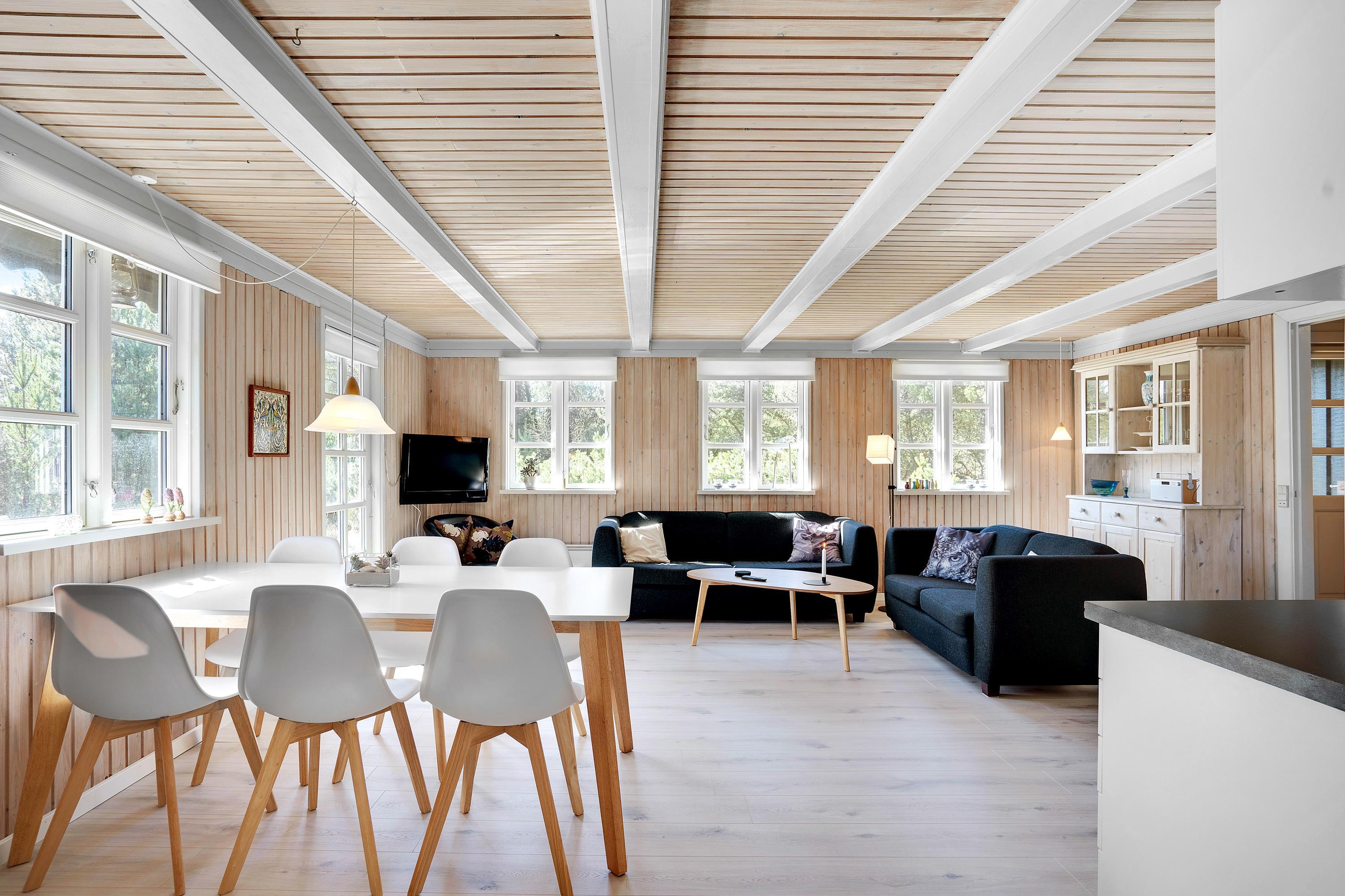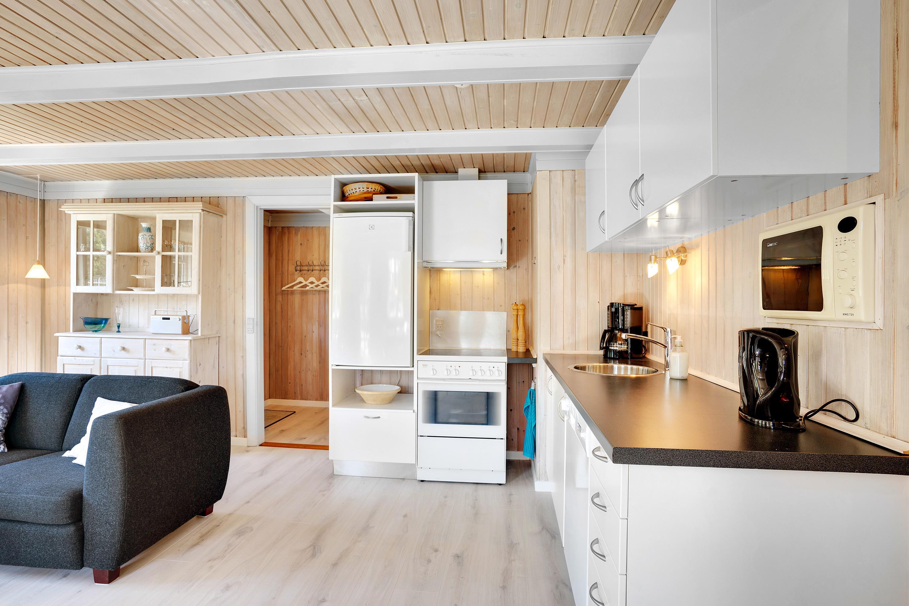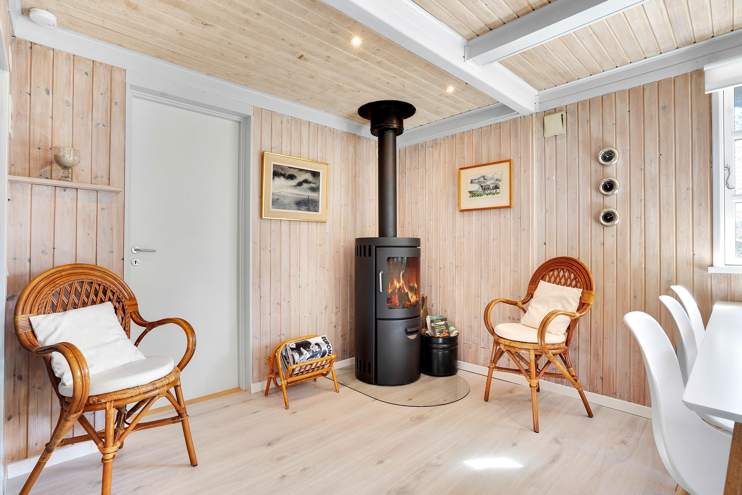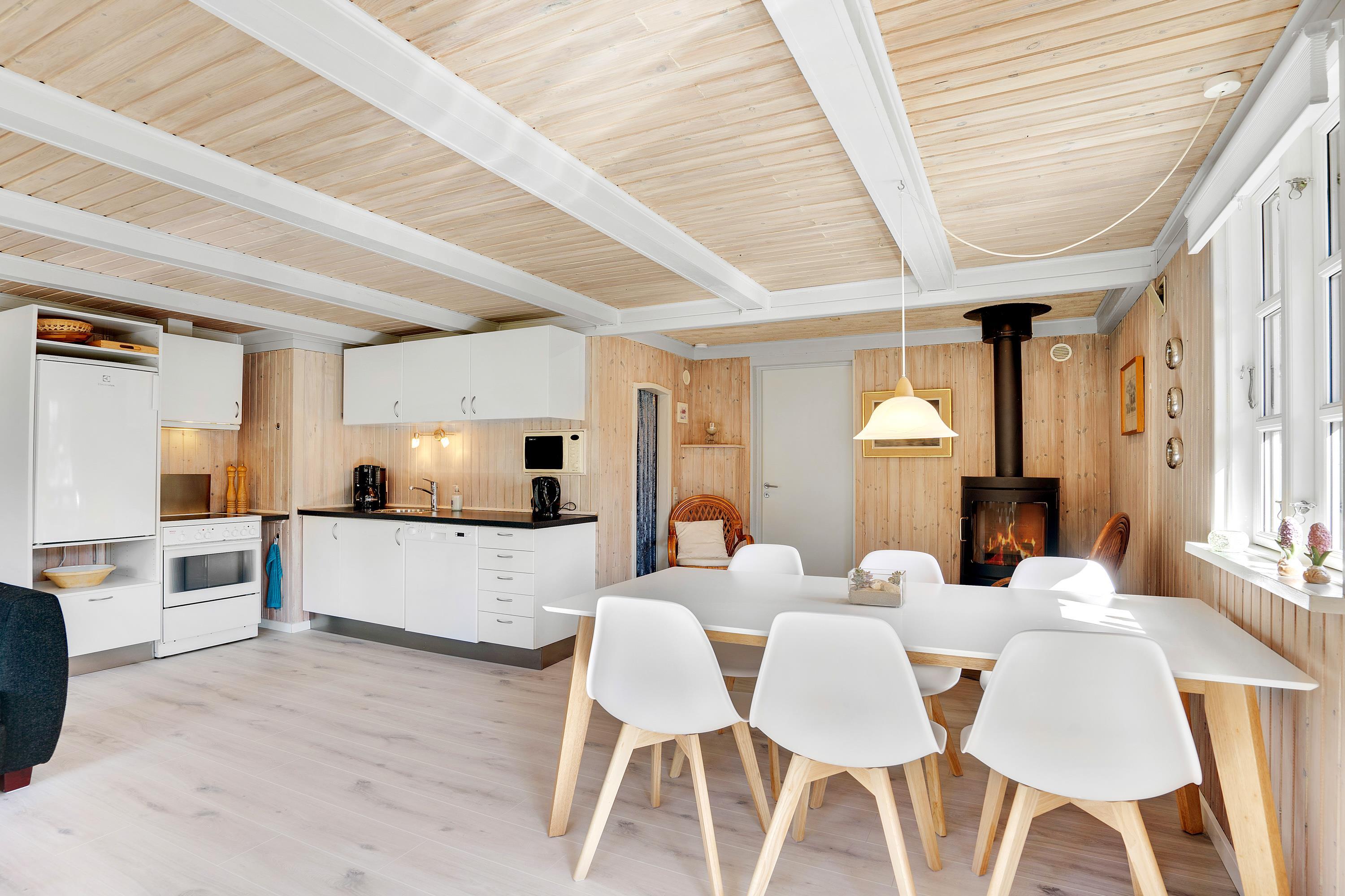 Sommerhuset er i 2020 blevet renoveret og fremstår lyst og venligt. Det åbne opholdsrum, der kombinerer køkkenalrum og stue i ét, er husets hjerte og centrum for samvær. Her står desuden den klassiske brændeovn, som sammen med de synlige loftsbjælker tilfører det indre ekstra charme.
