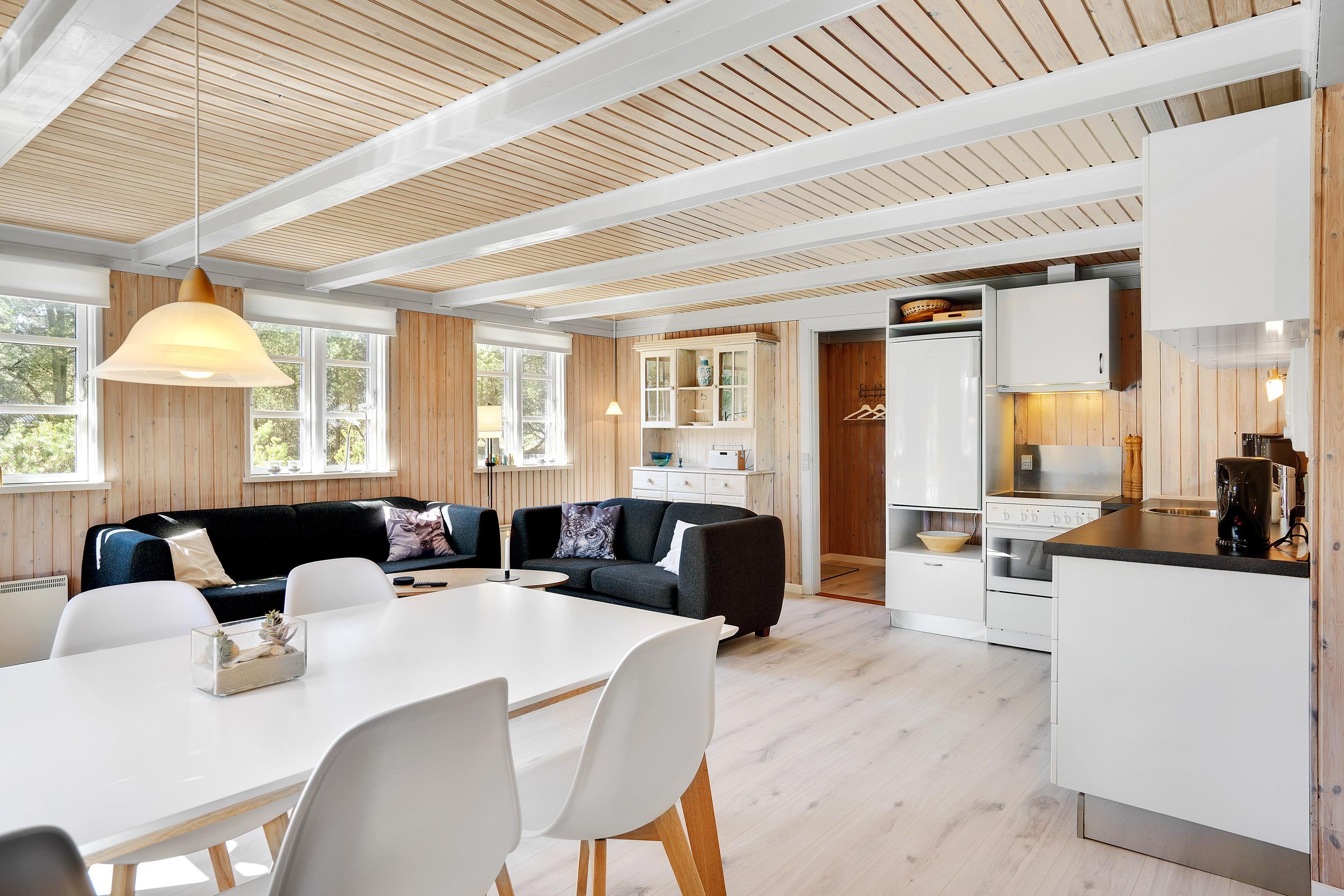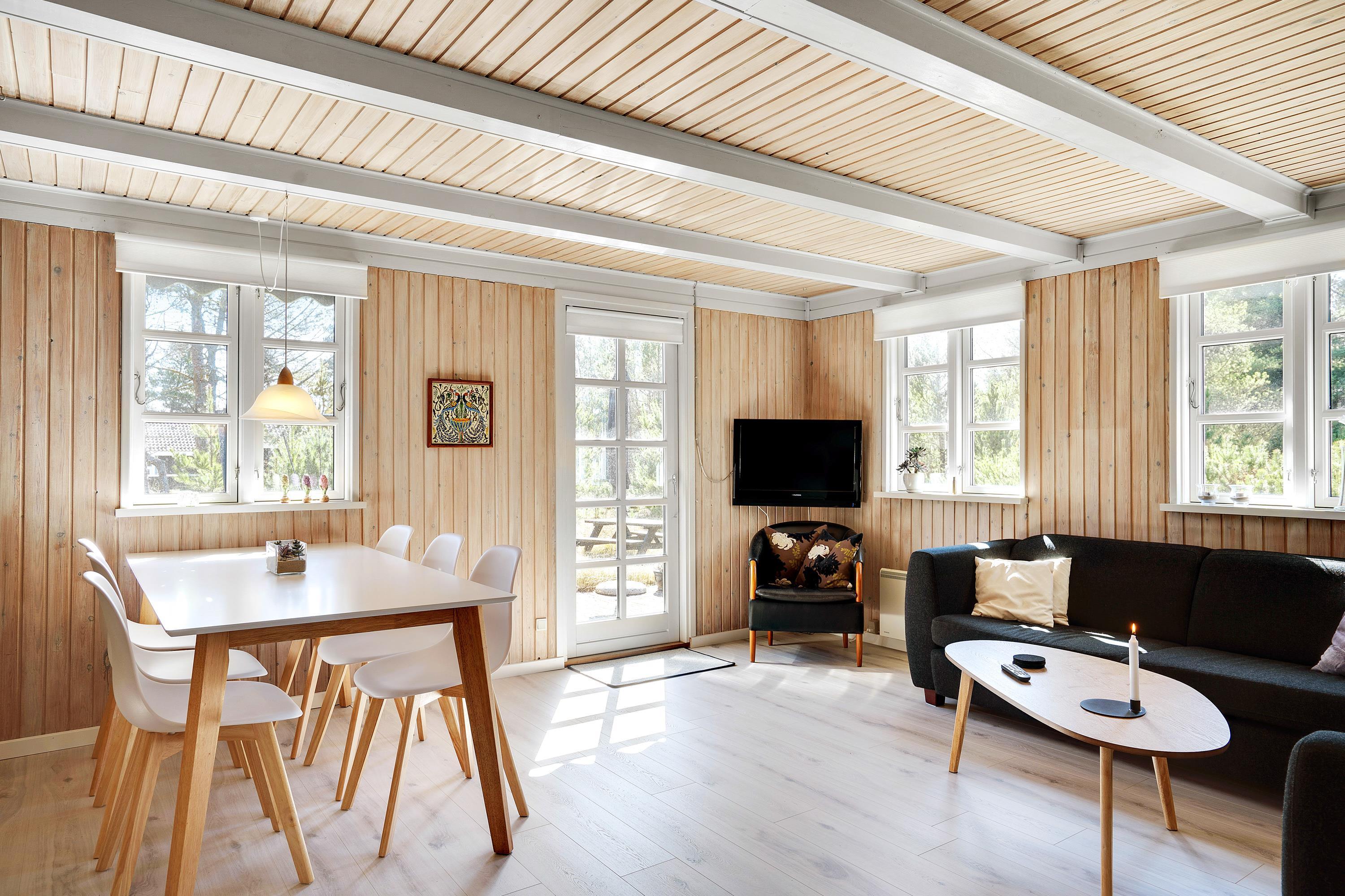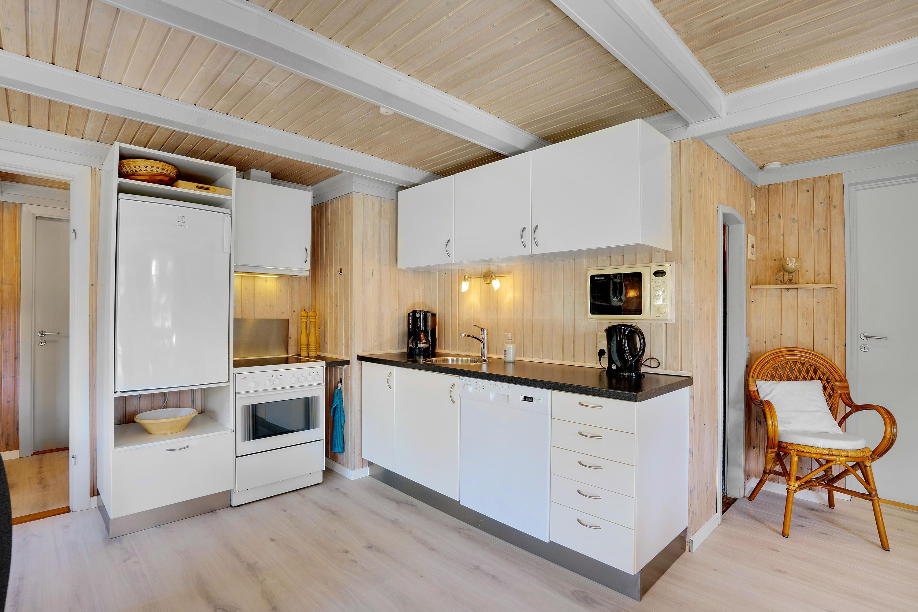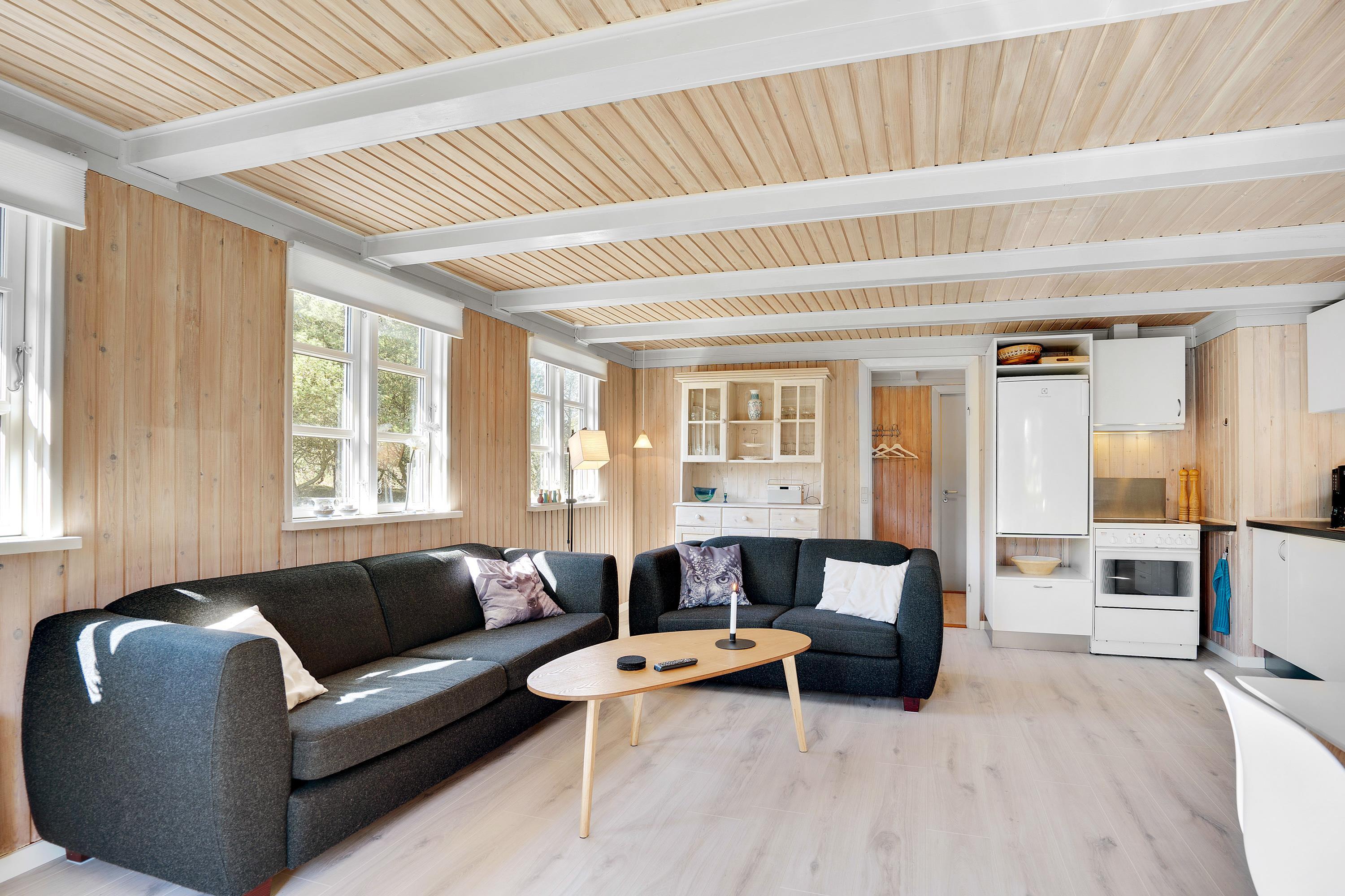 Sommerhuset er i 2020 blevet renoveret og fremstår lyst og venligt. Det åbne opholdsrum, der kombinerer køkkenalrum og stue i ét, er husets hjerte og centrum for samvær. Her står desuden den klassiske brændeovn, som sammen med de synlige loftsbjælker tilfører det indre ekstra charme.