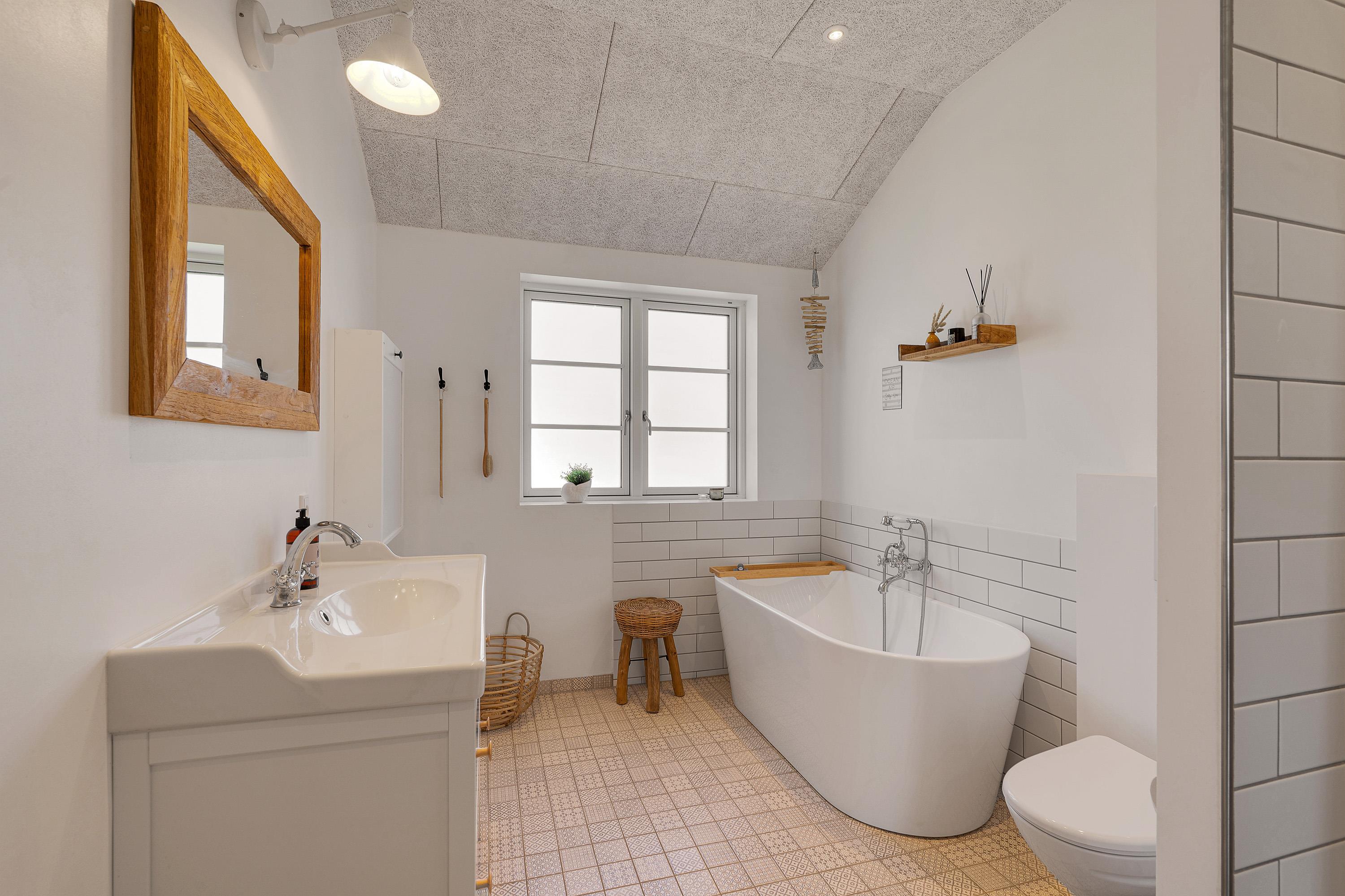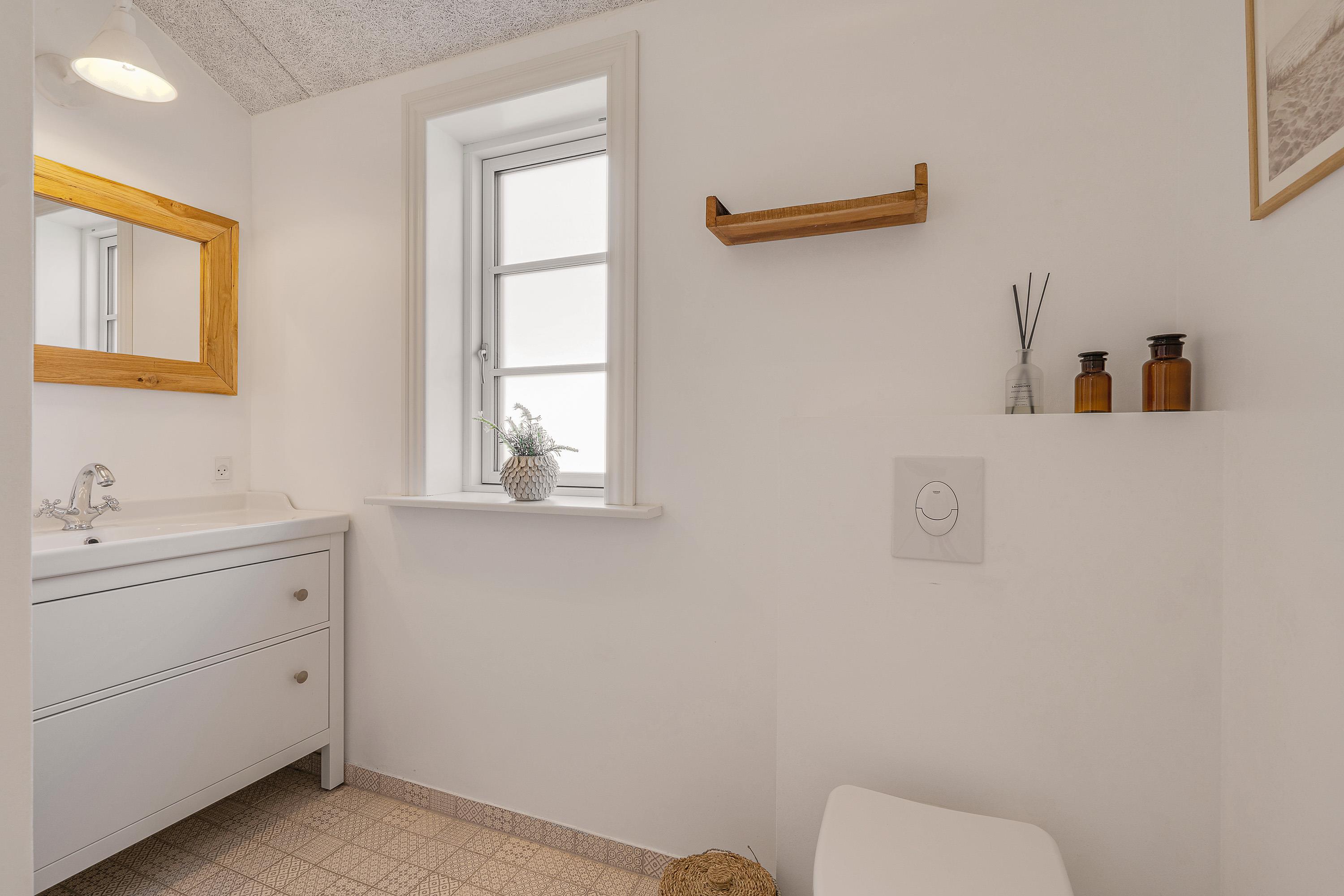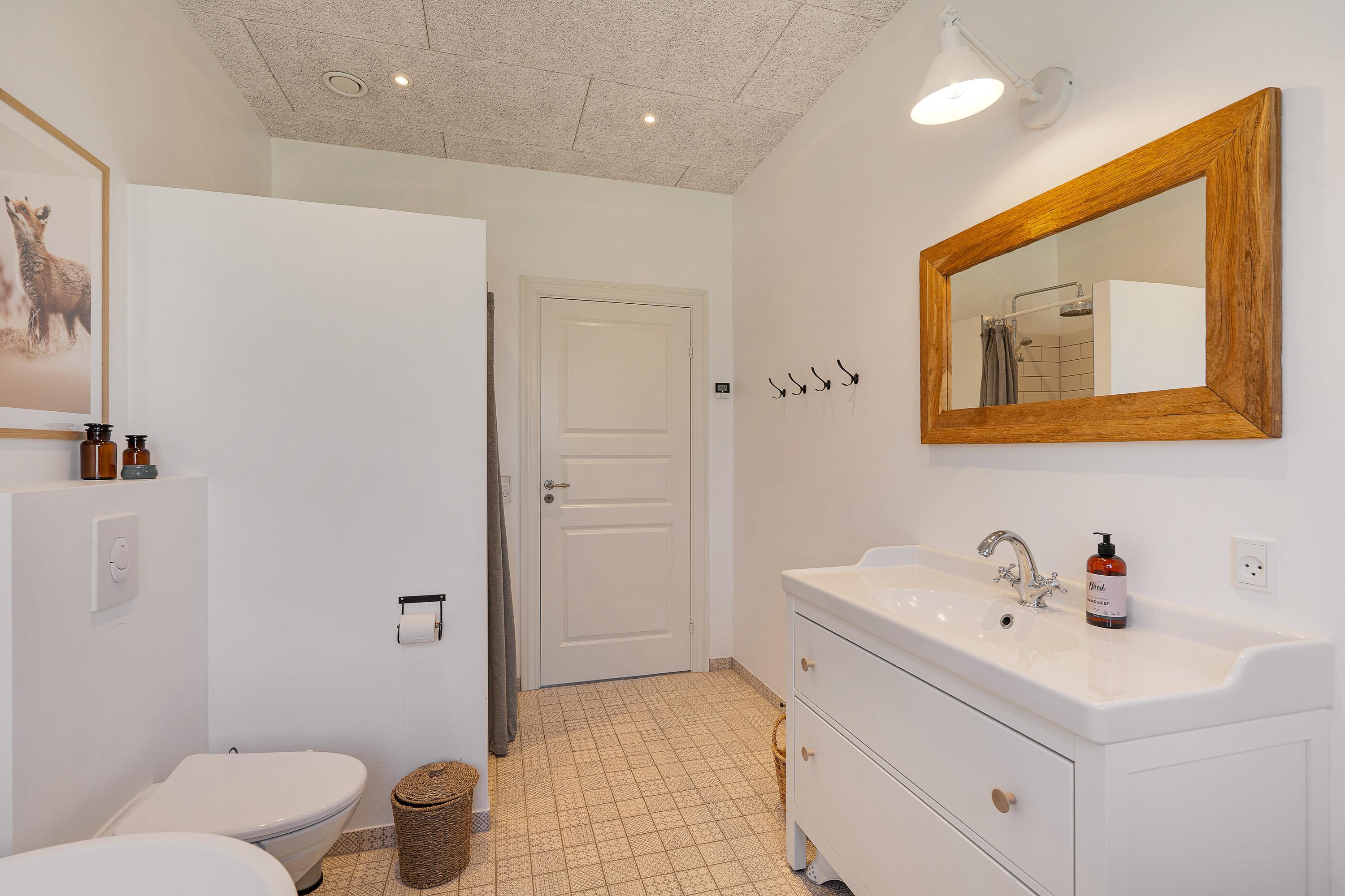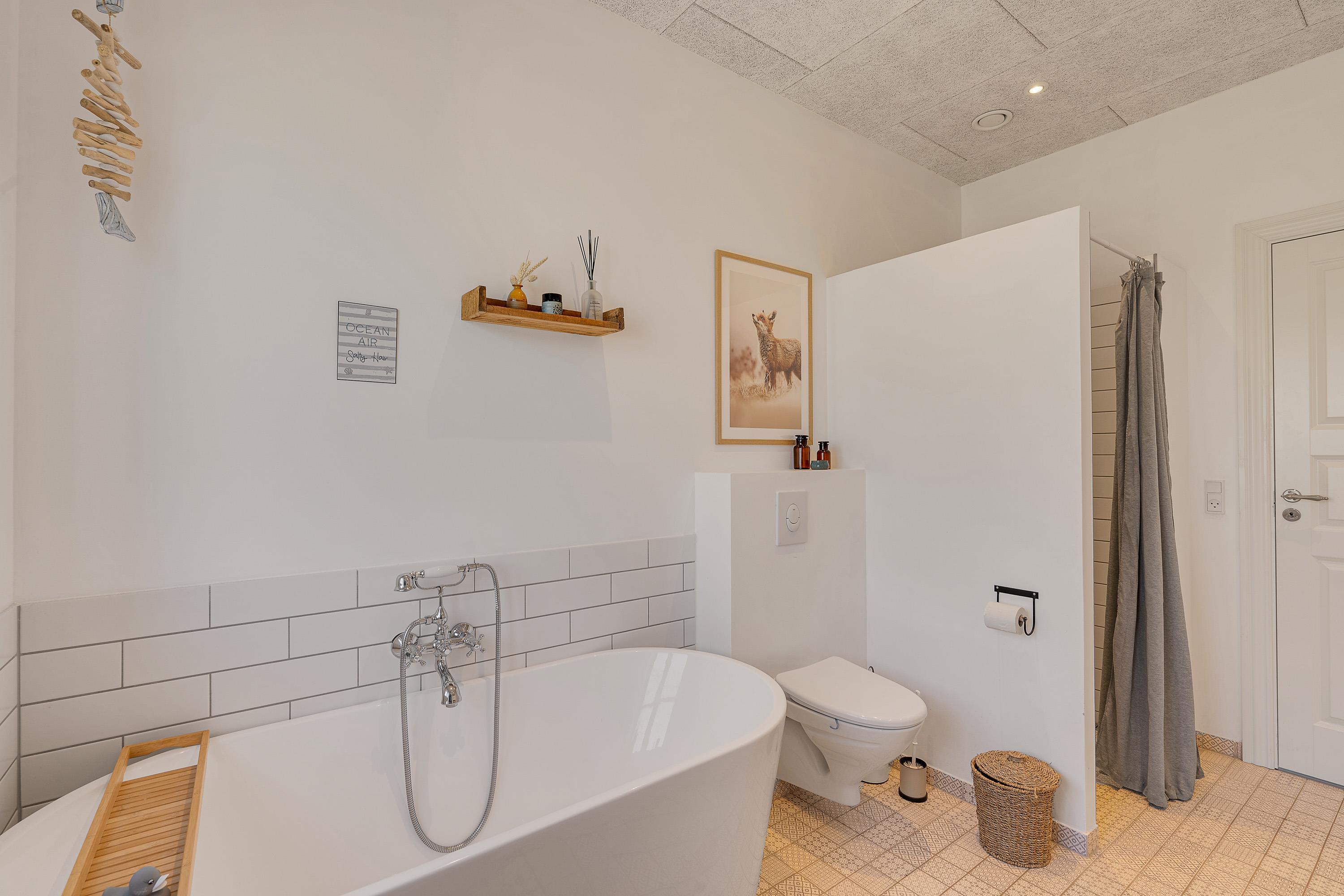 Rent praktisk rummer feriehuset 6 soveværelser med dobbeltsenge og 3 badeværelser – hvoraf et er med puslebord og badekar, så I til hver en tid slipper for kø om morgenen. Tøjvask er også hurtigt klaret med en kombineret vaskemaskine og tørretumbler. Samtidig er sommerhuset også energibesparende, da der er gulvvarme i alle rum.